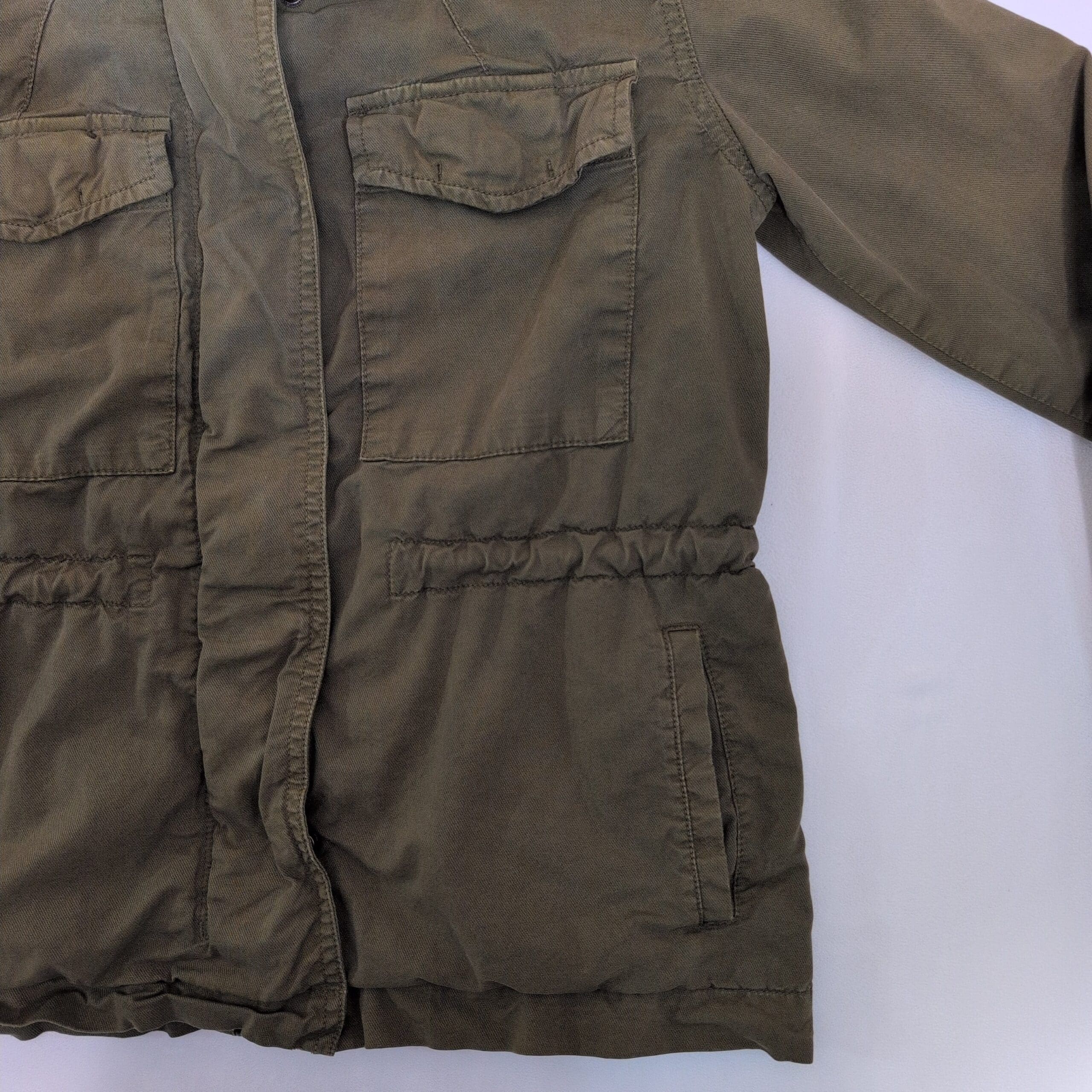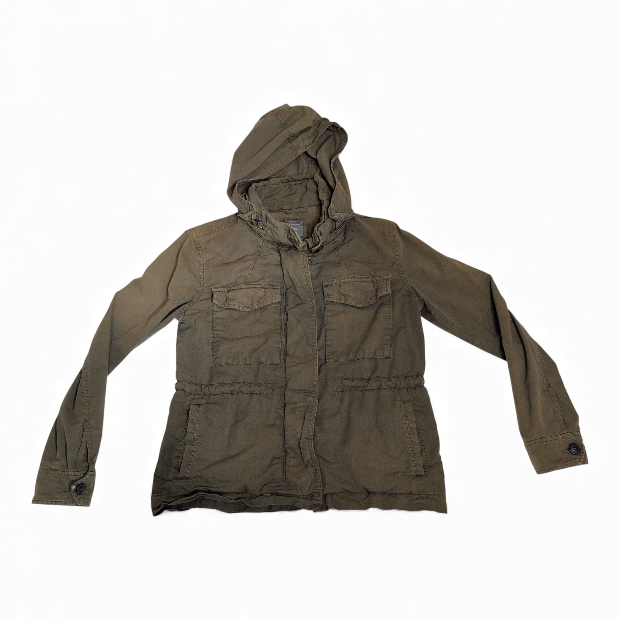Olive green GAP utility jacket in Women’s XS. Hooded design with a front zip and snap placket, two chest flap pockets and two lower hand pockets, plus an elasticized waist for a tailored fit. Lightweight, casual layer ideal for spring and fall. Pre-owned and gently worn — please review photos for condition details.