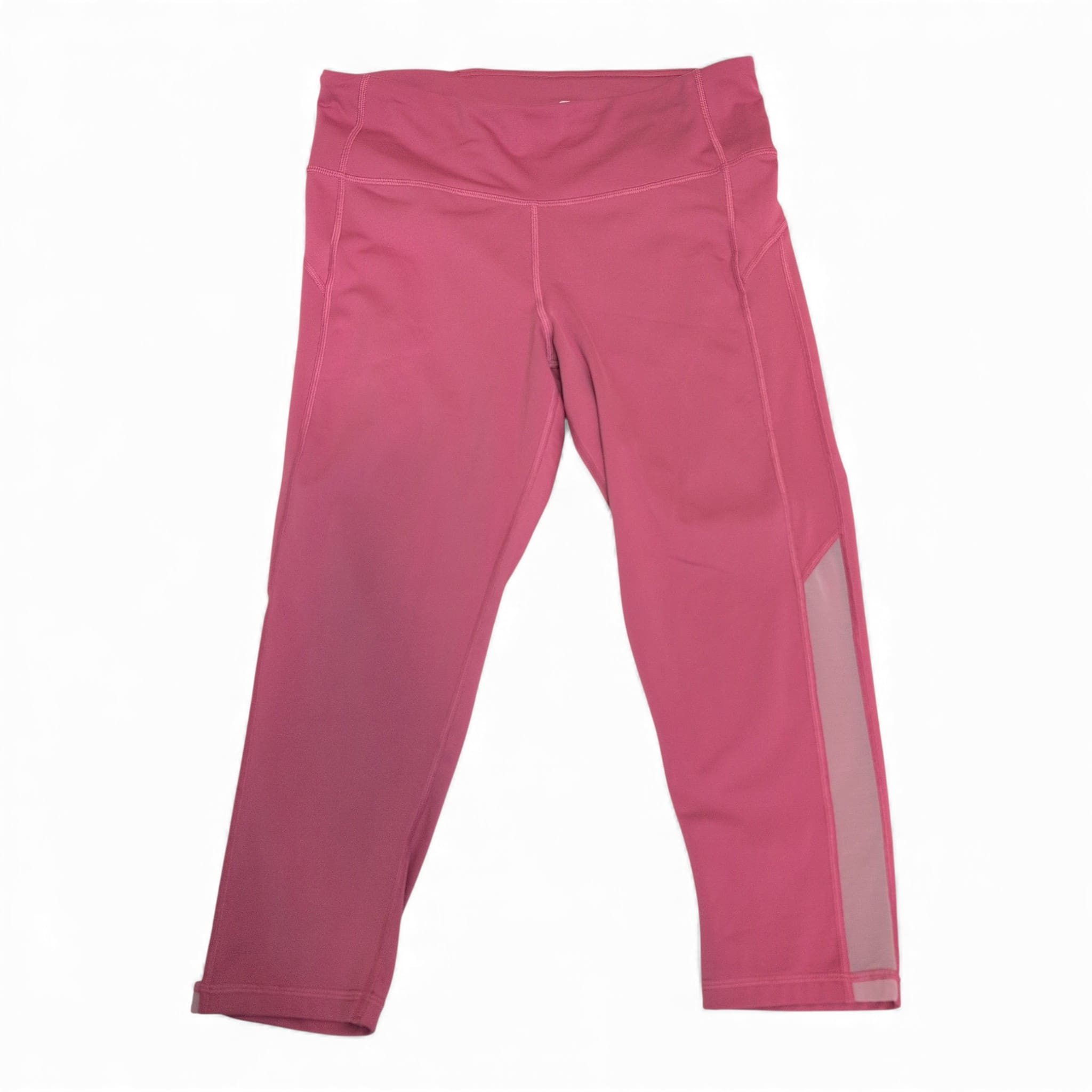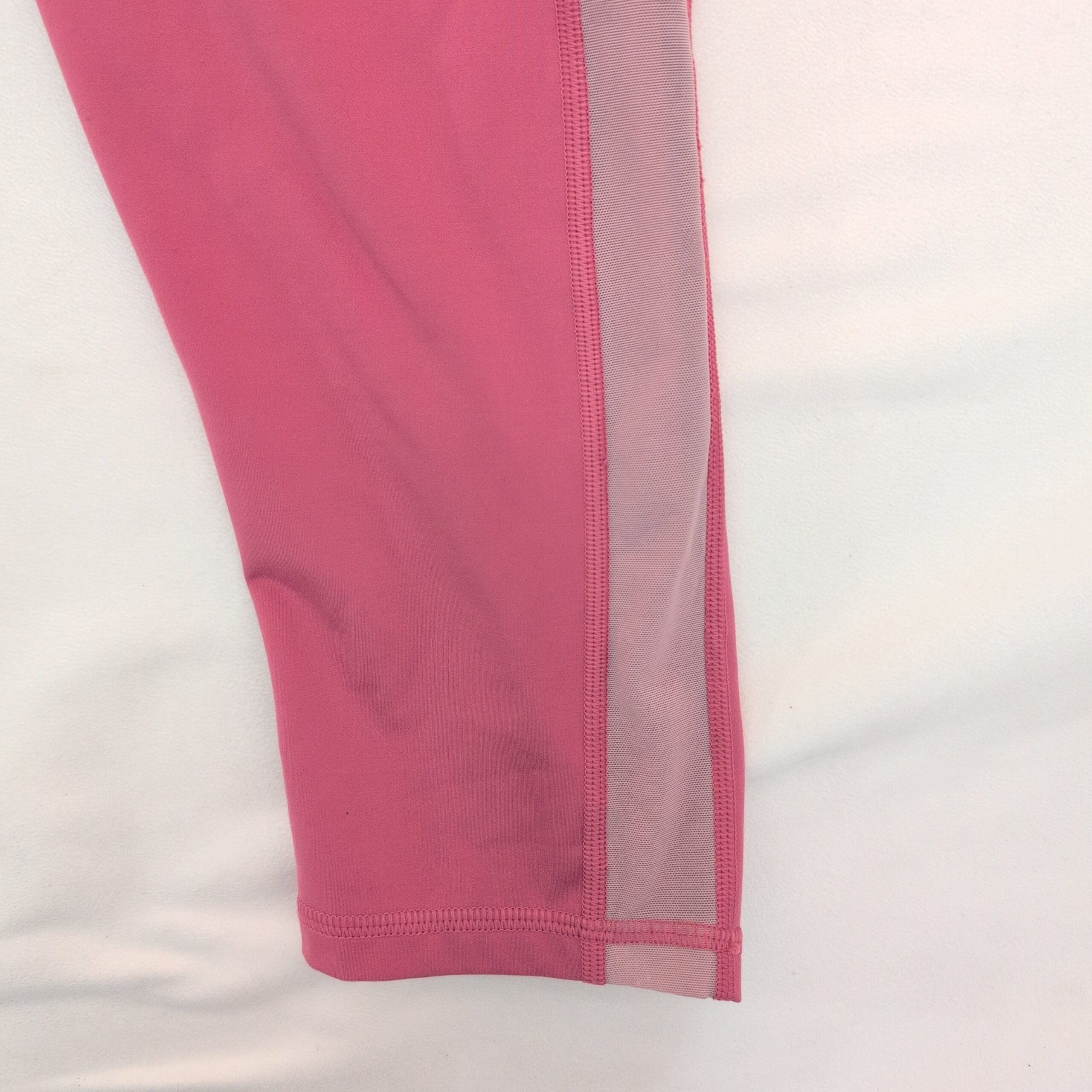 Gap women’s high-rise leggings in a vibrant pink, size L. Features a wide supportive waistband, flatlock seams, and breathable mesh side panels for added ventilation. Smooth, stretchy fabric ideal for yoga, gym workouts, or everyday athleisure. Pre-owned and in good condition with normal light wear. Care: machine wash cold, tumble low or line dry. Fabric content not specified.