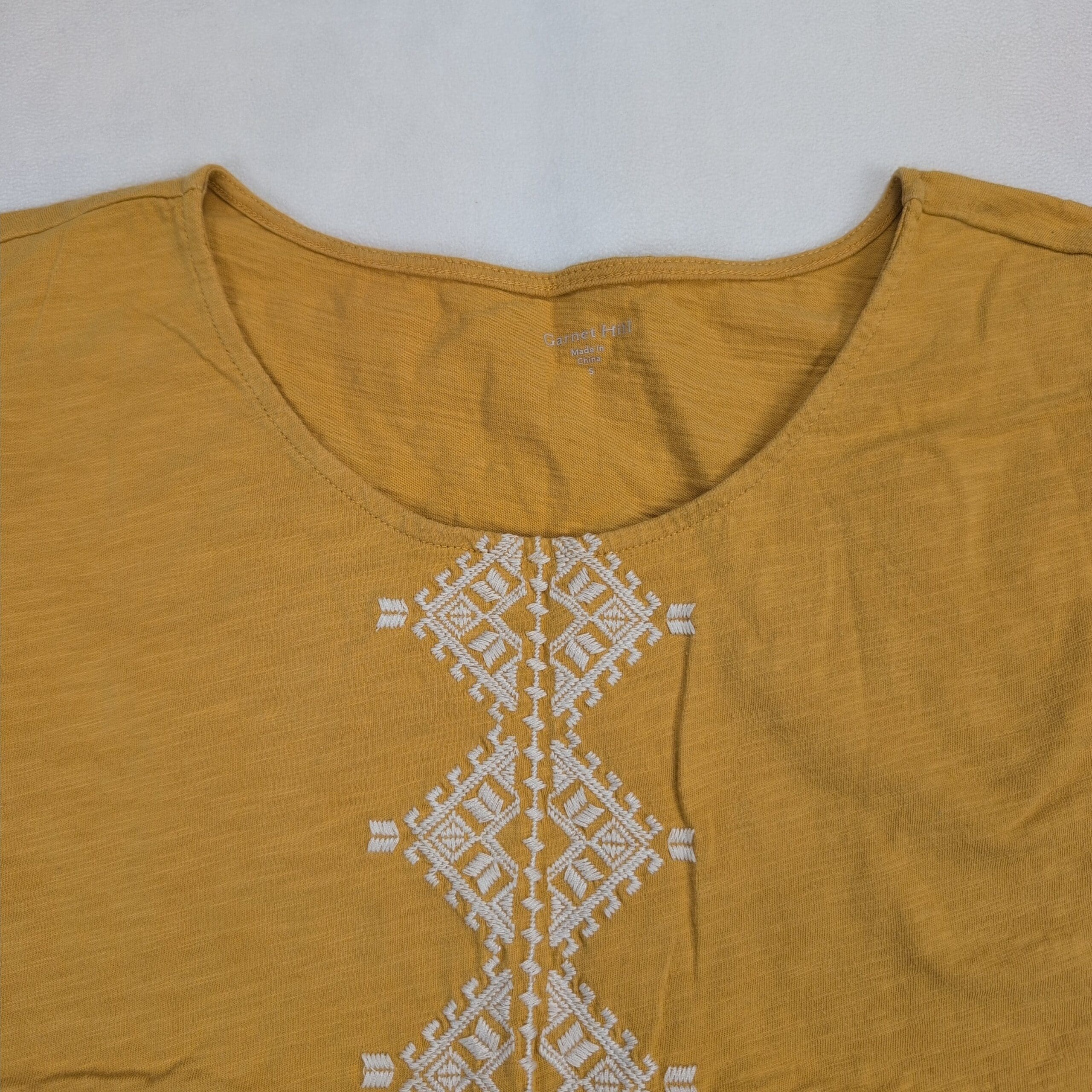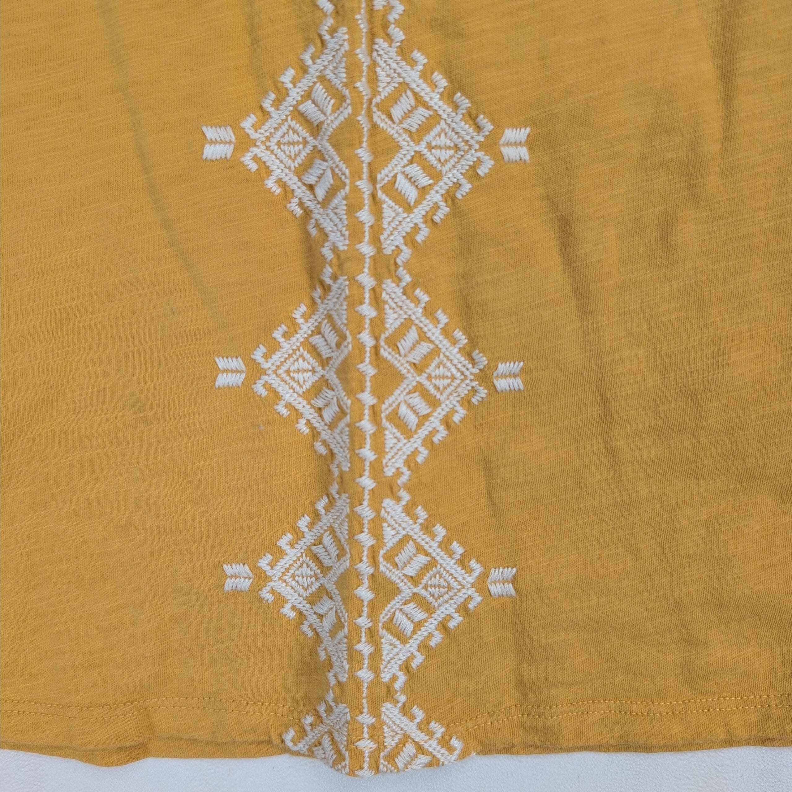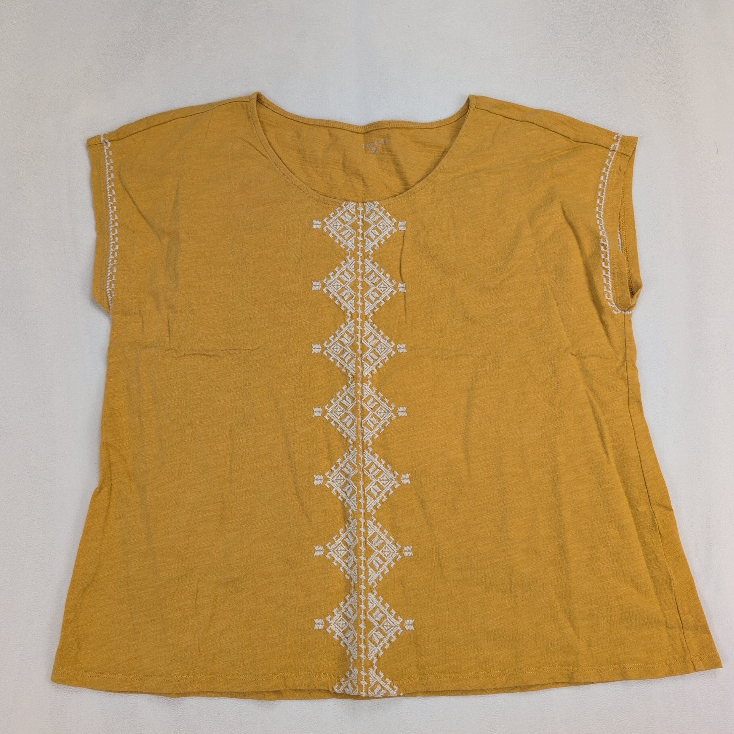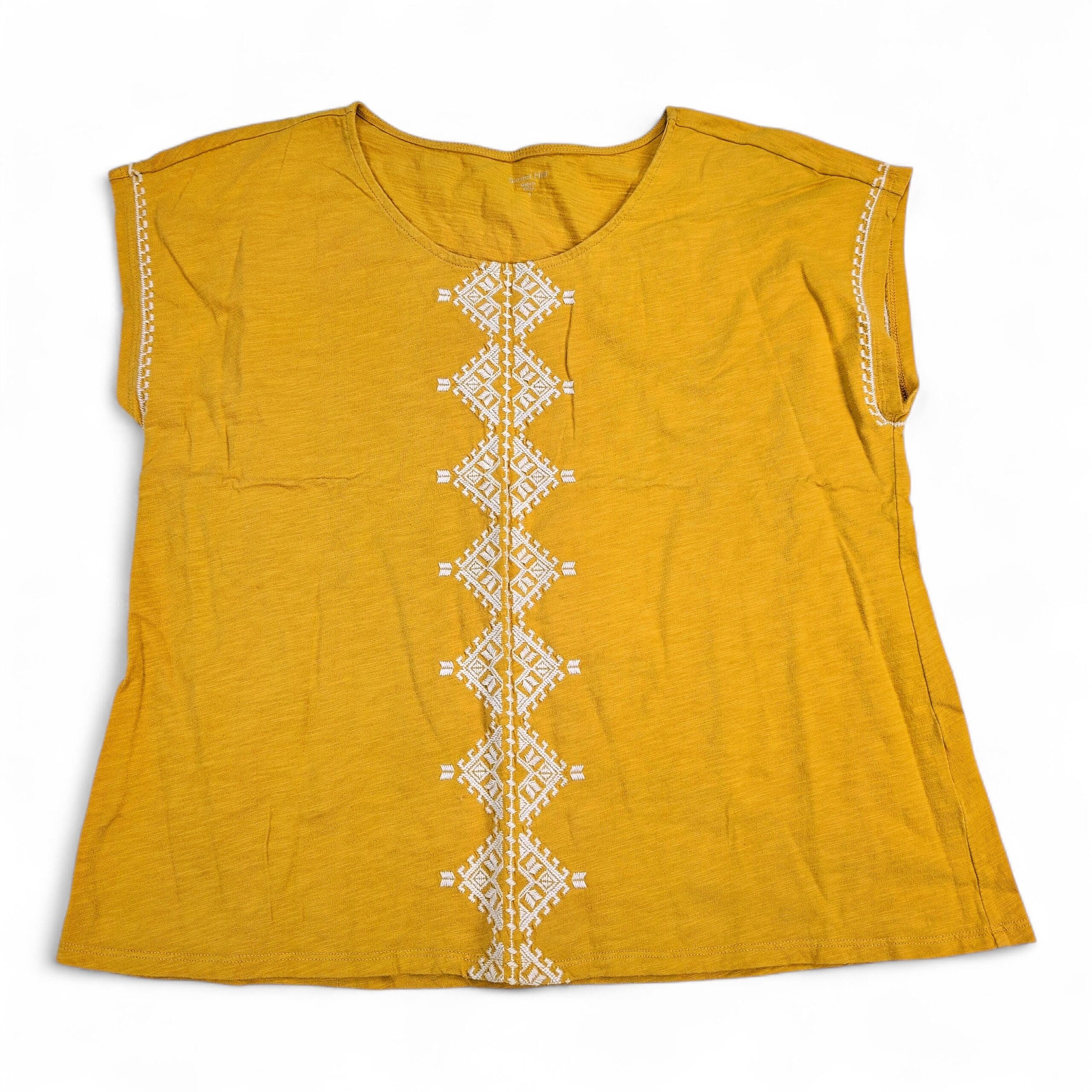 Mustard/golden organic cotton tee from Garnet Hill in size S. Features a crew neckline, cap sleeves, and a vertical white embroidered geometric panel down the center with coordinating trim at the sleeve edges. Lightweight, relaxed fit—easy to wear solo or layered. Fabric: organic cotton.