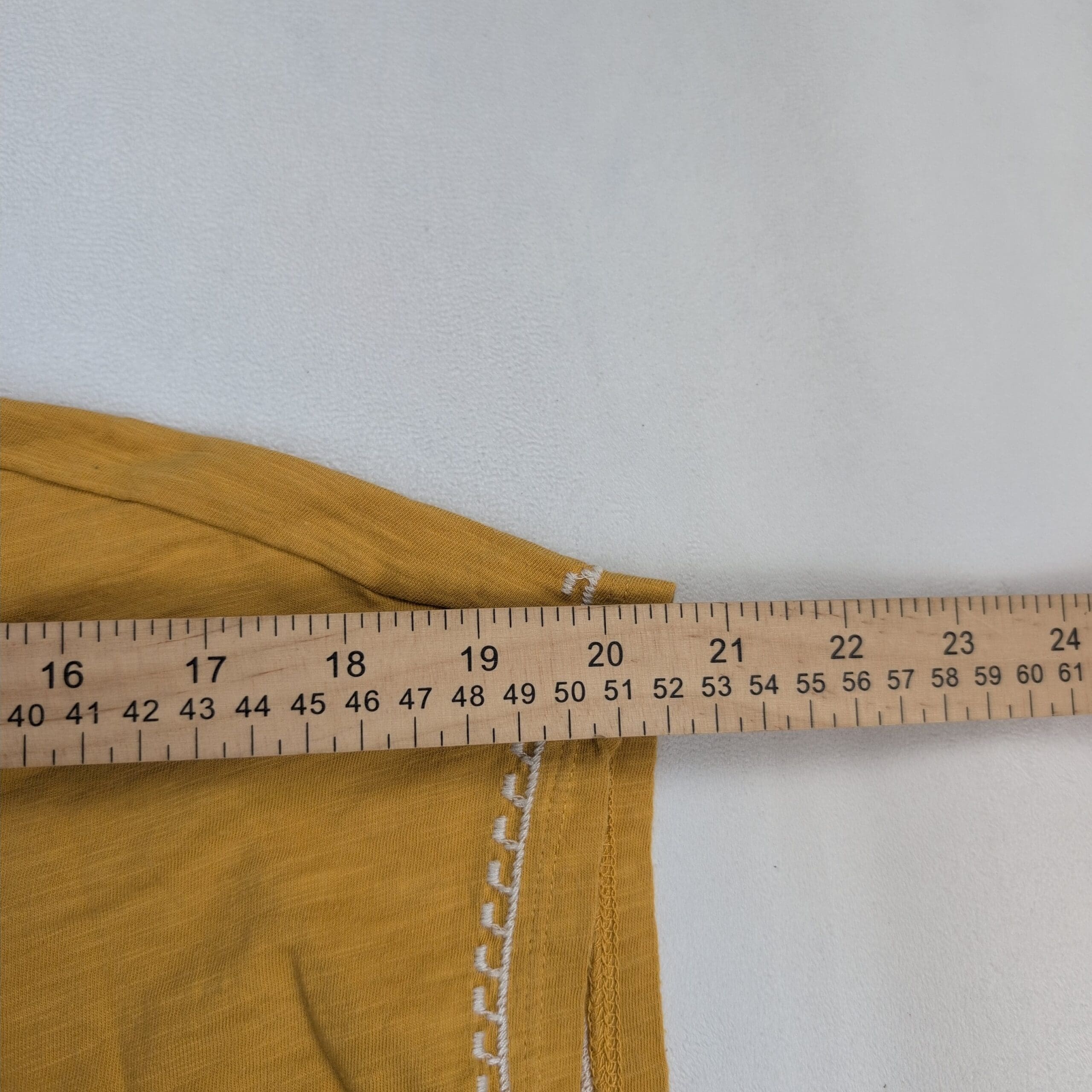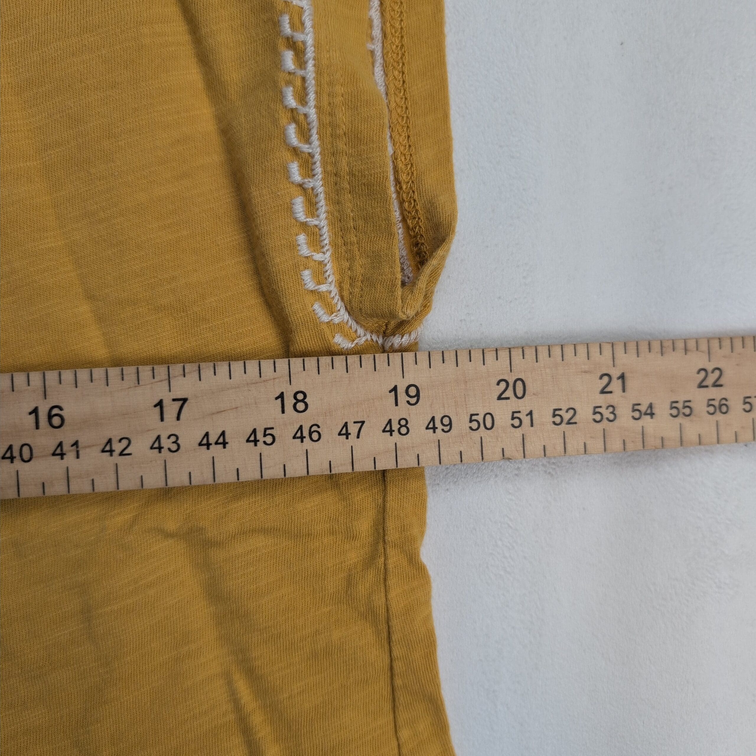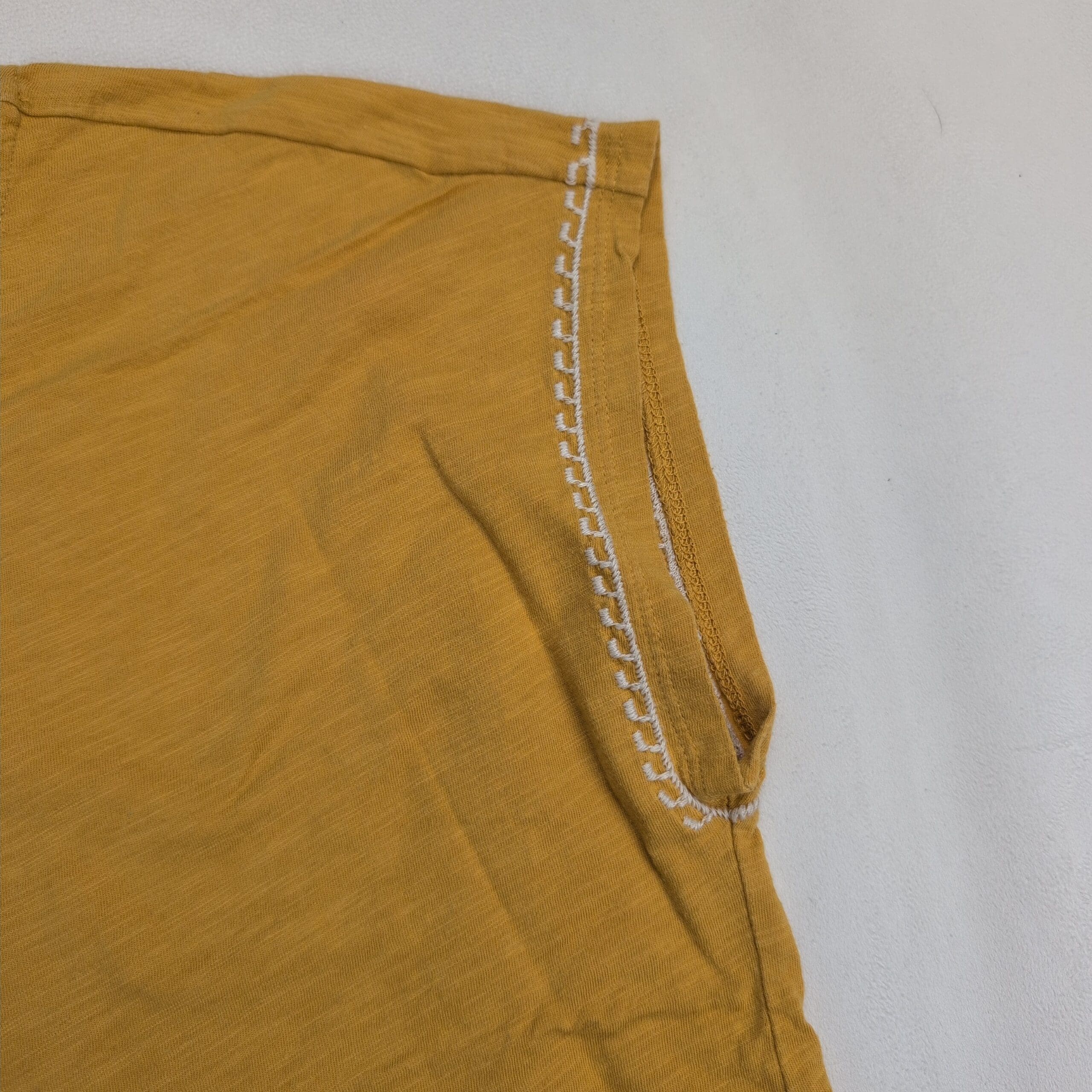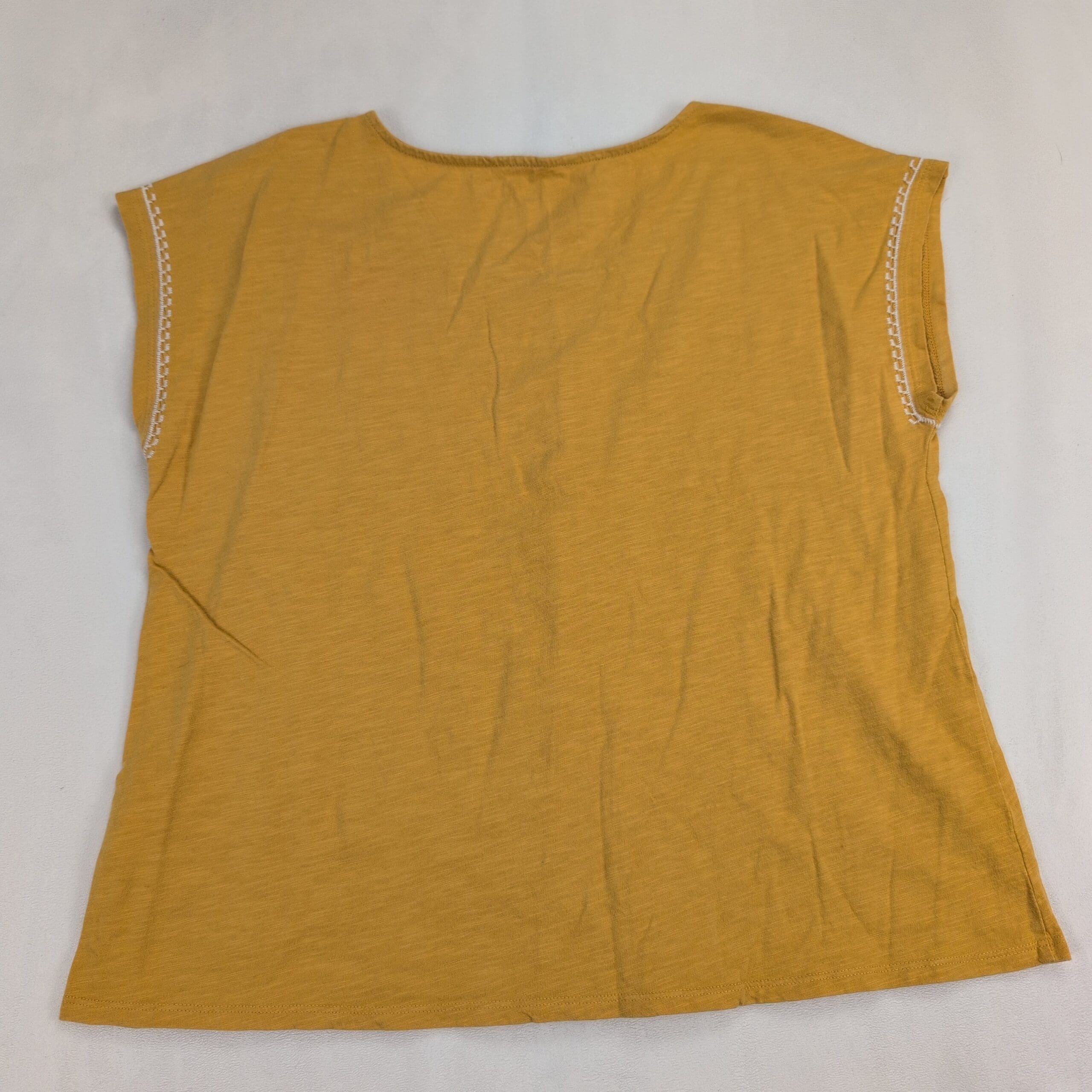 Mustard/golden organic cotton tee from Garnet Hill in size S. Features a crew neckline, cap sleeves, and a vertical white embroidered geometric panel down the center with coordinating trim at the sleeve edges. Lightweight, relaxed fit—easy to wear solo or layered. Fabric: organic cotton.