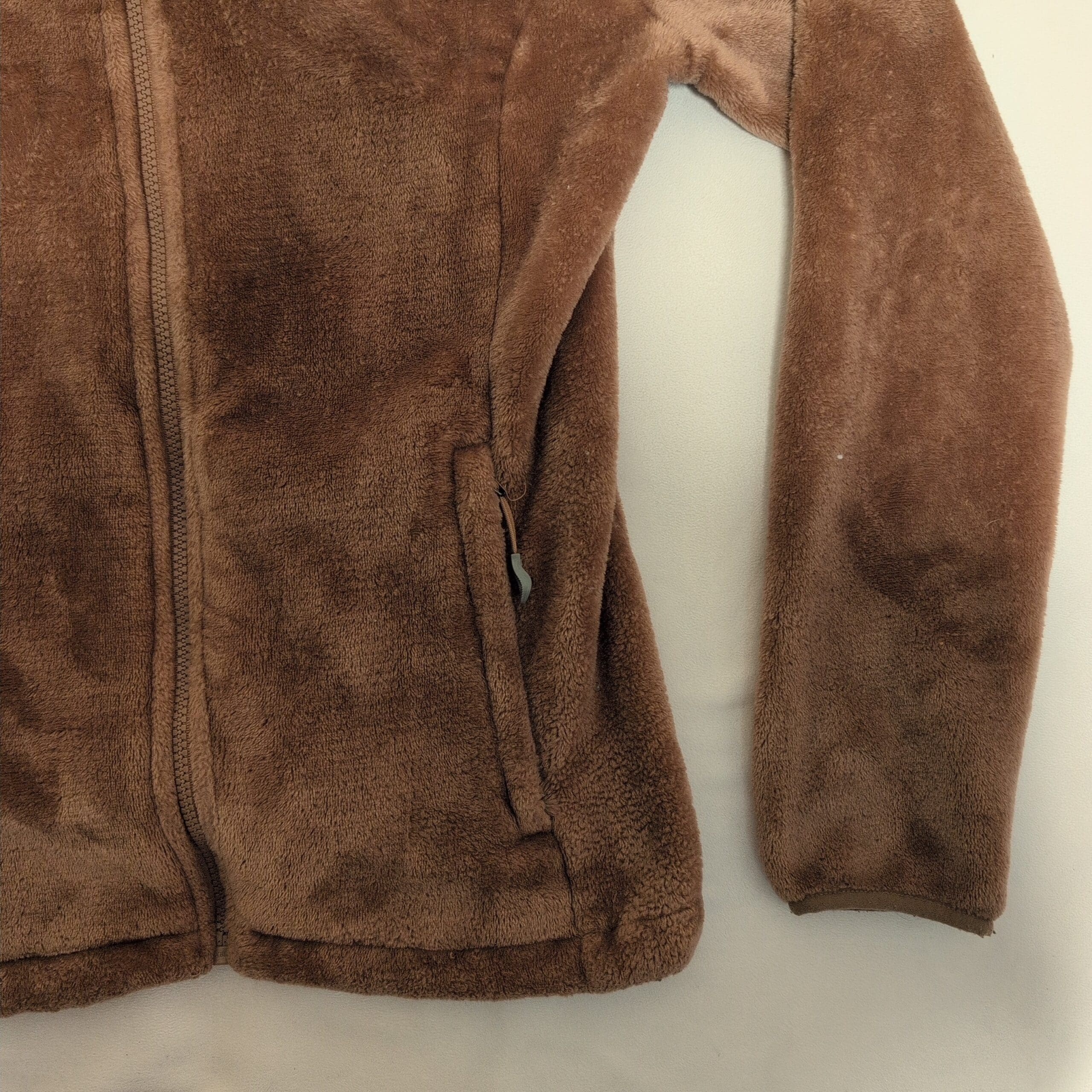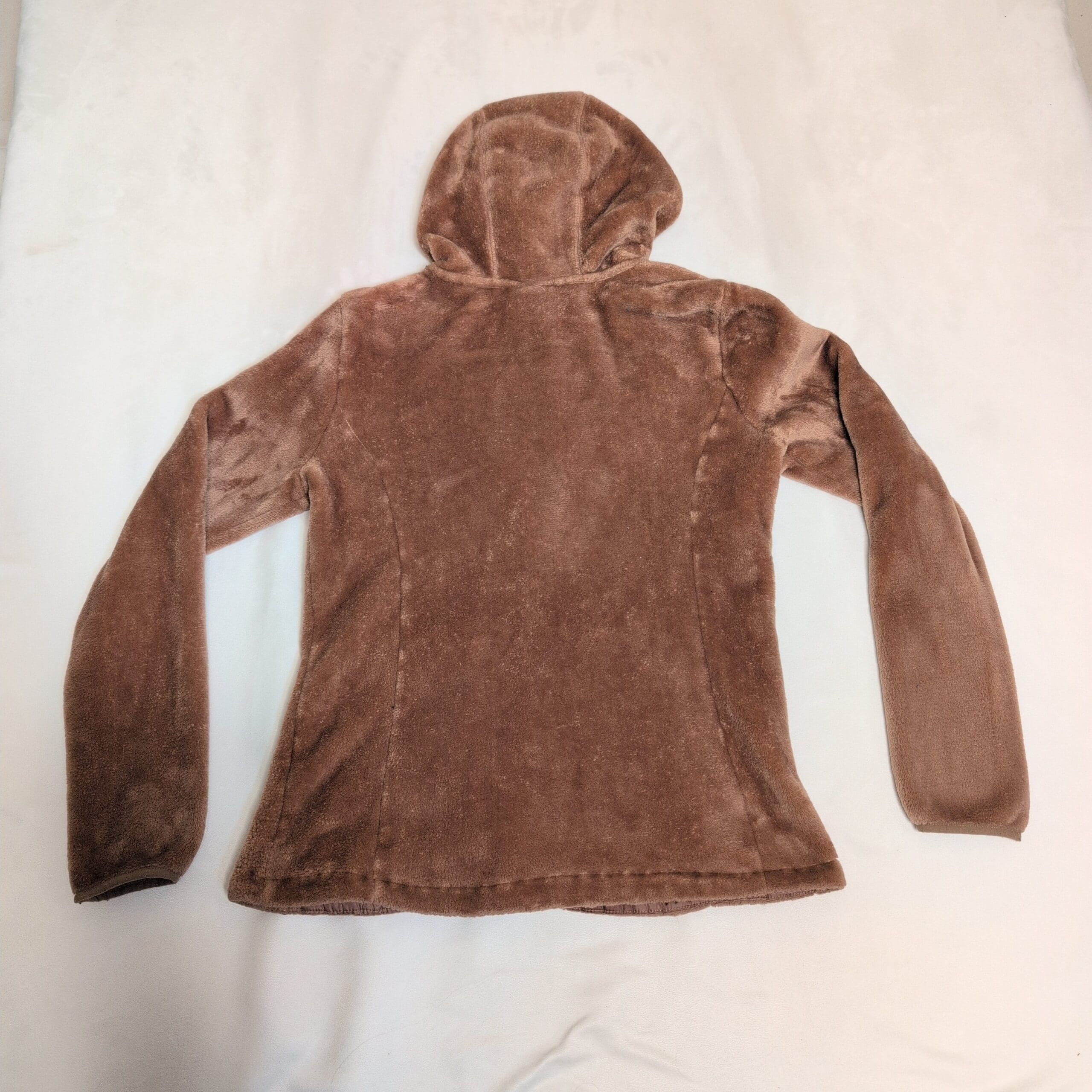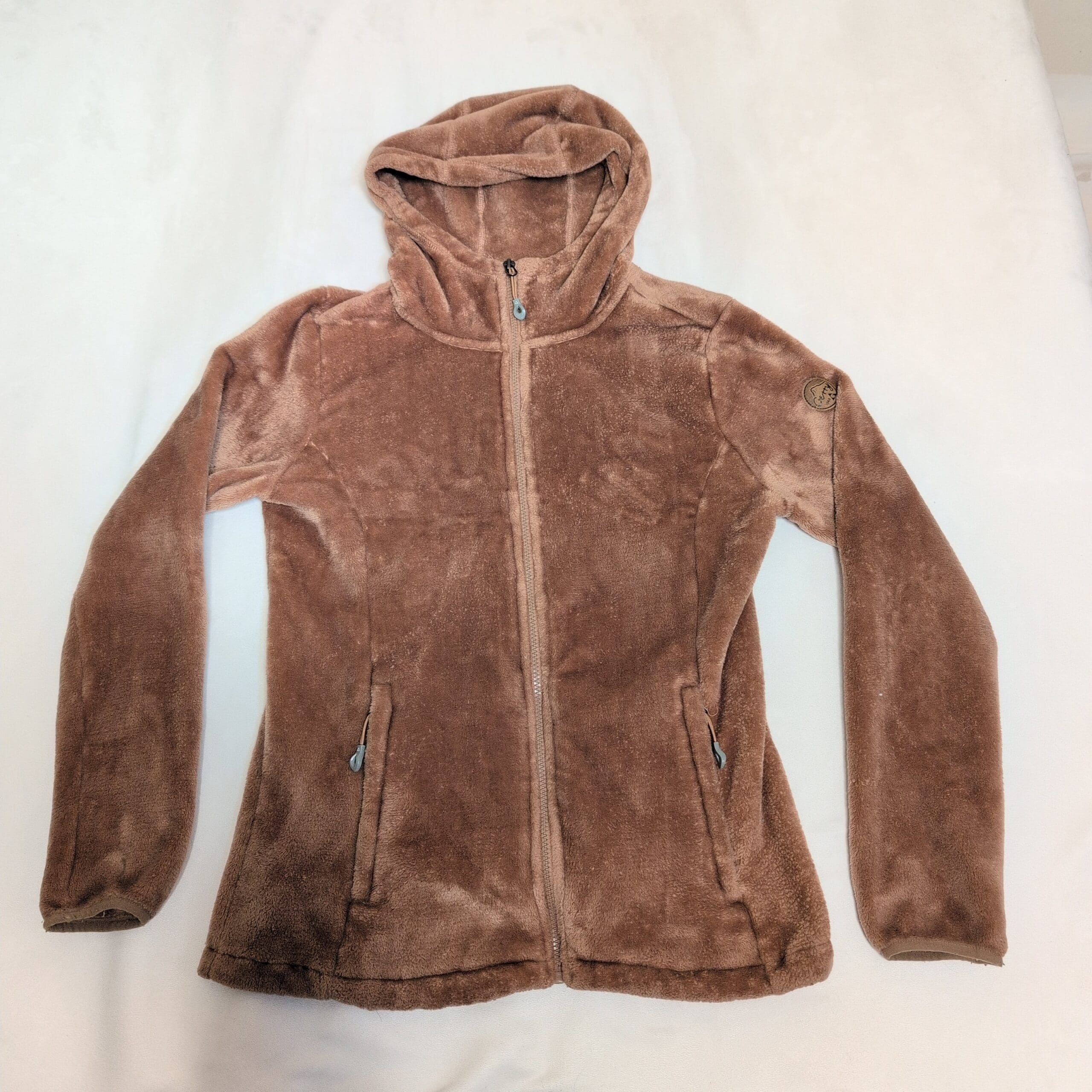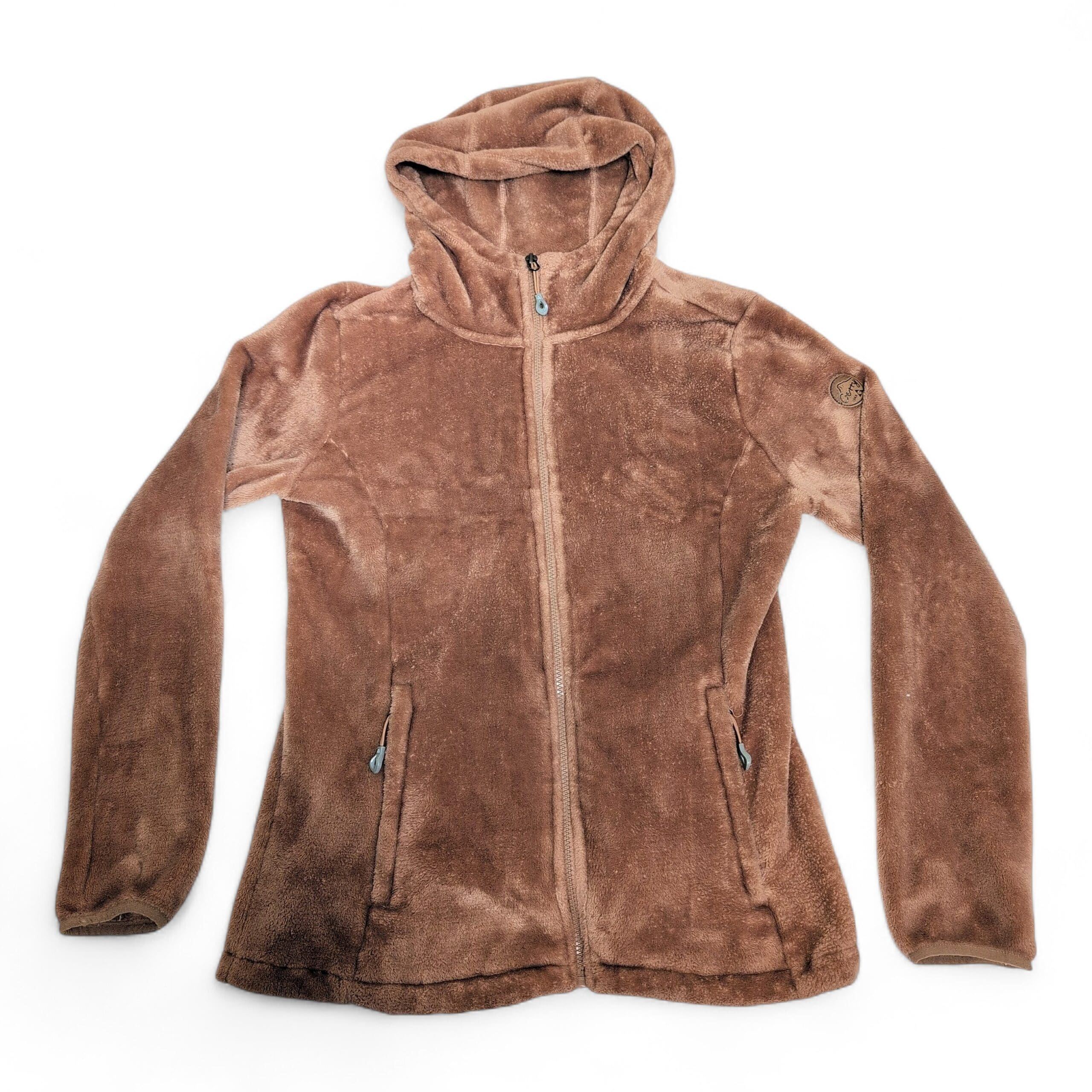 Gerry women’s brown hooded teddy jacket in size L. Plush teddy-fleece construction with a full front zipper, attached hood, and two zippered hand pockets for secure storage. Soft, cozy layer ideal for cool-weather wear; fitted silhouette that works well for everyday casual outfits. Gently used and free of major rips, tears, or stains—typical light wear to the pile may be present. Brand patch on the sleeve adds a subtle logo detail.