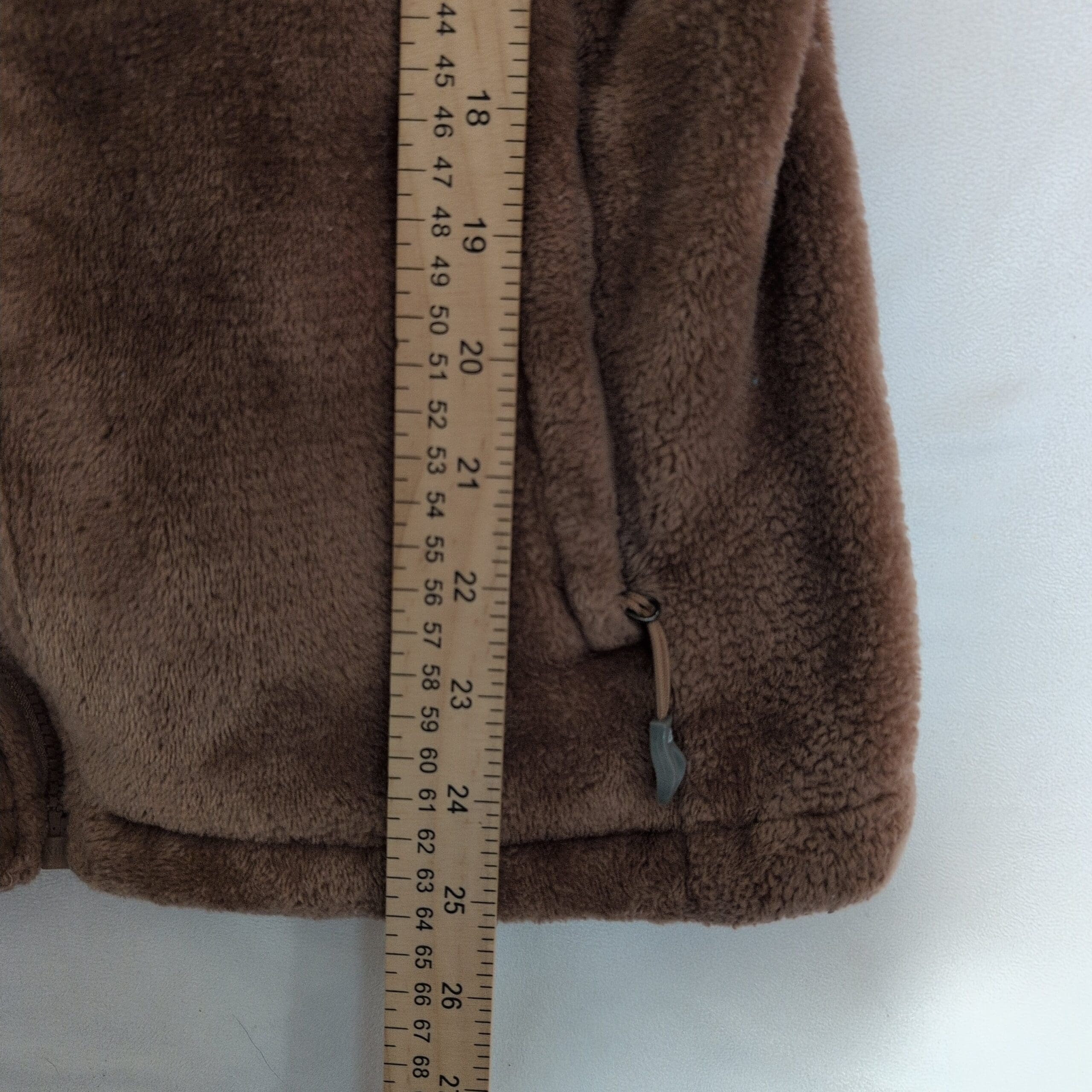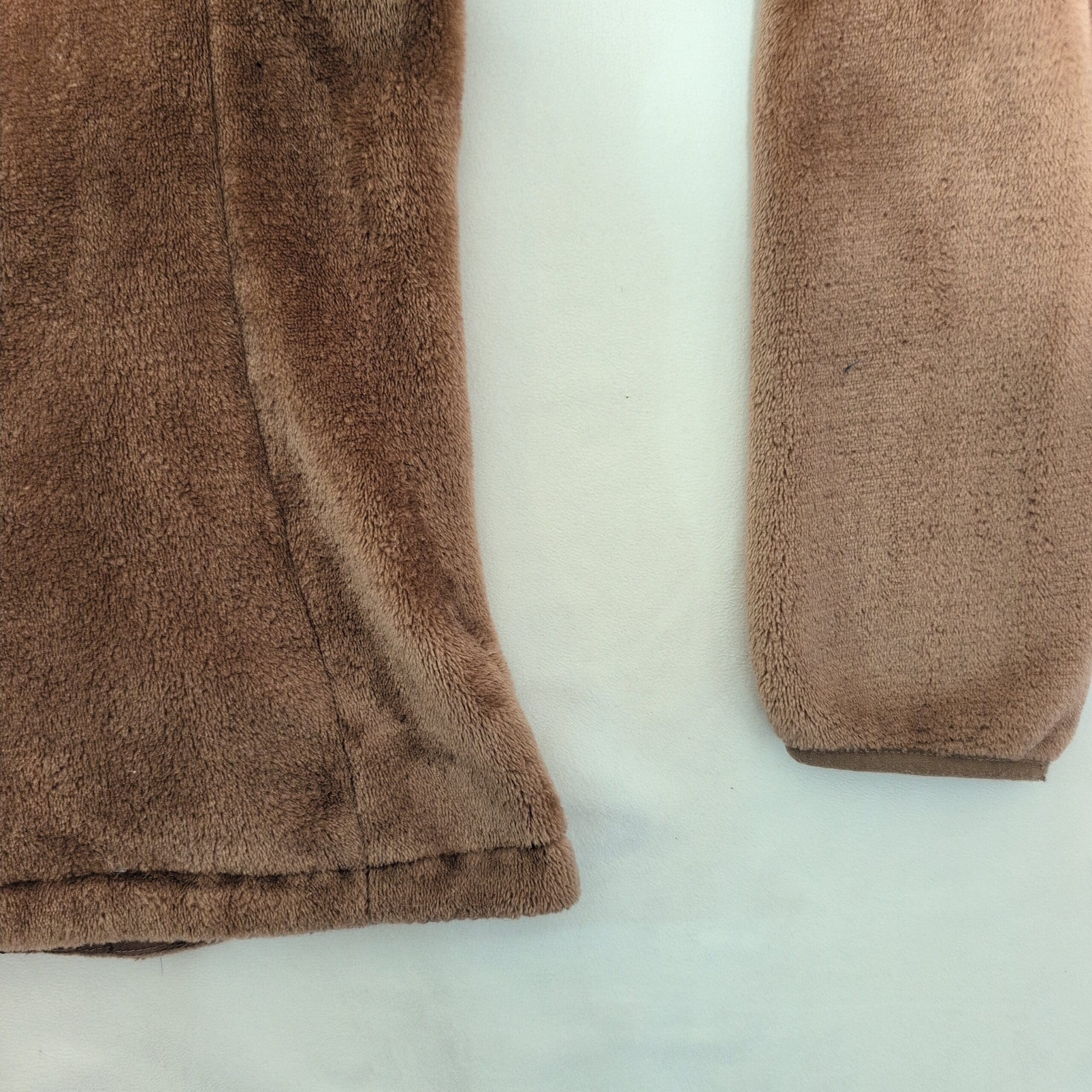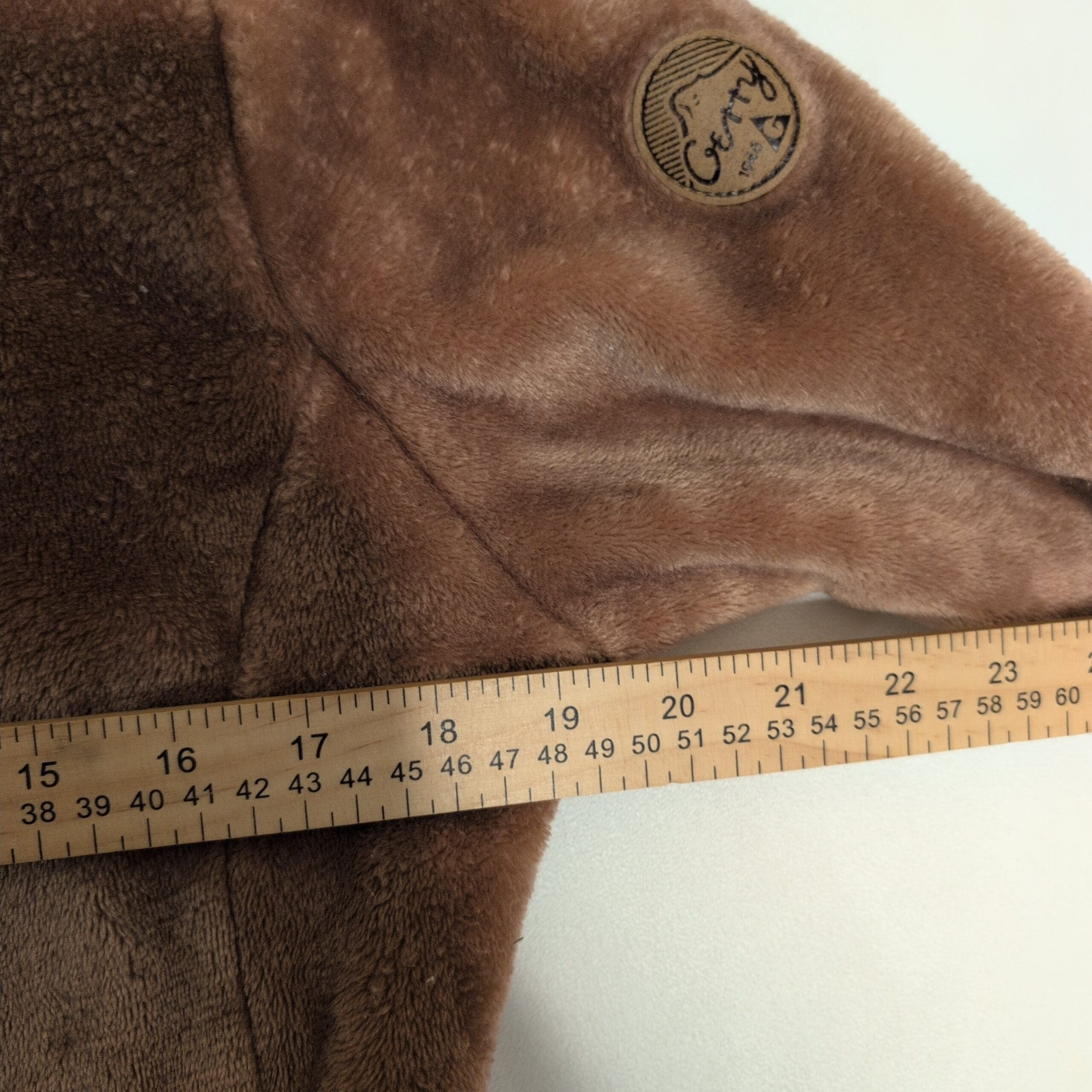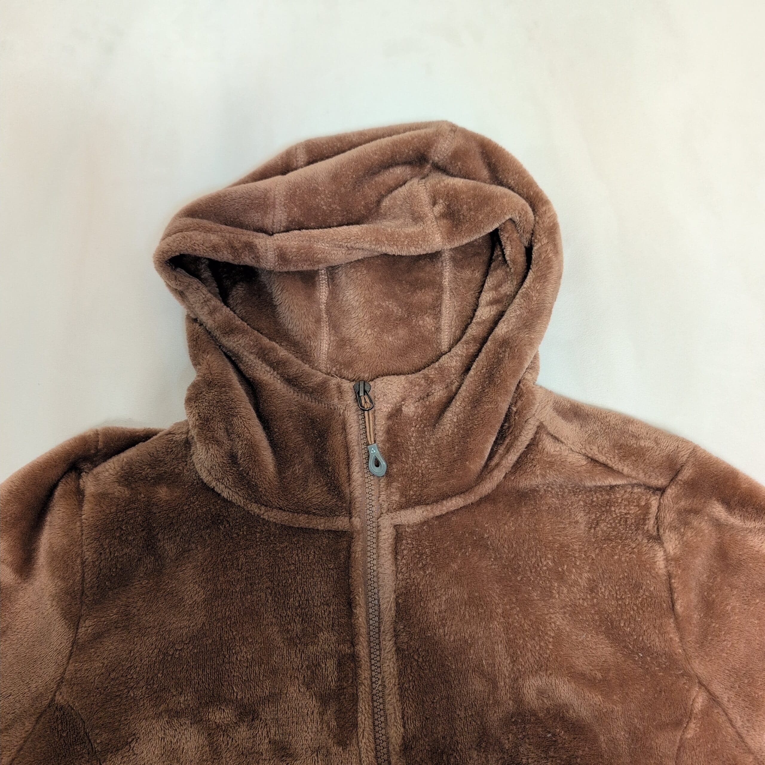 Gerry women’s brown hooded teddy jacket in size L. Plush teddy-fleece construction with a full front zipper, attached hood, and two zippered hand pockets for secure storage. Soft, cozy layer ideal for cool-weather wear; fitted silhouette that works well for everyday casual outfits. Gently used and free of major rips, tears, or stains—typical light wear to the pile may be present. Brand patch on the sleeve adds a subtle logo detail.