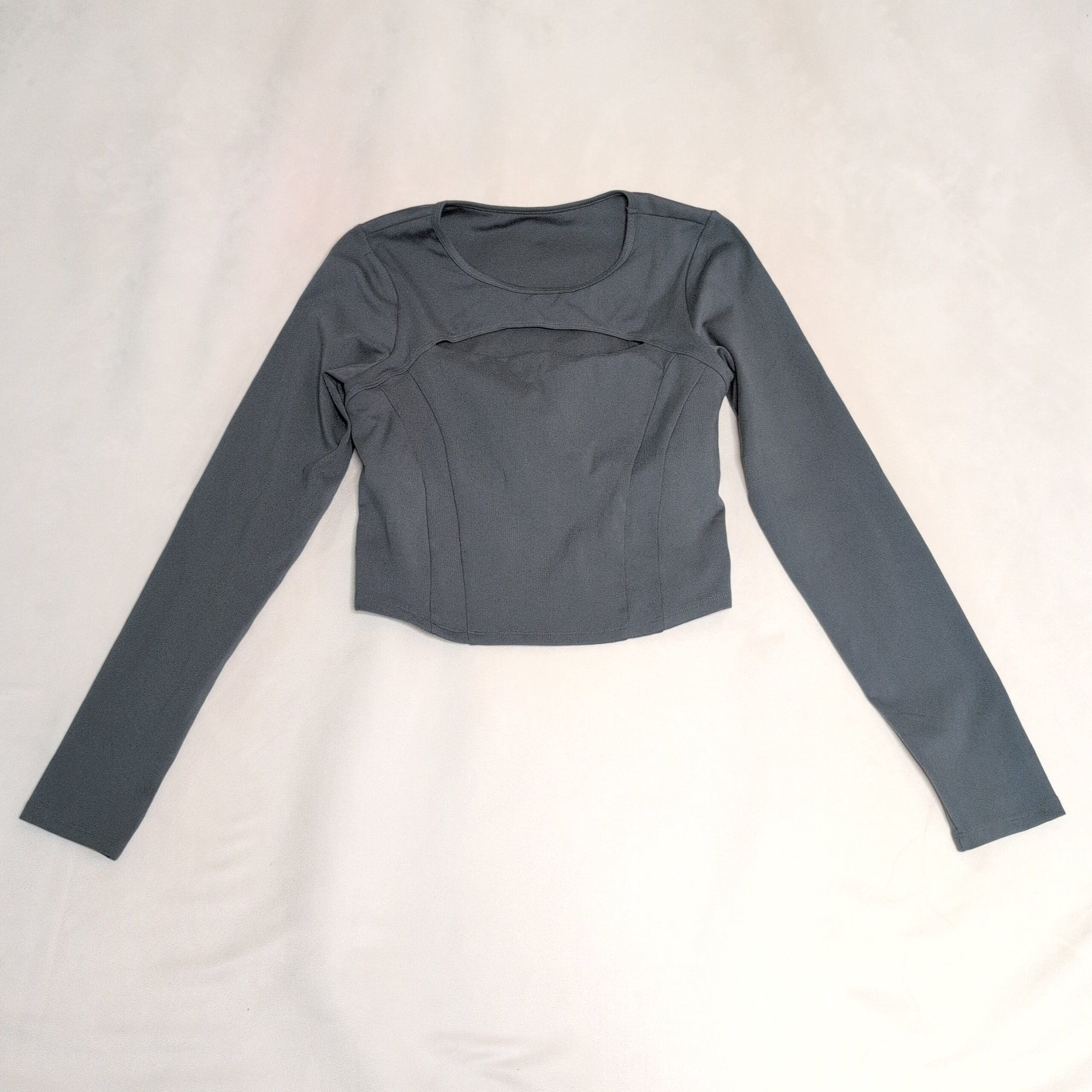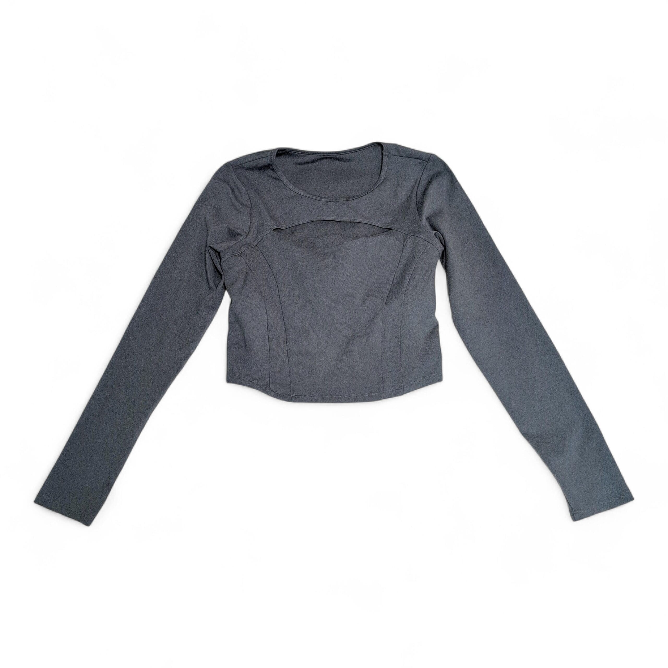 Gently fitted Gilly Hicks long-sleeve cropped active top in gray, size M. Features supportive seaming and a clean neckline with a subtle chest cutout detail. Built-in bra pads provide light support for low- to medium-impact activities — great for workouts or stylish layering.