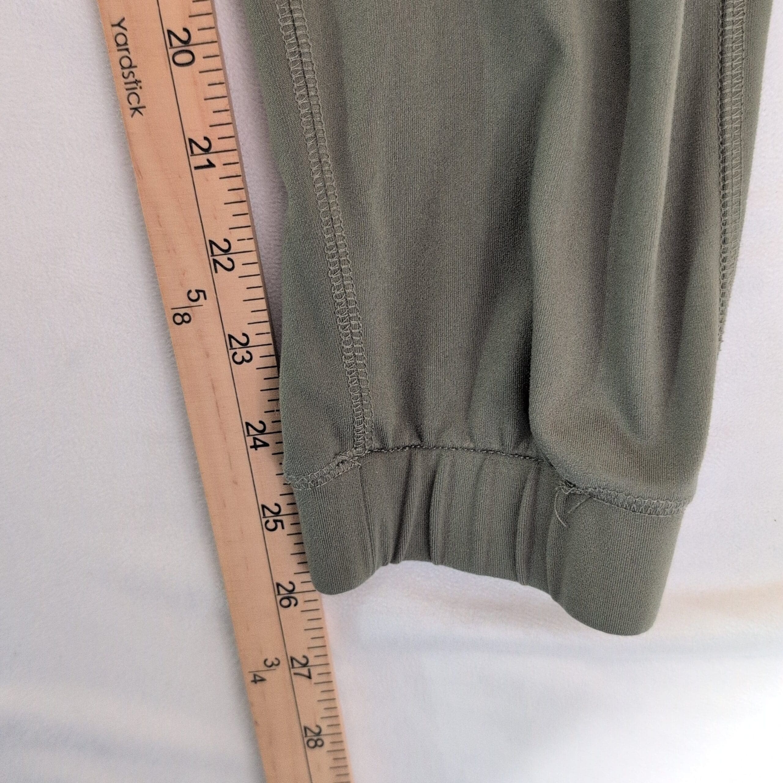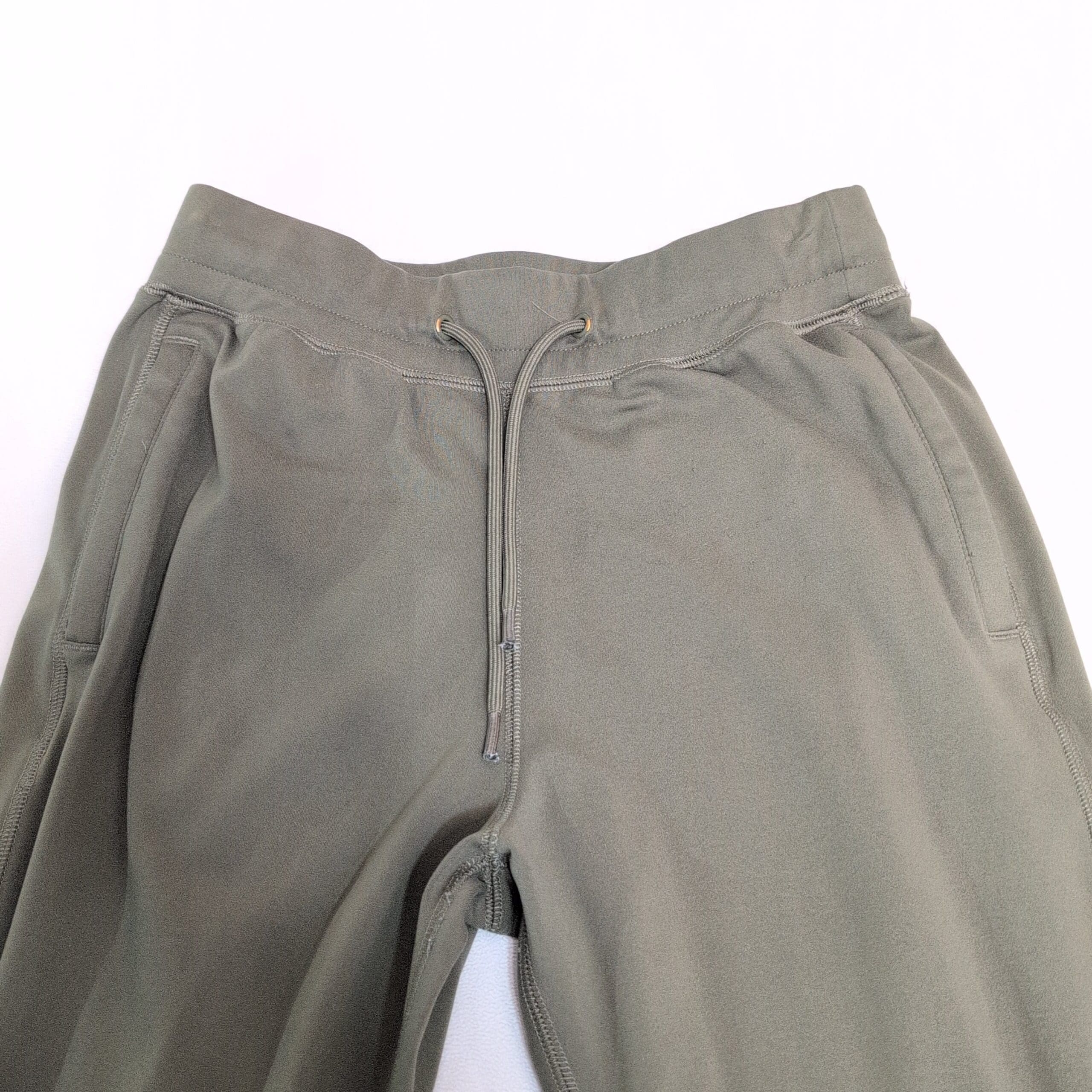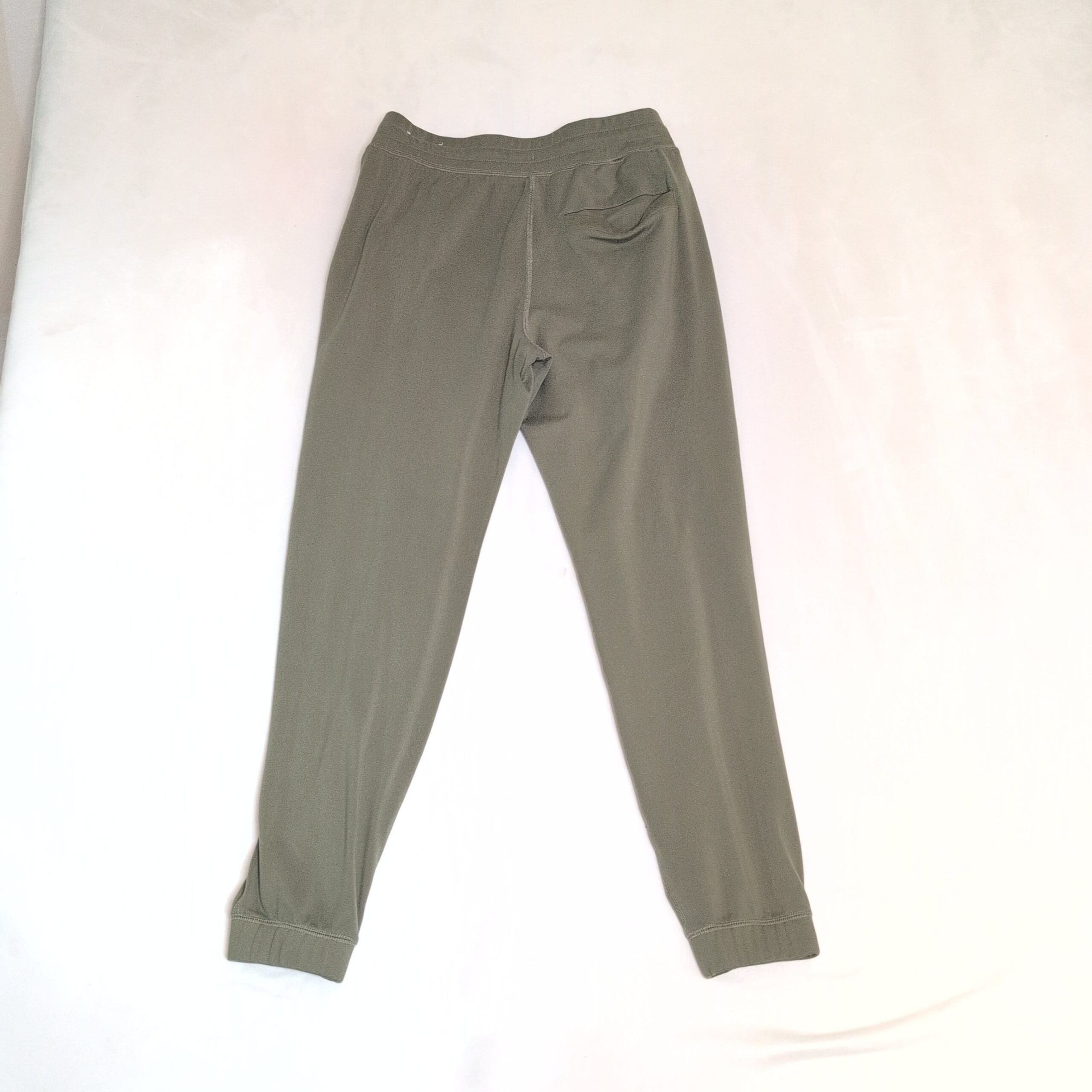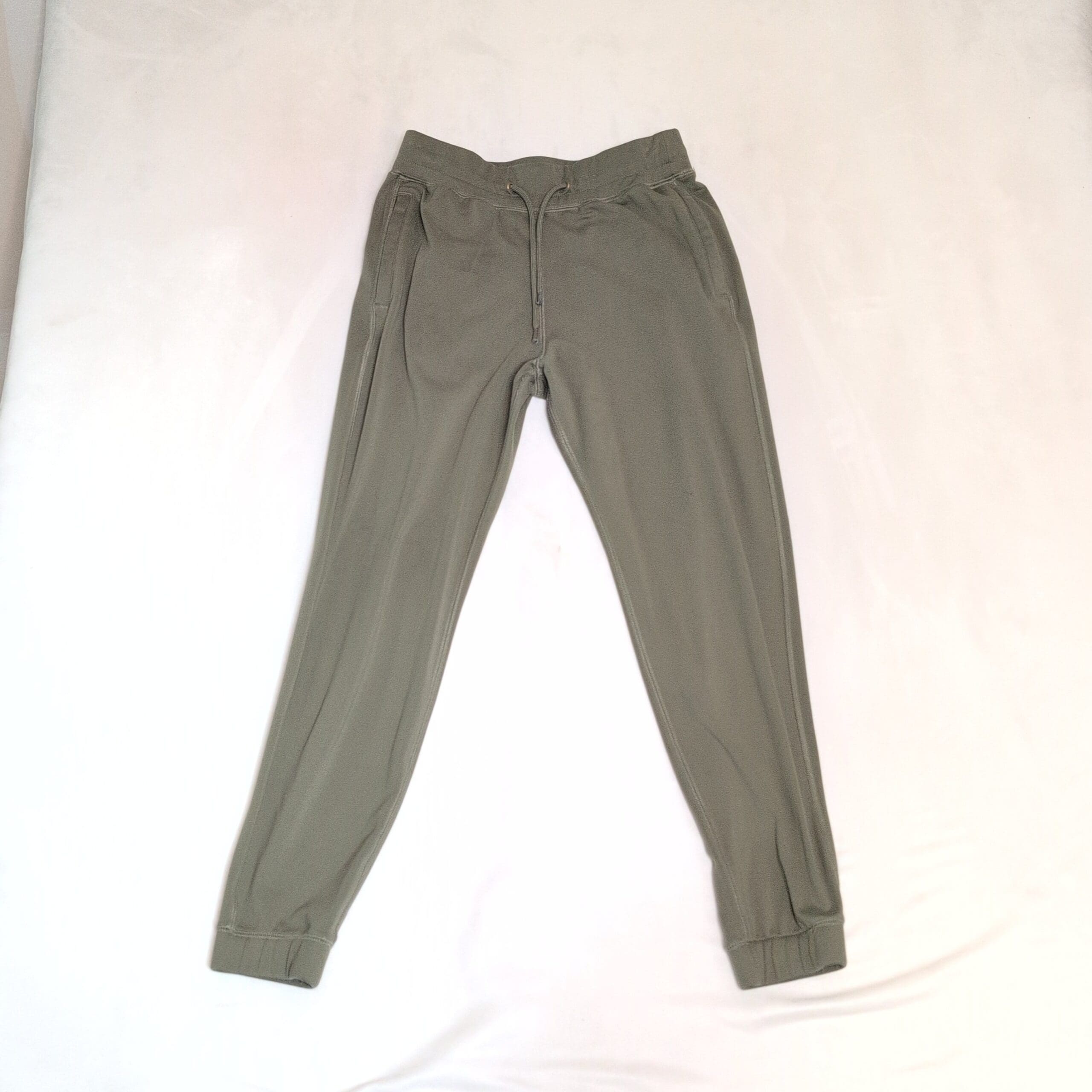 Gently used Gilly Hicks jogger pants in olive green, size XS. Features a drawstring elastic waist, side pockets, and elastic cuffs for a tapered fit. Comfortable midweight fabric perfect for lounging or everyday wear. Some piling on the front as pictured; otherwise free of major rips, tears, or stains. Typical wear may be present.