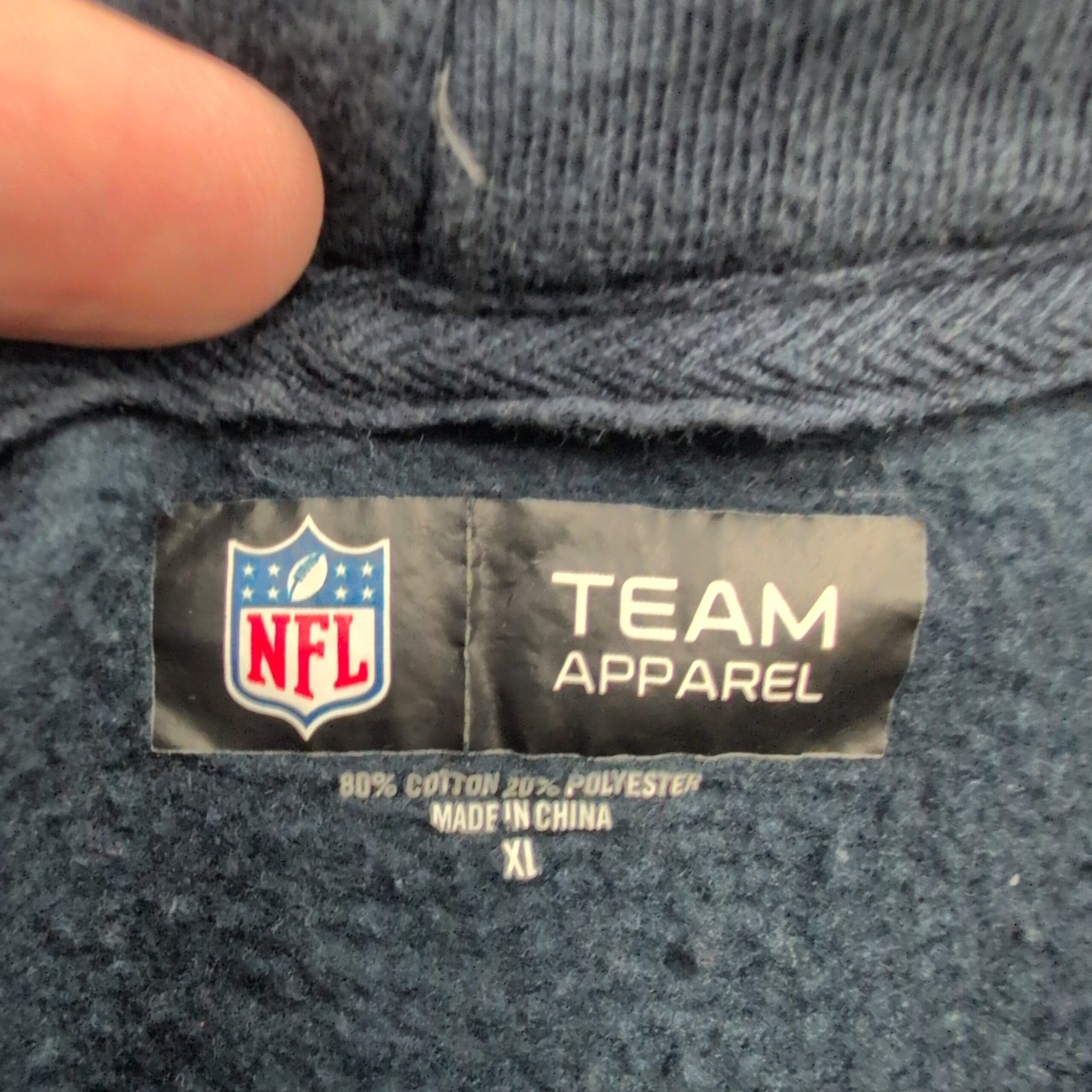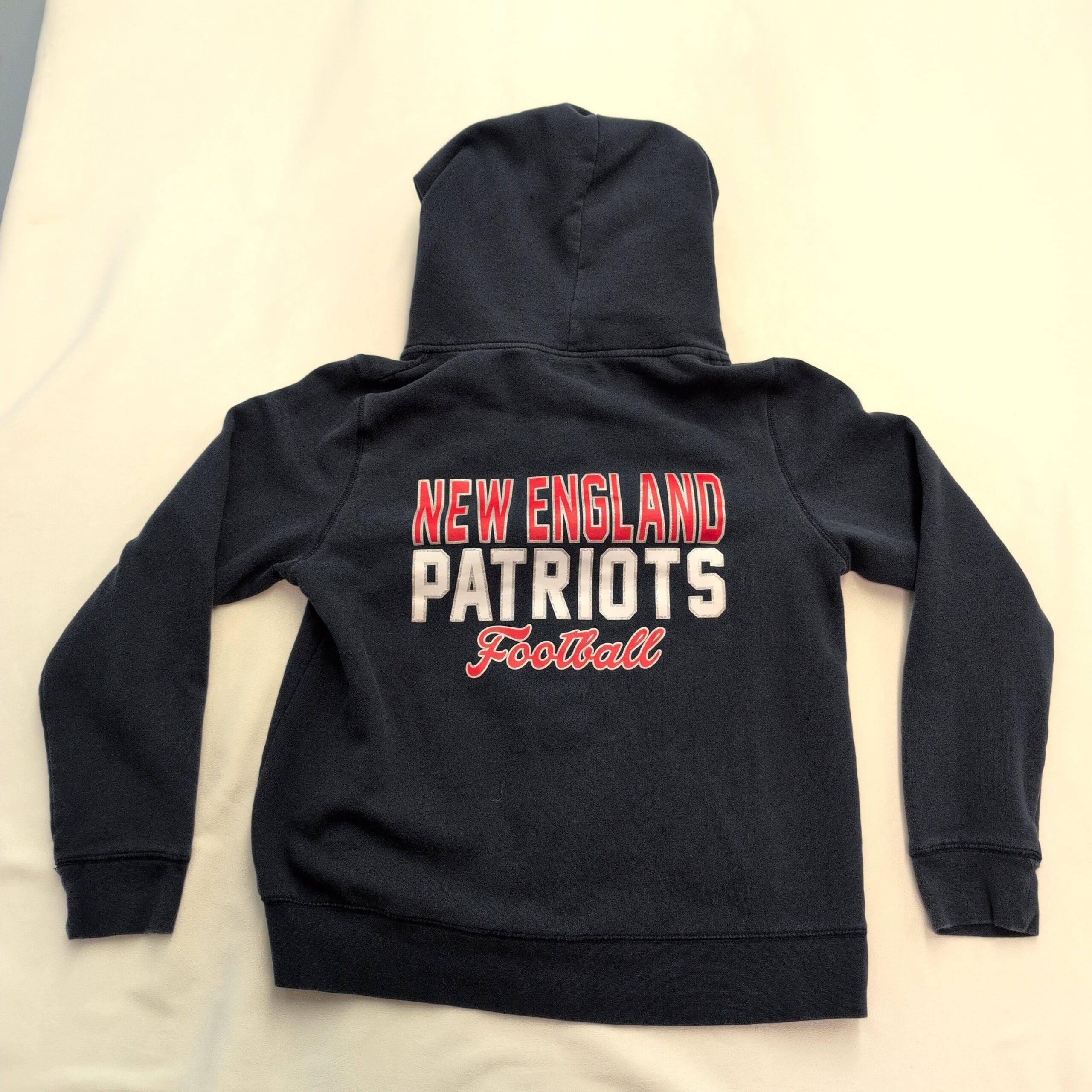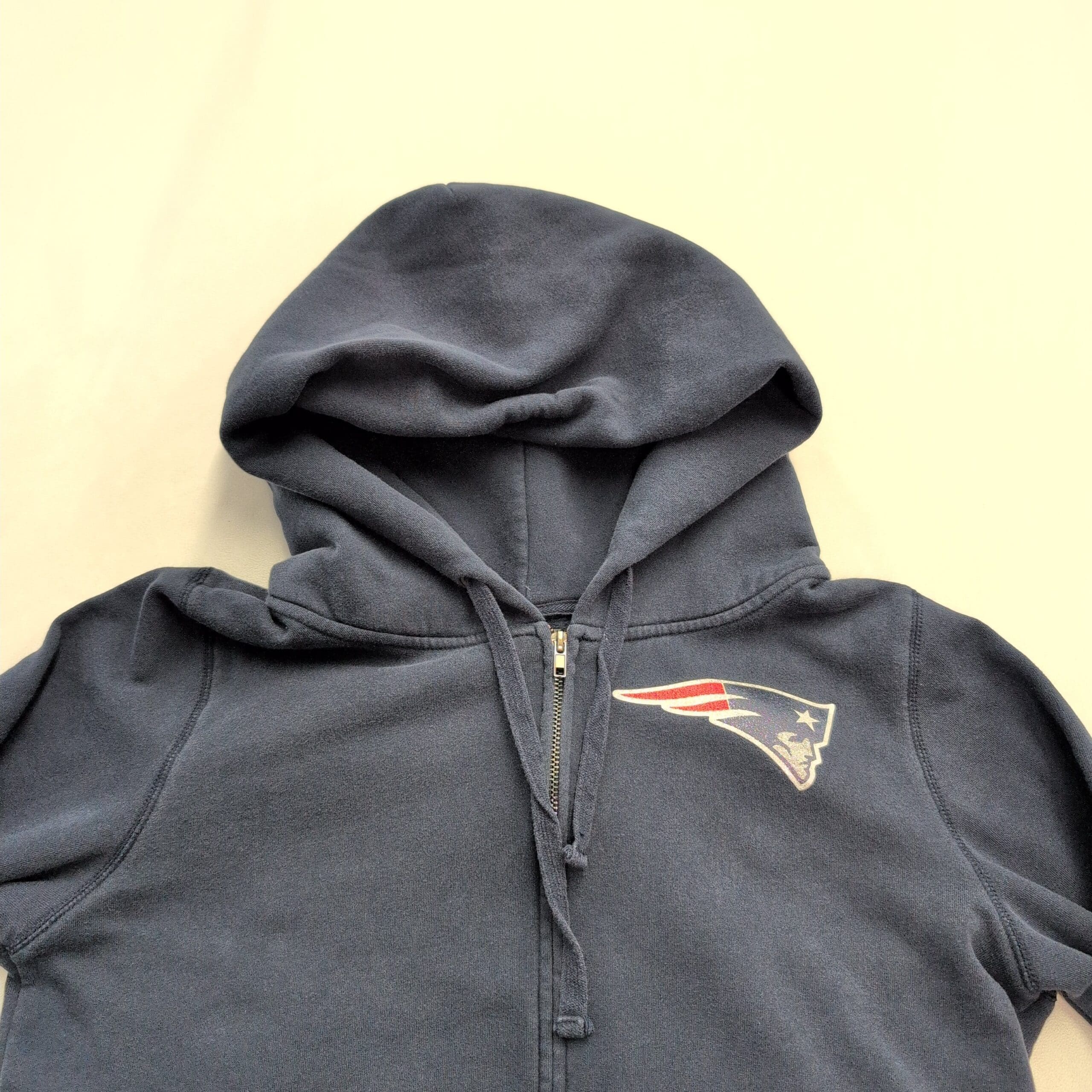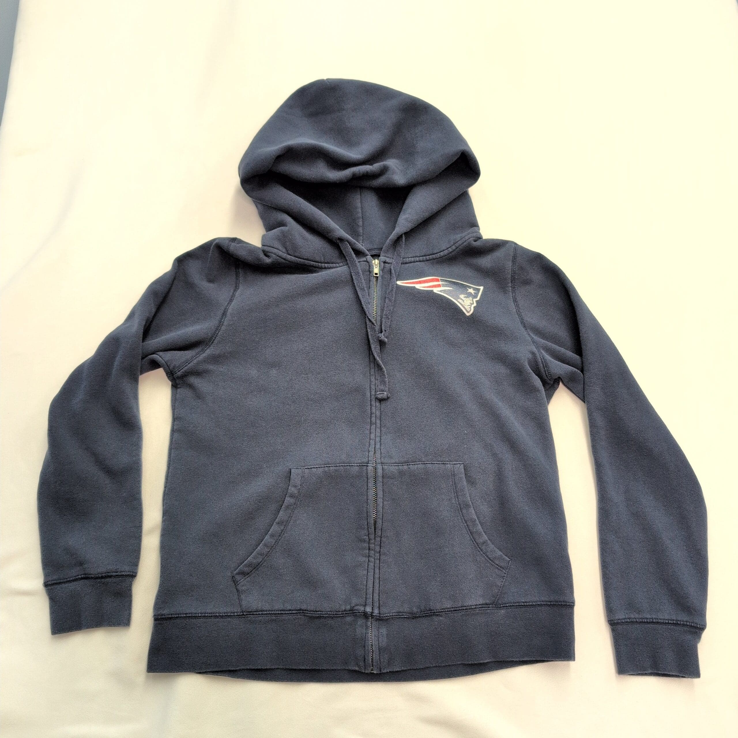 NFL Shop girls XL zip-up hoodie in navy — perfect for game days or everyday wear. Features a full front zipper, attached hood with drawstring, kangaroo pocket, and ribbed cuffs and hem. Team logo on chest with white outlines that include a subtle glitter detail (glitter is difficult to capture in photos). Gently used and free of major rips, tears, stains, or flaws; typical wear may be present.