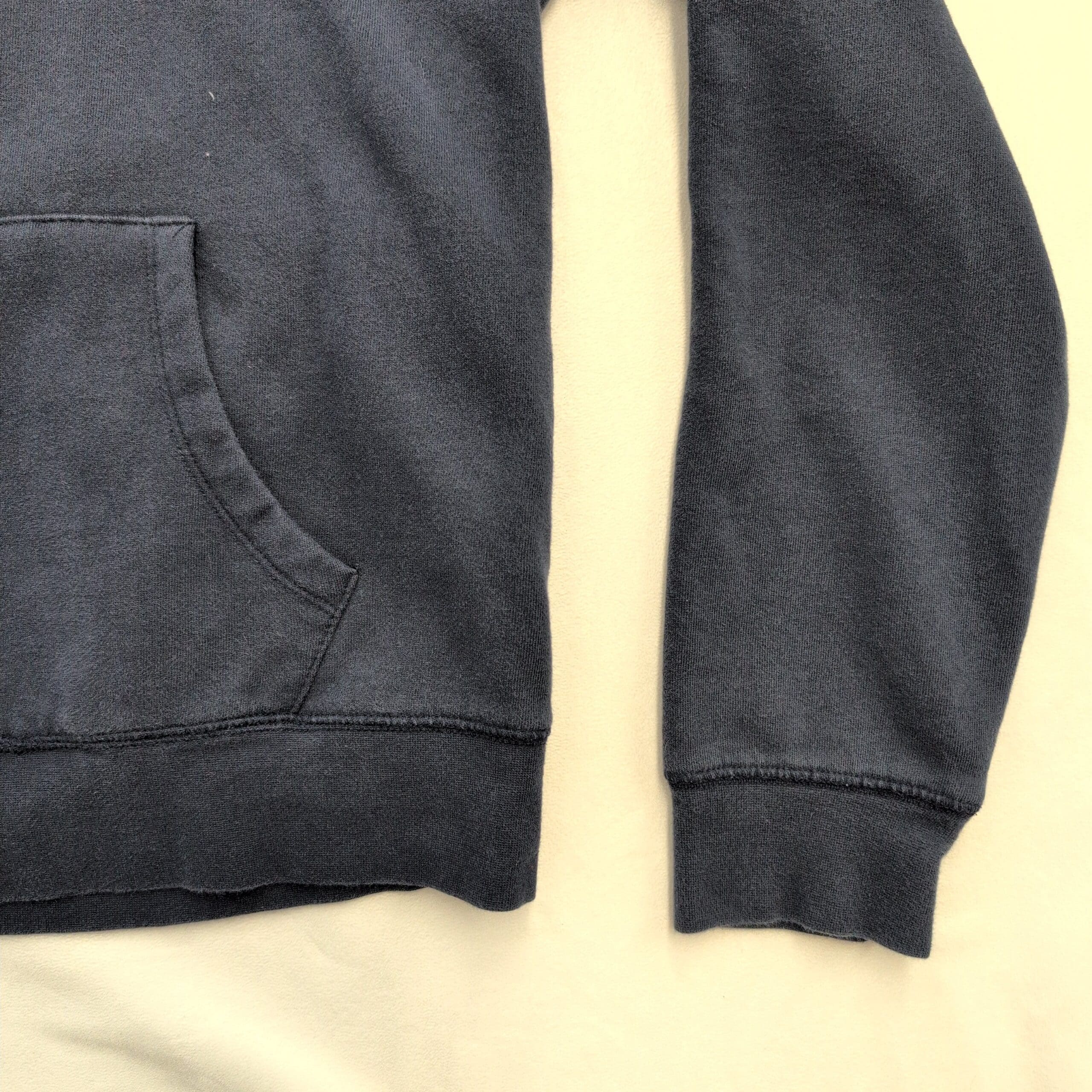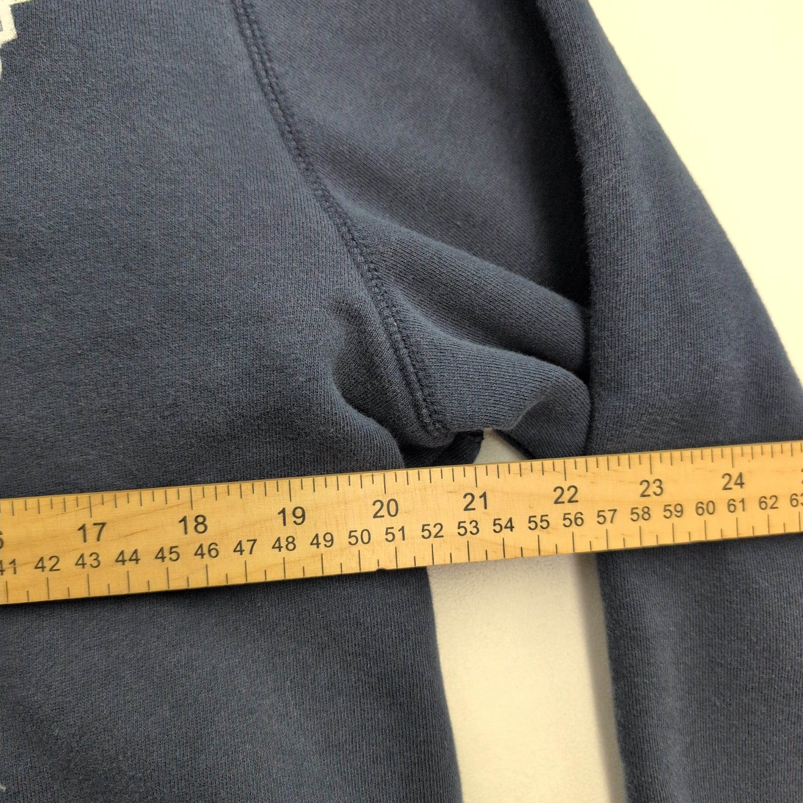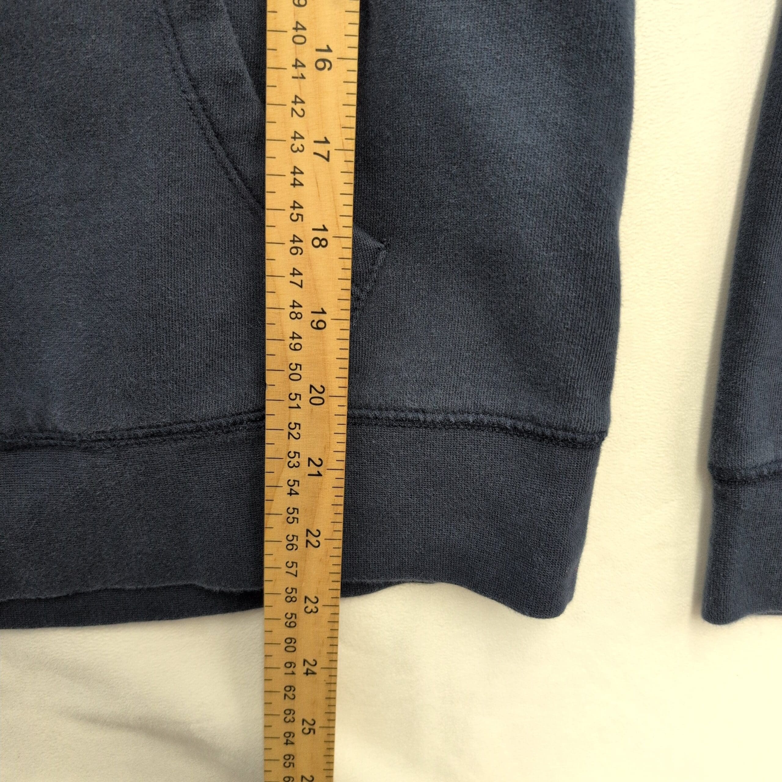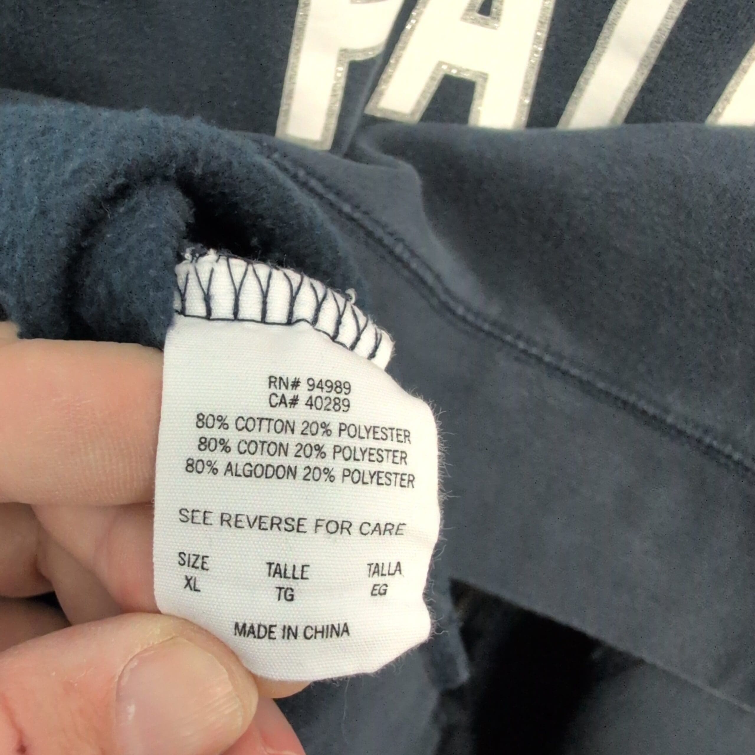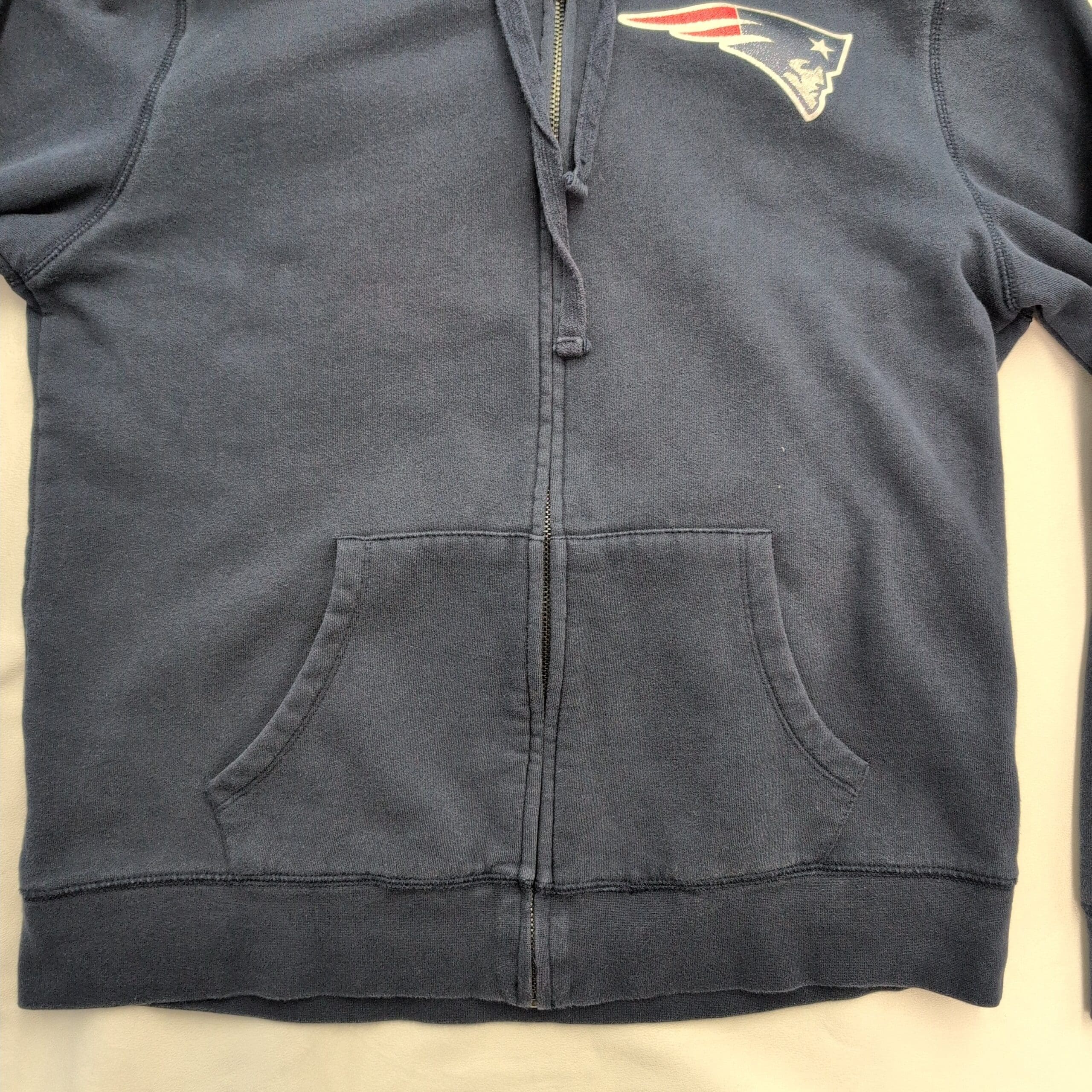 NFL Shop girls XL zip-up hoodie in navy — perfect for game days or everyday wear. Features a full front zipper, attached hood with drawstring, kangaroo pocket, and ribbed cuffs and hem. Team logo on chest with white outlines that include a subtle glitter detail (glitter is difficult to capture in photos). Gently used and free of major rips, tears, stains, or flaws; typical wear may be present.