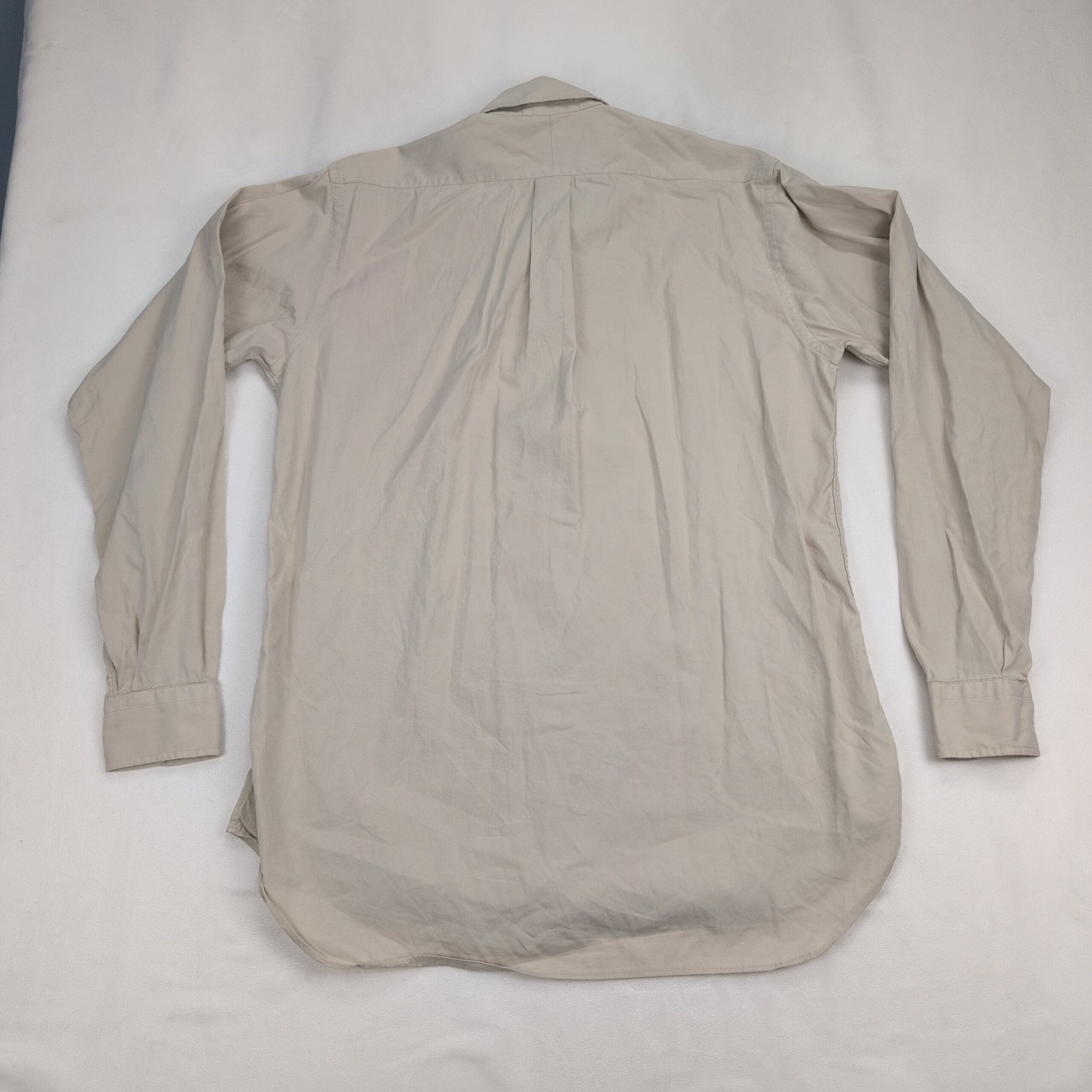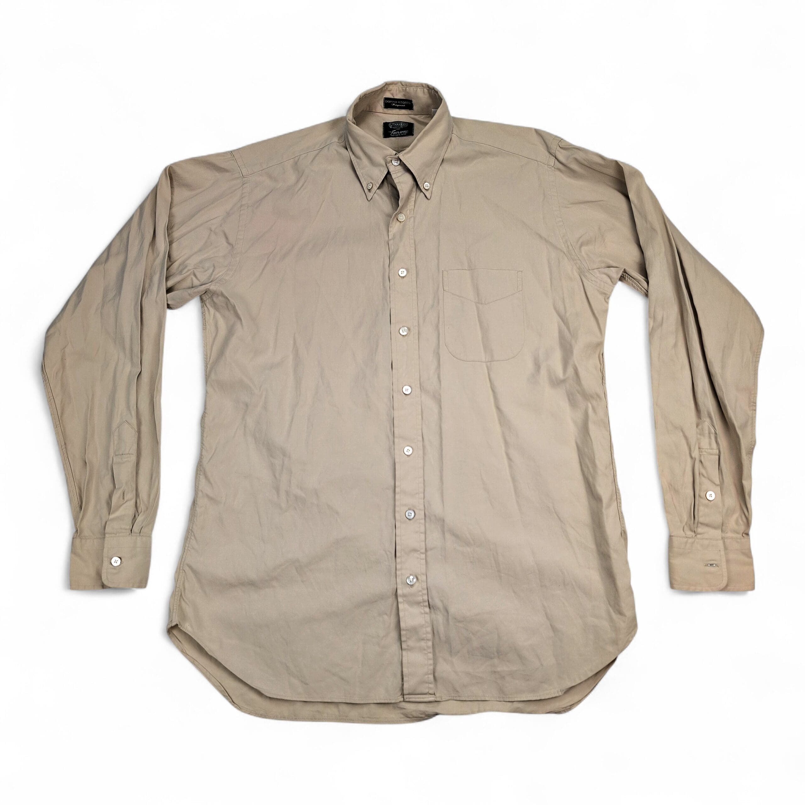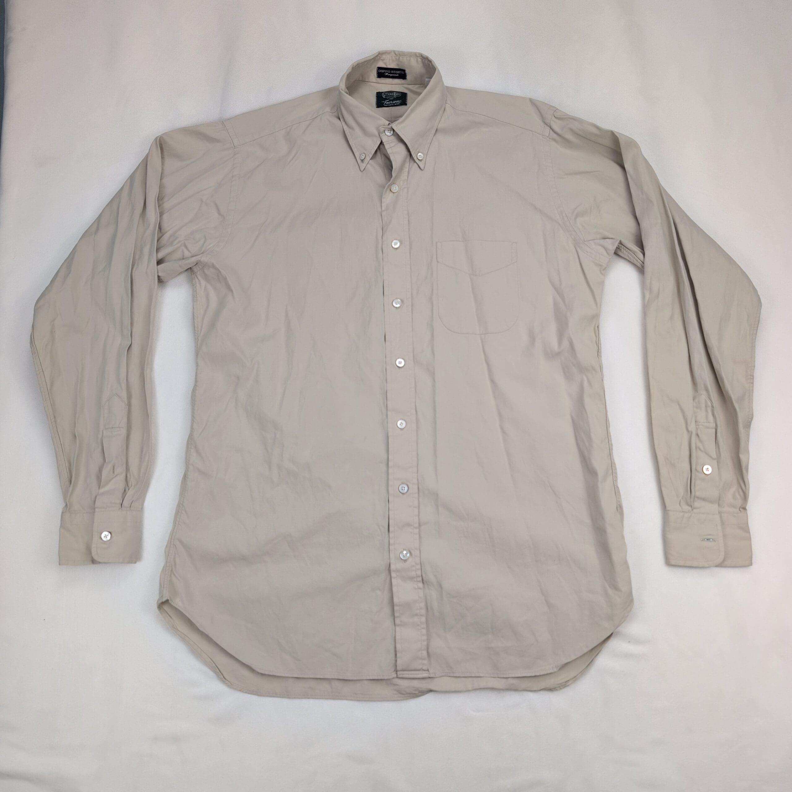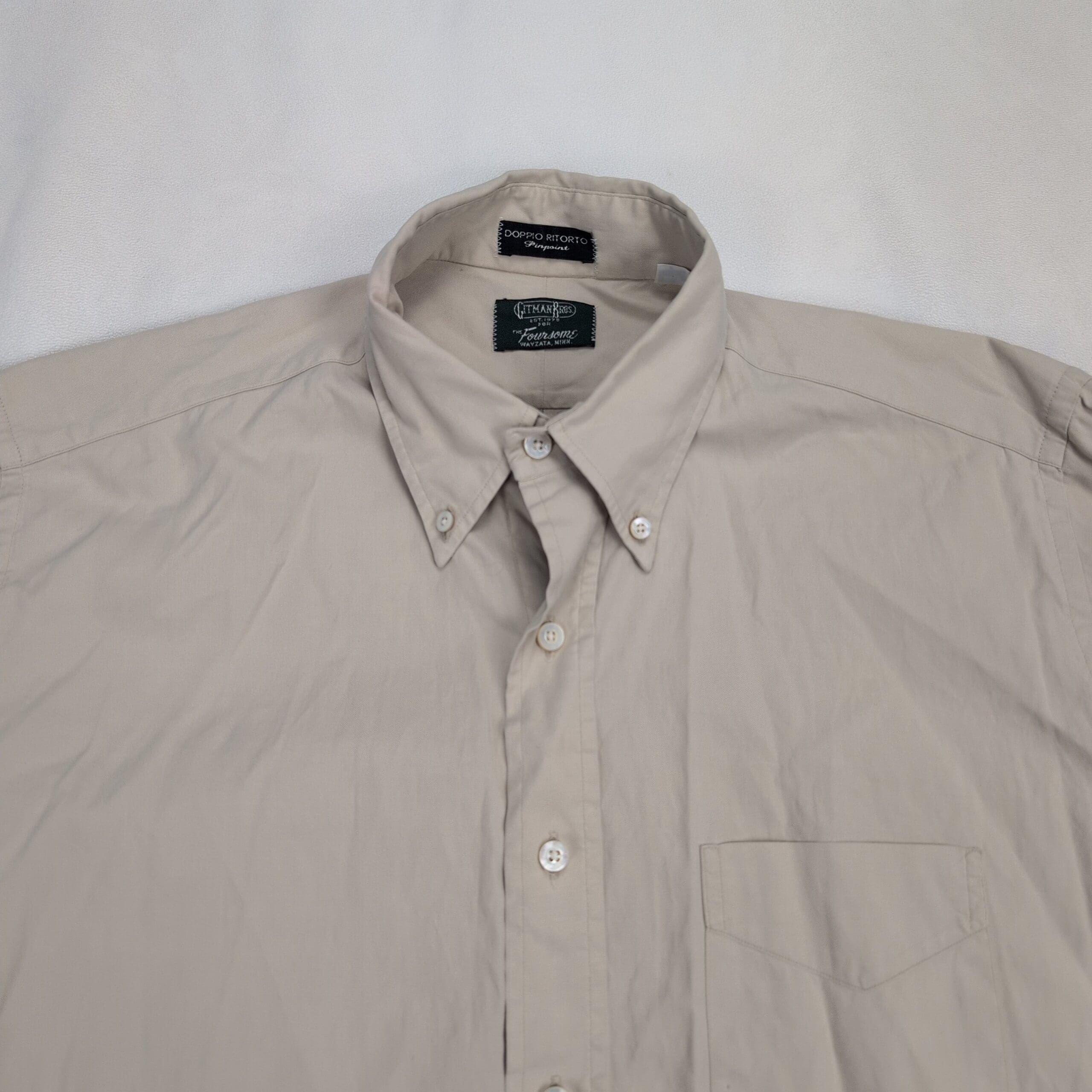 Gitman Bros men’s long-sleeve button-down dress shirt in a neutral beige/stone shade. Features a button-down collar, full button front, single chest pocket, and button cuffs — classic clean style suitable for work or smart-casual wear. Size: Neck 16 (standard).