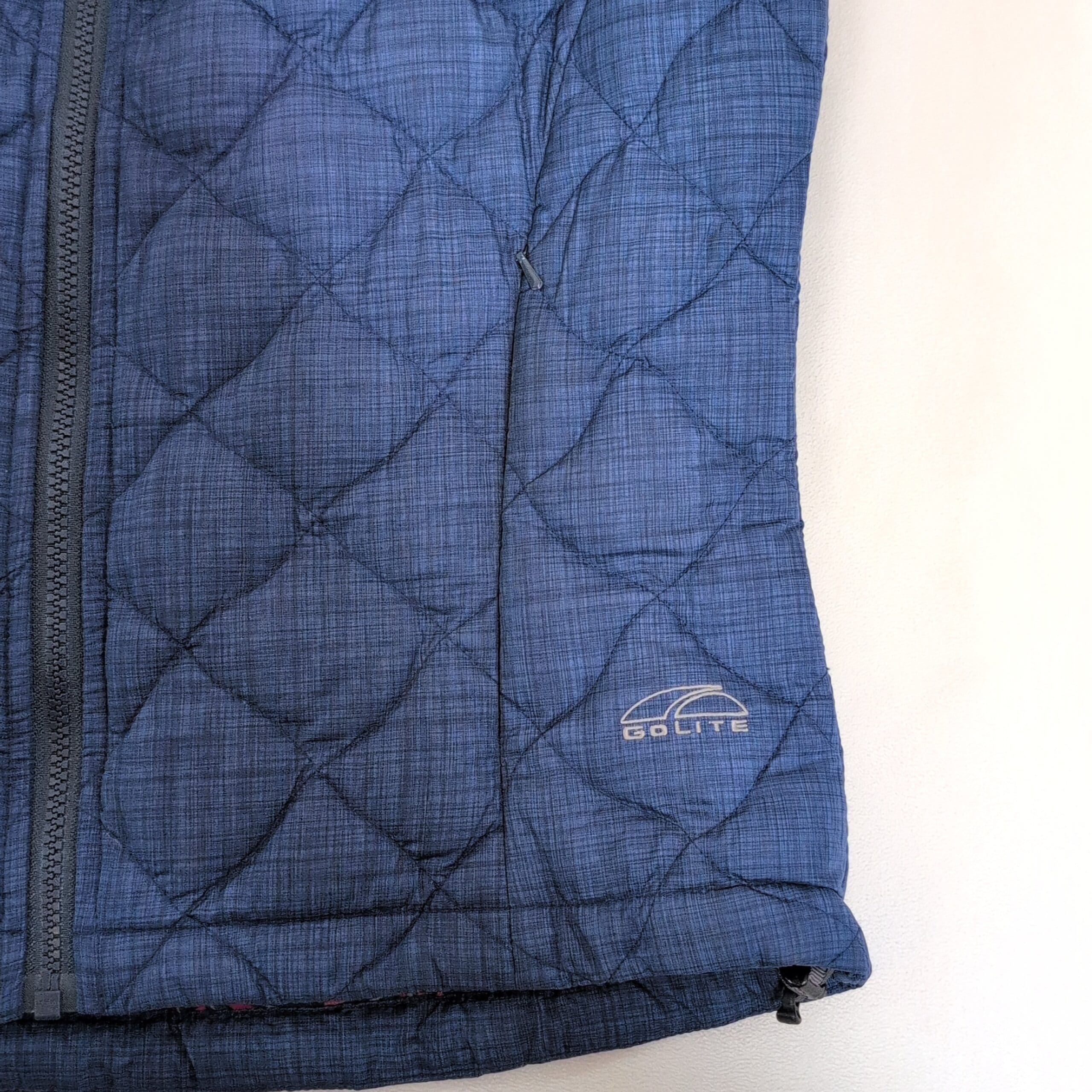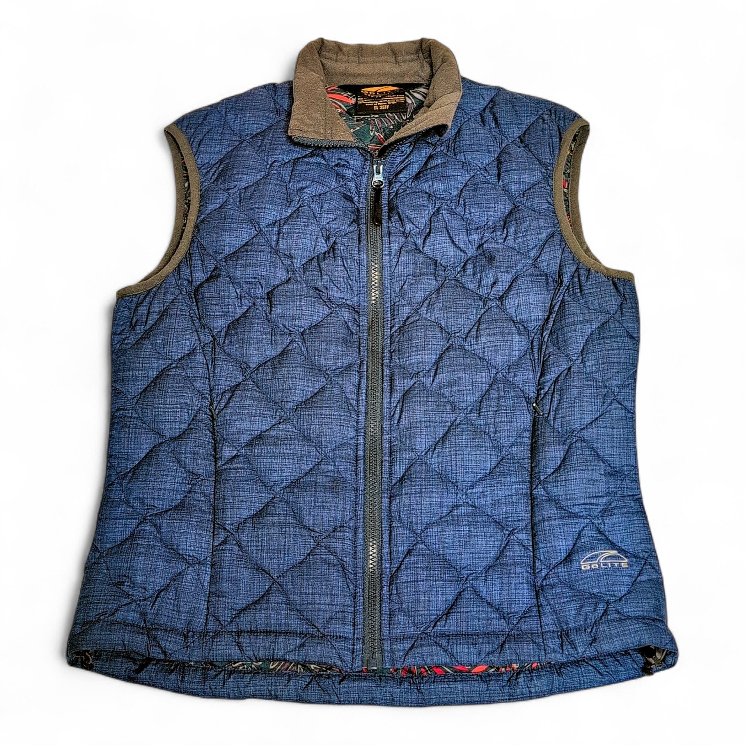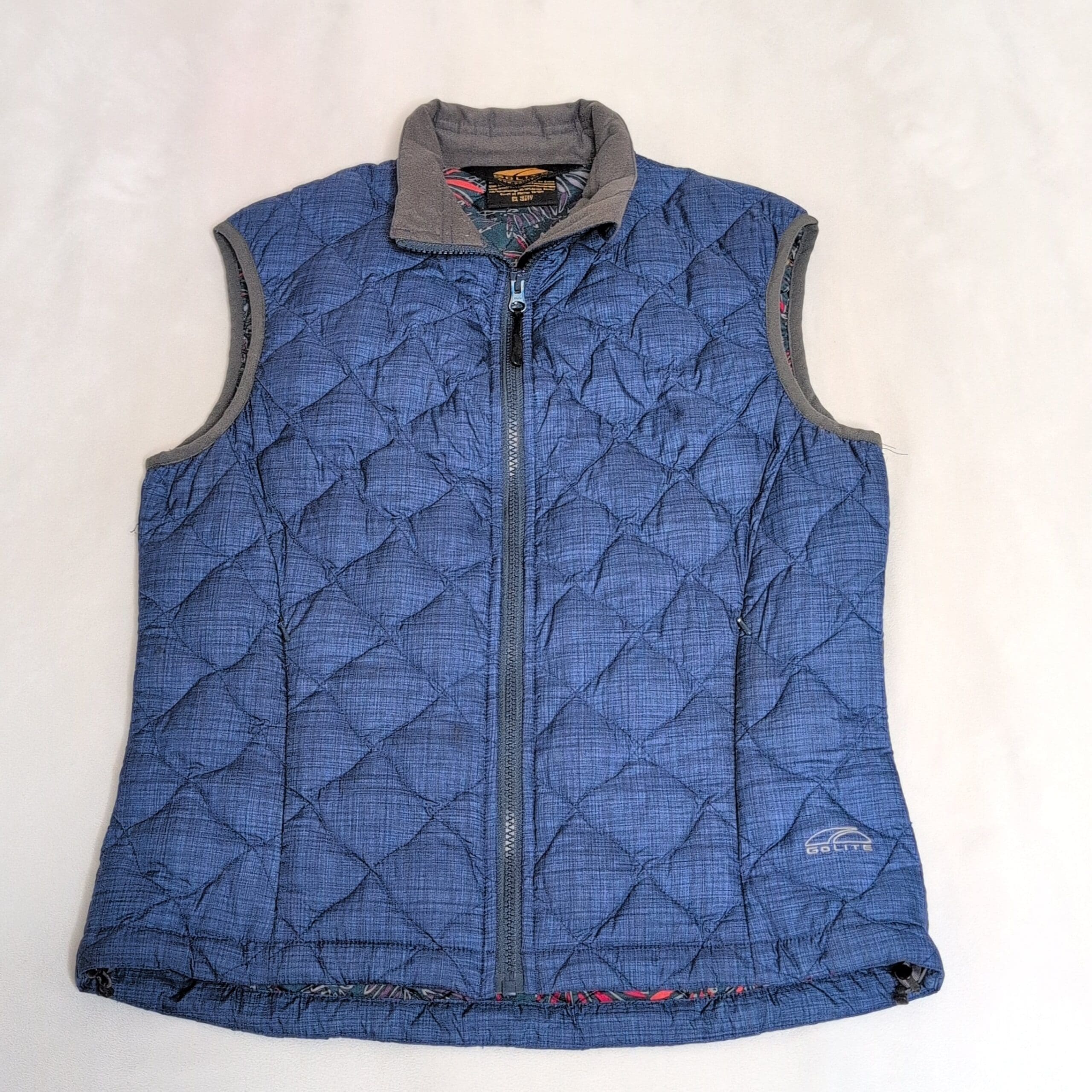 GoLite women’s quilted insulated vest in medium. Steel blue with grey trim and a stand collar, featuring a full-length front zipper and subtle GoLite logo at the hem. Diamond-quilt stitching provides lightweight warmth and a flattering, slightly tailored shape. Lined interior with a hint of colorful printed trim at the hem. Condition: Gently used — free of major rips, tears, stains, or flaws; may show light, typical wear consistent with prior use.