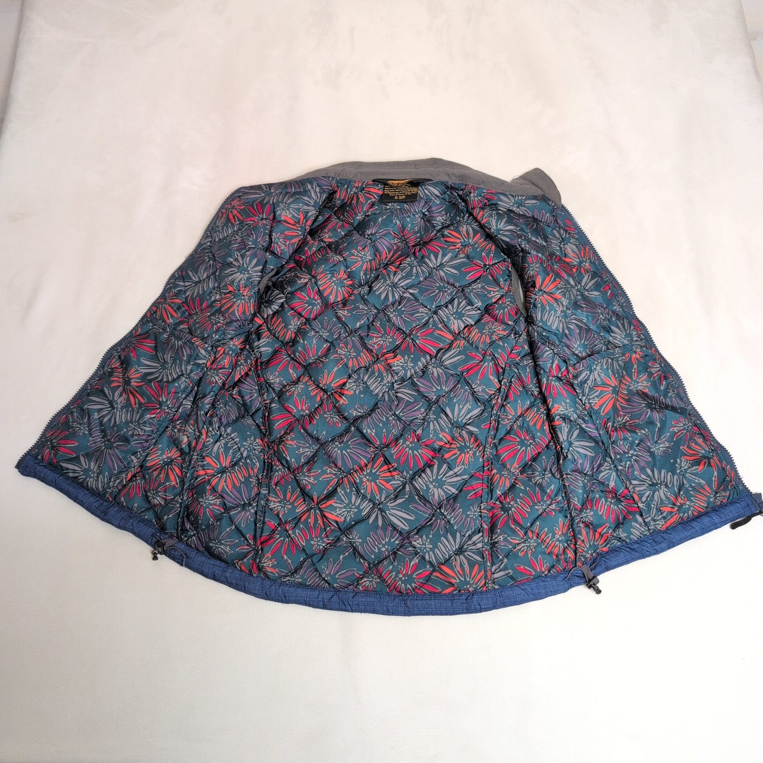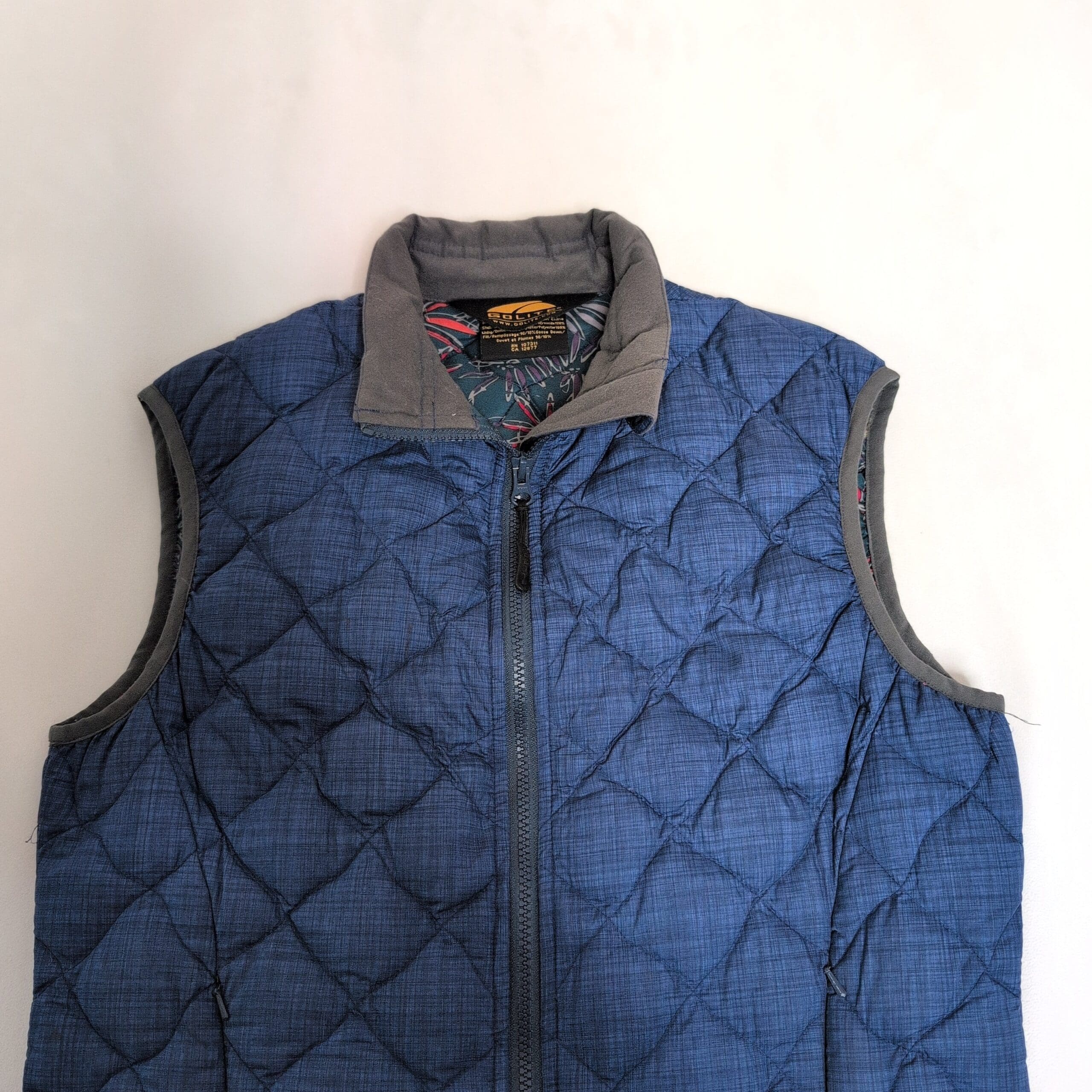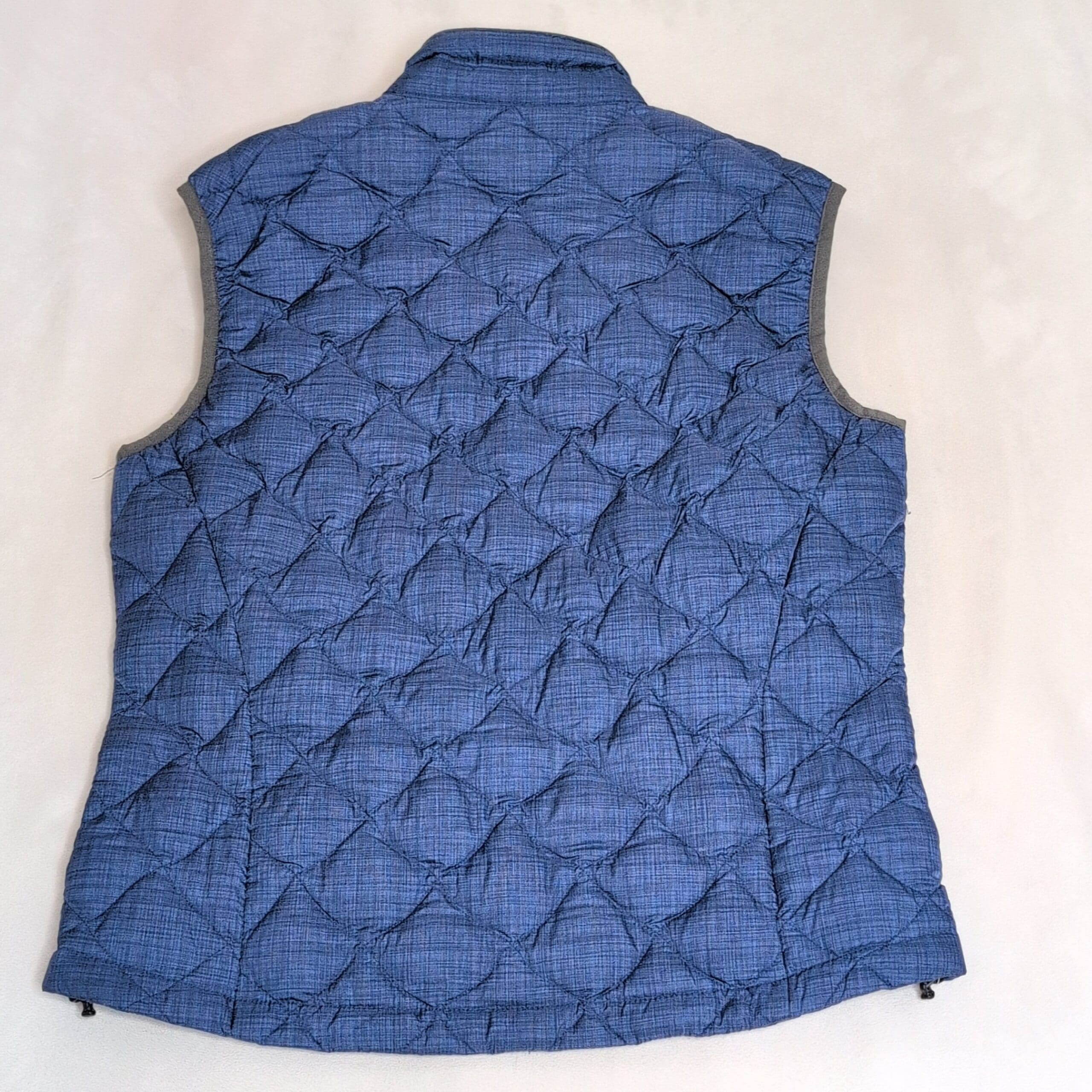 GoLite women’s quilted insulated vest in medium. Steel blue with grey trim and a stand collar, featuring a full-length front zipper and subtle GoLite logo at the hem. Diamond-quilt stitching provides lightweight warmth and a flattering, slightly tailored shape. Lined interior with a hint of colorful printed trim at the hem. Condition: Gently used — free of major rips, tears, stains, or flaws; may show light, typical wear consistent with prior use.