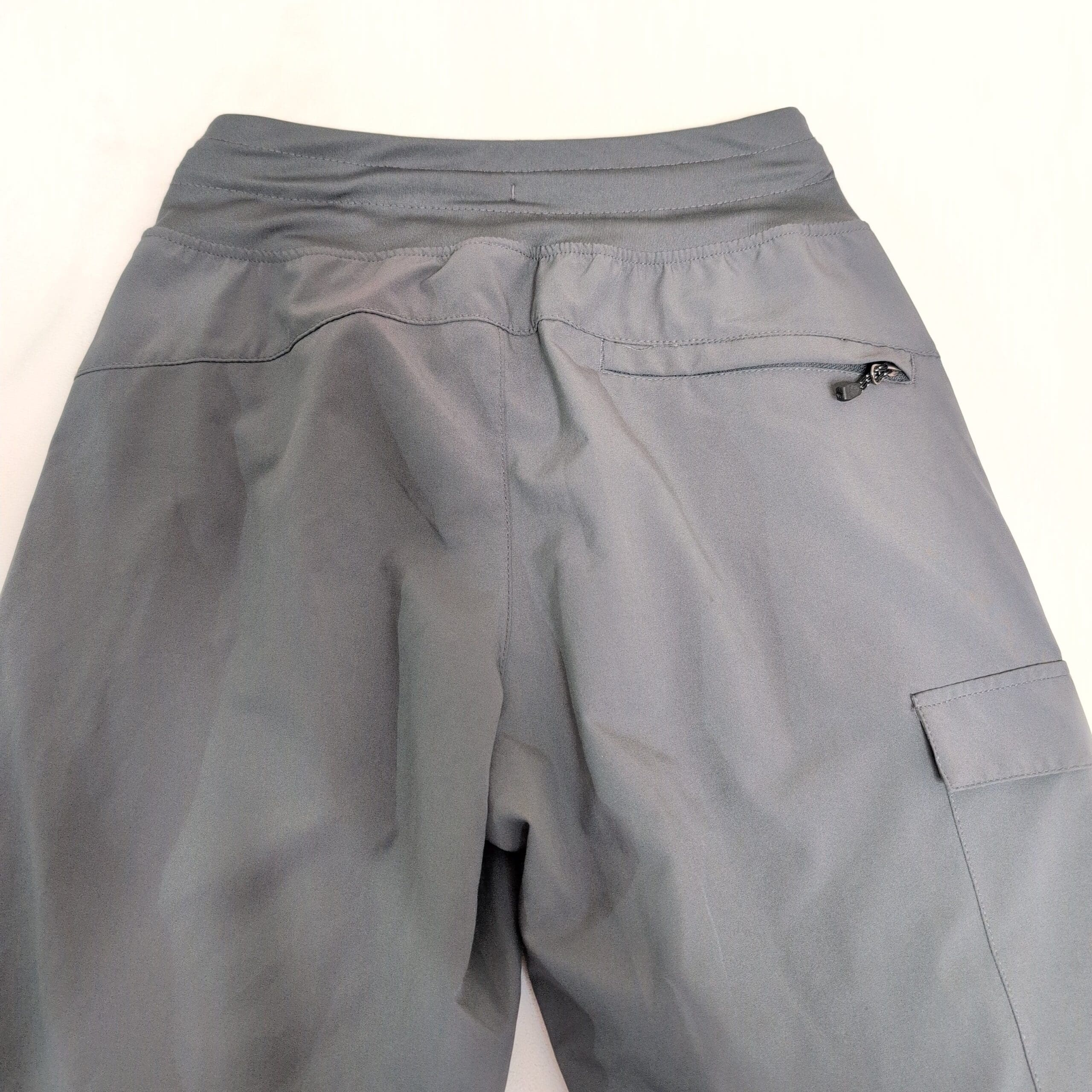 Rla Ged gray women’s track joggers in size XS. Relaxed, tapered silhouette with an adjustable drawstring waistband and ribbed ankle cuffs for a secure, comfortable fit. Practical pockets include zippered hand pockets and a flap cargo pocket on the thigh with a small branded tab — great for everyday wear, travel, or athleisure looks. Neutral gray color pairs easily with tees, sweaters, and sneakers. Preowned — please see photos for exact condition and details.