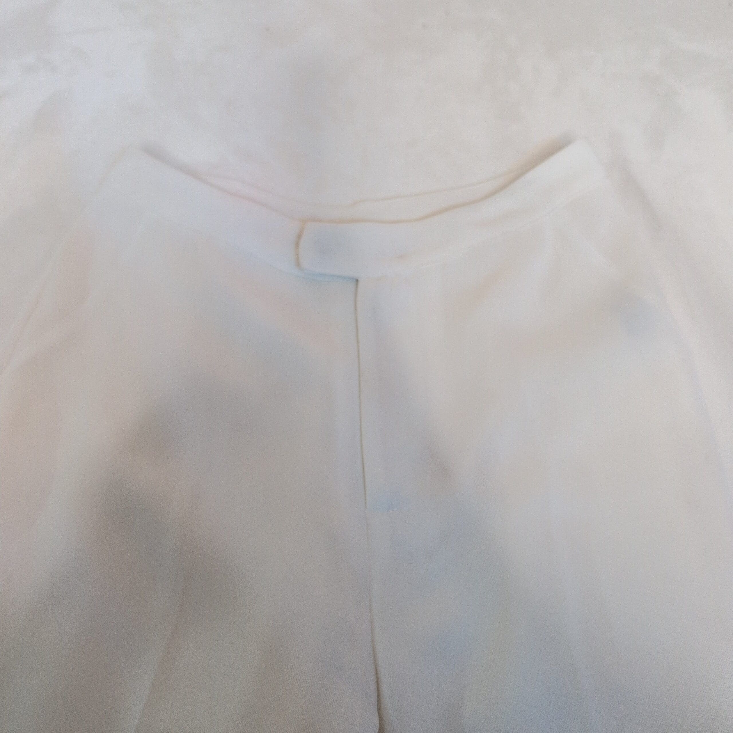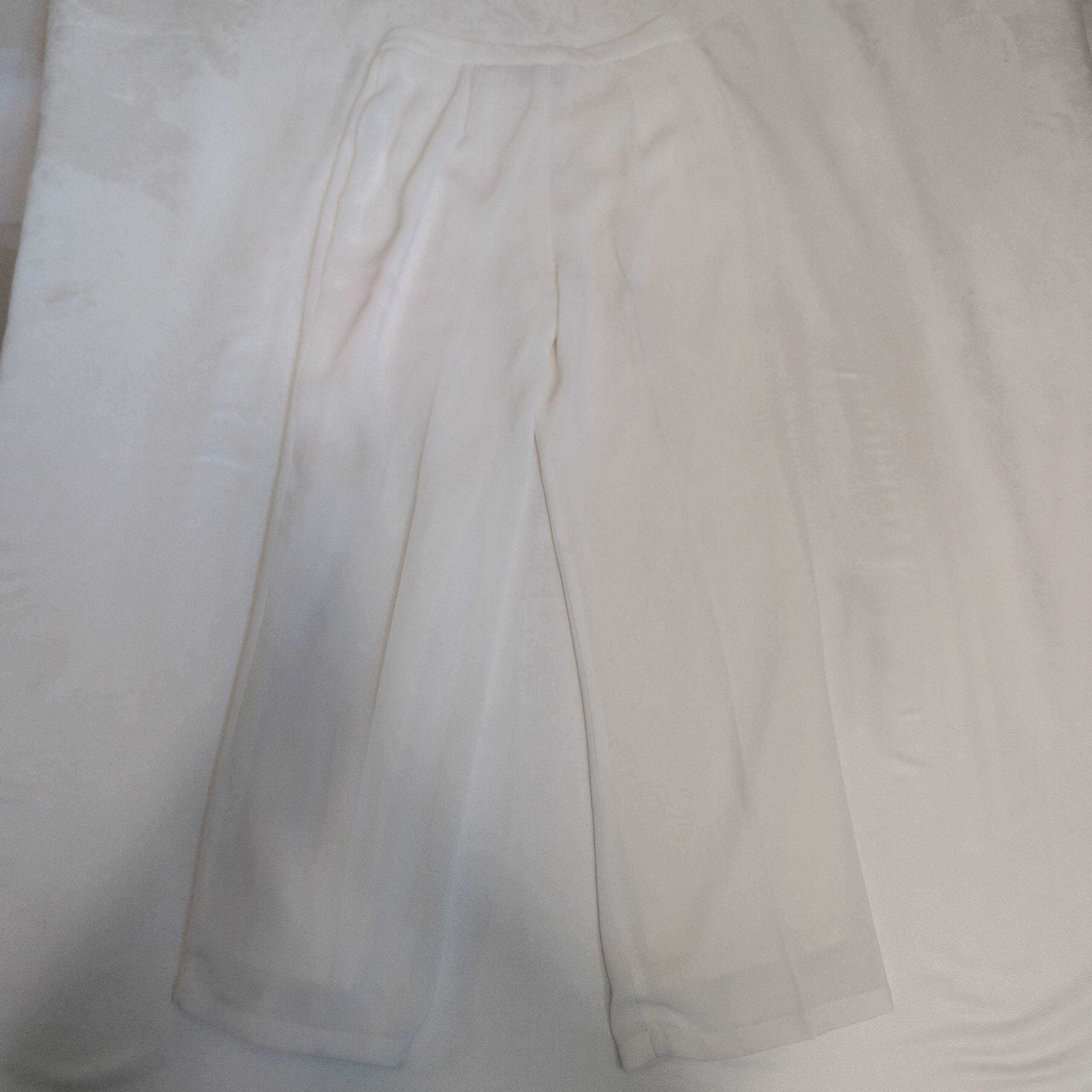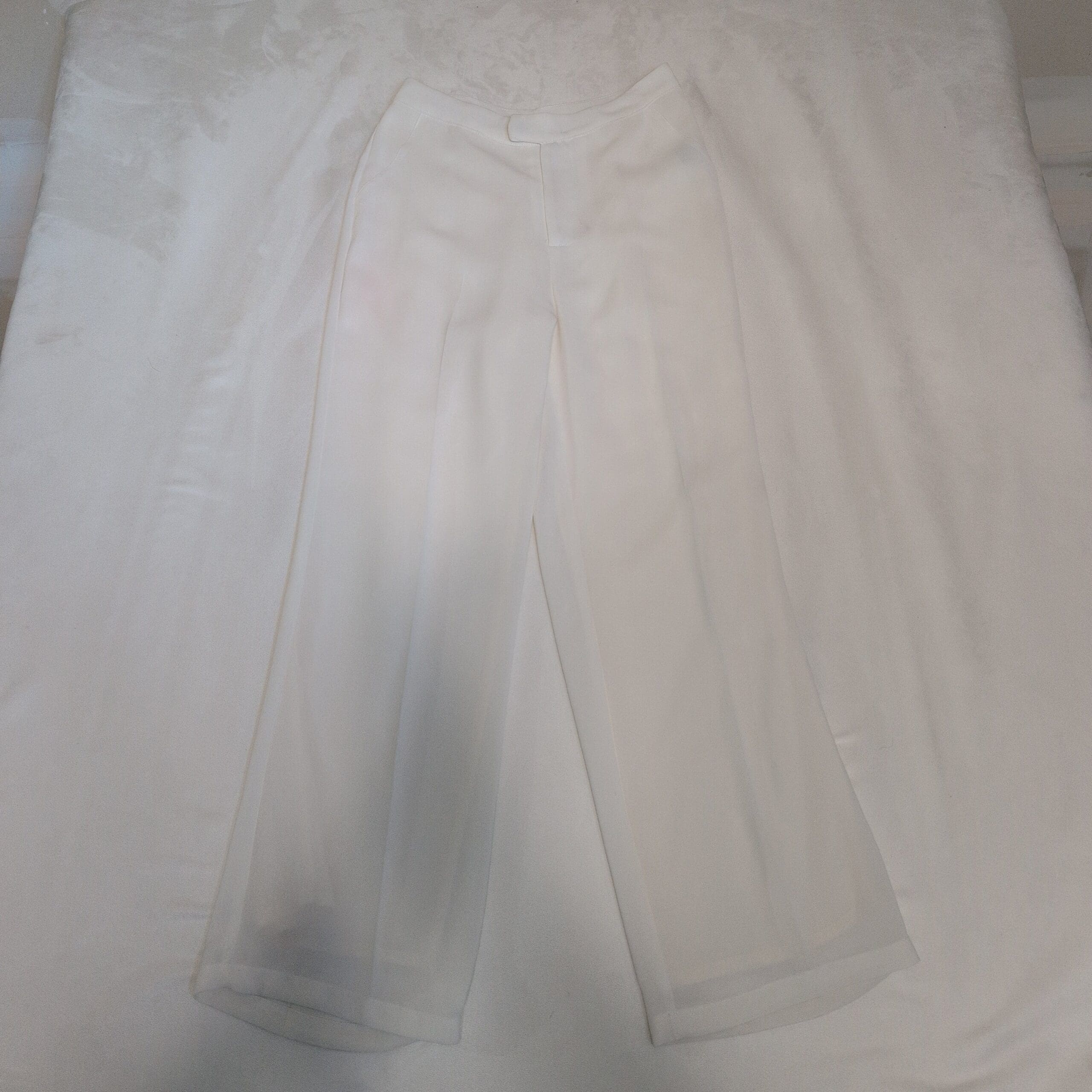 Greylin women’s white tailored trousers, size S. Clean, modern wide-leg silhouette with a structured waistband and hidden hook-and-zip closure. Pressed center seams and a flowing drape create a polished look—great for work, special occasions, or elevated everyday styling. Fabric has a smooth finish with slight sheerness at the hem (see photos). Pre-owned with light wear; a faint mark near the upper thigh is visible in photos but does not affect overall wear.