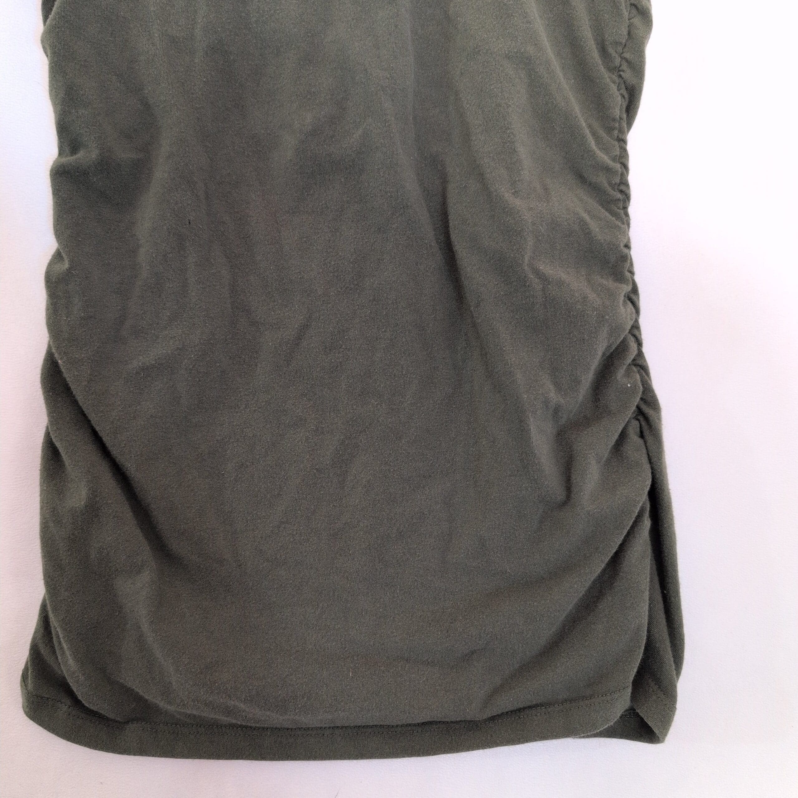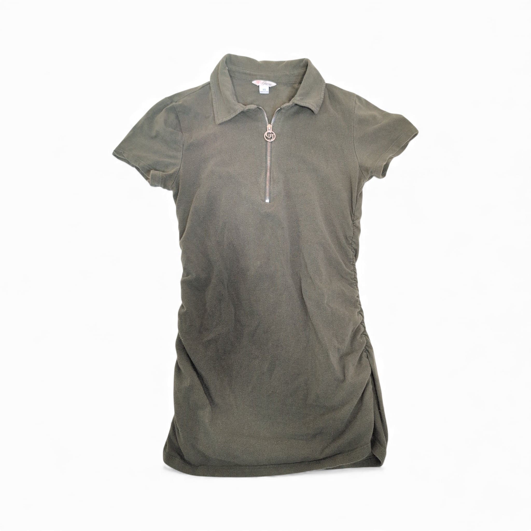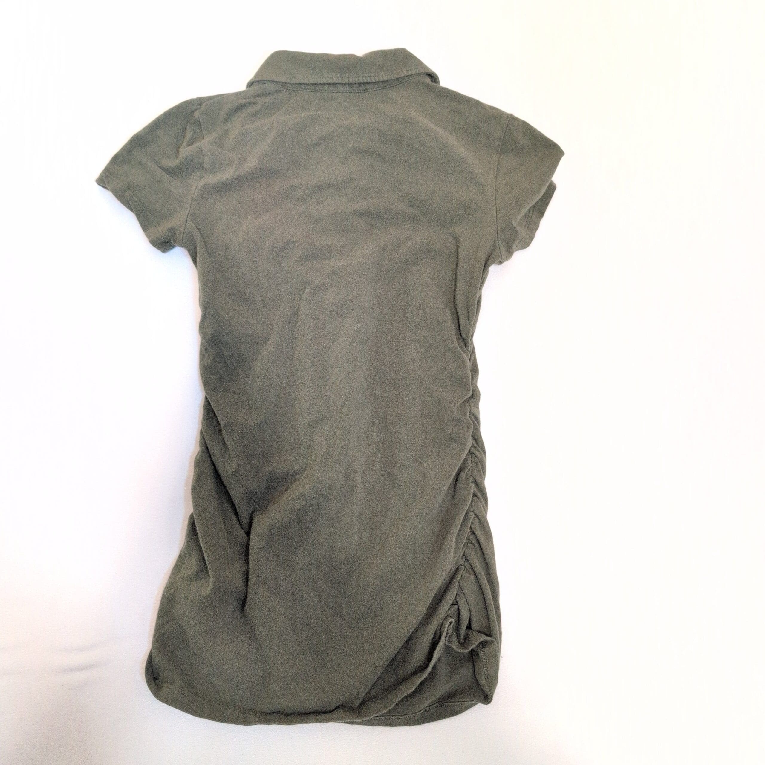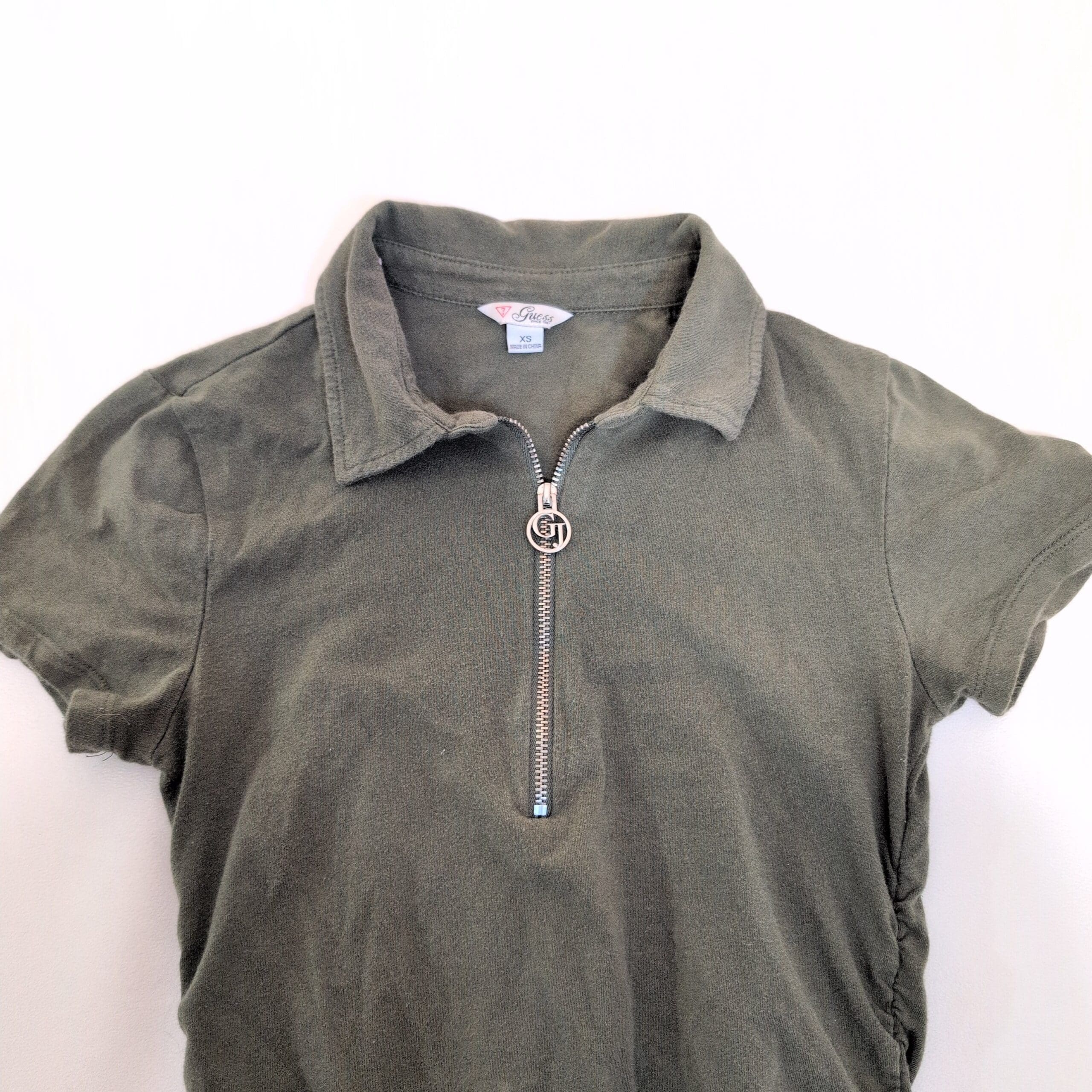 Olive green GUESS short-sleeve zip polo top/dress in size XS. Features a collared neckline, silver-tone GUESS logo zipper pull, side ruching for a flattering fitted silhouette, and a longer tunic/mini length that can be worn as a dress or layered as a top. Comfortable, casual piece perfect for everyday wear or dressed up with accessories. Pre-owned, gently used with normal signs of wear; please review photos for details.