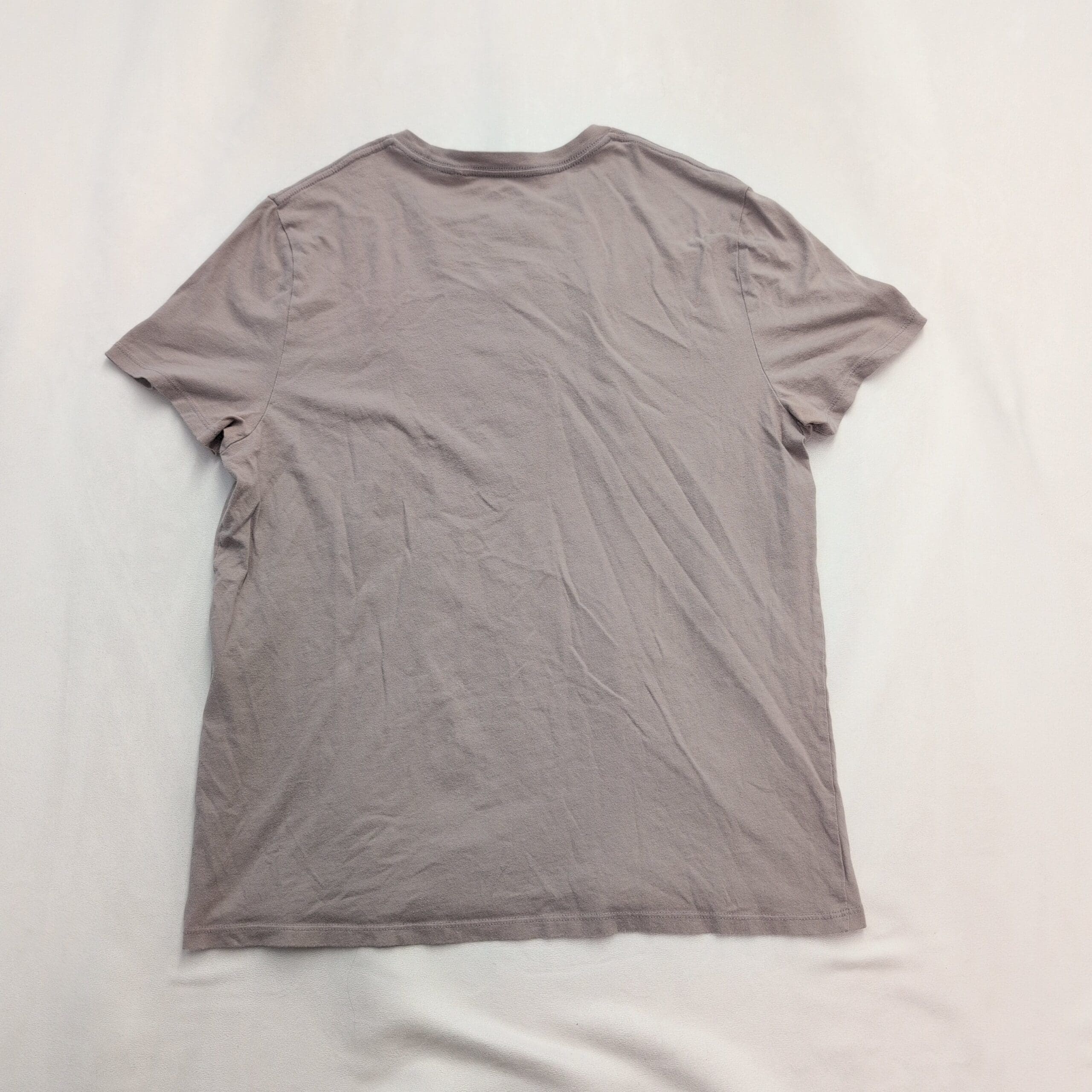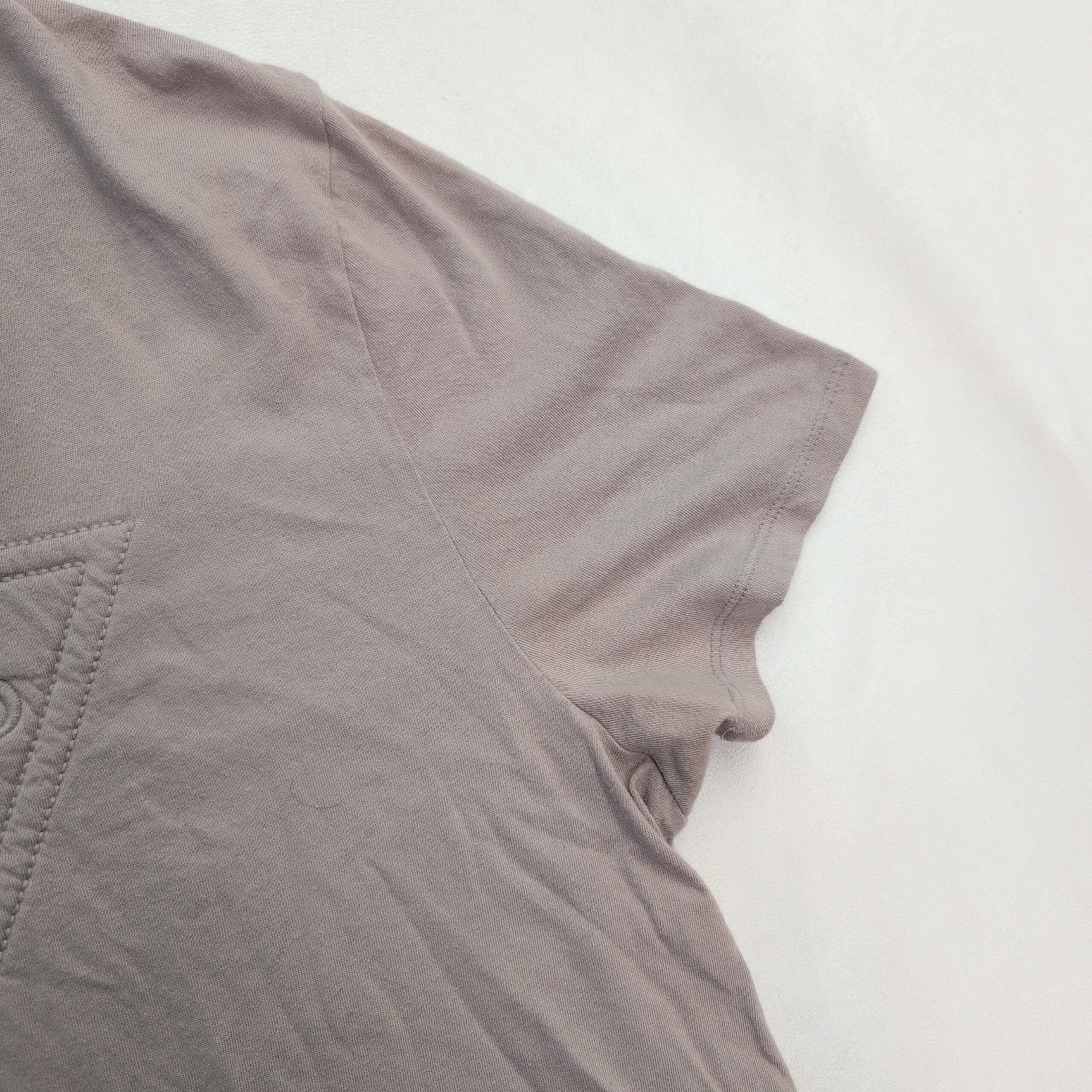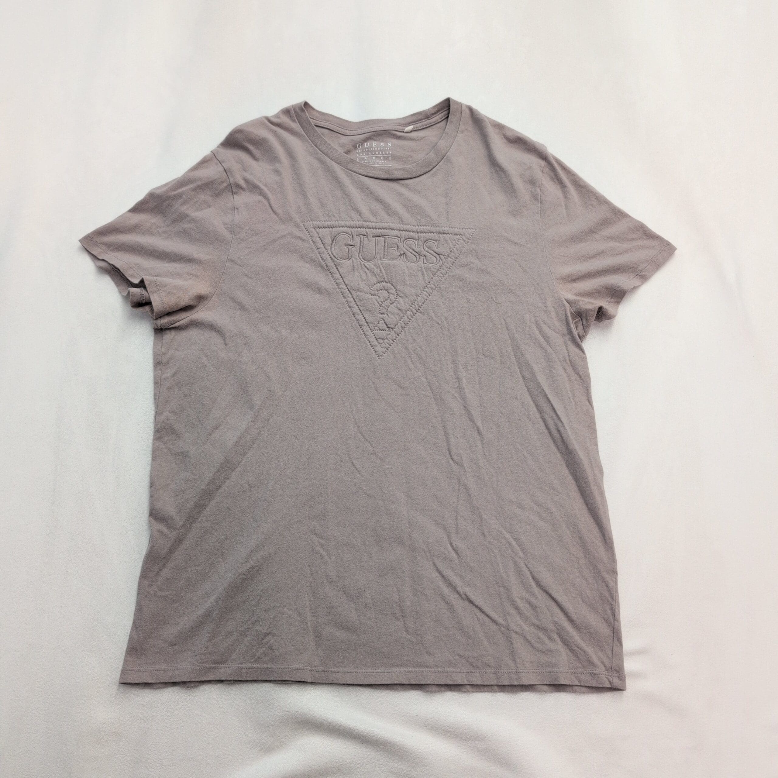 Gently used condition, free of major rips, tears, stains, or flaws. But typical wear may be present. GUESS women’s short sleeve tee in a gray-brown color that reads closer to a muted taupe. Size L. Soft knit fabric with a tonal, textured triangular GUESS logo embroidered/quilting detail at the chest. No major defects noted — see photos for color and light creasing consistent with normal wear.