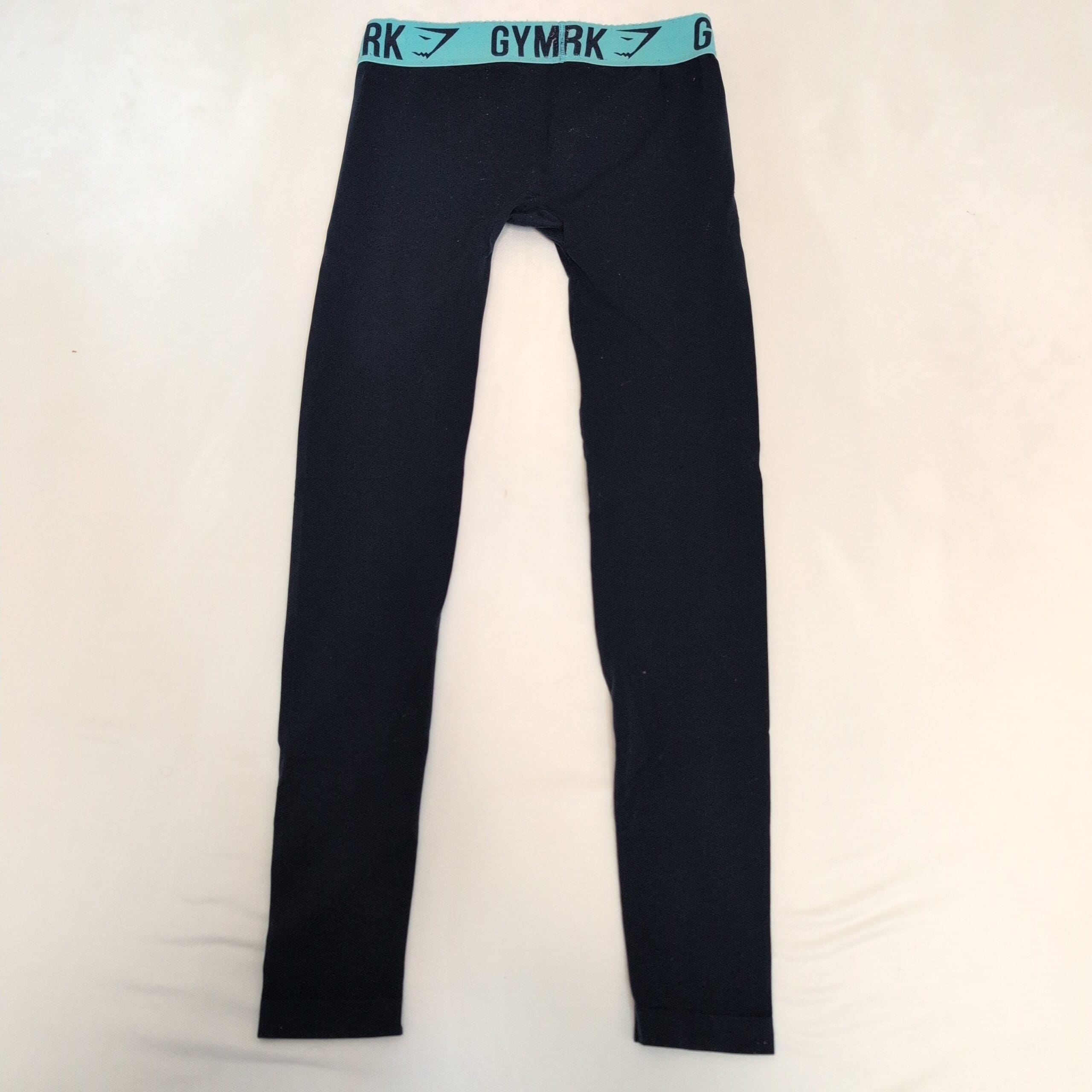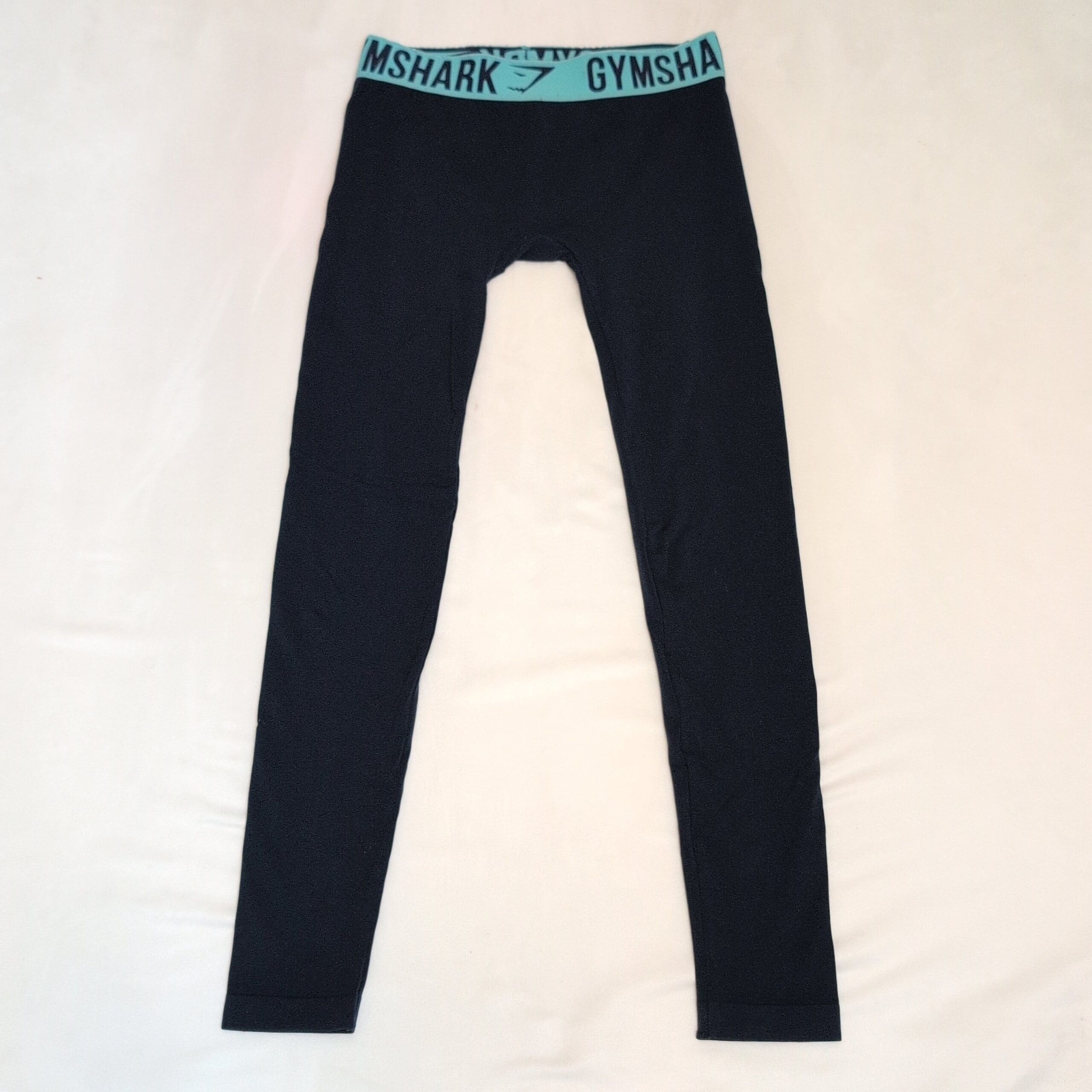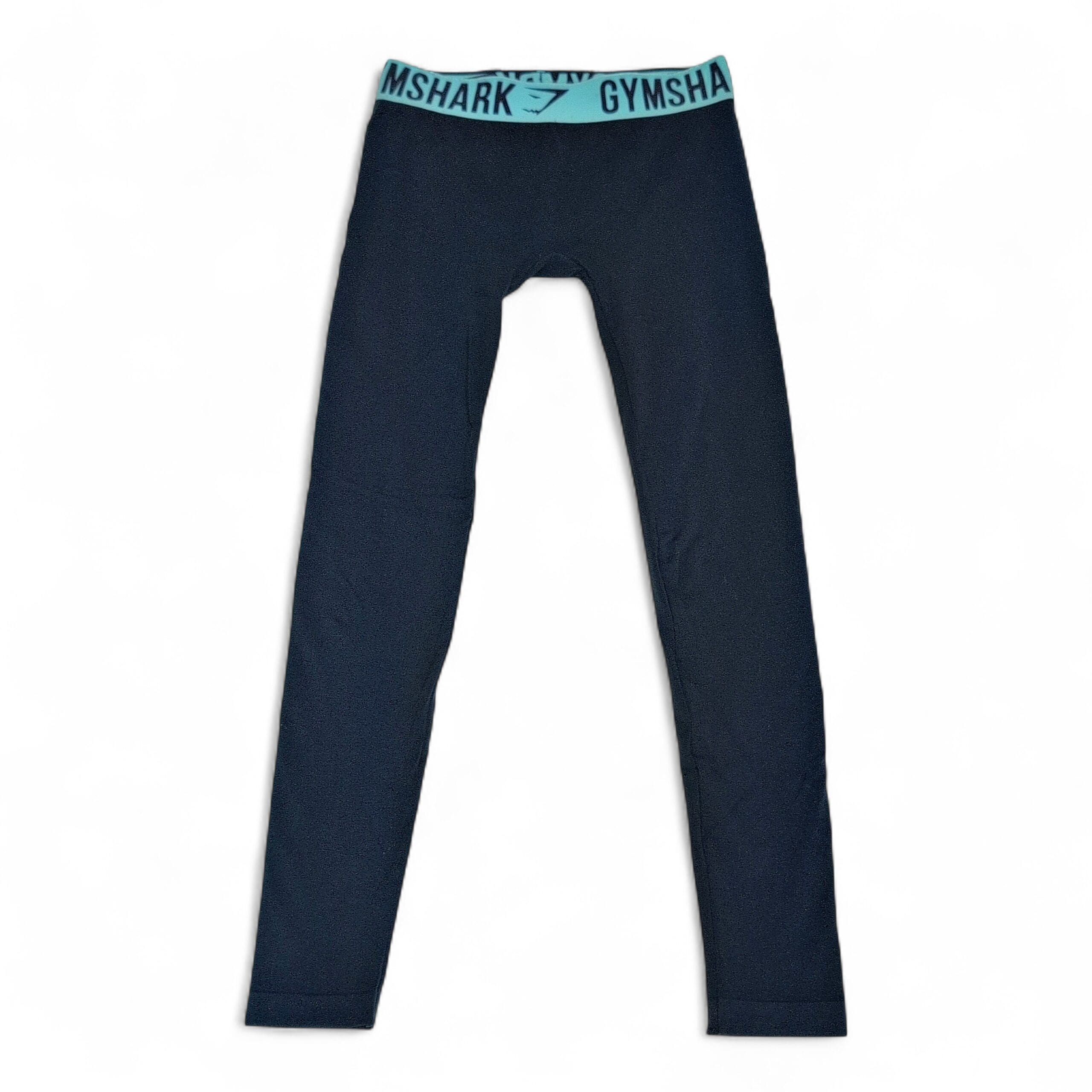 Deep blue Gymshark seamless-style leggings with contrasting aqua Gymshark elastic waistband. Stretchy, form-fitting fabric great for workouts or everyday wear. Gently used — good condition with normal light wear; free of major rips, tears, stains, or flaws. Size tag is missing; measurements available upon request. #Gymshark #Leggings #Activewear #HighWaist