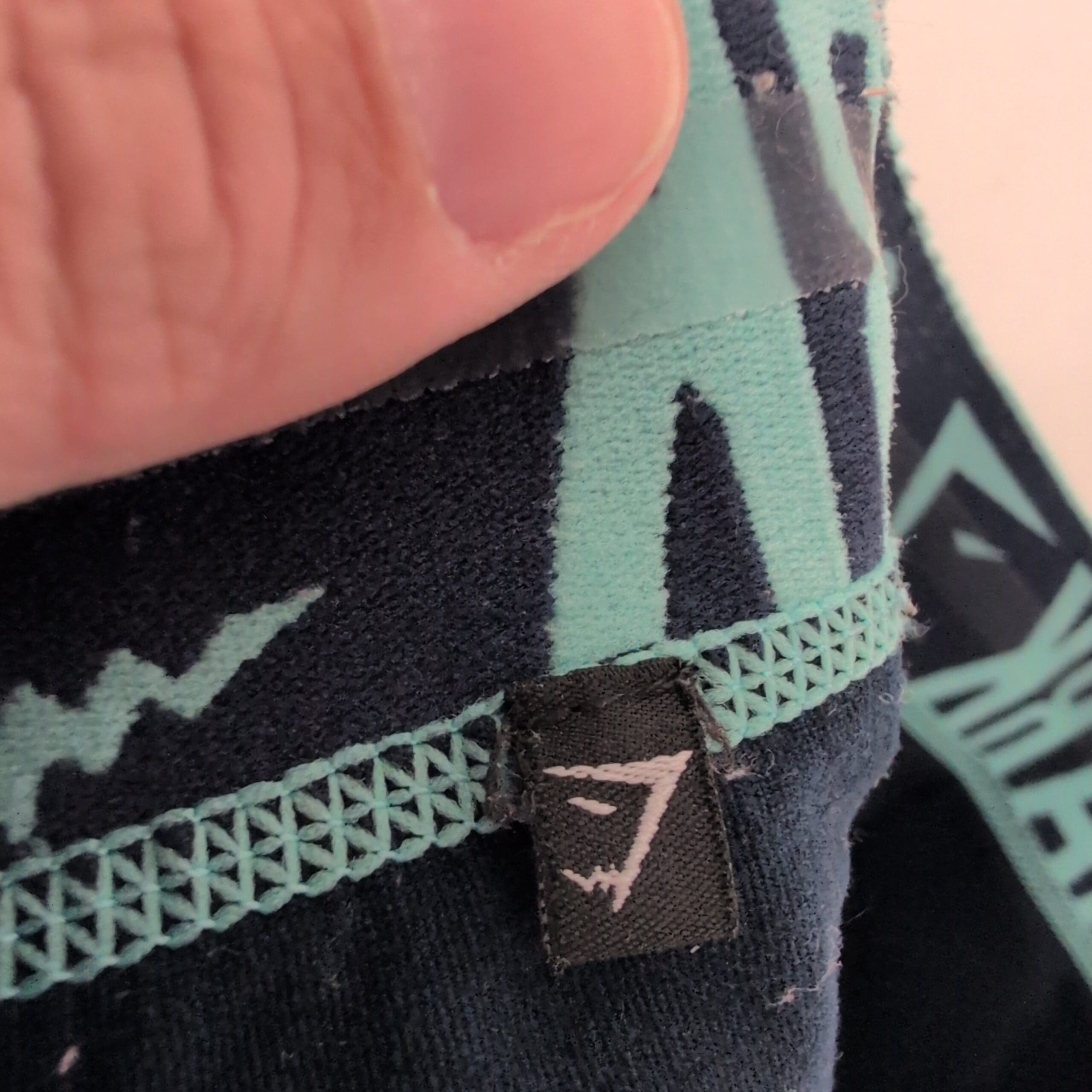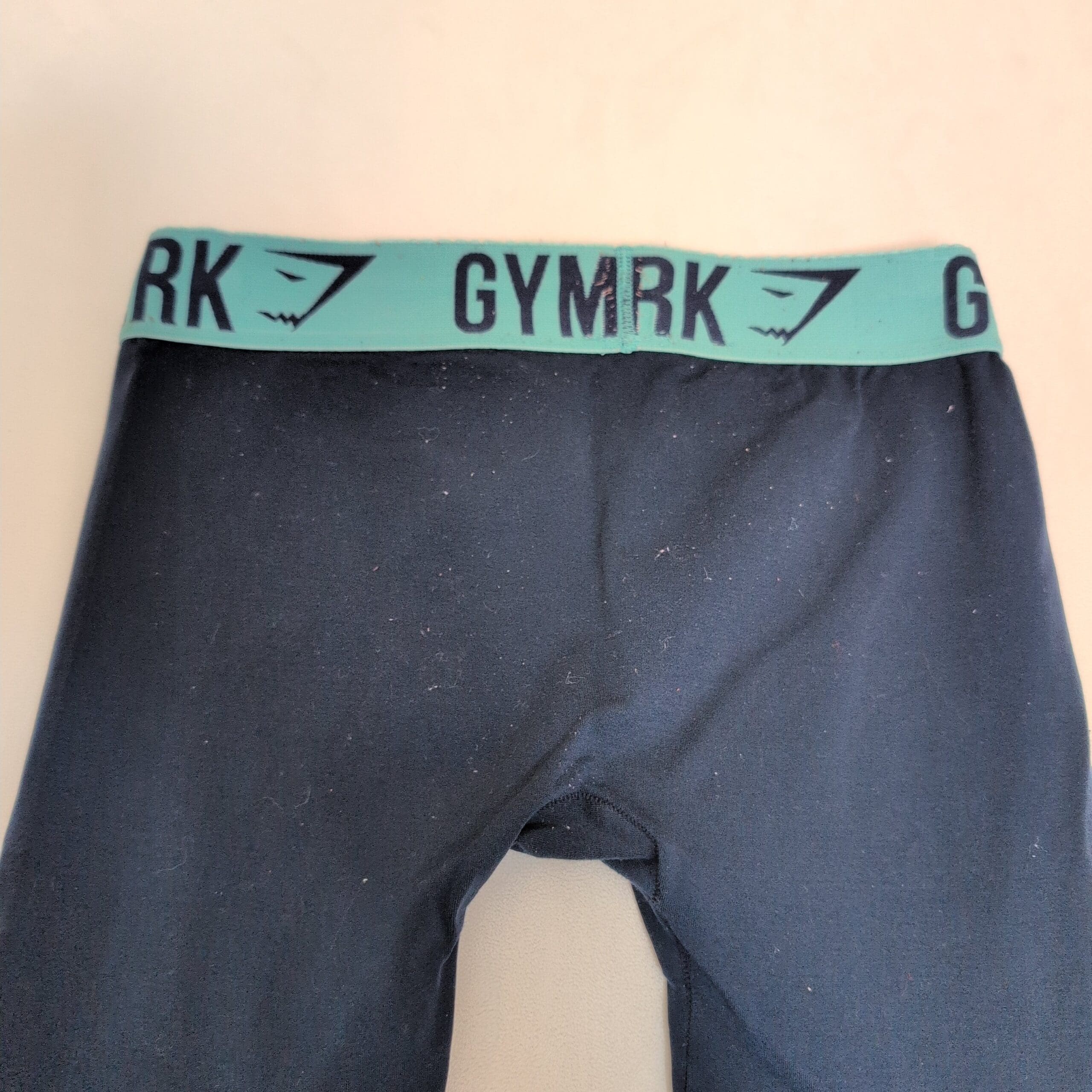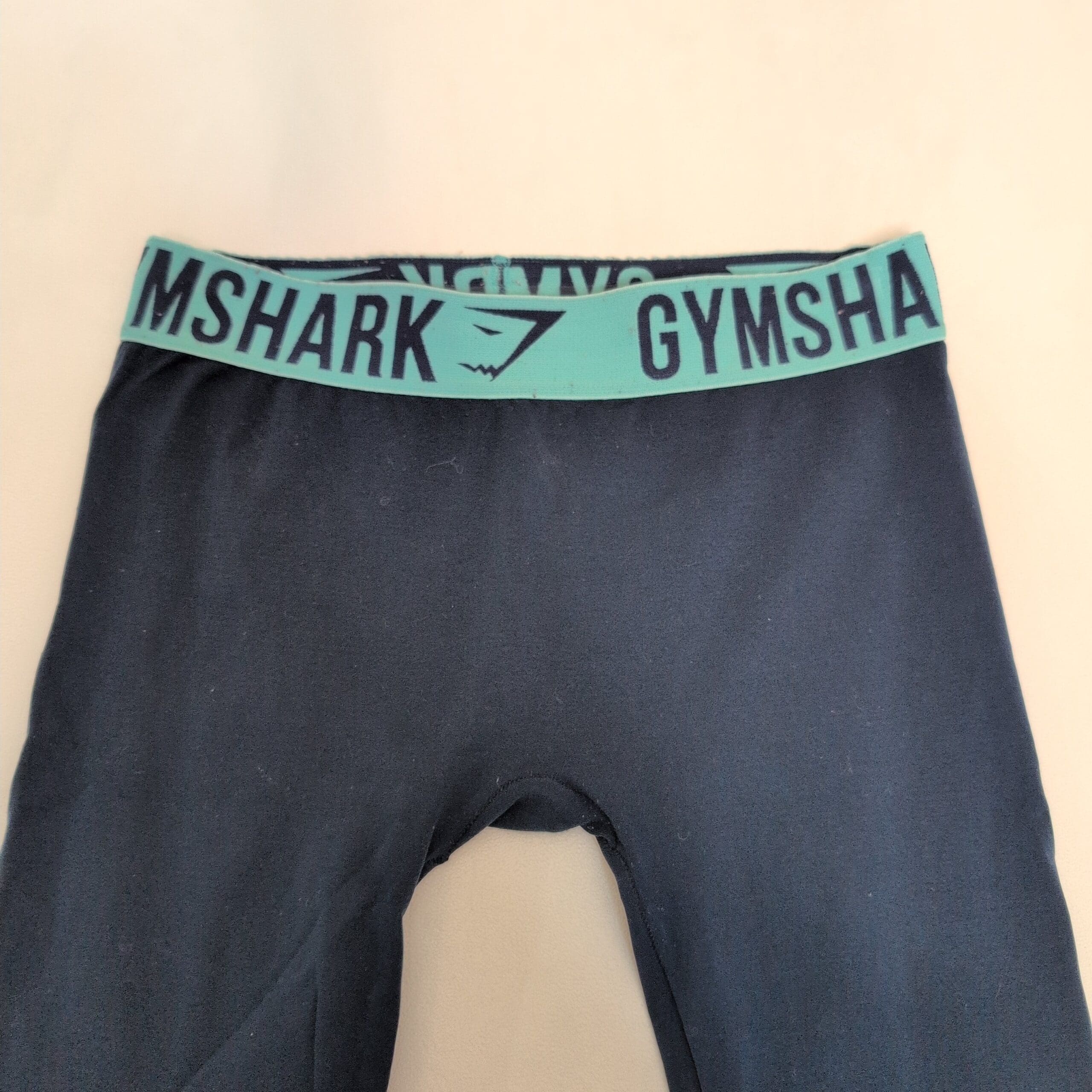 Deep blue Gymshark seamless-style leggings with contrasting aqua Gymshark elastic waistband. Stretchy, form-fitting fabric great for workouts or everyday wear. Gently used — good condition with normal light wear; free of major rips, tears, stains, or flaws. Size tag is missing; measurements available upon request. #Gymshark #Leggings #Activewear #HighWaist