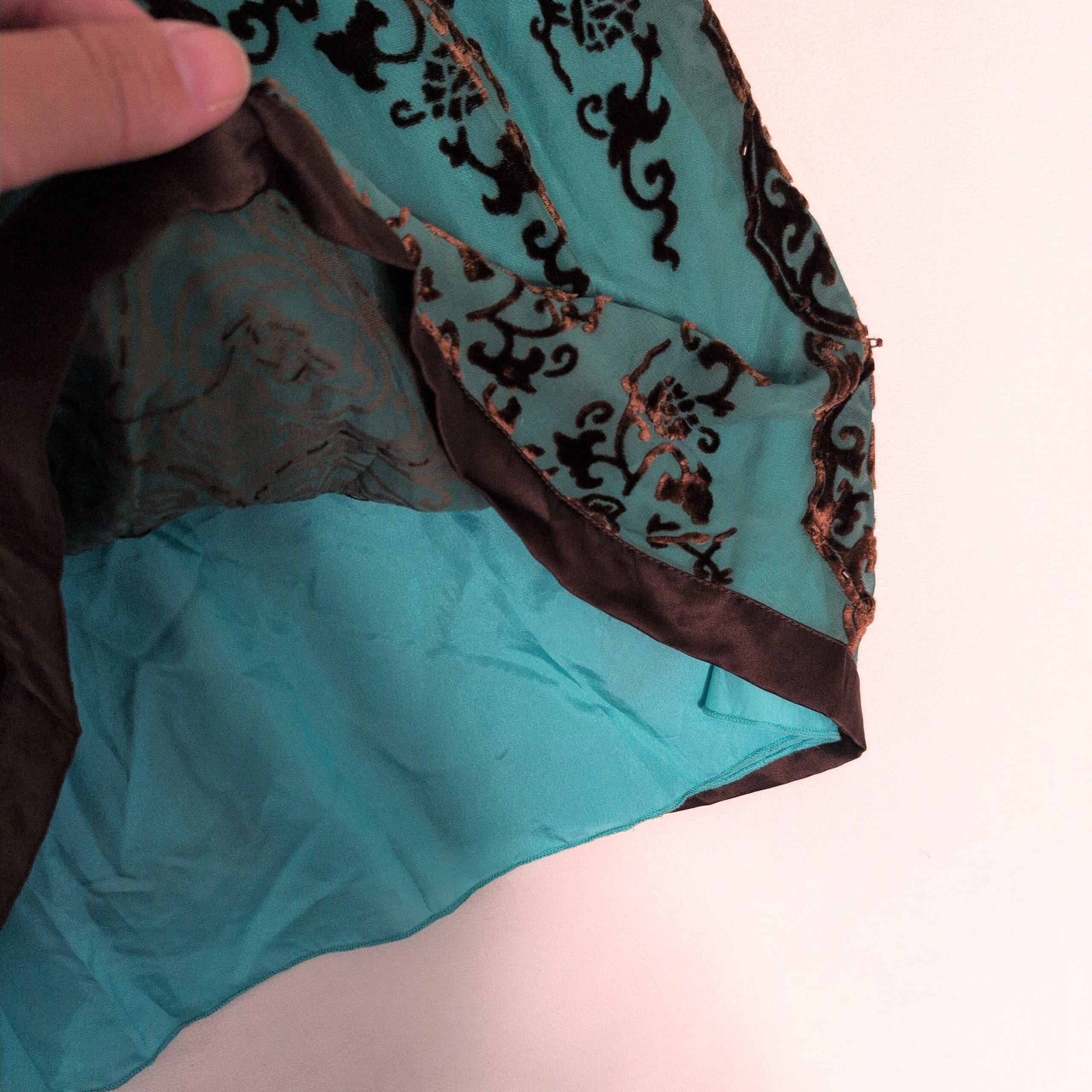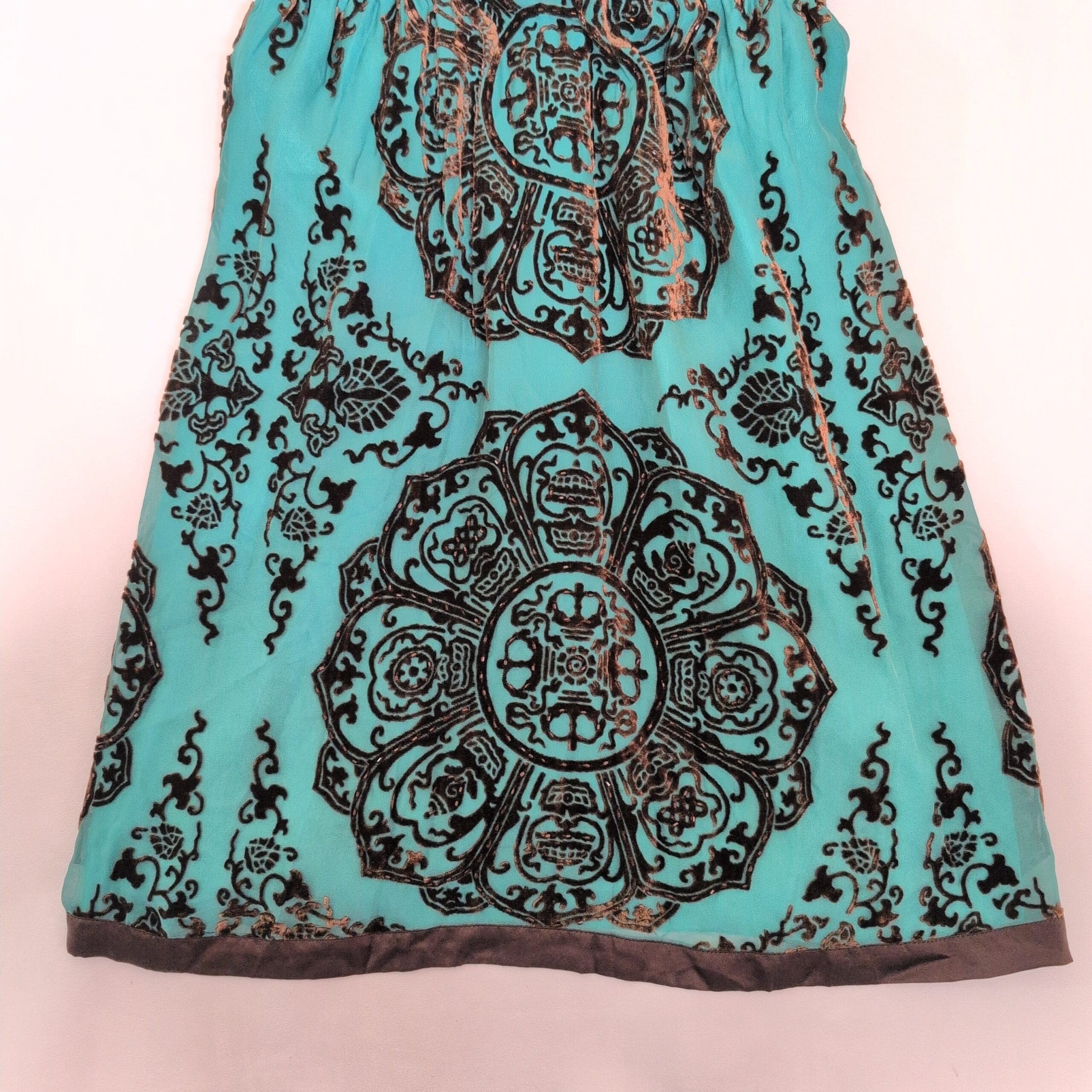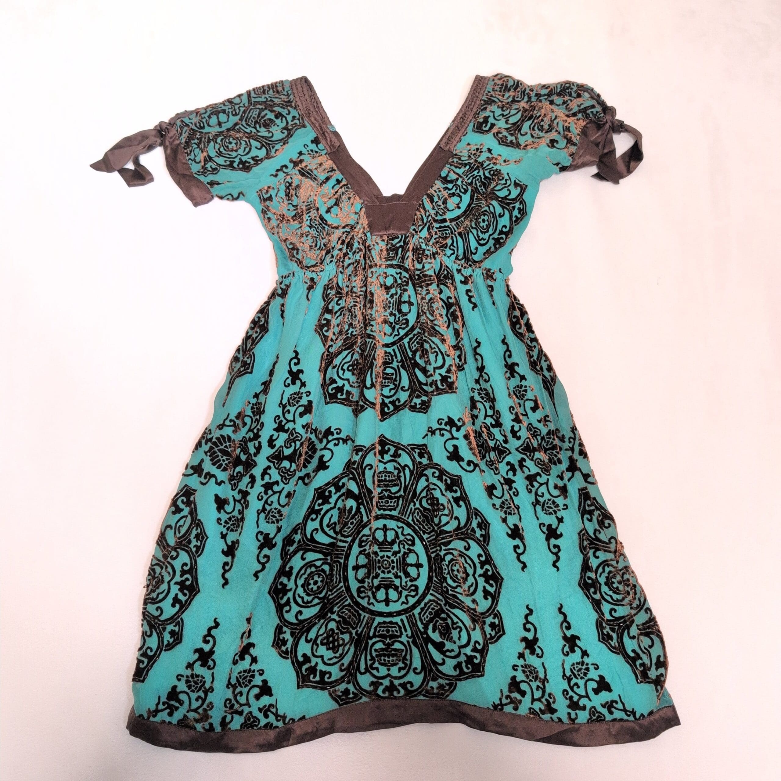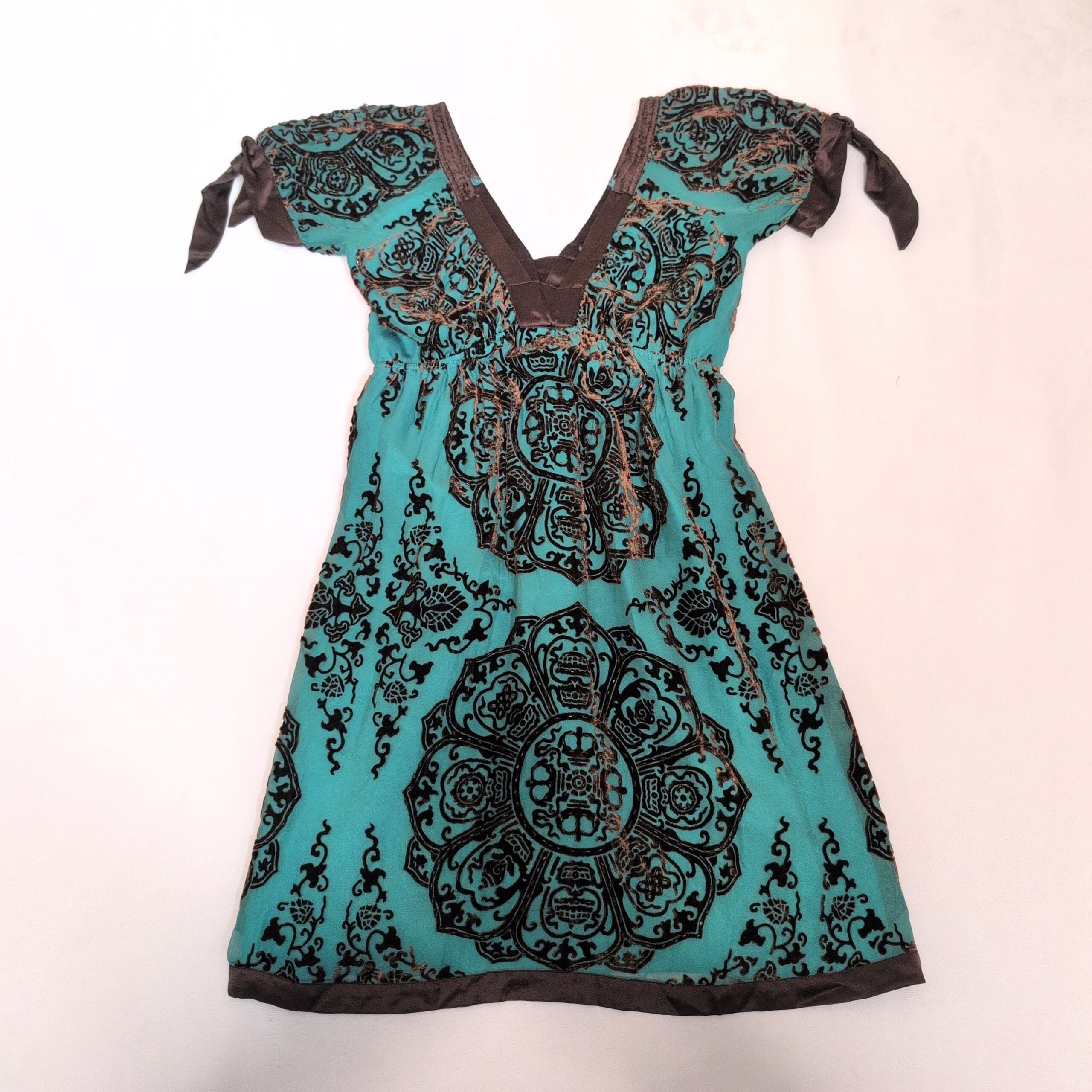 Hale Bob women’s dress in size S featuring a rich brown burnout medallion pattern on lightweight fabric. Deep V-neck with contrast trim, empire waist with gentle gathering, and short tie sleeves for an adjustable fit. Hem finished with trim for a polished look. Great for casual outings or dressed up with accessories.