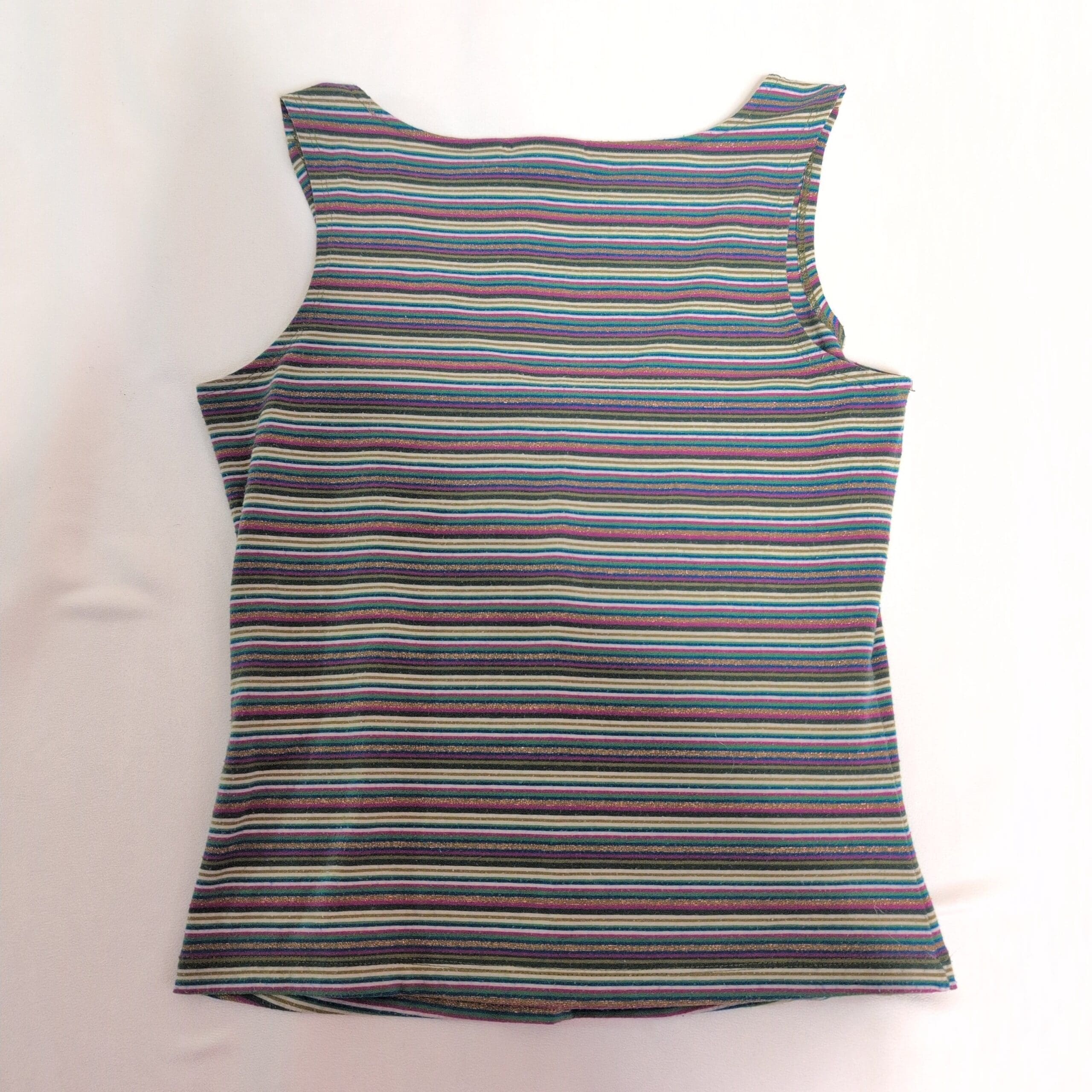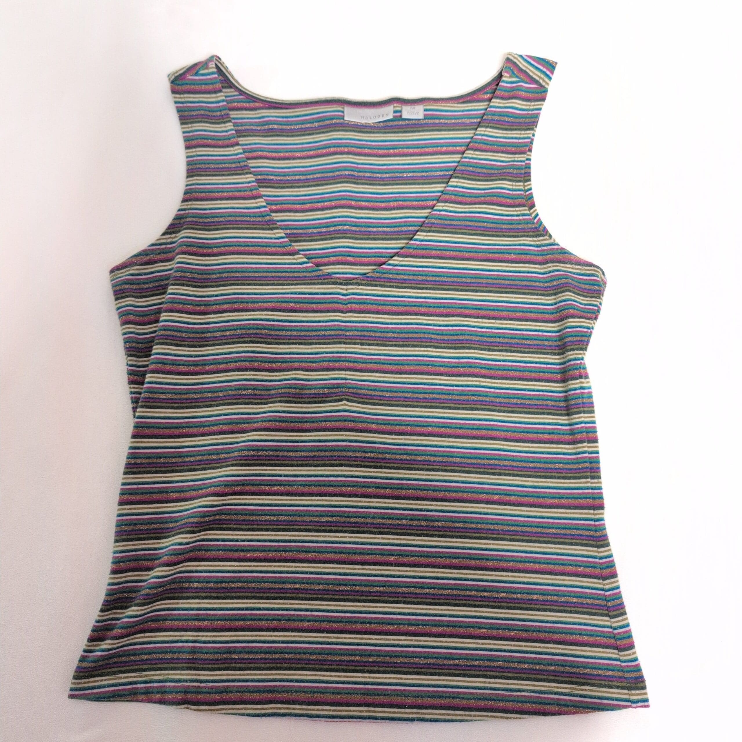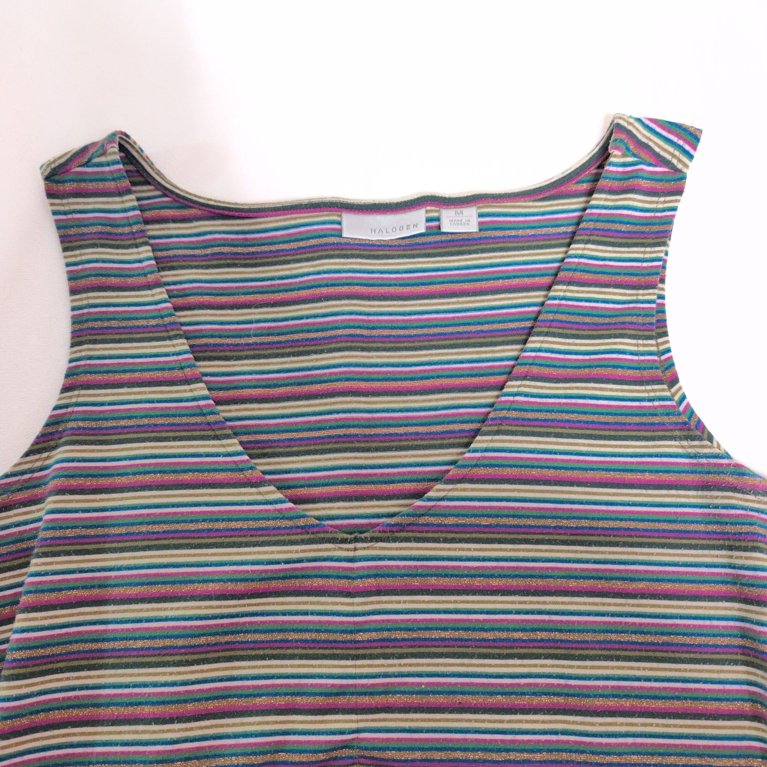 Halogen women’s tank top in size M. Soft-feeling striped knit with subtle metallic gold thread for a refined shimmer. V-neck silhouette and sleeveless cut make it perfect for layering or wearing on its own; slim through the body with a slightly flared hem for comfortable movement. Bright multicolor horizontal stripes (gold, teal, purple, cream) give a playful yet polished look that transitions easily from day to night. Excellent gently worn condition — no visible stains, holes, or pulls.