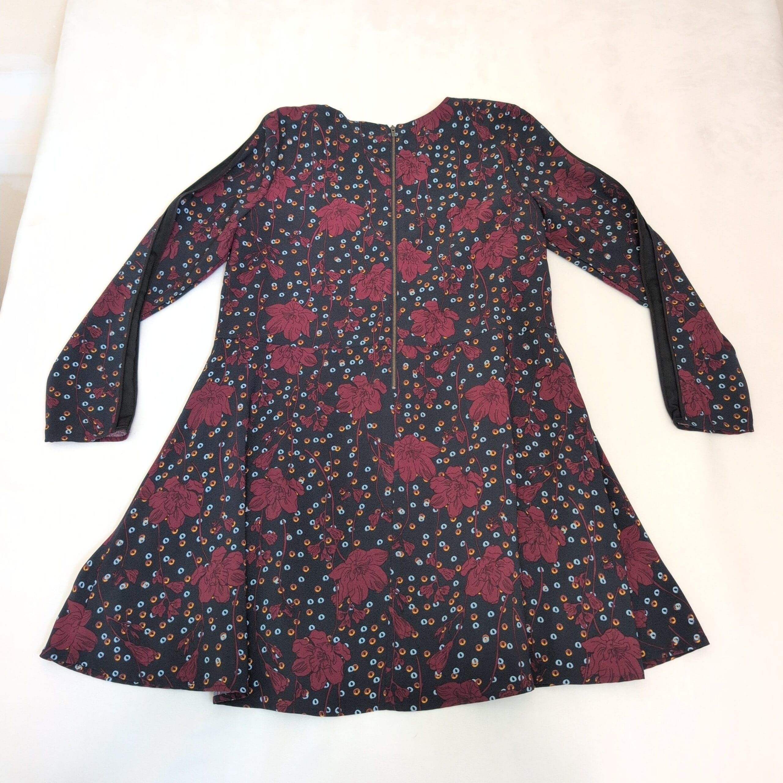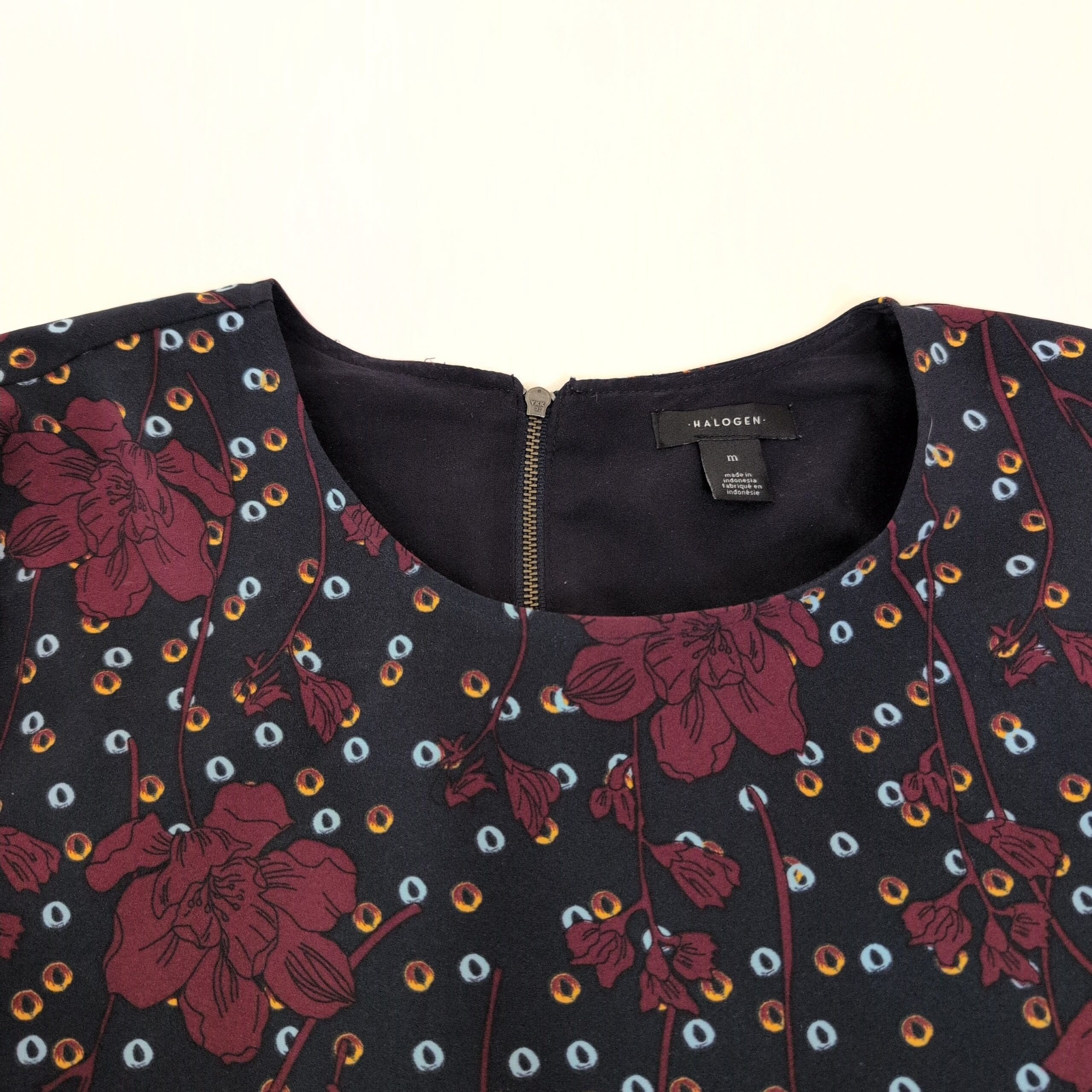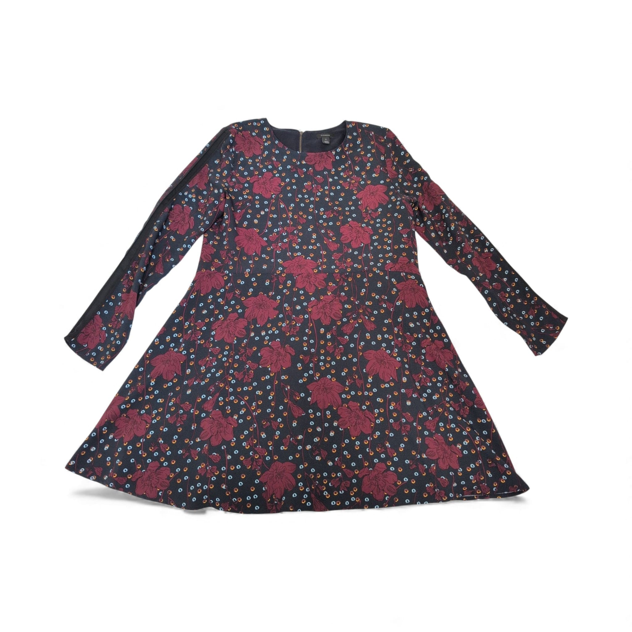 Halogen long sleeve A-line dress in a deep blue base with bold burgundy floral and multicolor dot print. Size M (Standard) with a classic crew neckline and a flattering fit-and-flare silhouette—easy to dress up or down for work, weekend, or evenings out.