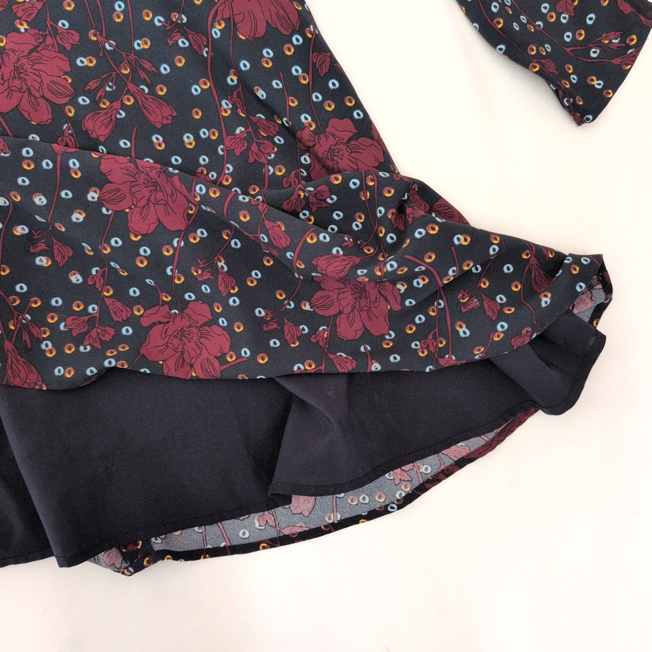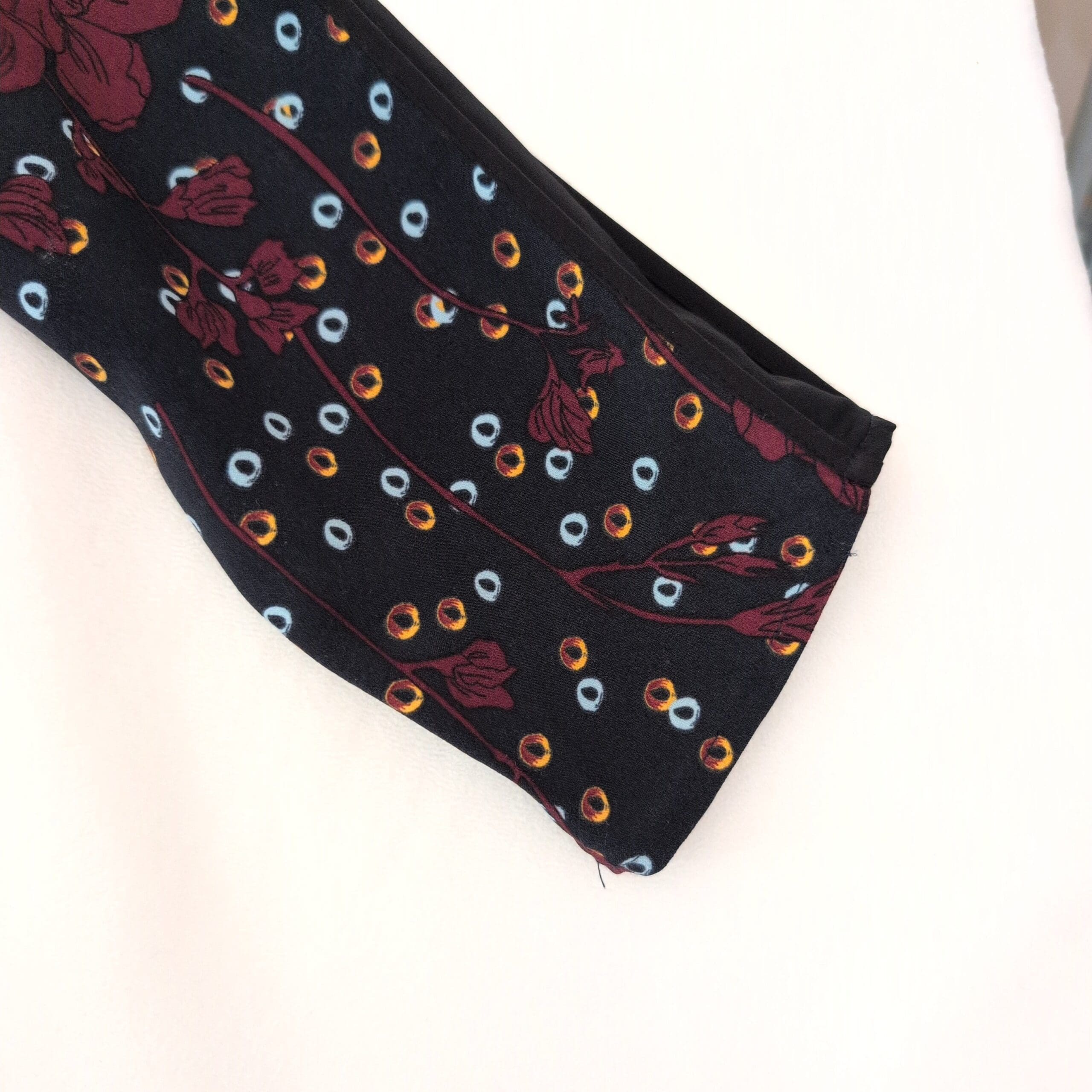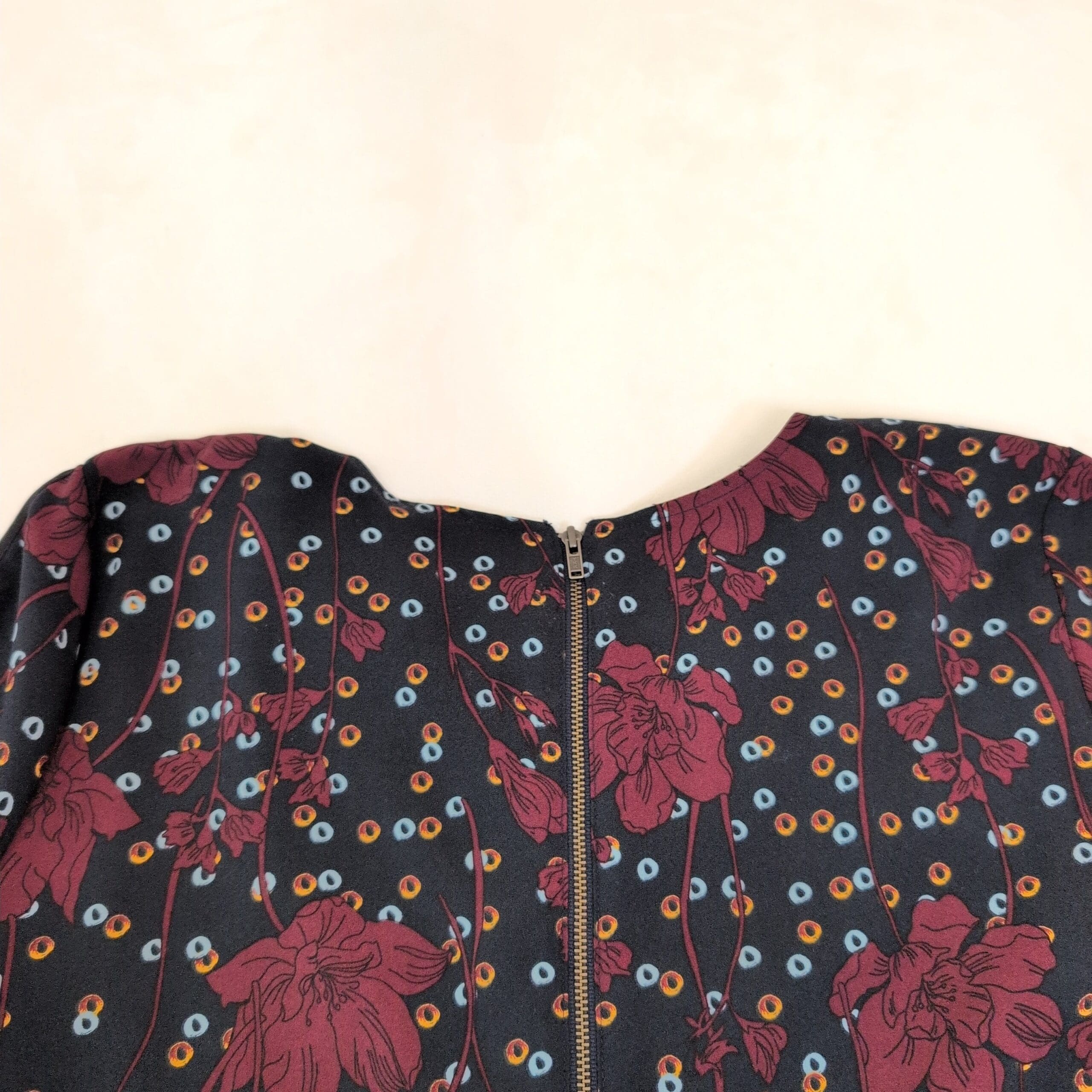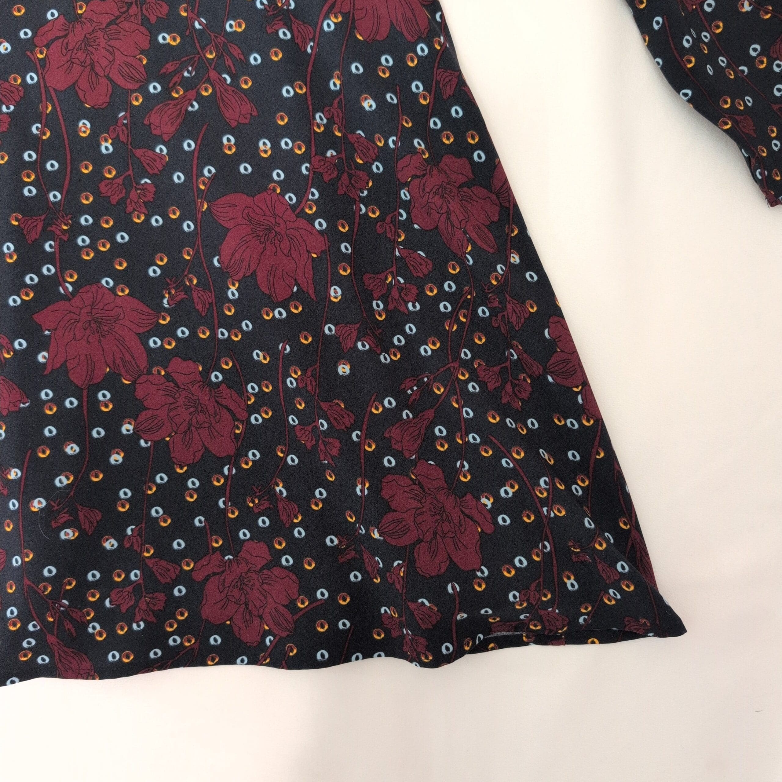 Halogen long sleeve A-line dress in a deep blue base with bold burgundy floral and multicolor dot print. Size M (Standard) with a classic crew neckline and a flattering fit-and-flare silhouette—easy to dress up or down for work, weekend, or evenings out.