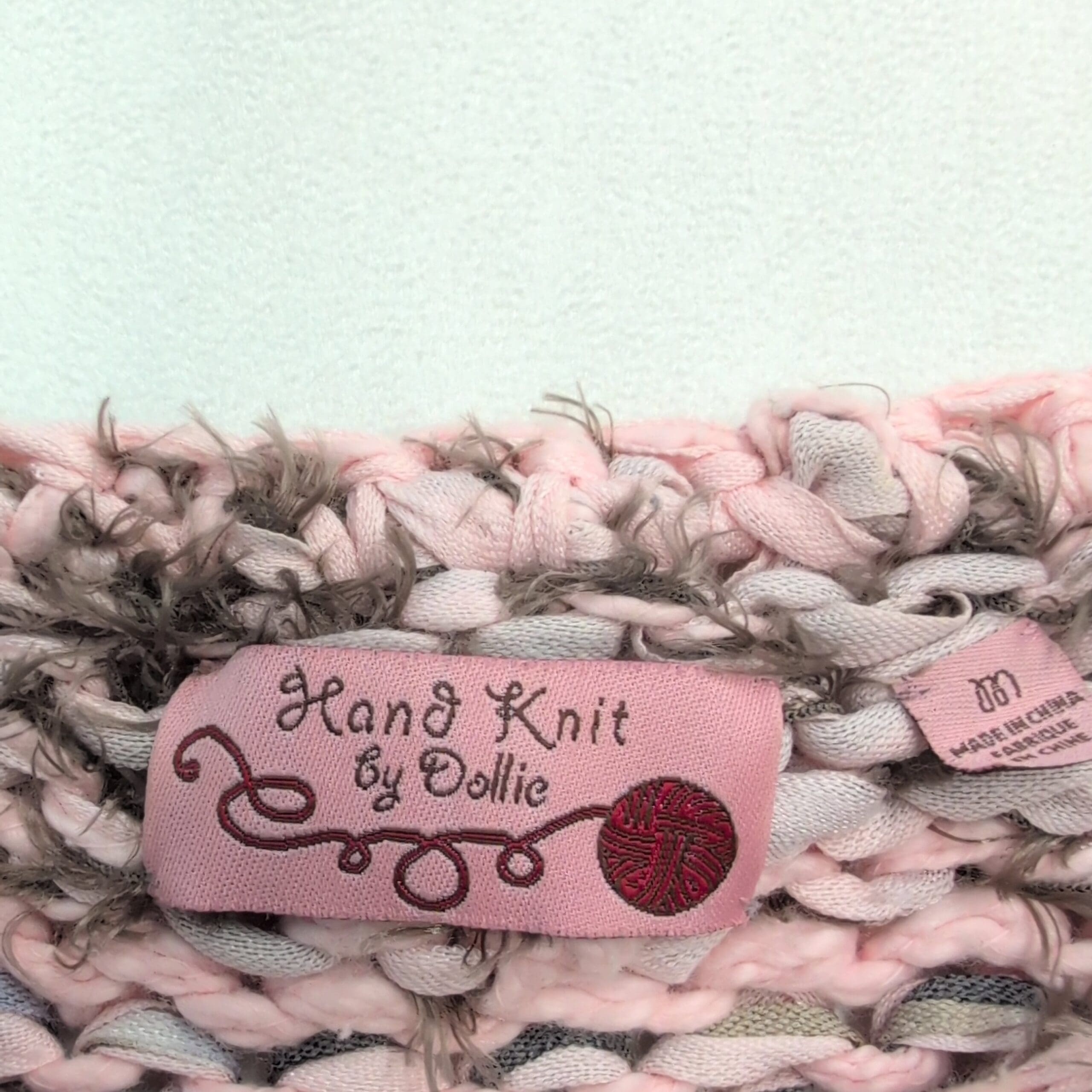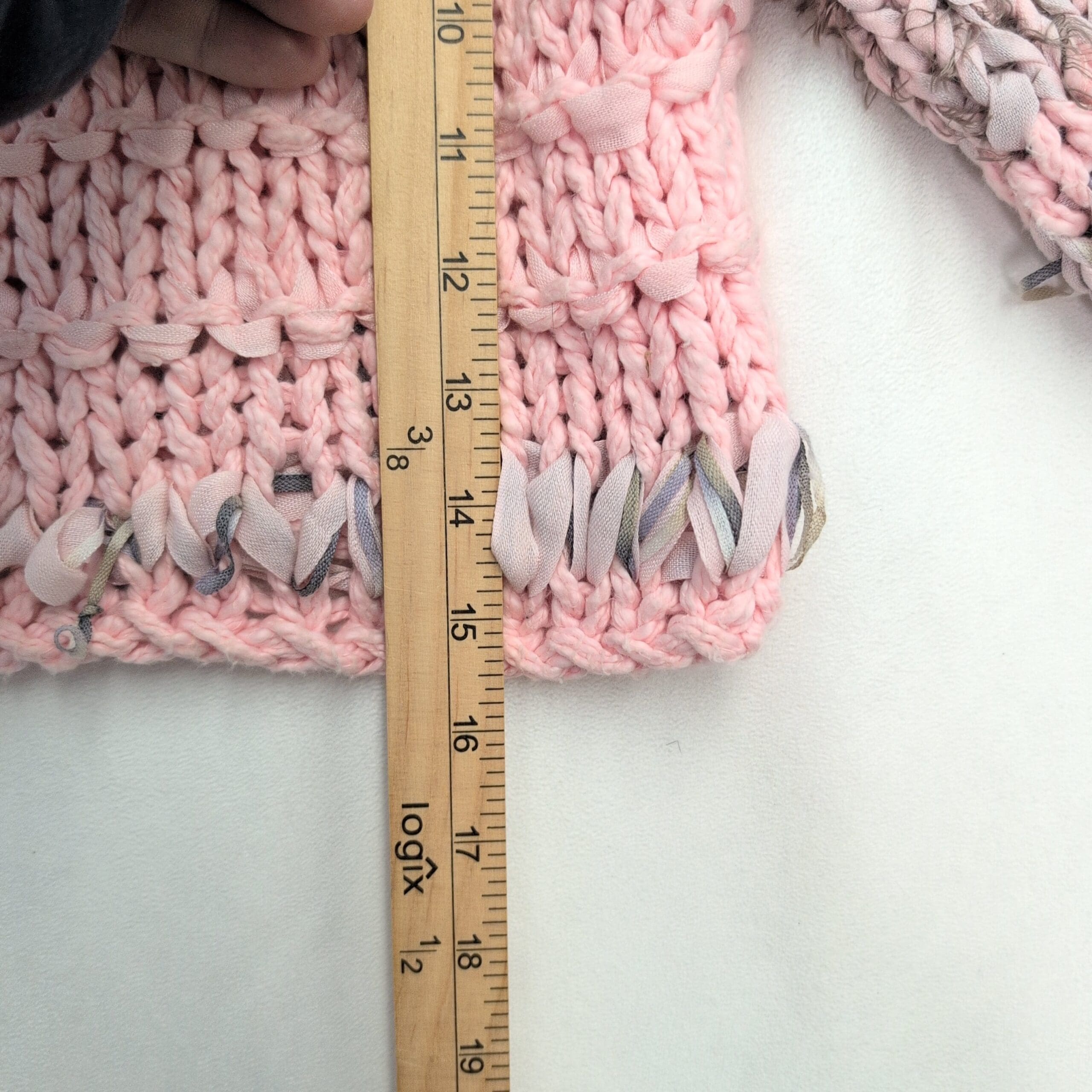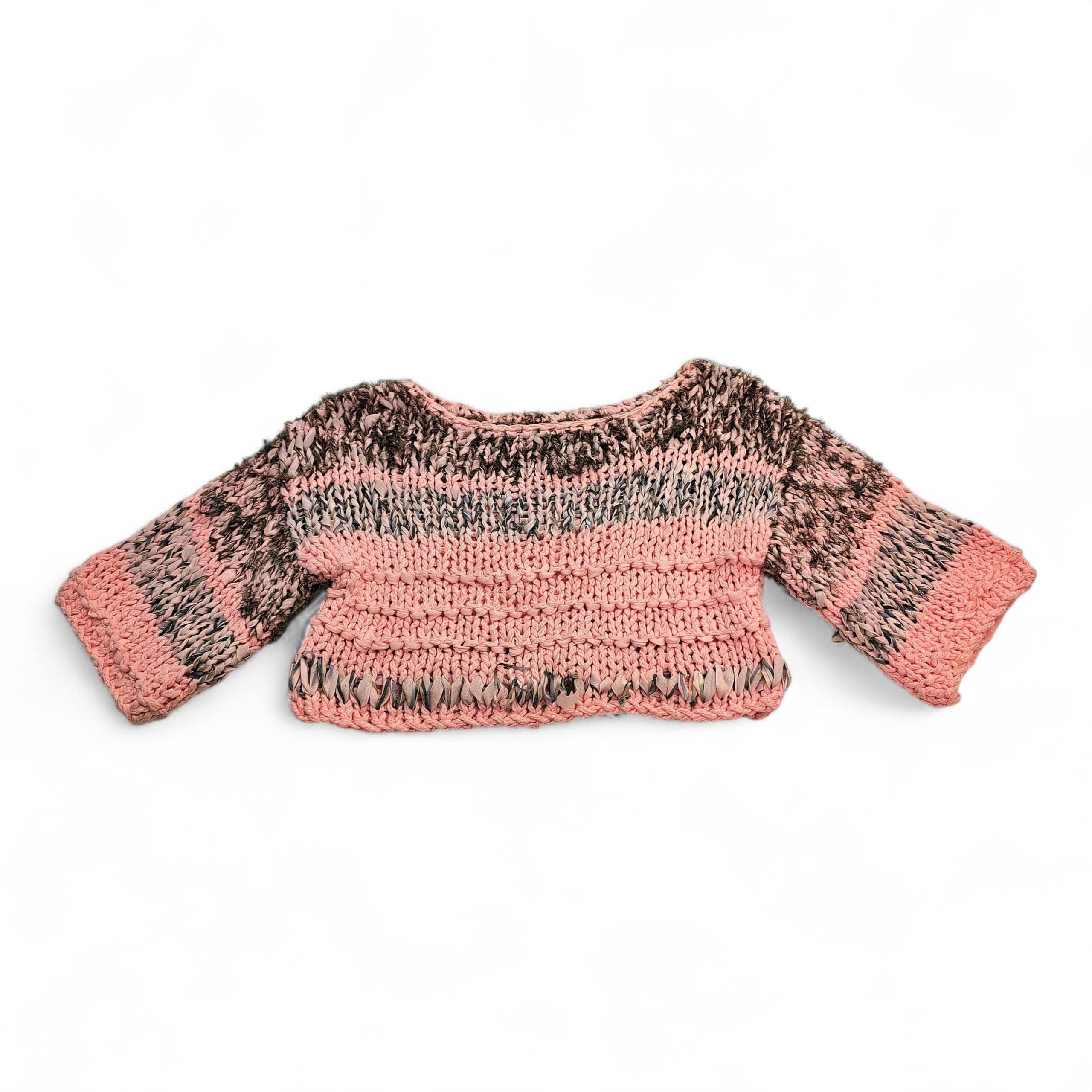 Hand Knit by Dollie pink hand-knit cropped sweater in size M. Textured, loose stitch with mixed pink and neutral yarns and three-quarter sleeves for a boxy, cozy silhouette — great layered over high-waist jeans or skirts. Soft, slightly airy open-knit construction with visible stitch detail.