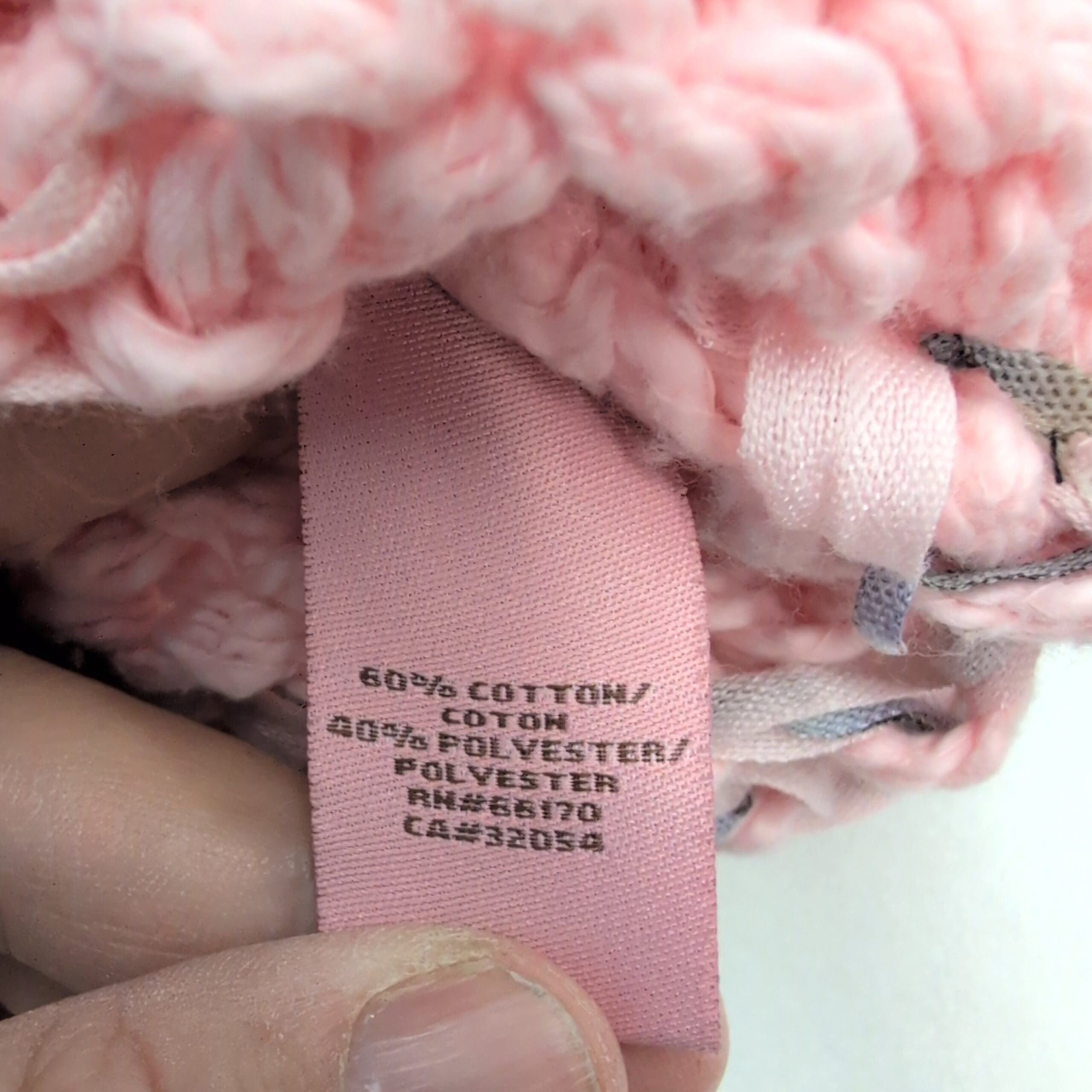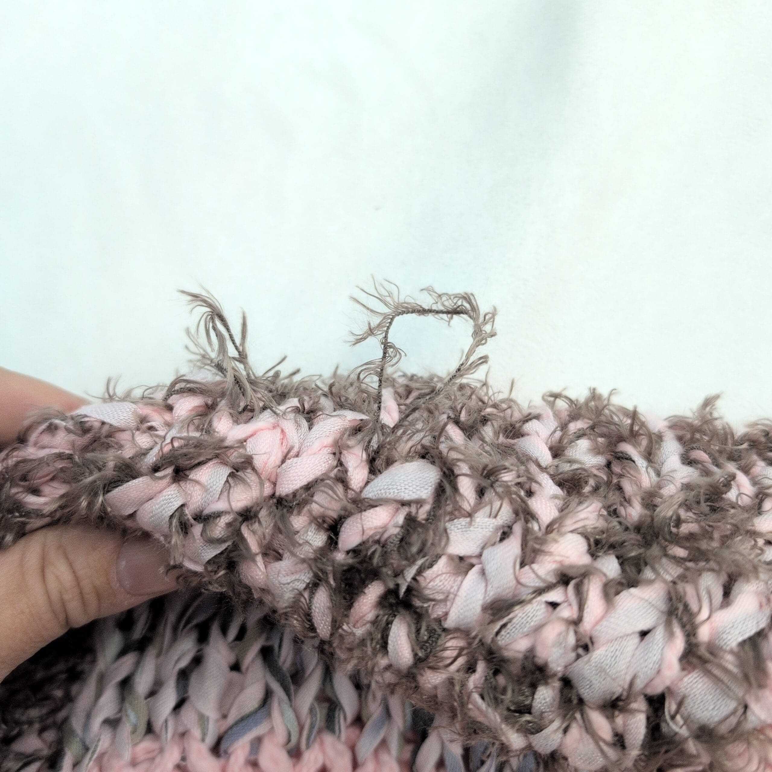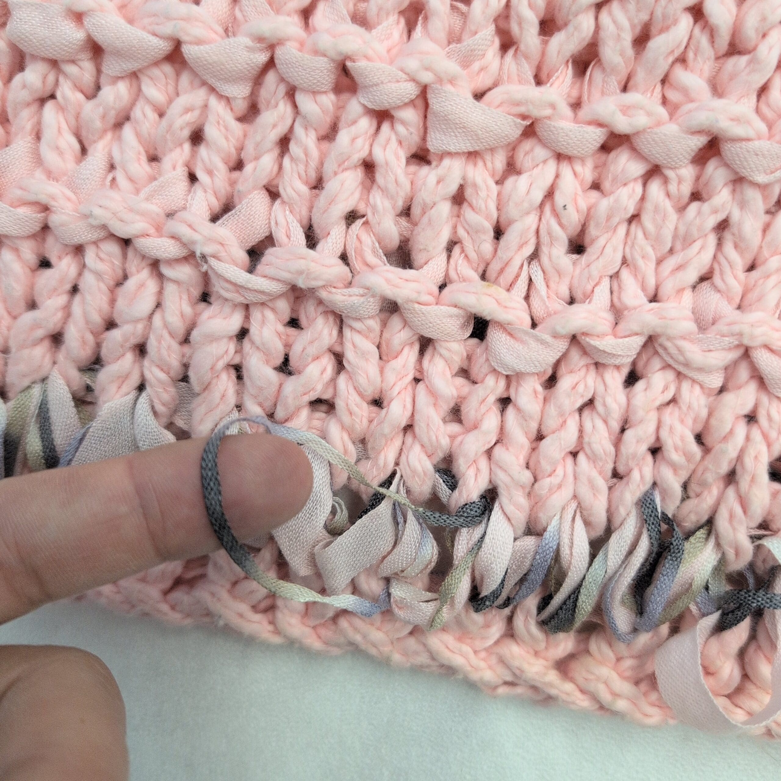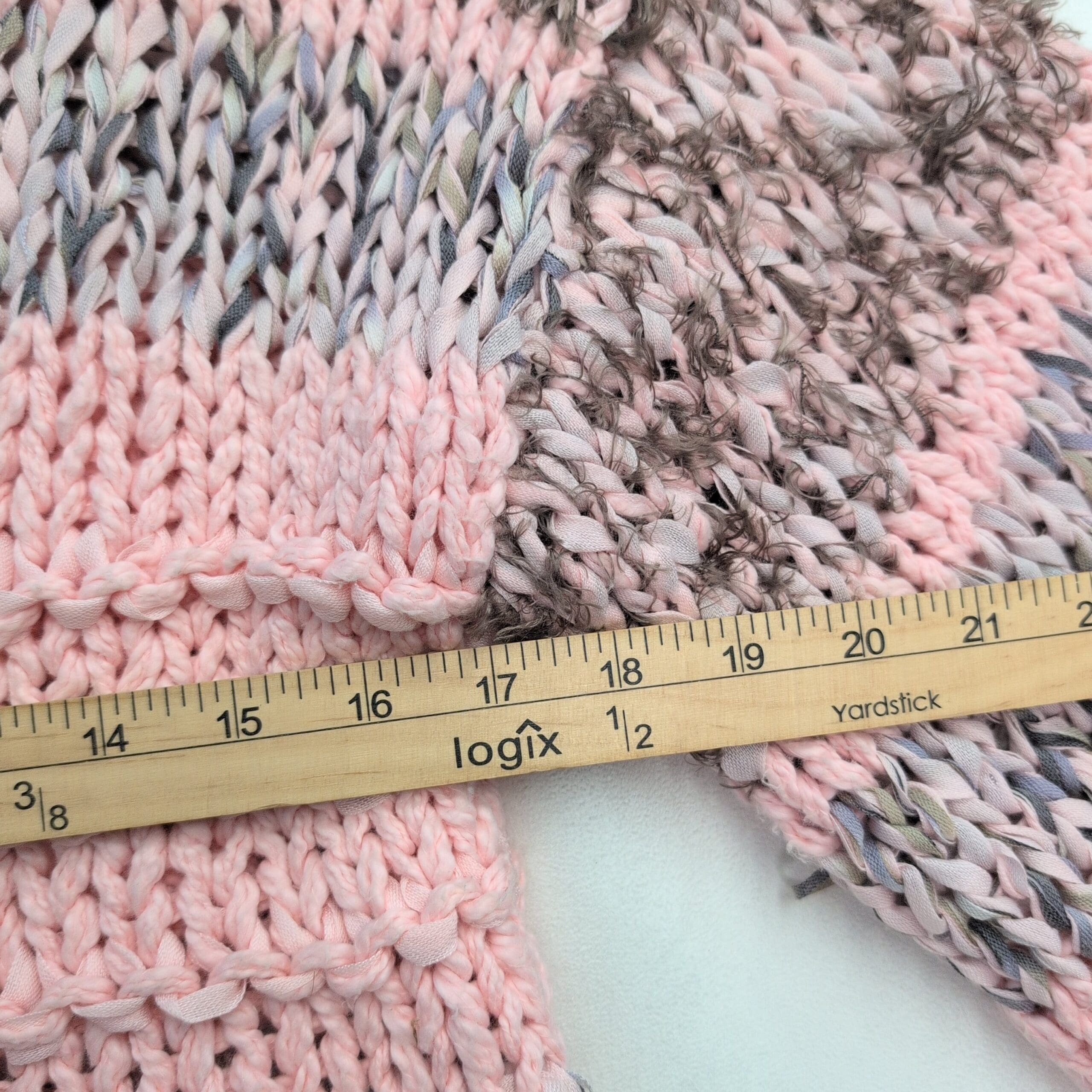 Hand Knit by Dollie pink hand-knit cropped sweater in size M. Textured, loose stitch with mixed pink and neutral yarns and three-quarter sleeves for a boxy, cozy silhouette — great layered over high-waist jeans or skirts. Soft, slightly airy open-knit construction with visible stitch detail.