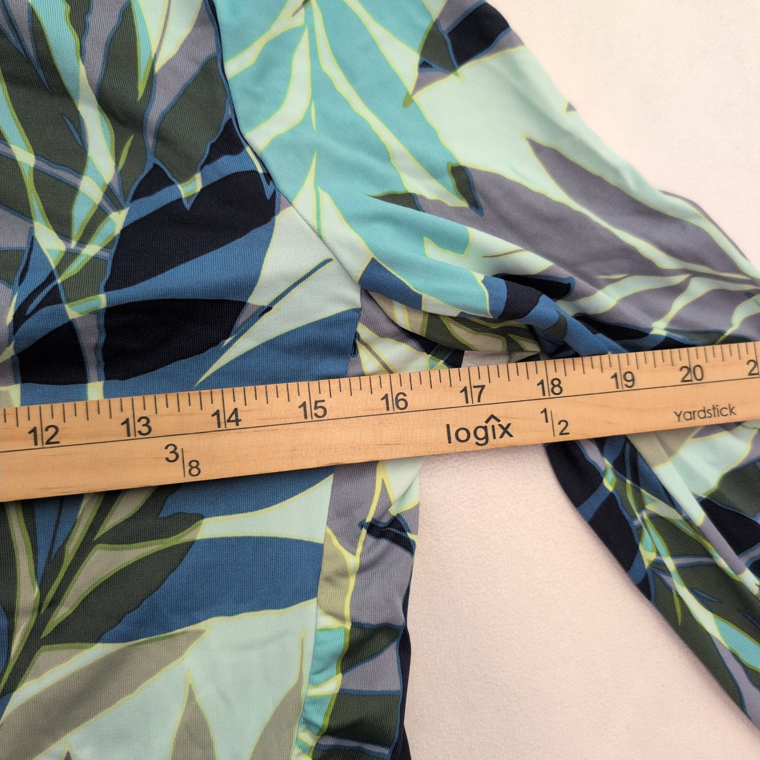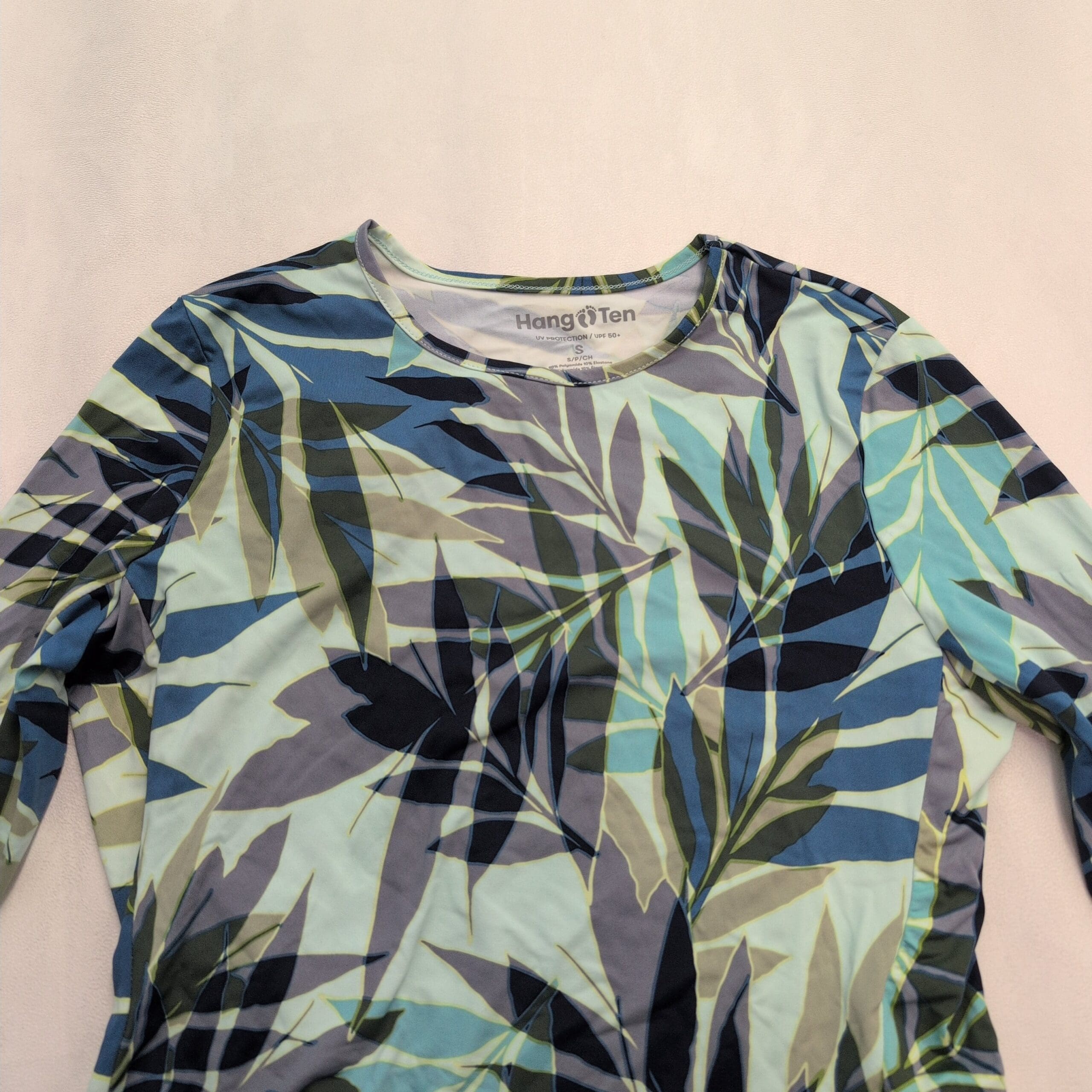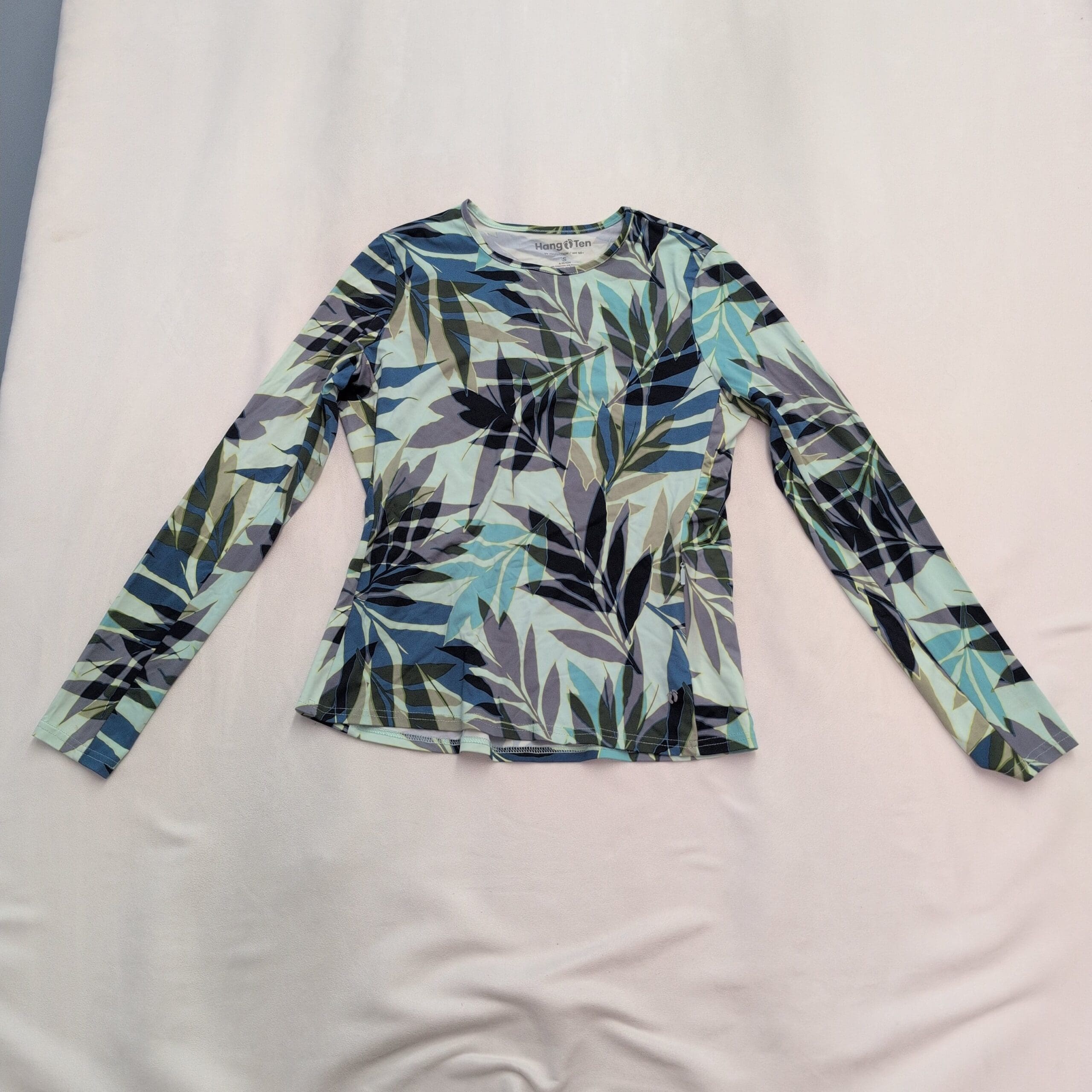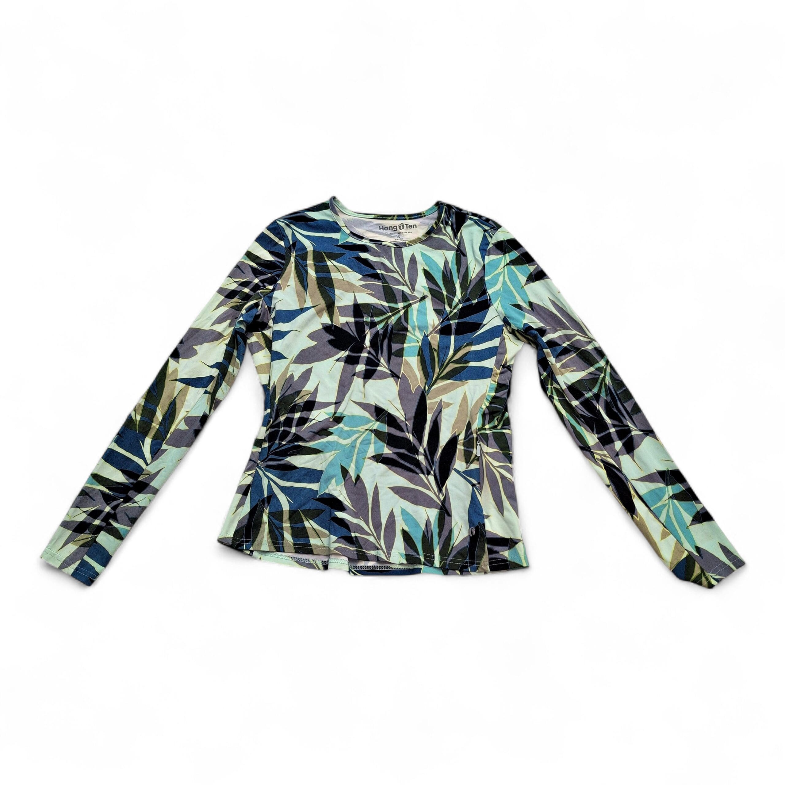 Hang Ten women’s long-sleeve swim top in size S with a blue-green leaf/tropical all-over print. Crew neckline and slim, fitted silhouette designed for comfortable coverage in the water or layered at the beach. Brand tag present. Gently used and free of major rips, tears, or stains; typical light wear may be present.