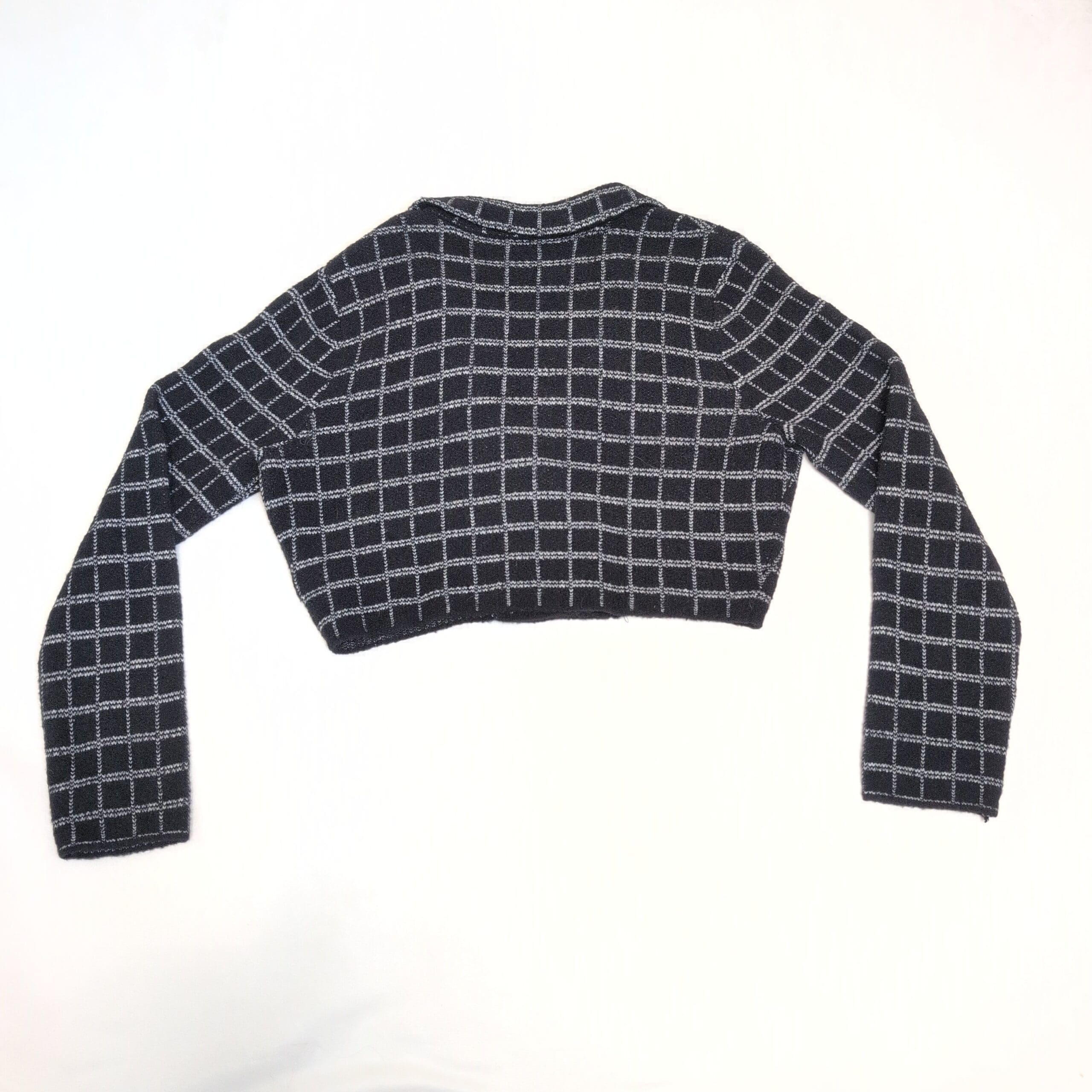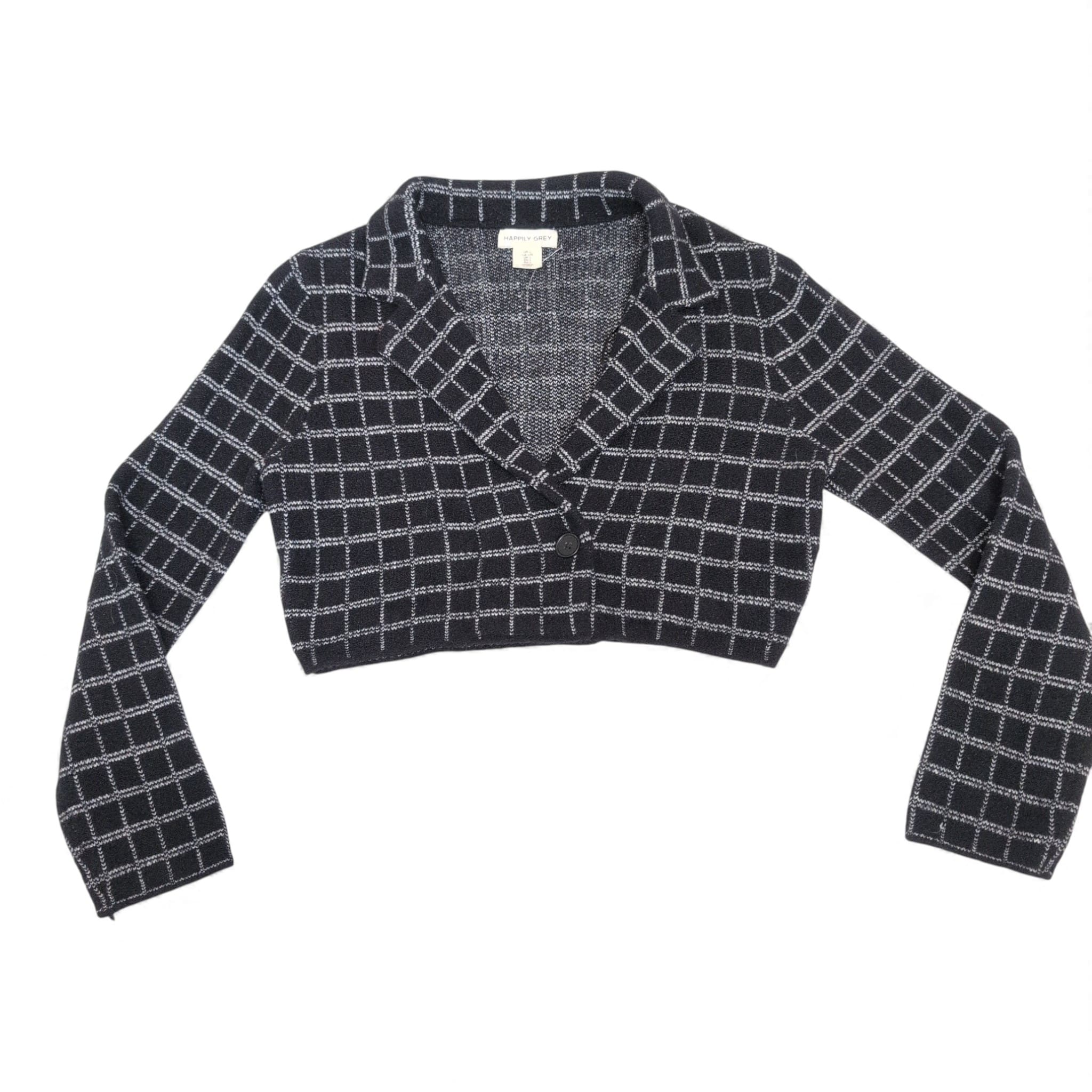 Happily Grey women’s V-neck cropped cardigan in black with a white windowpane grid pattern. Features a collar, long sleeves, and a single-button front closure—perfect for layering over tees or dresses. Size L (standard) for a relaxed cropped fit. Clean, modern silhouette that pairs well with high-waist jeans or skirts.
