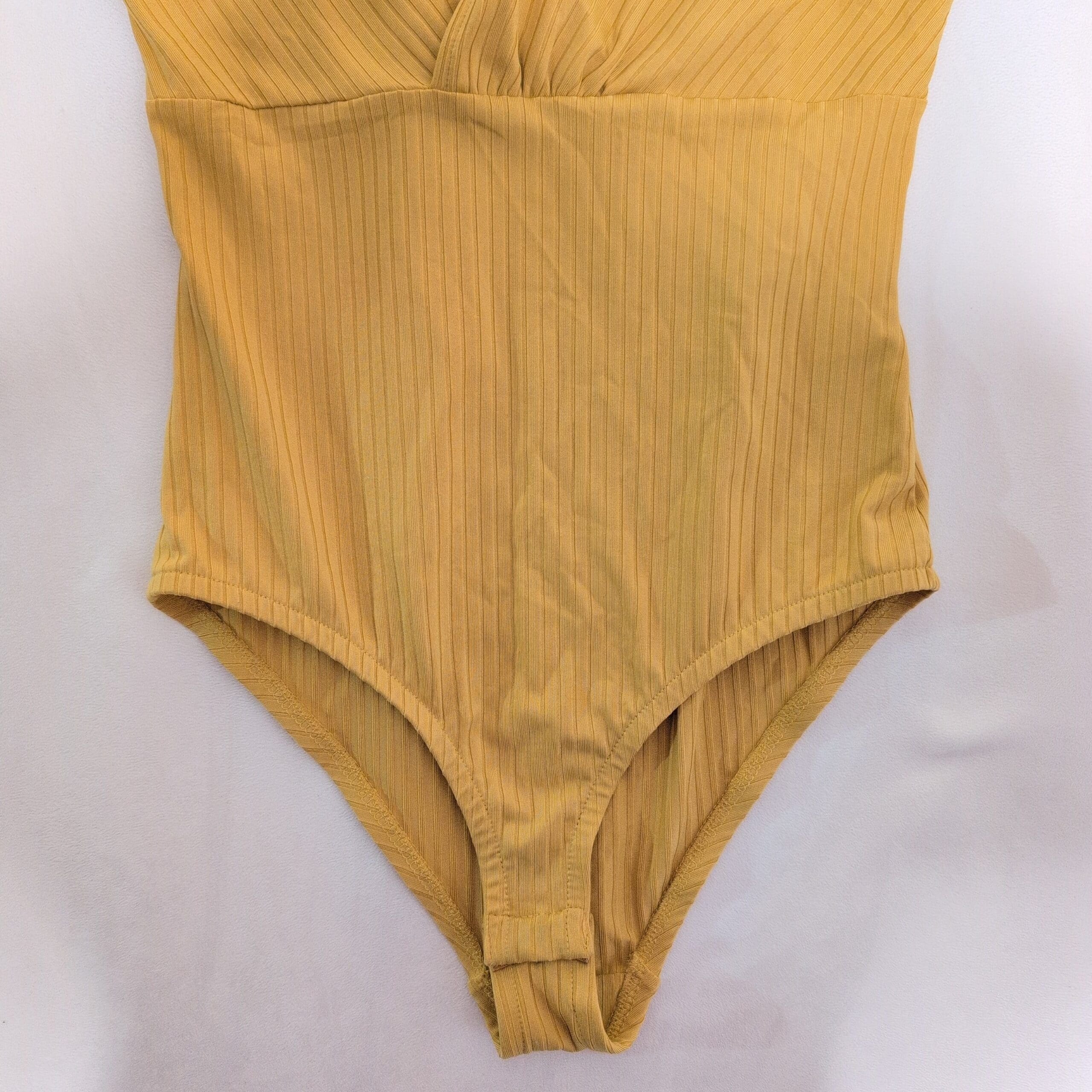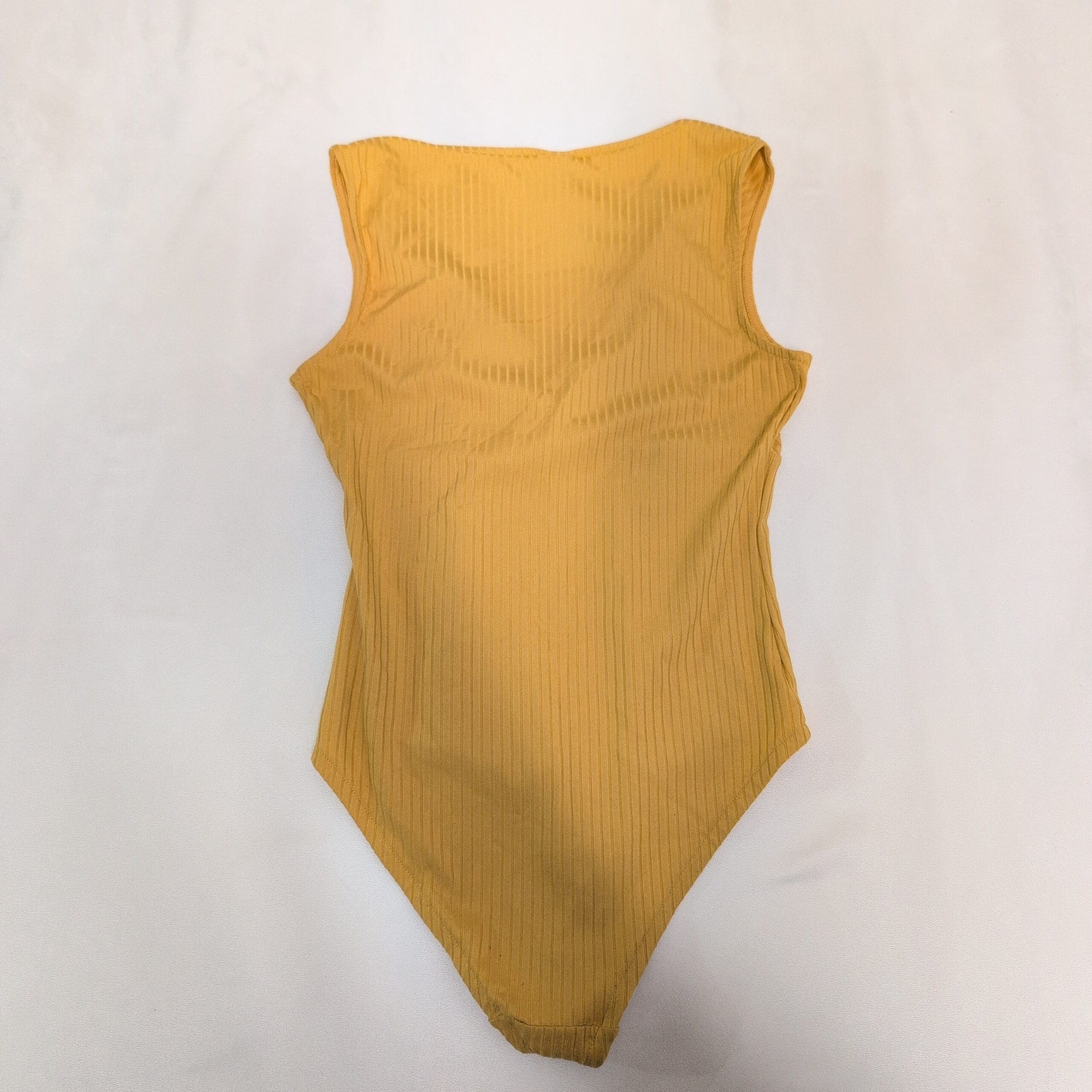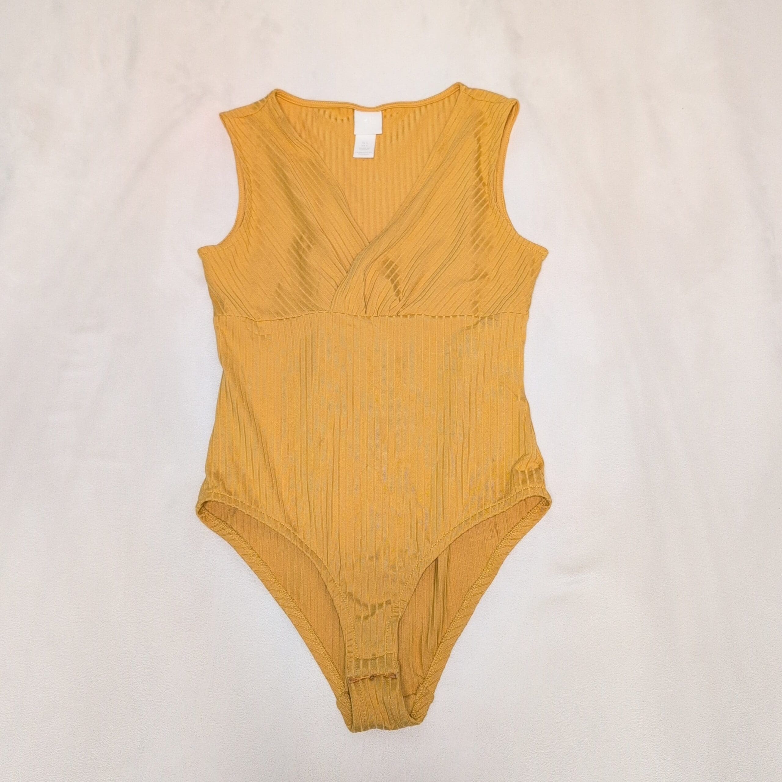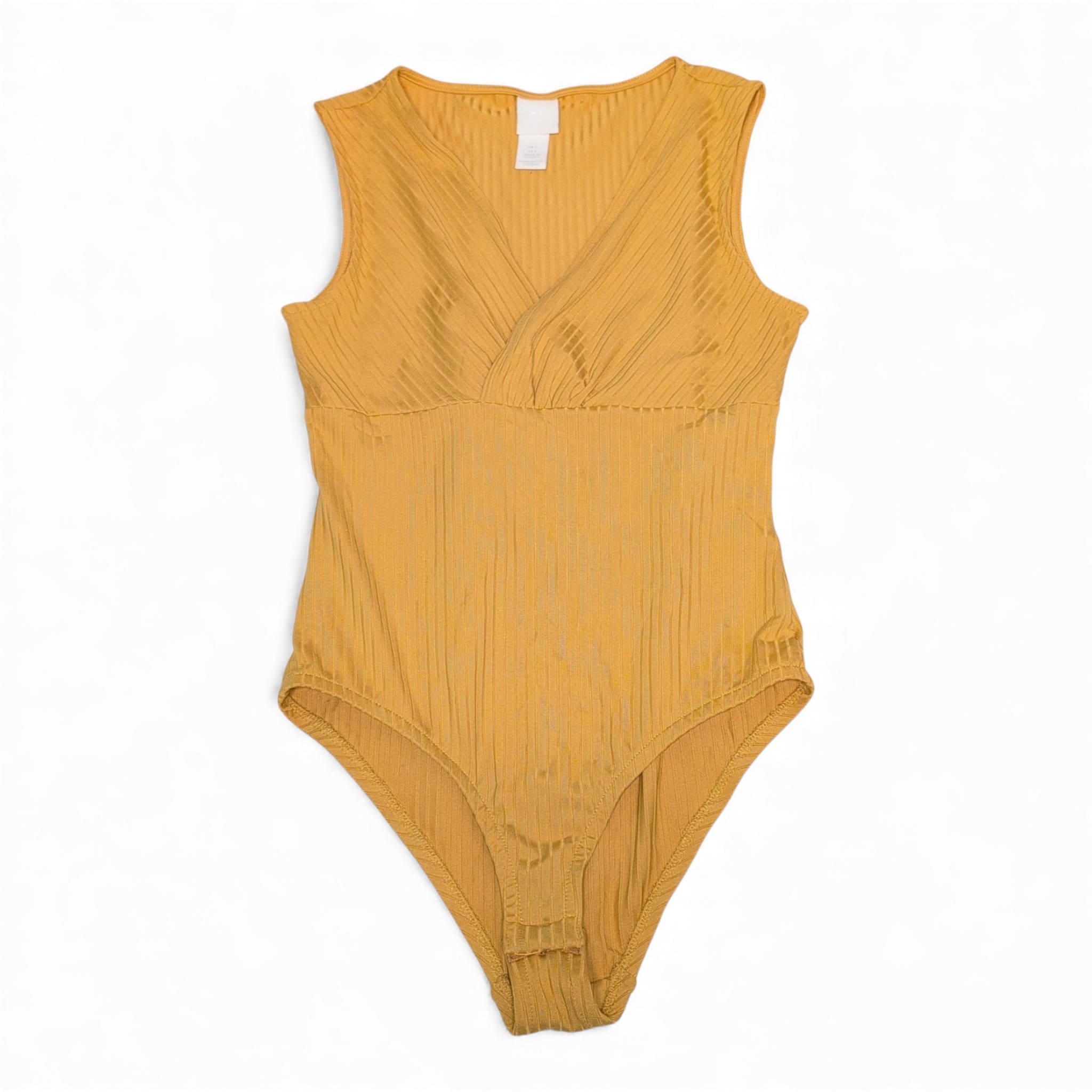 Bright mustard-yellow ribbed H&M bodysuit in Women’s size S. Sleeveless with a flattering V-neck and a fitted, stretchy silhouette — perfect for layering or wearing on its own. Features a snap-button crotch closure for easy wear and a subtle textured knit that adds interest to casual or dressy looks. Pre-owned and in good condition with normal light wear.