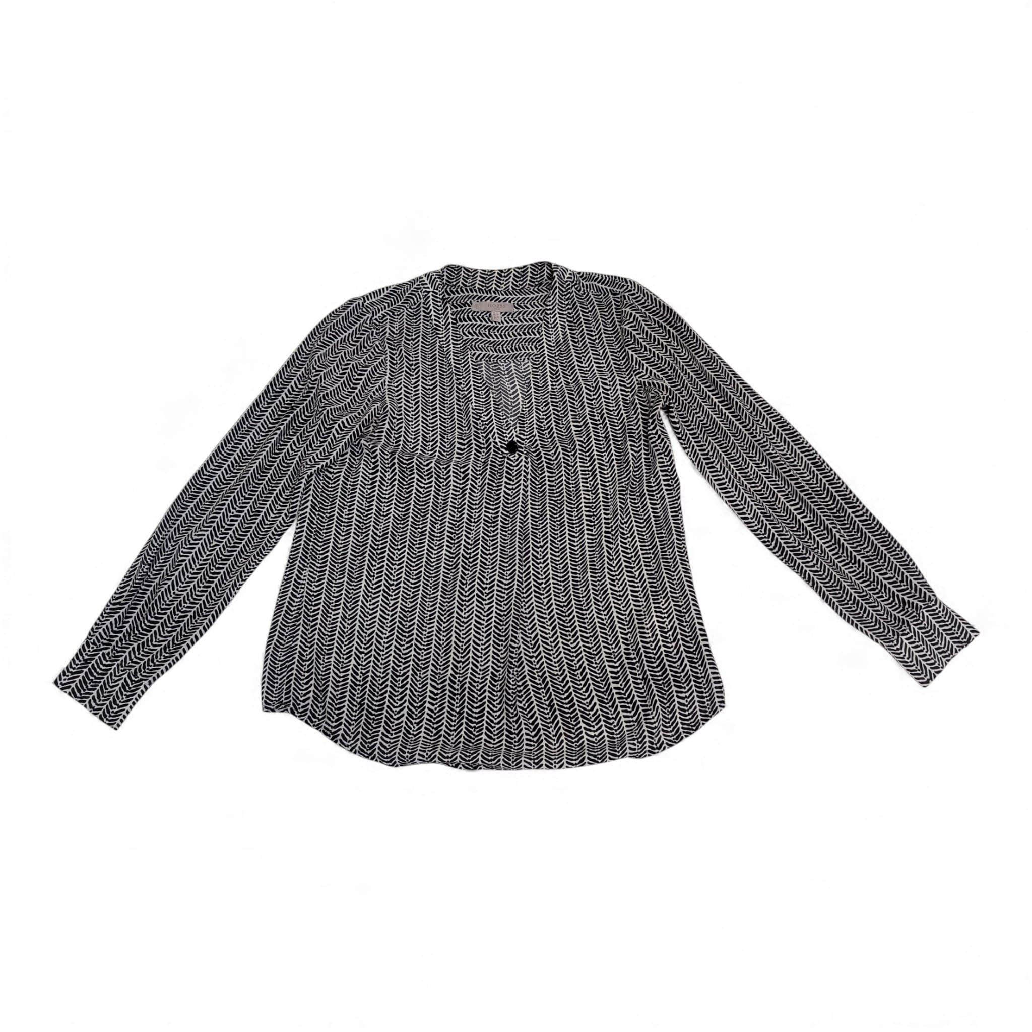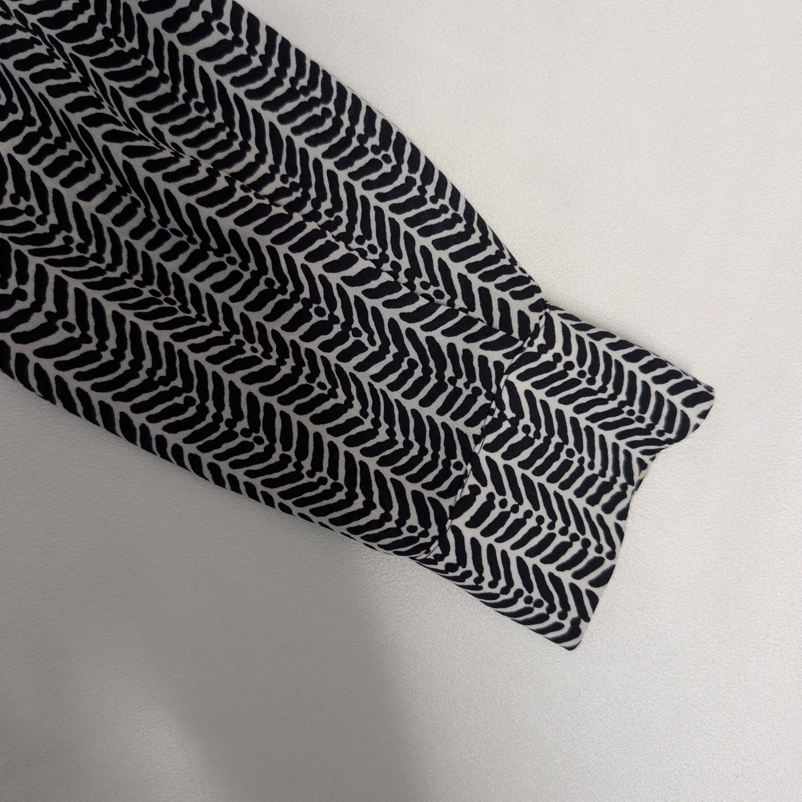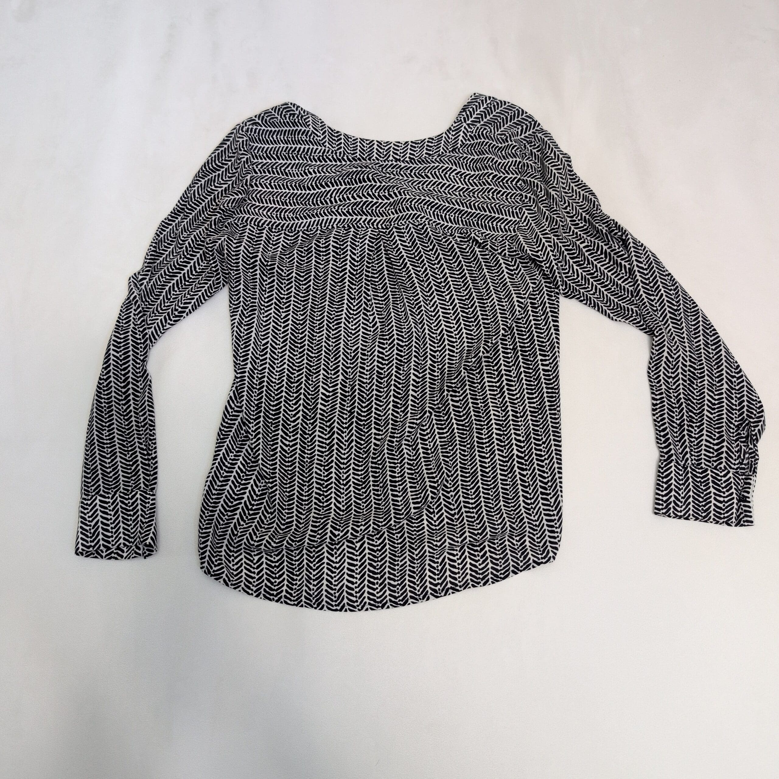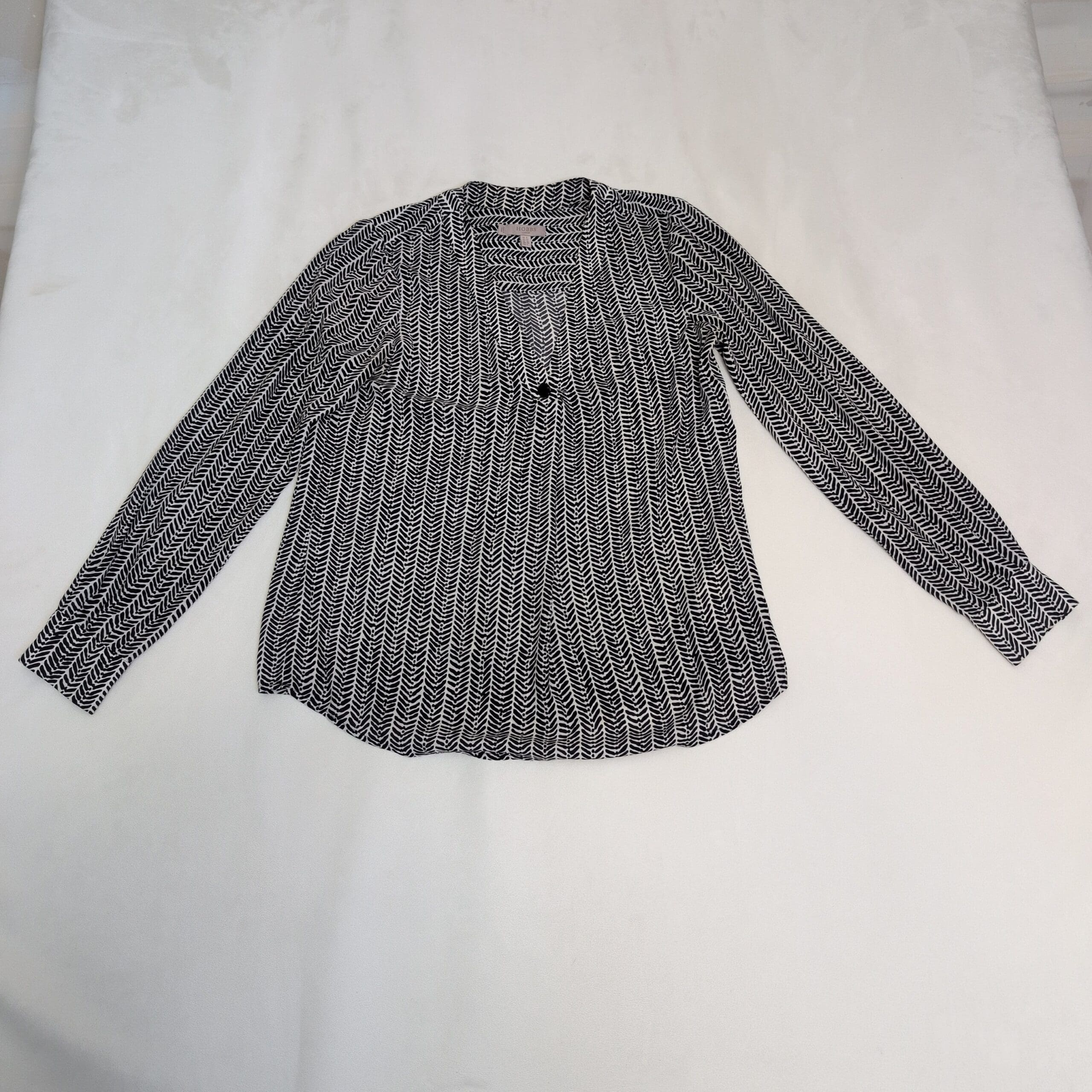 Hobbs London long-sleeve blouse in a black-and-white chevron-inspired geometric print. Size 4 (standard). Features a V-neck with a single front button and gentle gathering under the bust for a flattering, slightly A-line drape. Lightweight, polished silhouette perfect for the office or layered for casual weekend looks. Pre-owned — excellent condition with no visible stains, pulls, or odors.