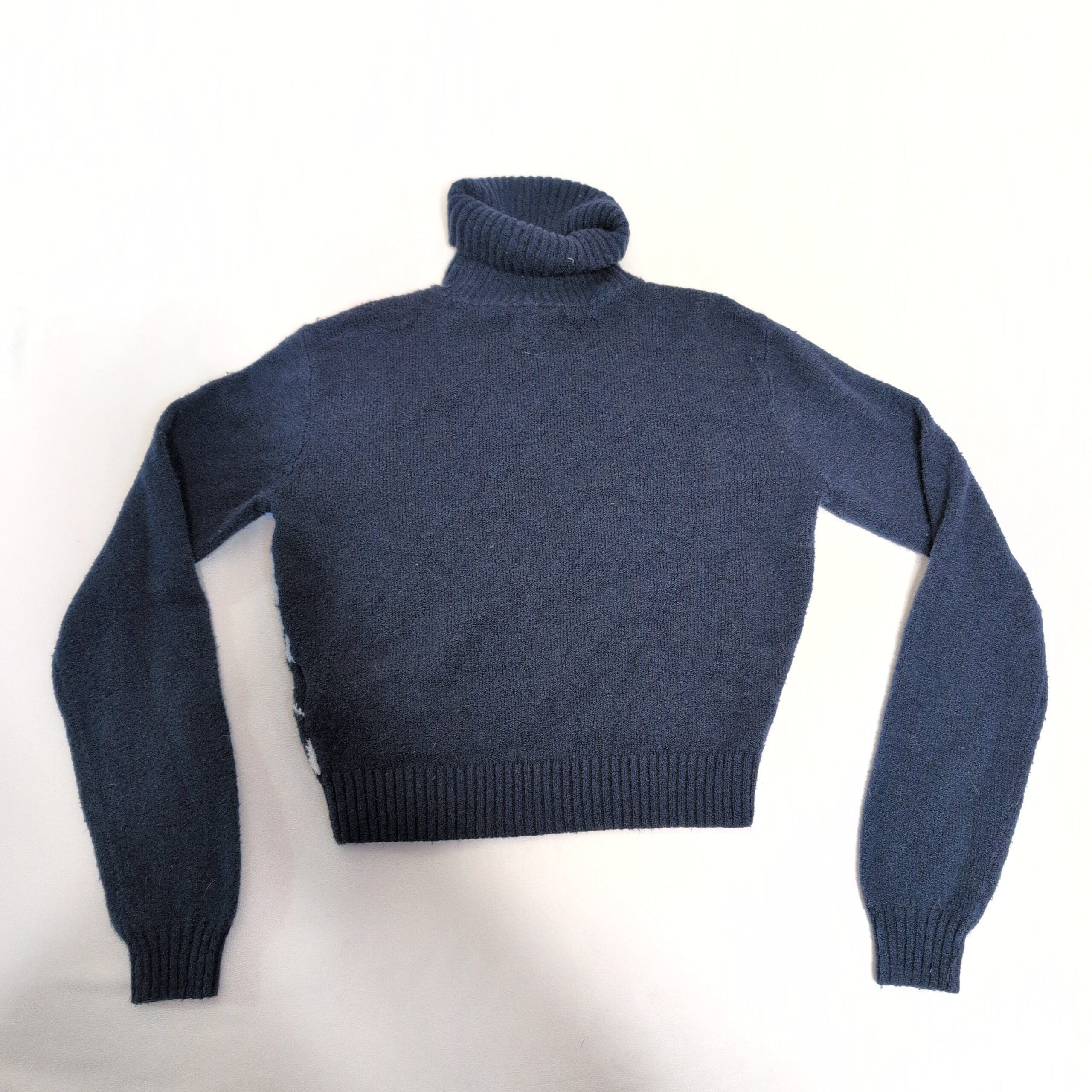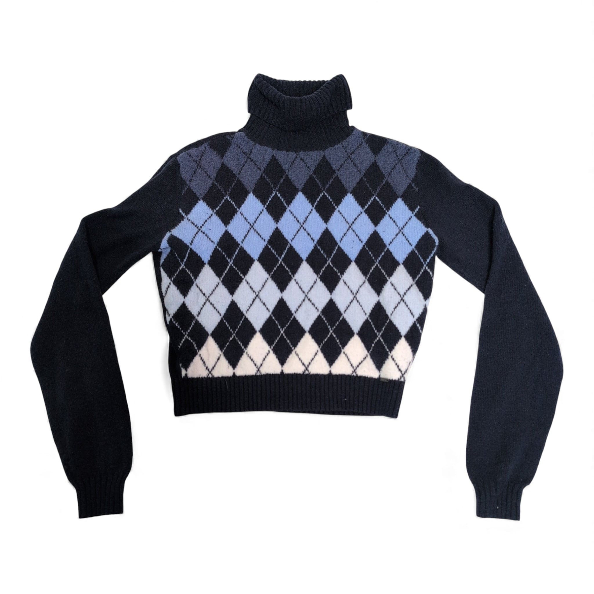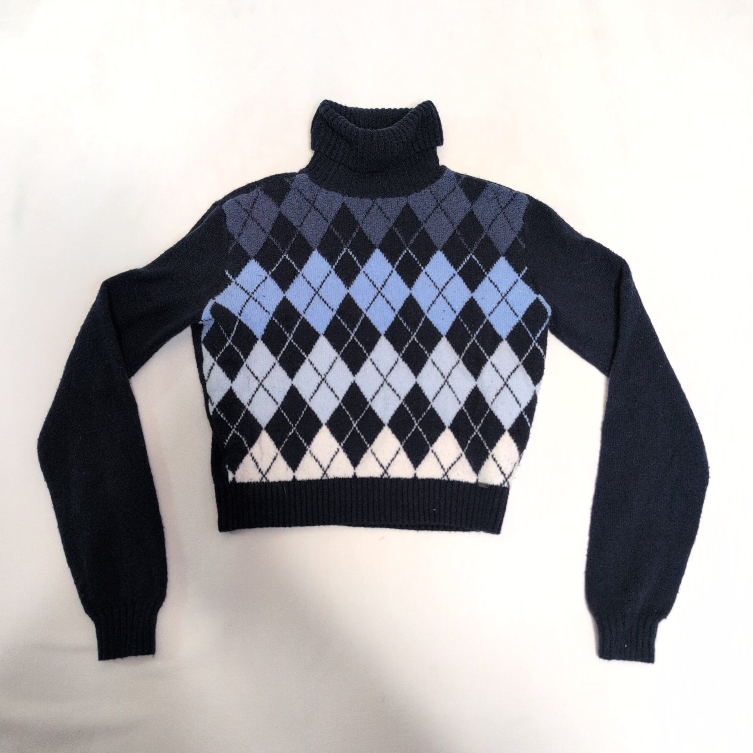 Hollister women’s argyle turtleneck sweater in shades of navy, light blue and cream. Size XS (standard). Features a cozy ribbed turtleneck, long sleeves and ribbed cuffs and hem; a soft knit perfect for layering with jeans or skirts. Cropped-to-waist silhouette and timeless argyle pattern give this piece a preppy, vintage-inspired look. Pre-owned — excellent, gently used condition with normal light wear; see photos for details.