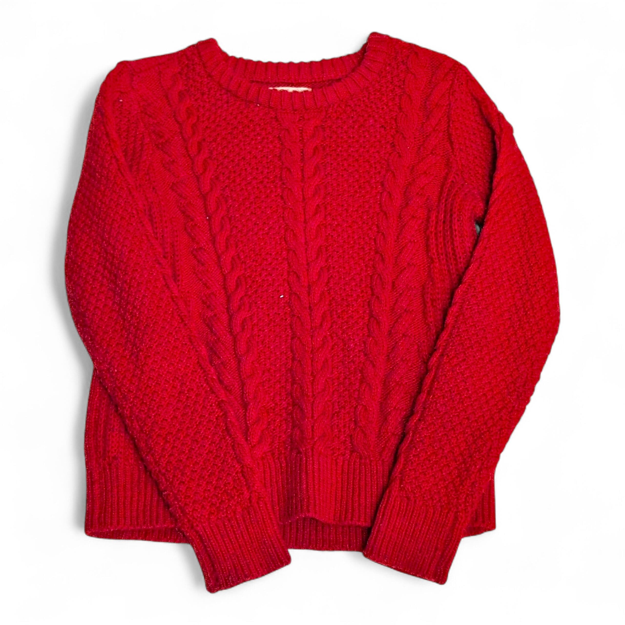 Cozy Hollister cable-knit crewneck sweater in a vibrant red — size XS. Features braided cable panels down the front, textured stitch sides, and ribbed neckline, cuffs, and hem. Medium-weight knit that’s great for layering and pairs easily with jeans or skirts.