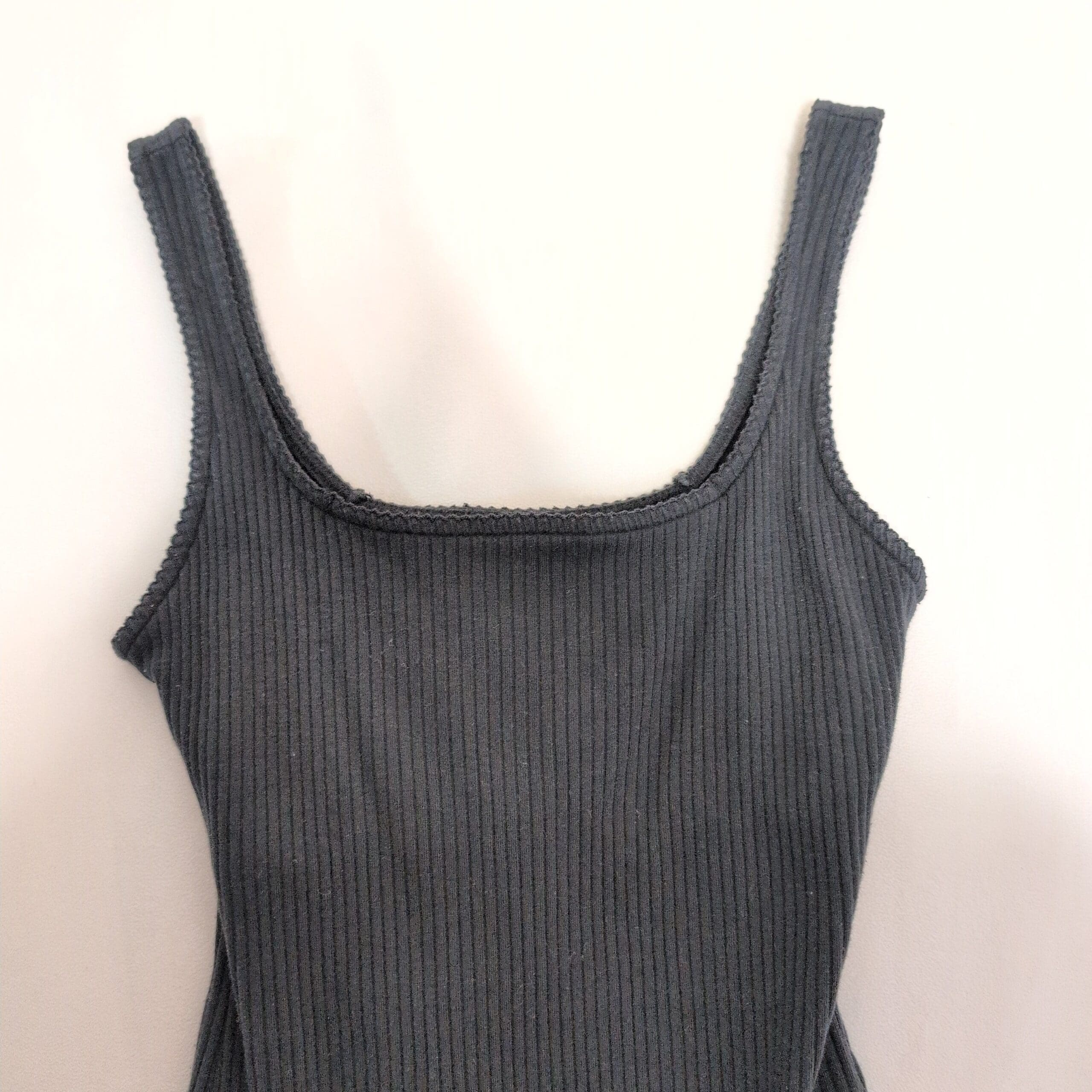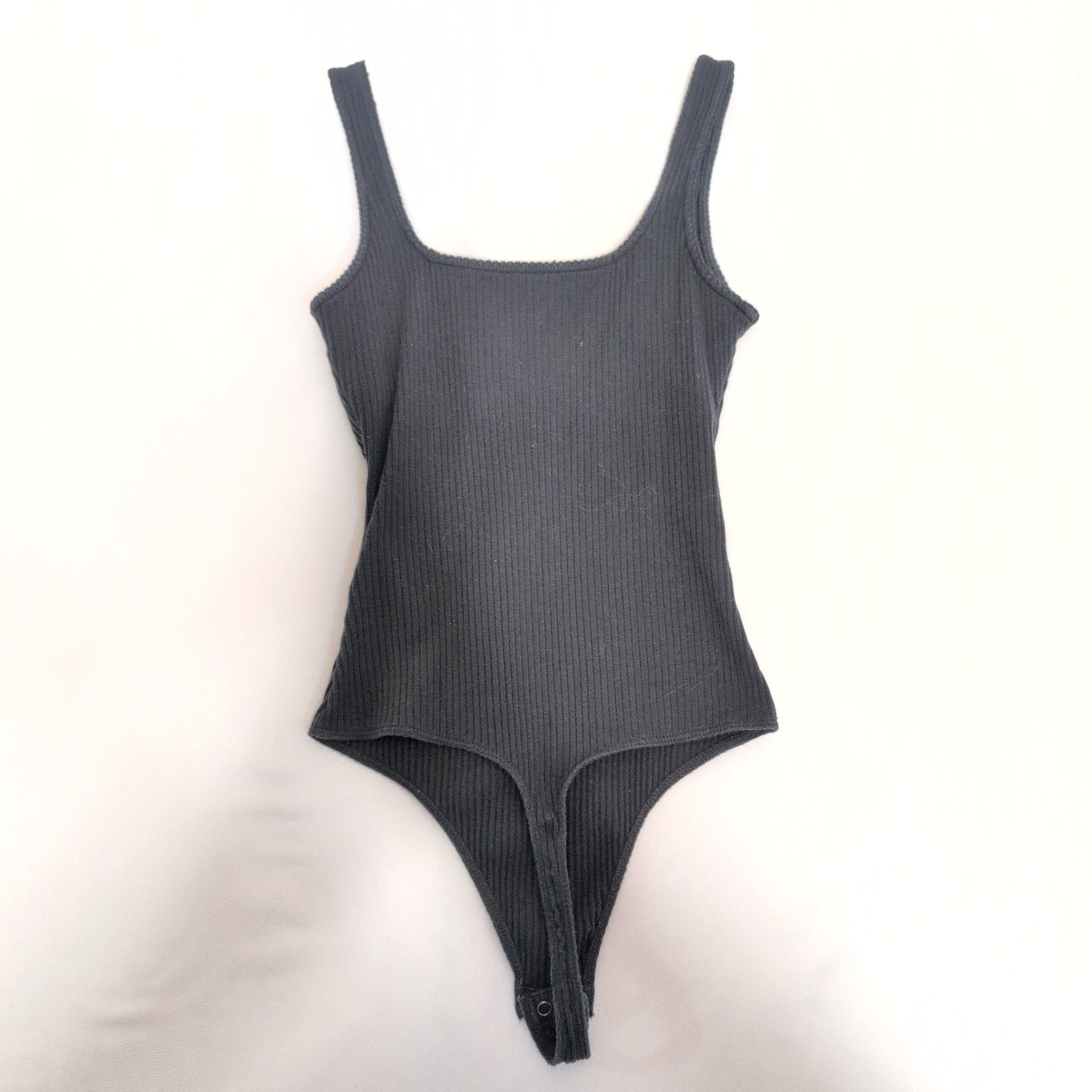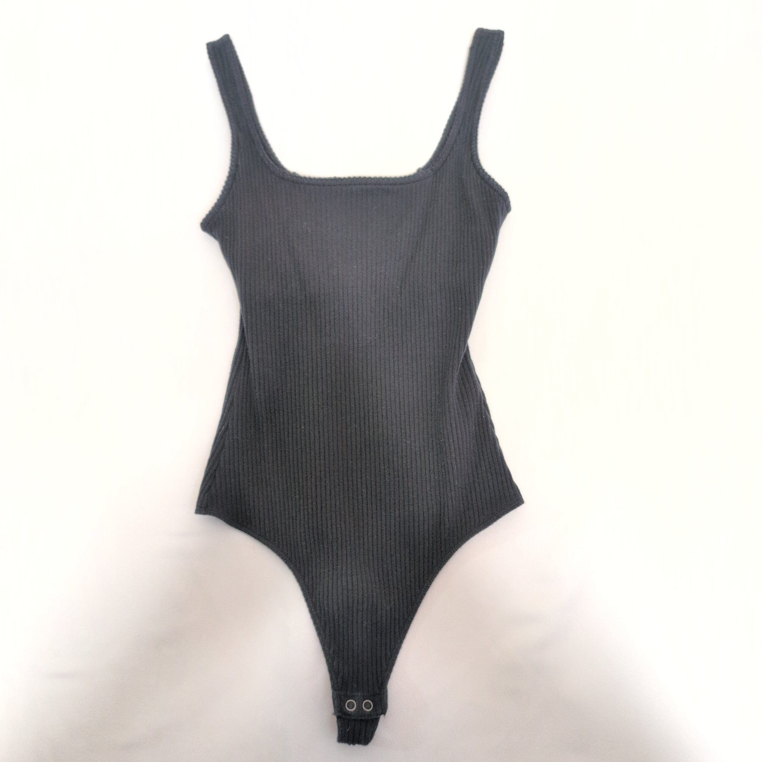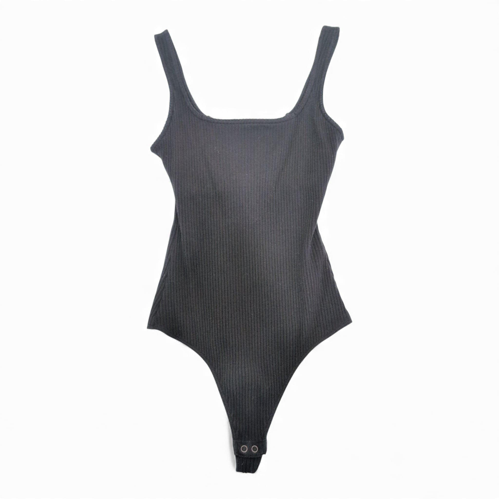 Hollister women’s ribbed black bodysuit in size S. Features a square neckline with wide tank straps, a slim, figure-hugging silhouette, and snap-button crotch closure for easy wear. Soft, stretchy ribbed knit that layers beautifully under jackets or pairs with high-waist jeans and skirts for versatile day-to-night styling. Pre-owned — shows minimal signs of wear.