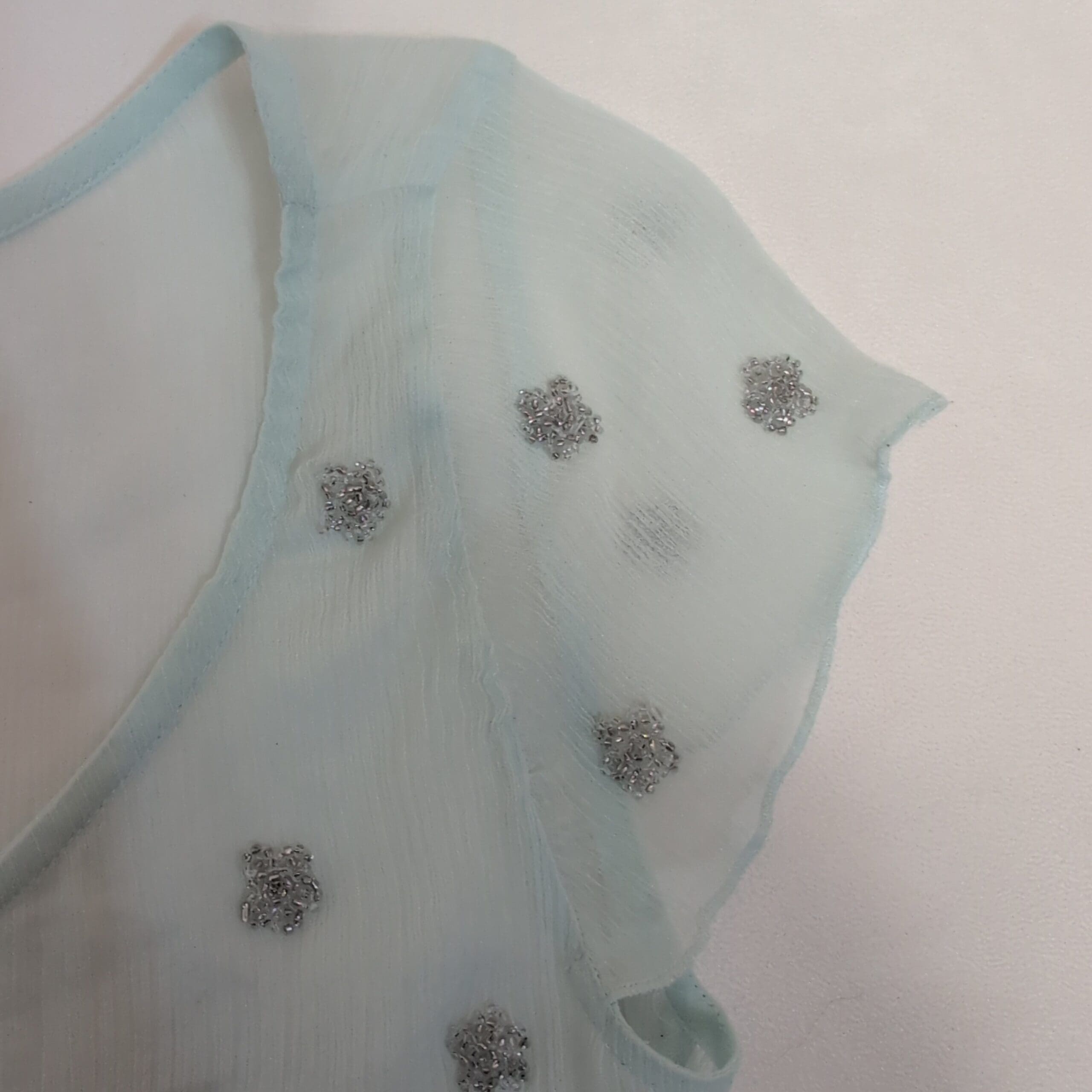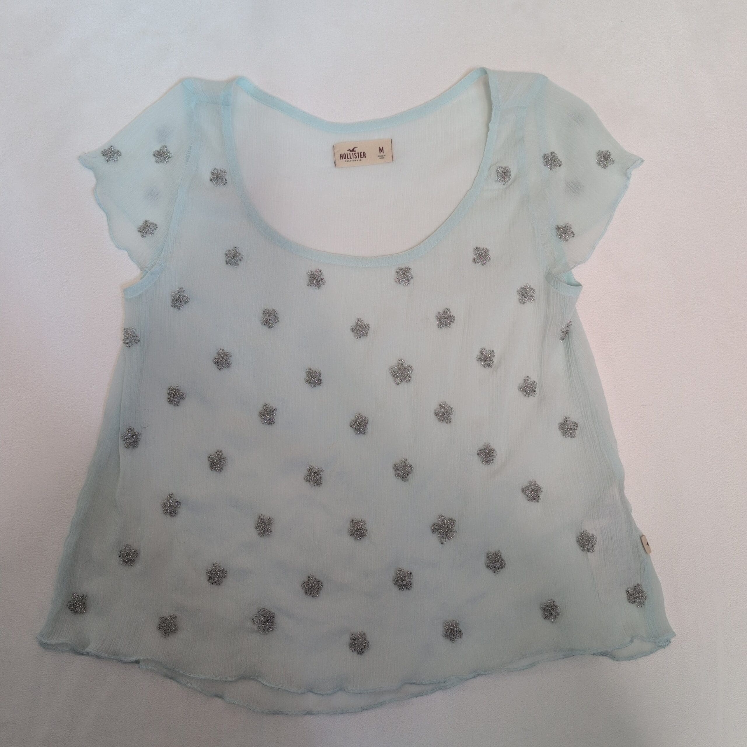 Hollister women’s sheer blouse in soft blue, size M. Lightweight, semi-sheer fabric with scoop neckline and short flutter sleeves. Silver-tone floral sequin embellishments scattered across the front and sleeves add subtle sparkle. Relaxed silhouette that pairs well over a cami or tank. See photos for details.