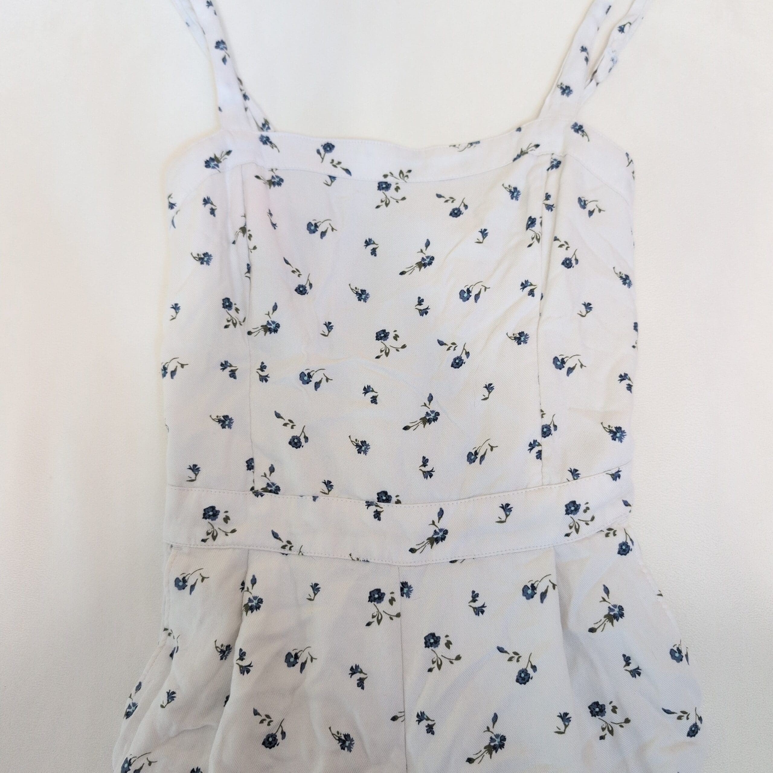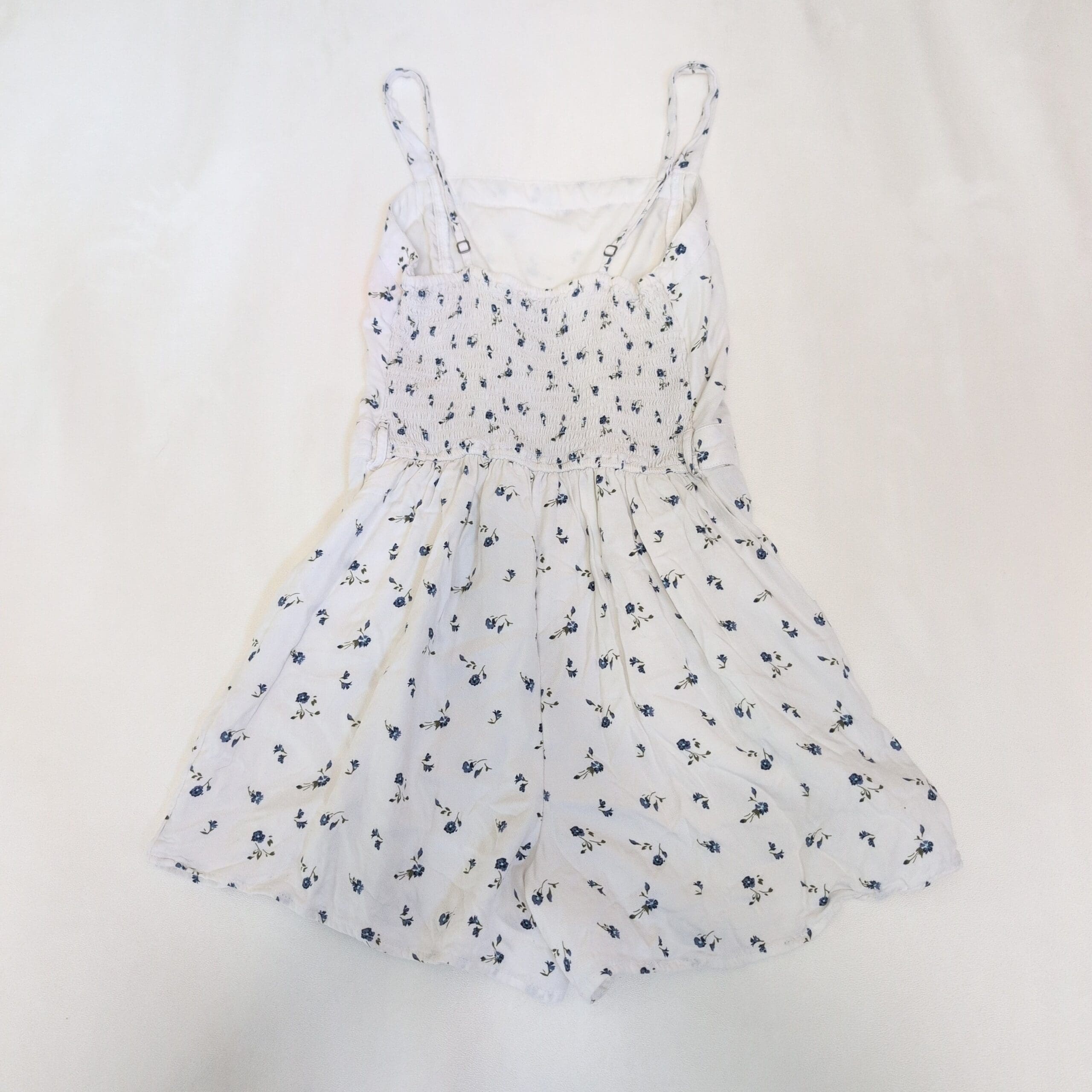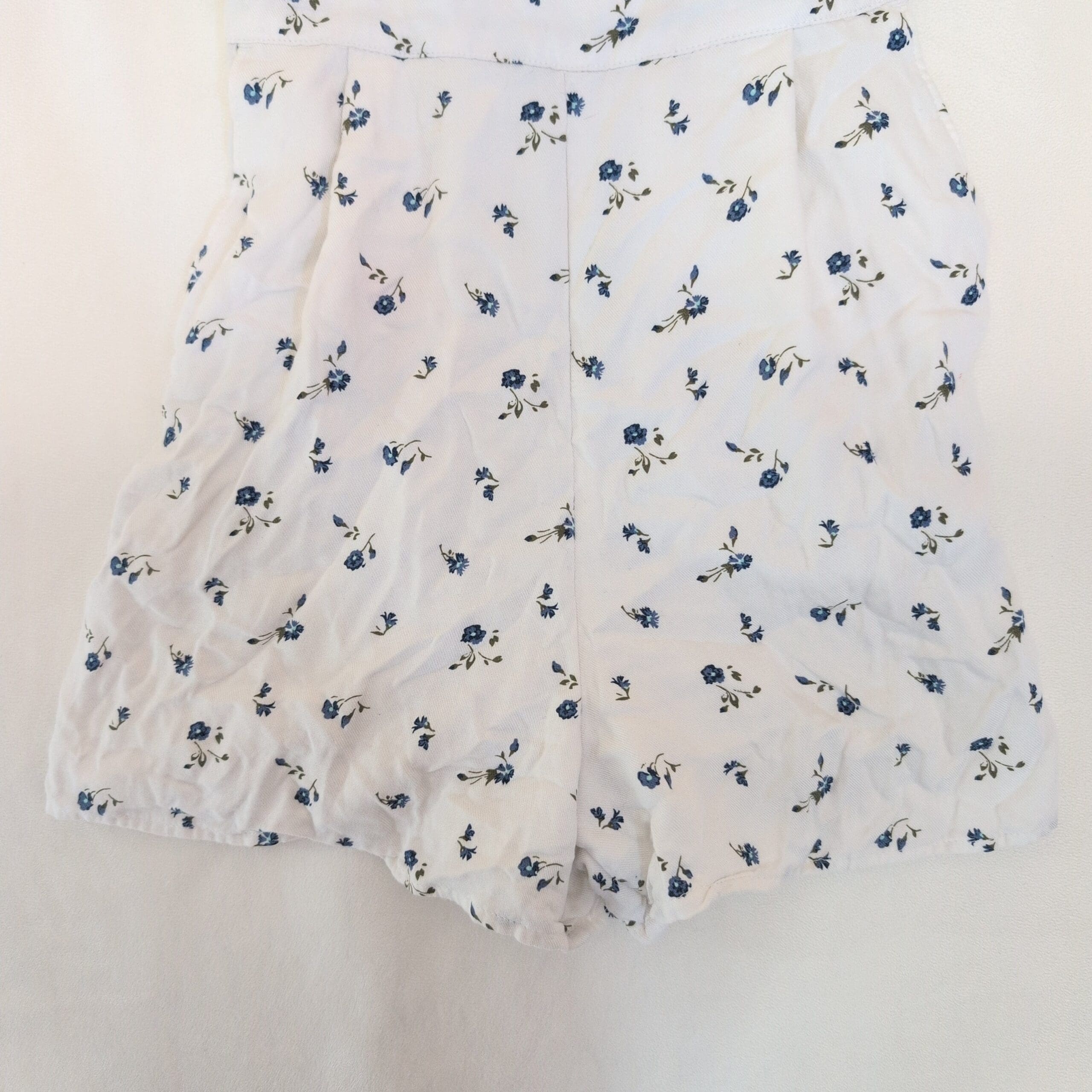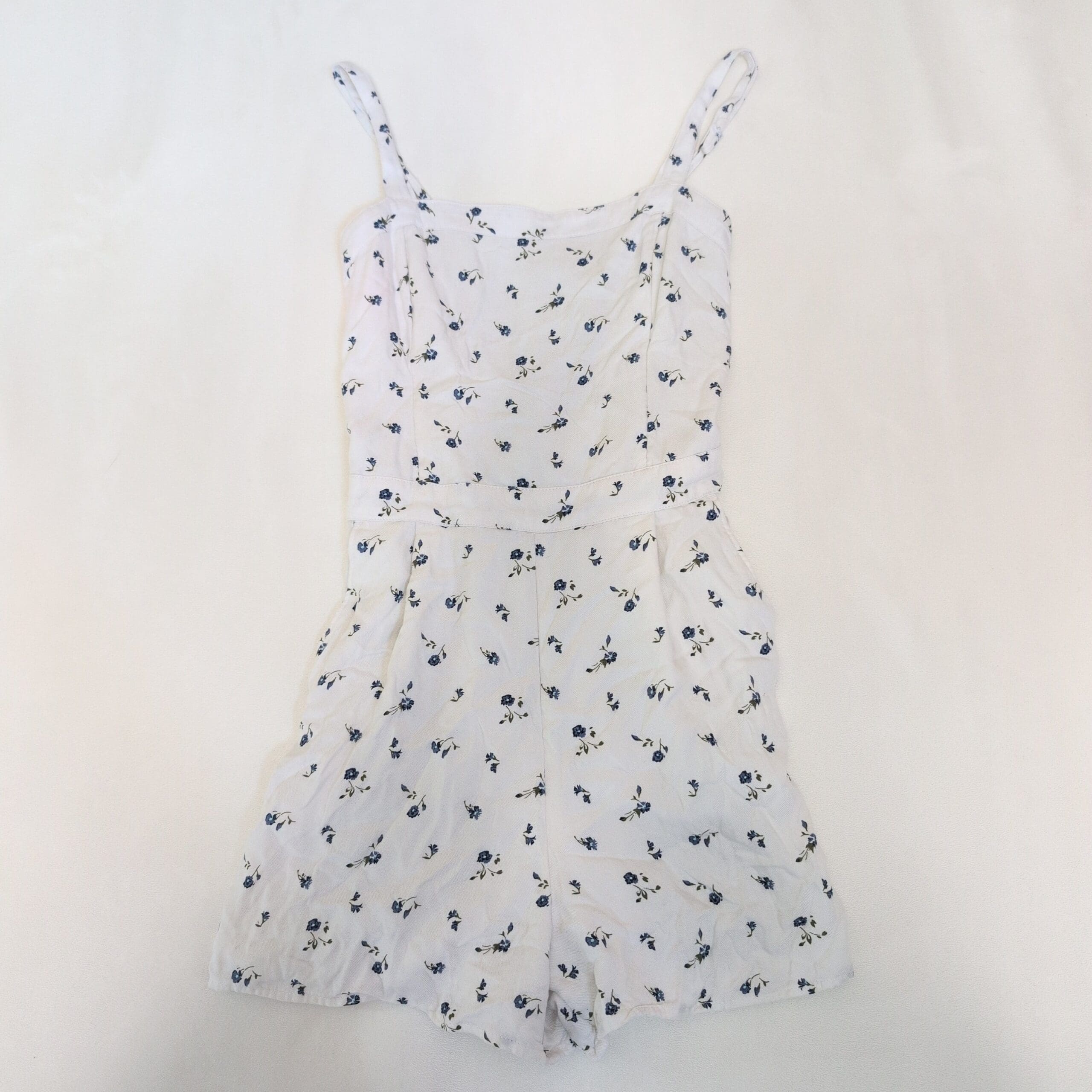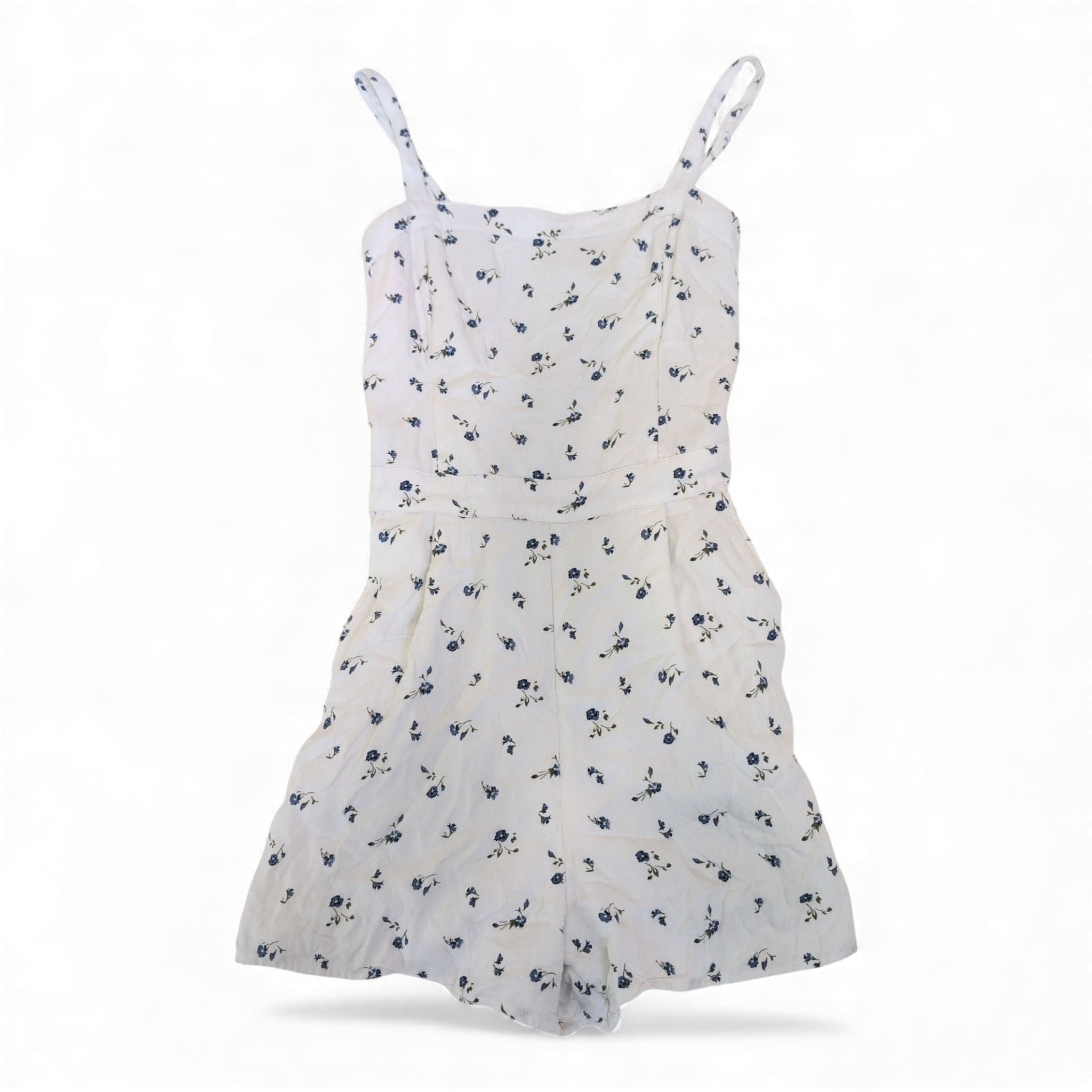 Hollister white floral romper in size XS. Delicate blue floral print on a lightweight white fabric, featuring thin spaghetti straps, a fitted bodice, and a slightly flared short-length bottom for an easy summer silhouette. Perfect for casual days, beach outings, or layered looks. Pre-owned in great condition — please review photos for details.