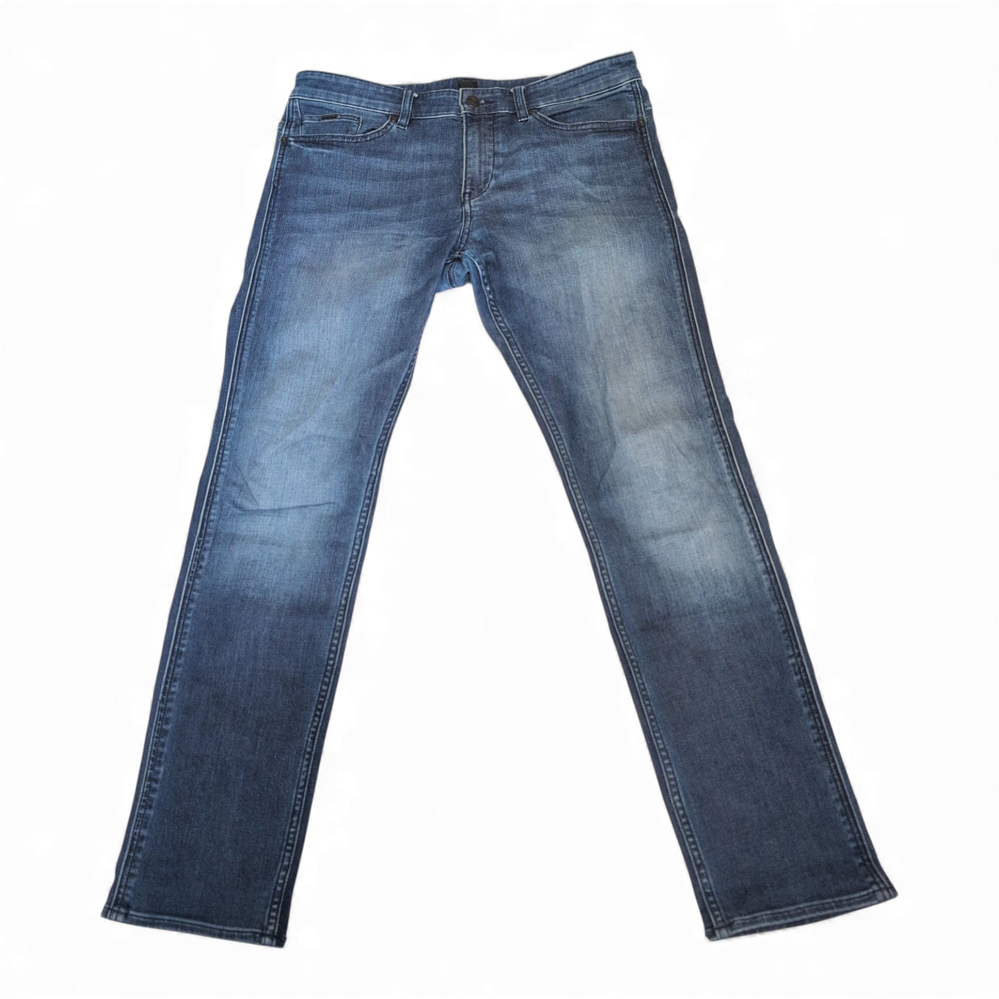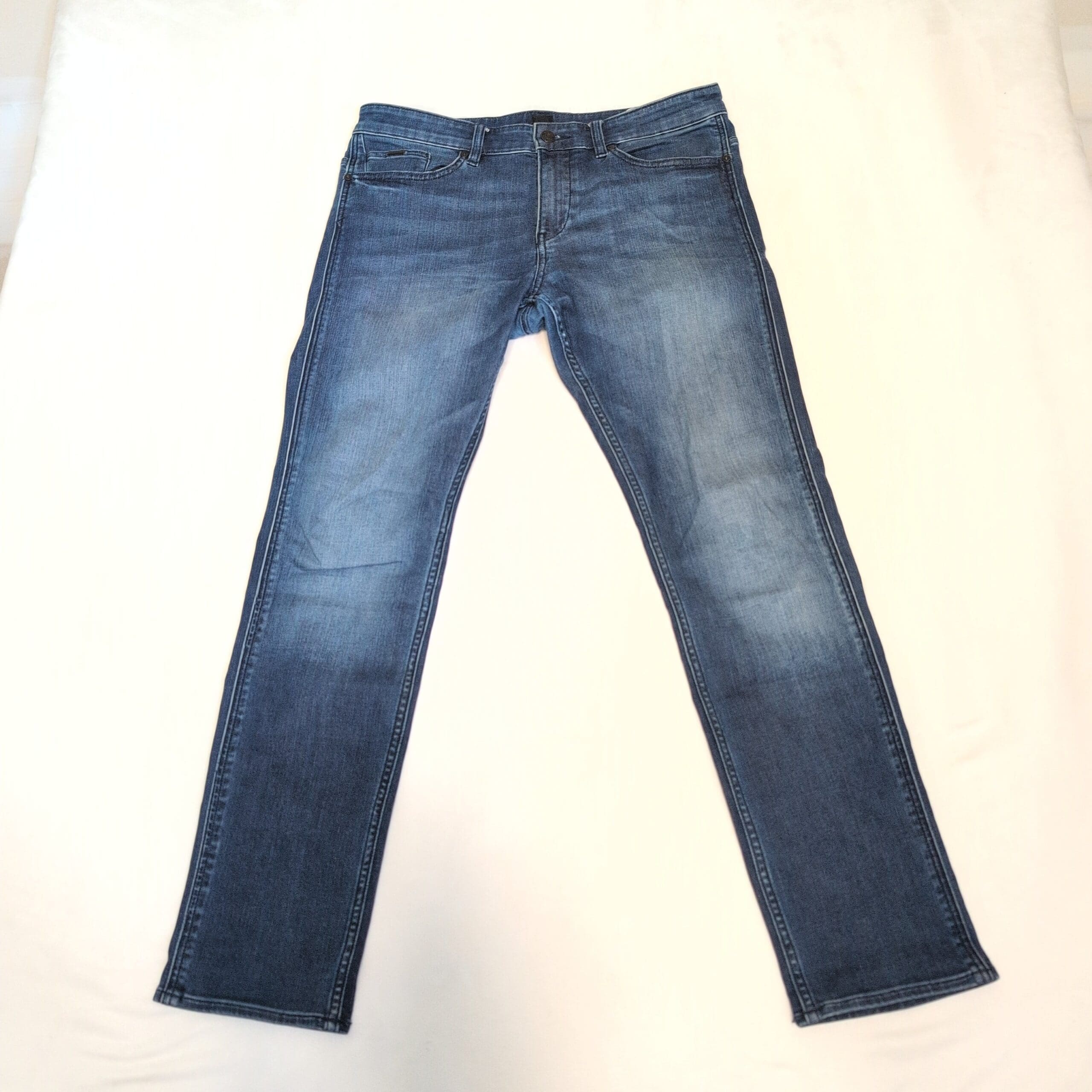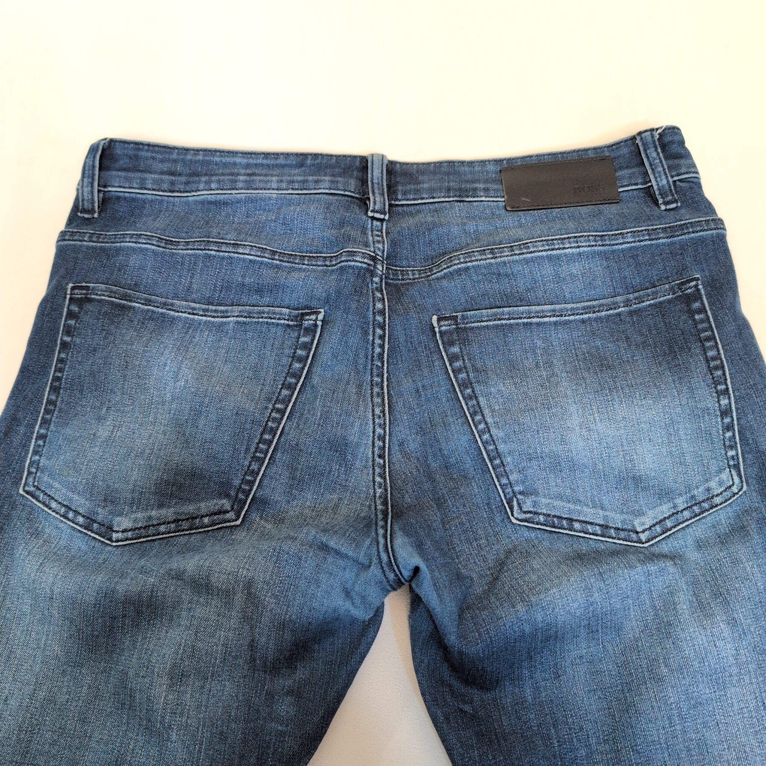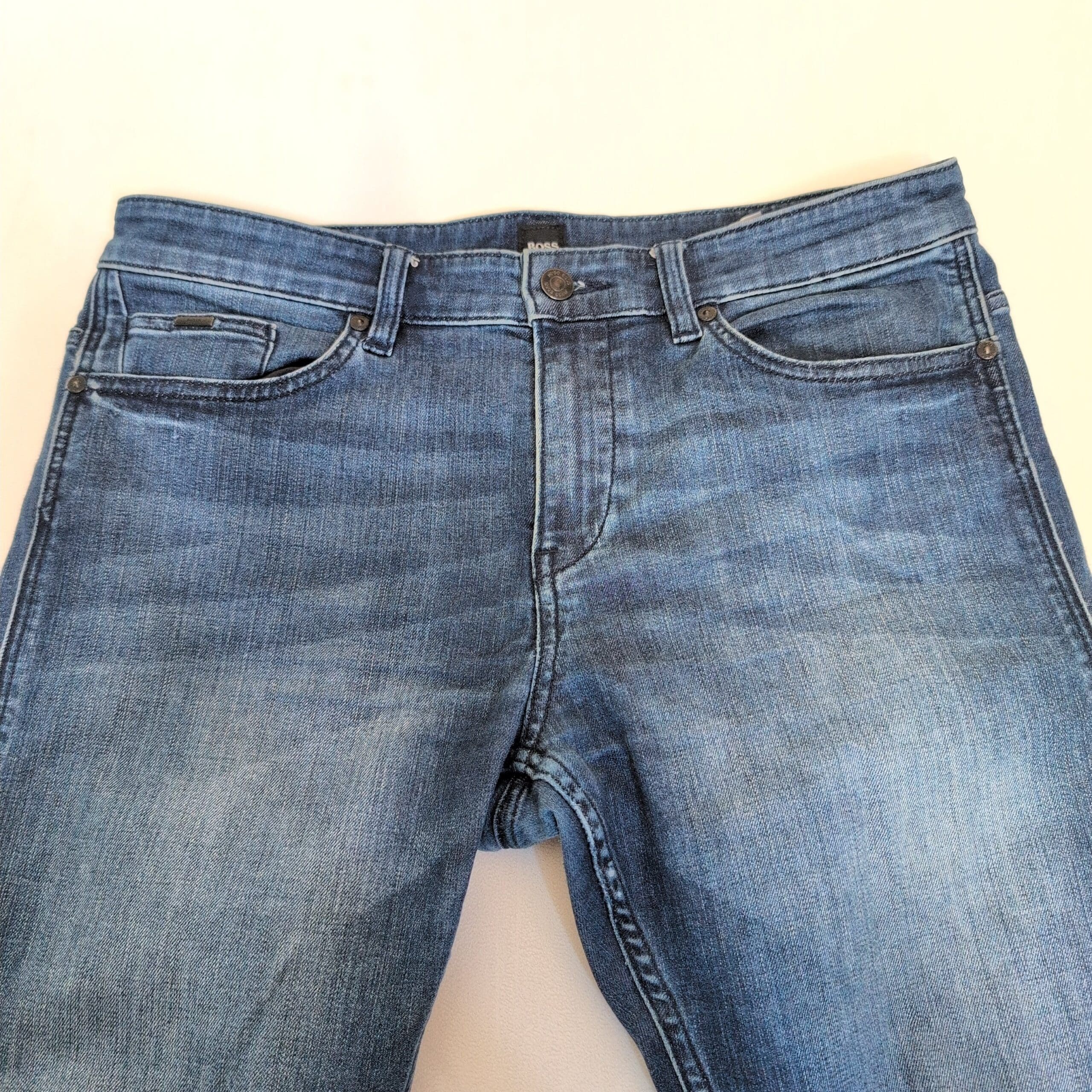 Authentic Hugo Boss men’s slim-straight jeans in a versatile medium blue wash. Size: Waist 32 (standard). Slim through the thigh with a straight leg for a modern, tailored silhouette that works well for casual and smart-casual outfits. Classic five-pocket styling with subtle faded detailing and soft whiskering for a lived-in look. Gently worn with light fading consistent with normal use.