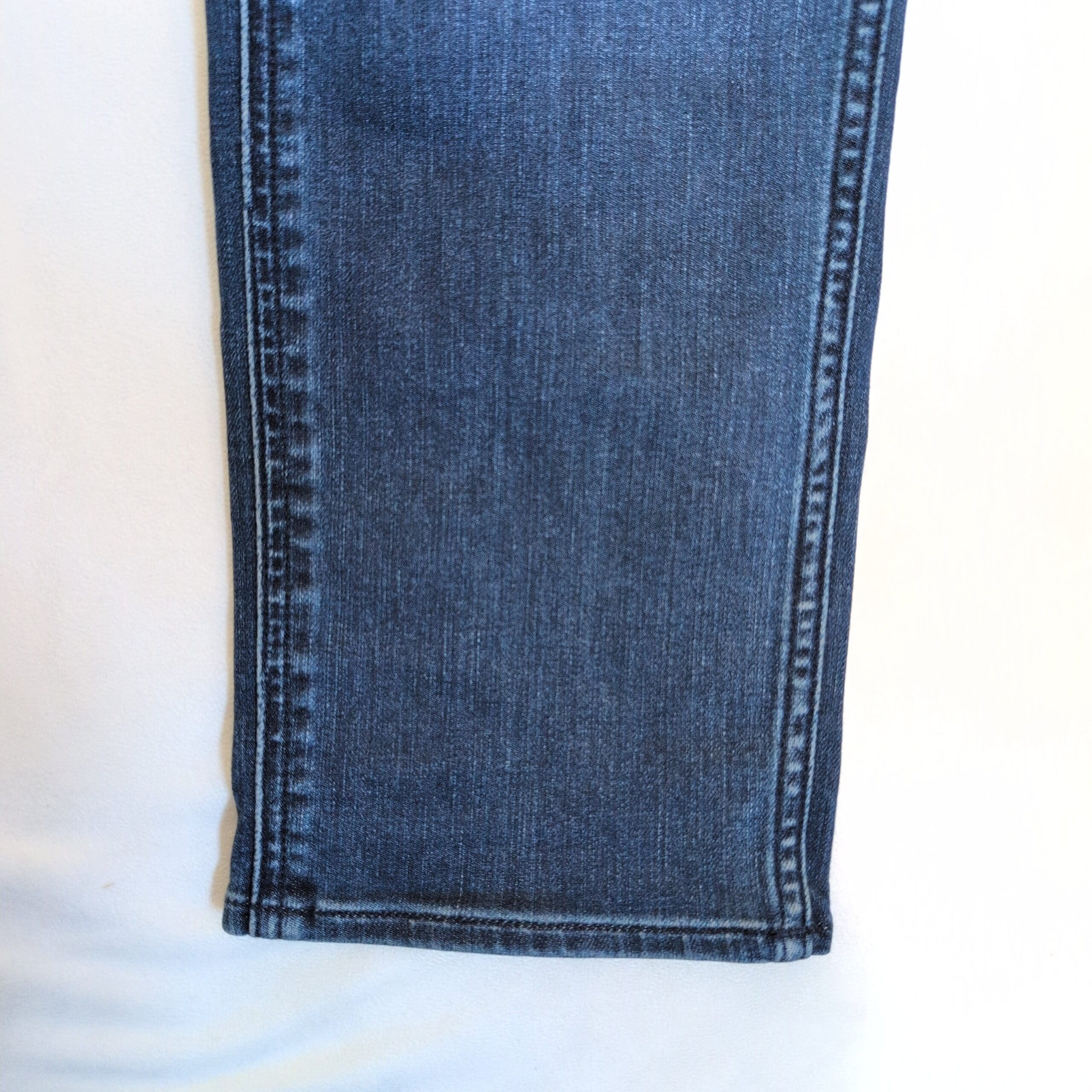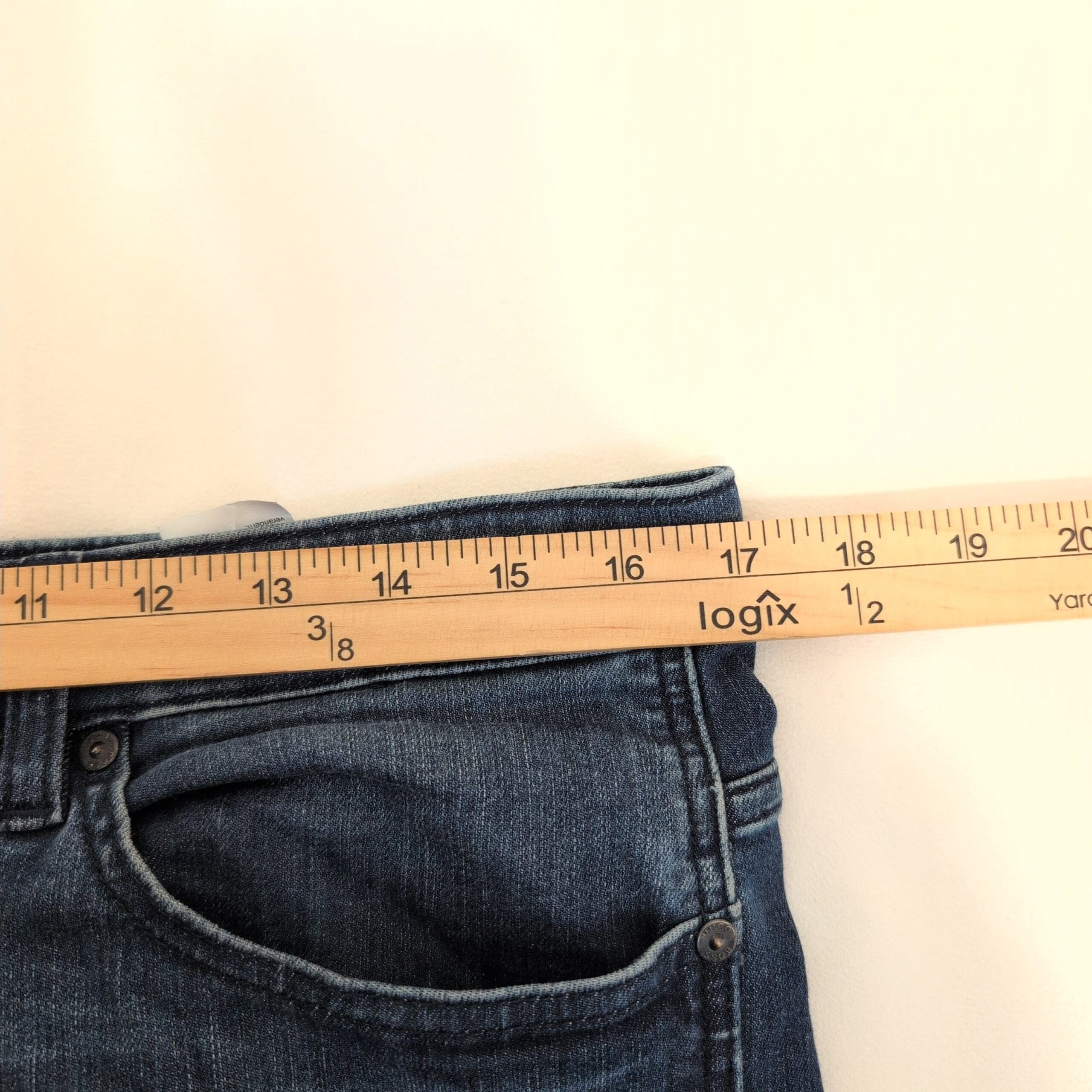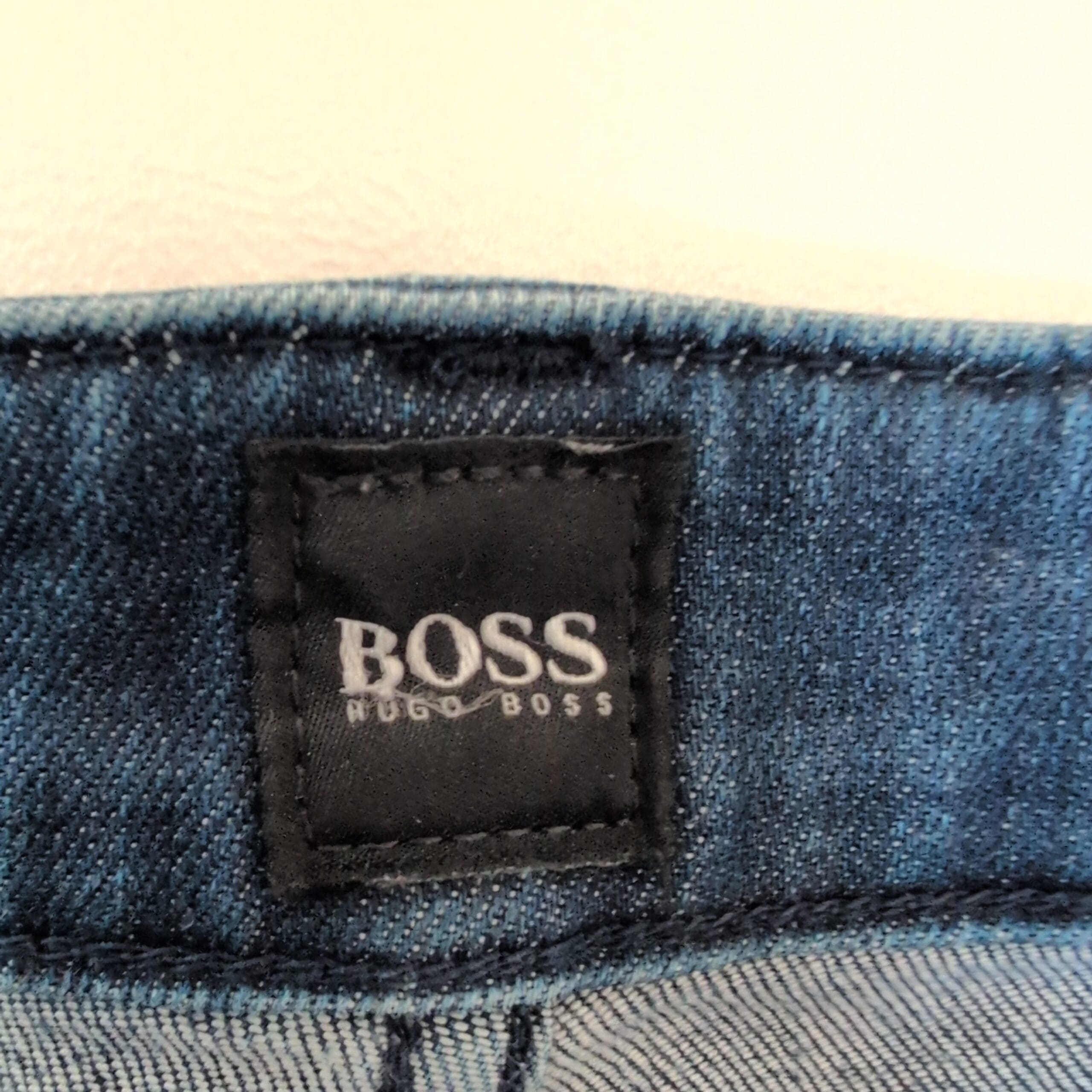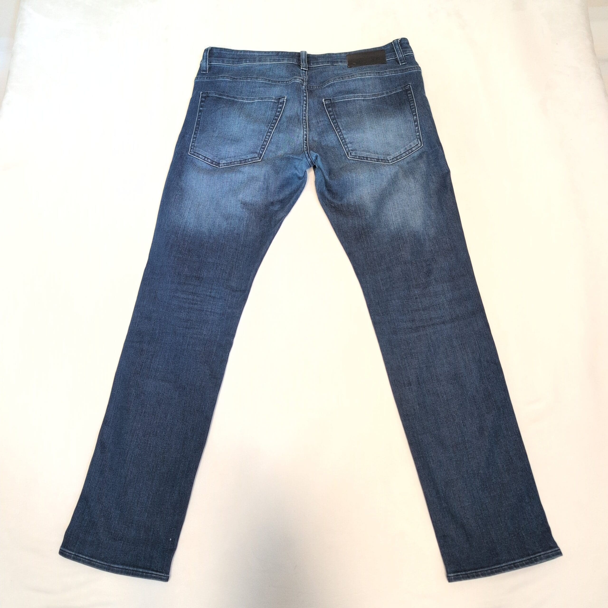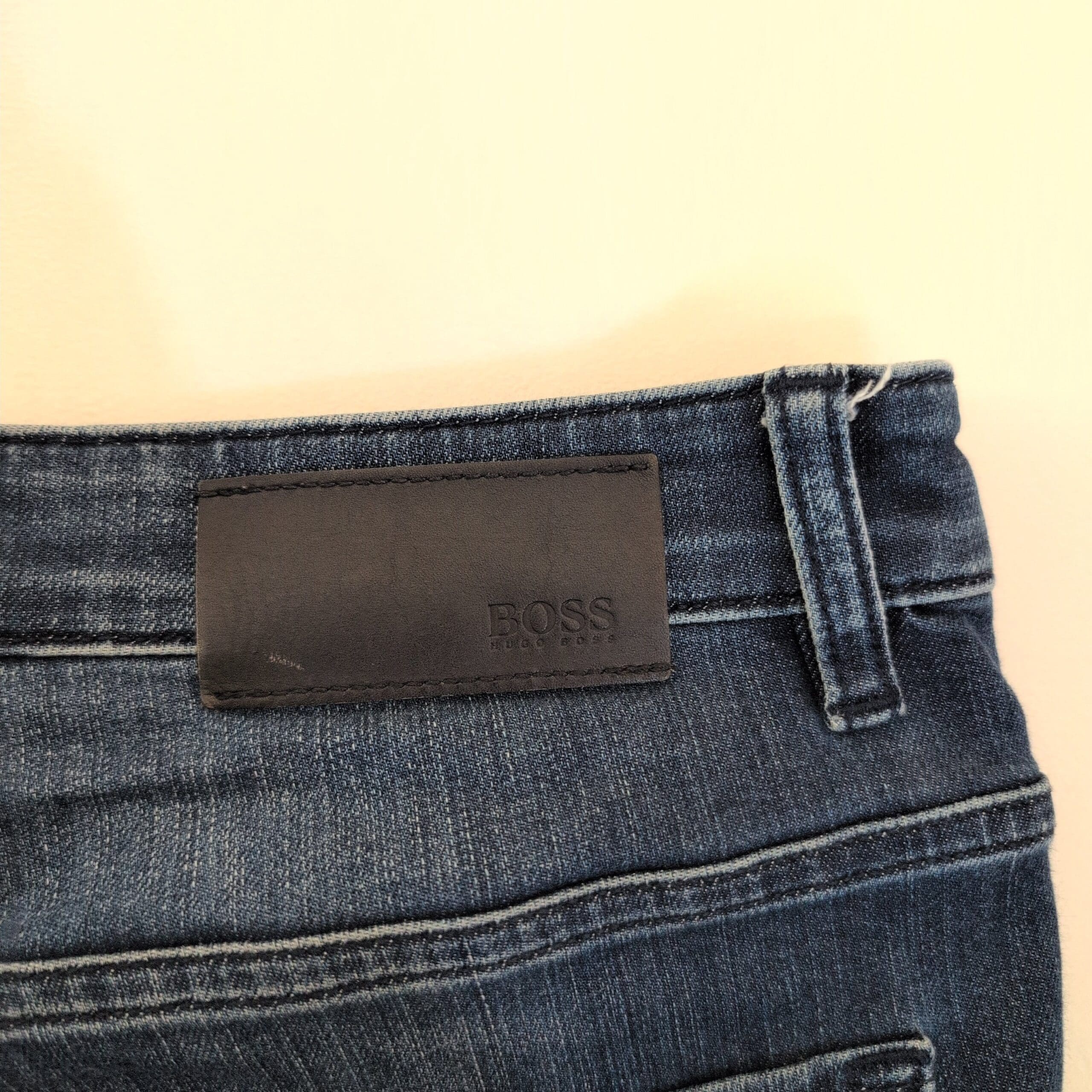 Authentic Hugo Boss men’s slim-straight jeans in a versatile medium blue wash. Size: Waist 32 (standard). Slim through the thigh with a straight leg for a modern, tailored silhouette that works well for casual and smart-casual outfits. Classic five-pocket styling with subtle faded detailing and soft whiskering for a lived-in look. Gently worn with light fading consistent with normal use.