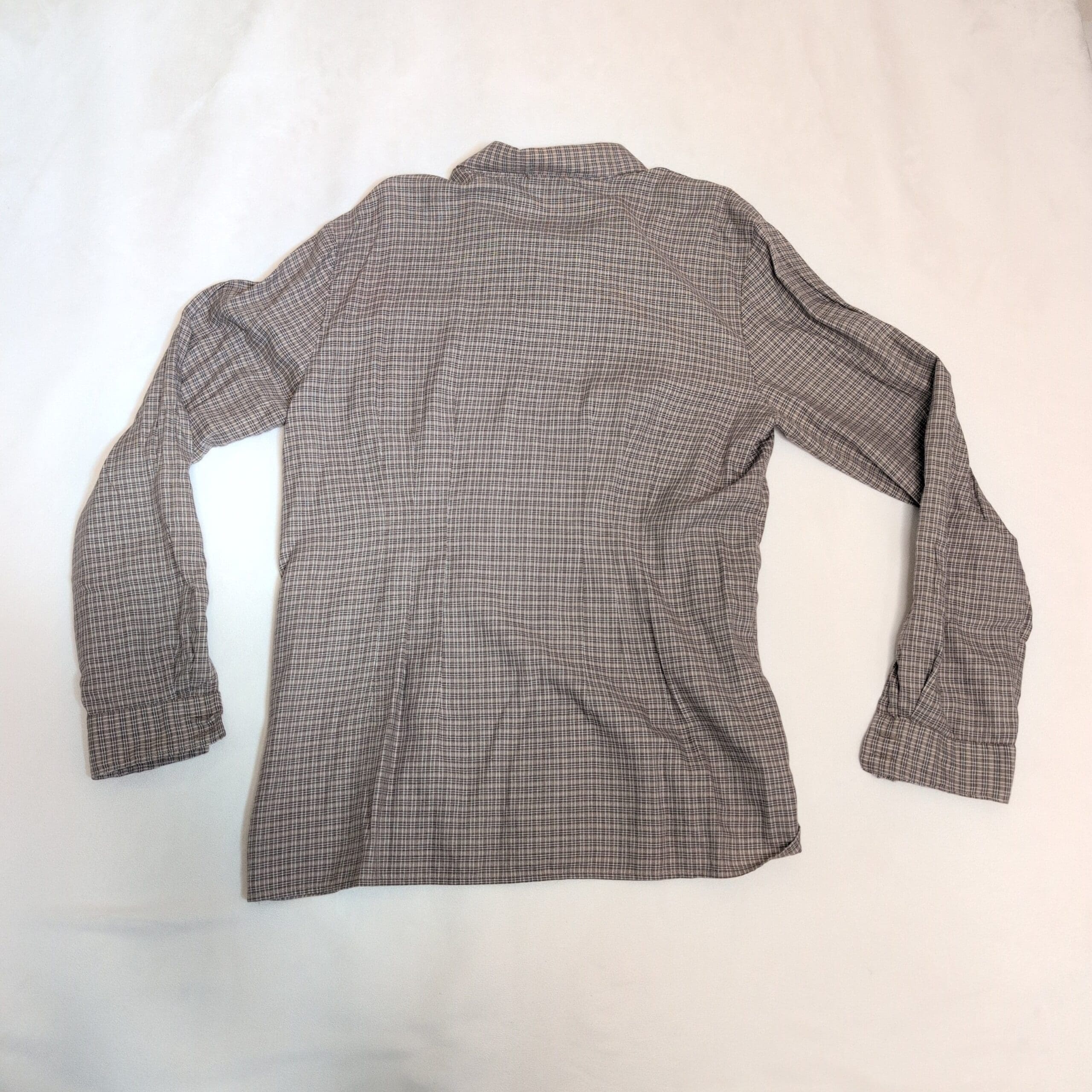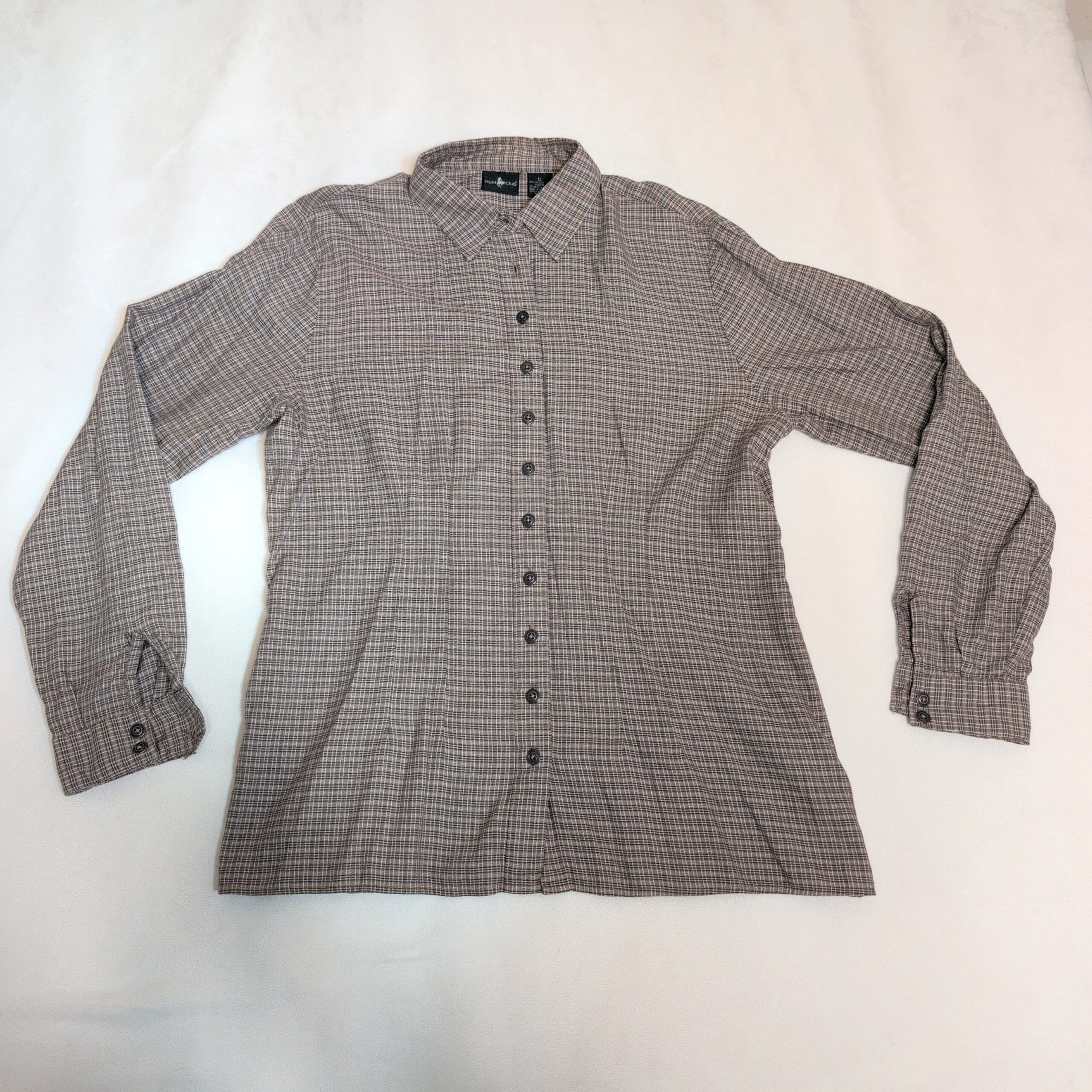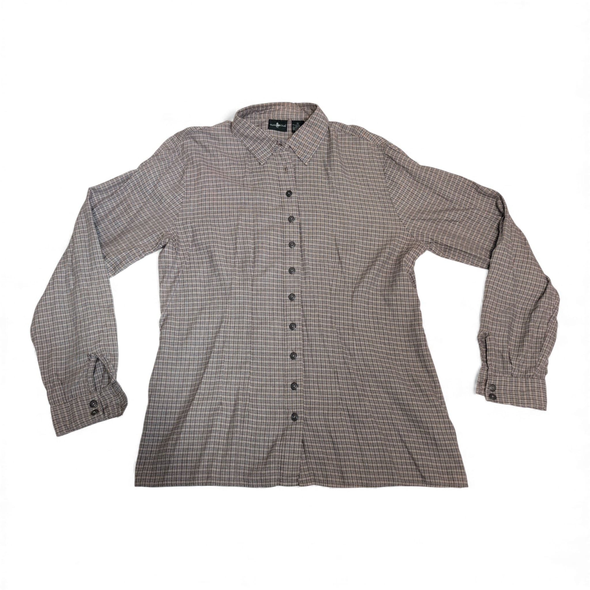 Hunt Club women’s button-down shirt in size 12. Brown plaid/check pattern with a classic collar, full button front, and button cuffs. Long sleeves and a relaxed silhouette make it versatile for office layering or casual weekends. Fabric content not specified; lightweight woven feel. Gently pre-owned—please review photos for condition details.