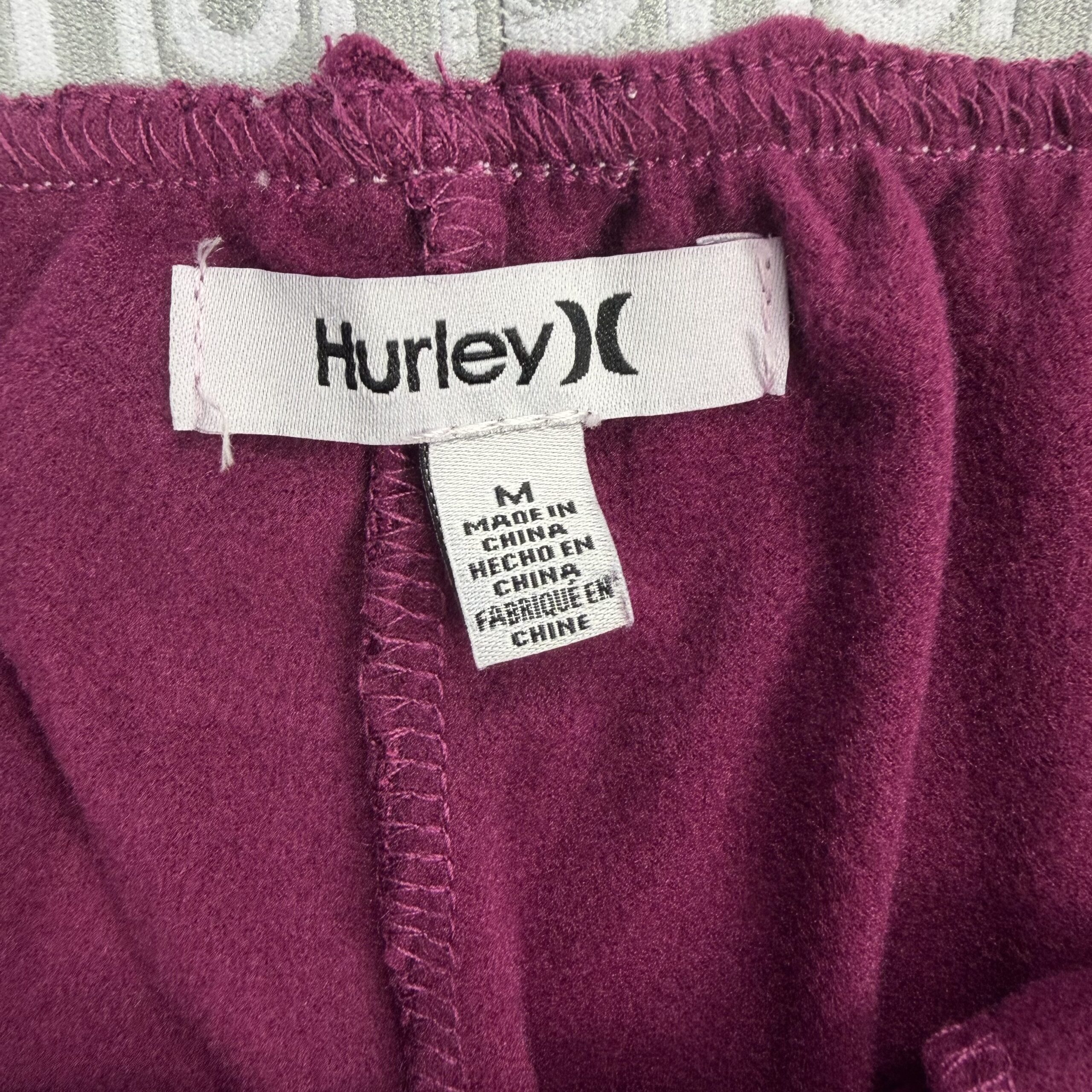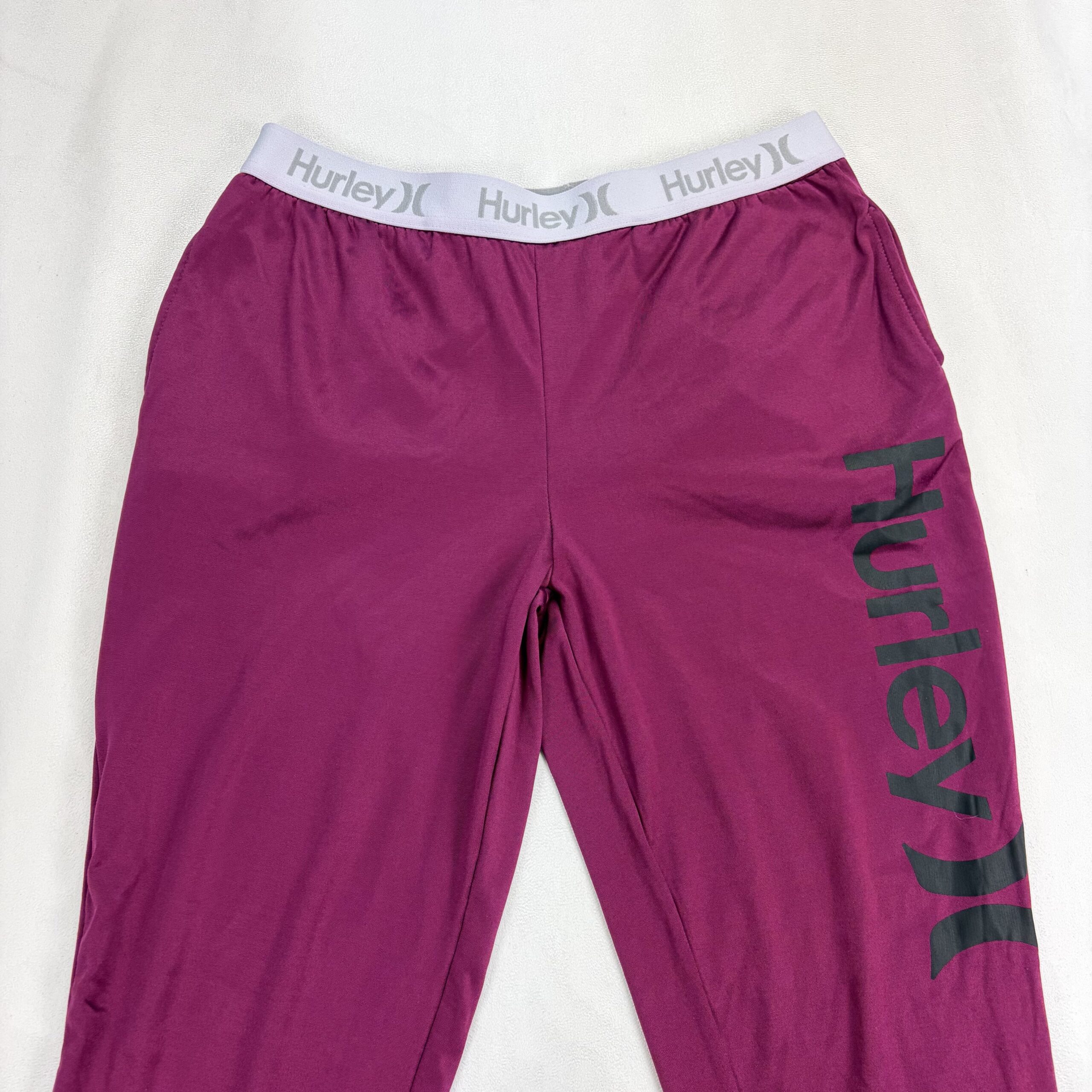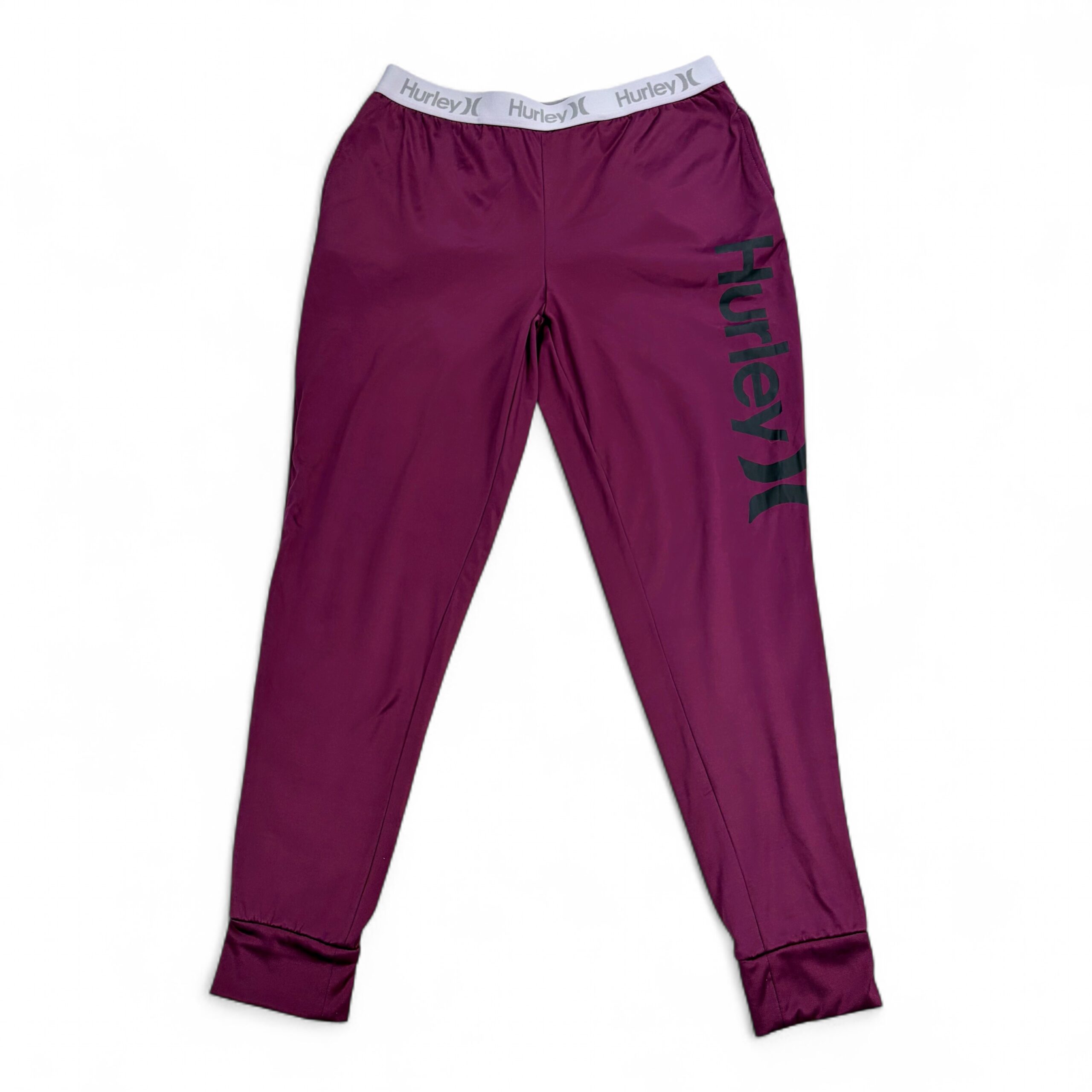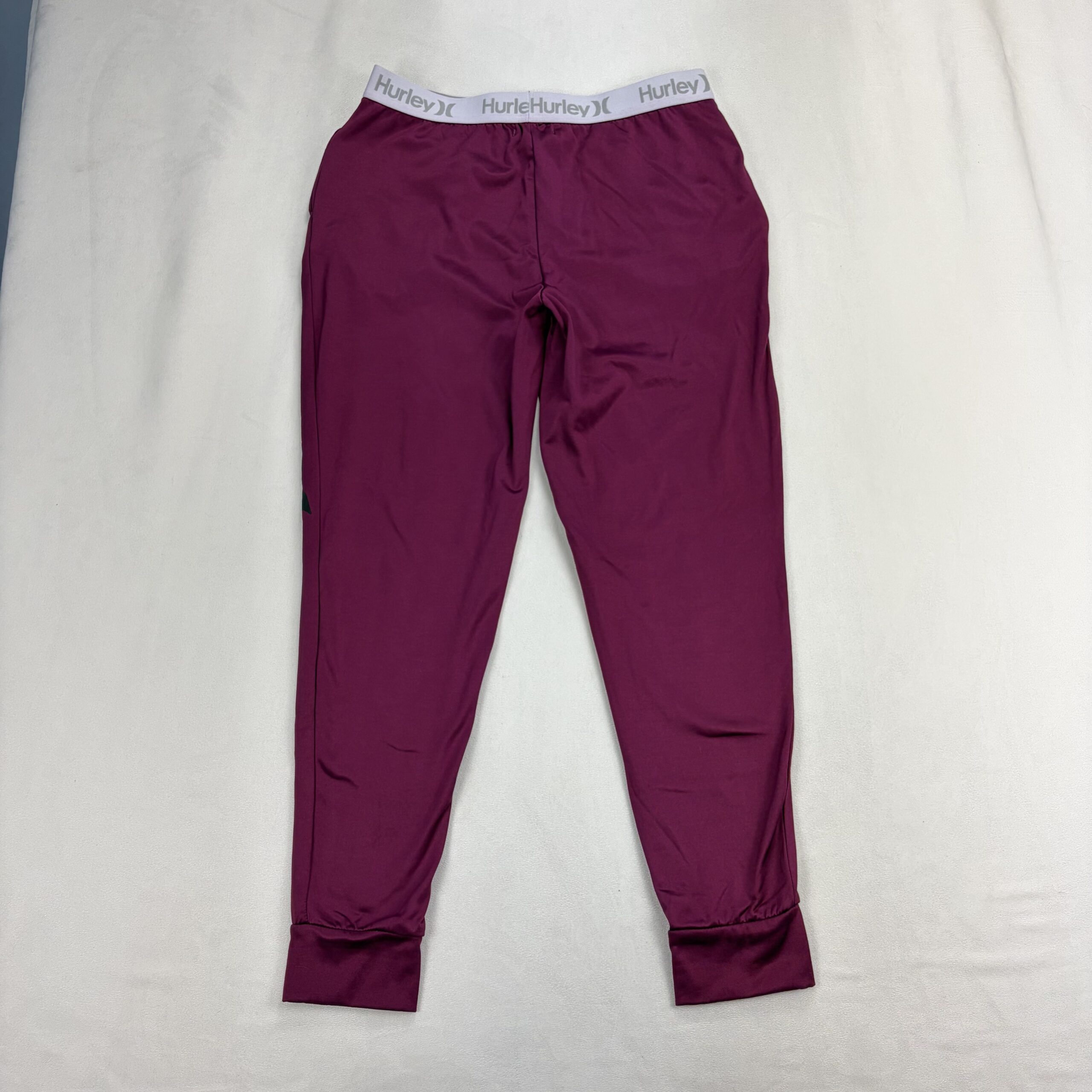 Deep plum Hurley women’s joggers in size M. Lightweight, stretchy athletic track pants with a soft elastic Hurley-branded waistband and cuffed ankles. Features a vertical black Hurley logo on the left leg and a tapered fit for comfortable movement. Great for workouts, running, or everyday loungewear. Excellent used condition — free of major rips, tears, stains, or flaws; shows light, typical wear. See photos for details.