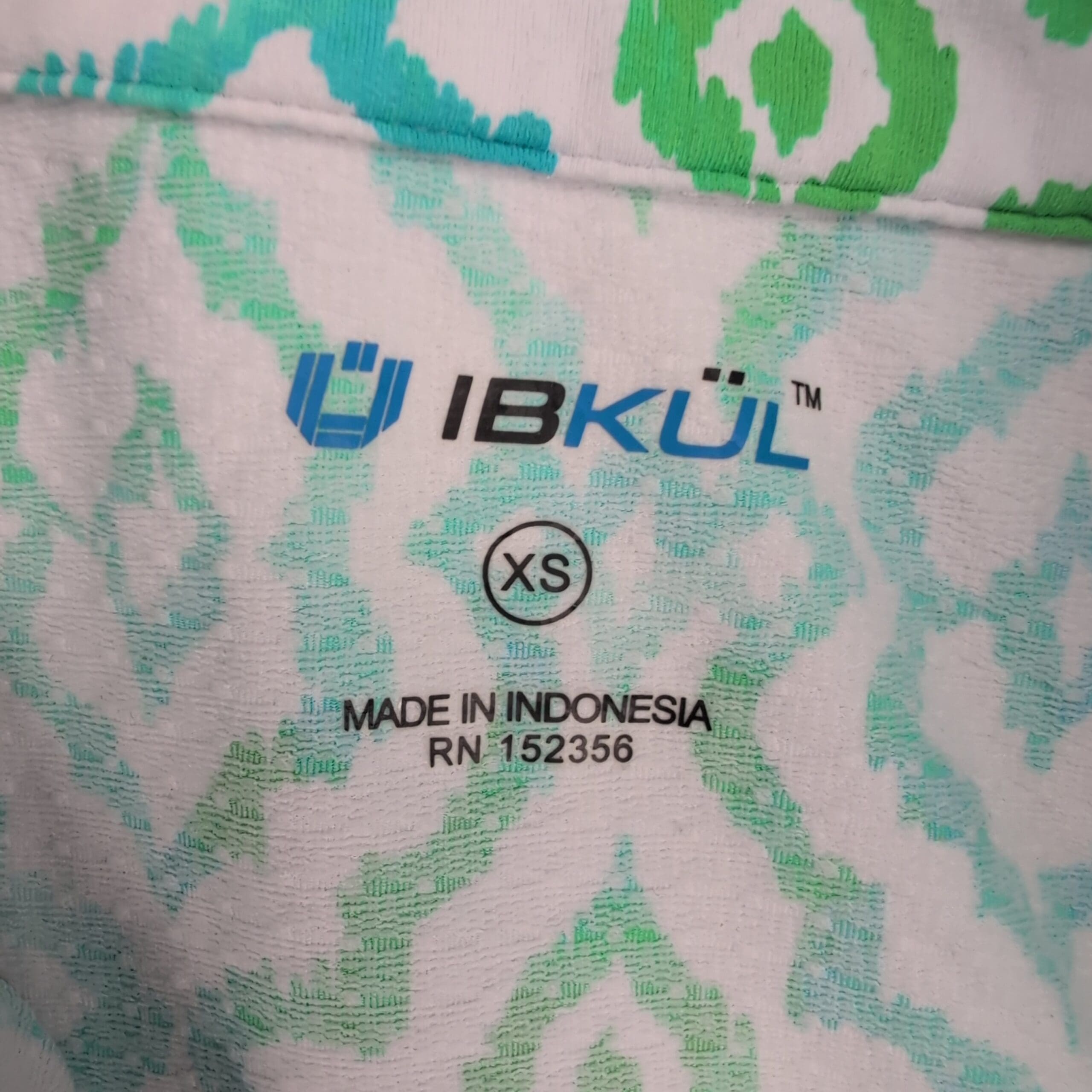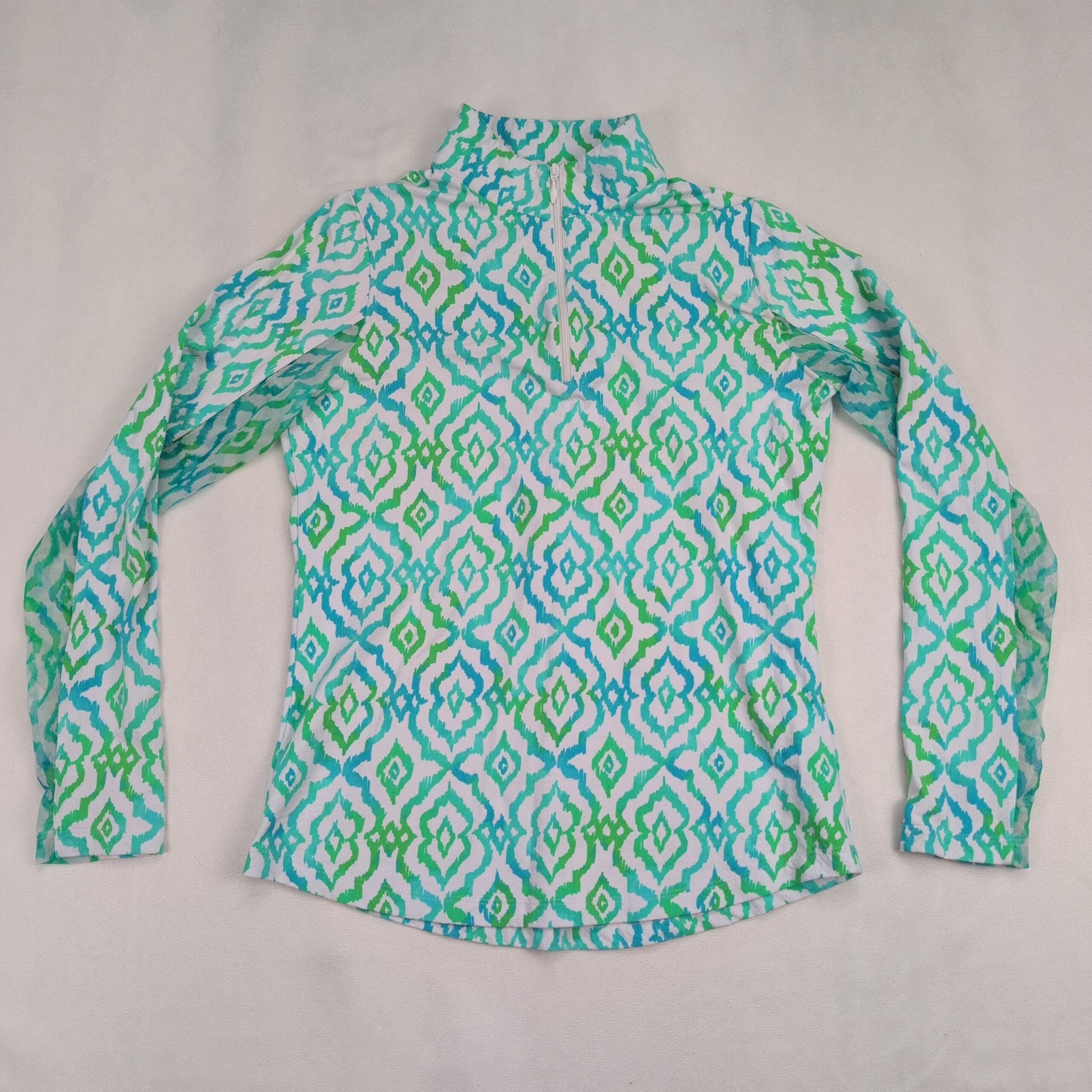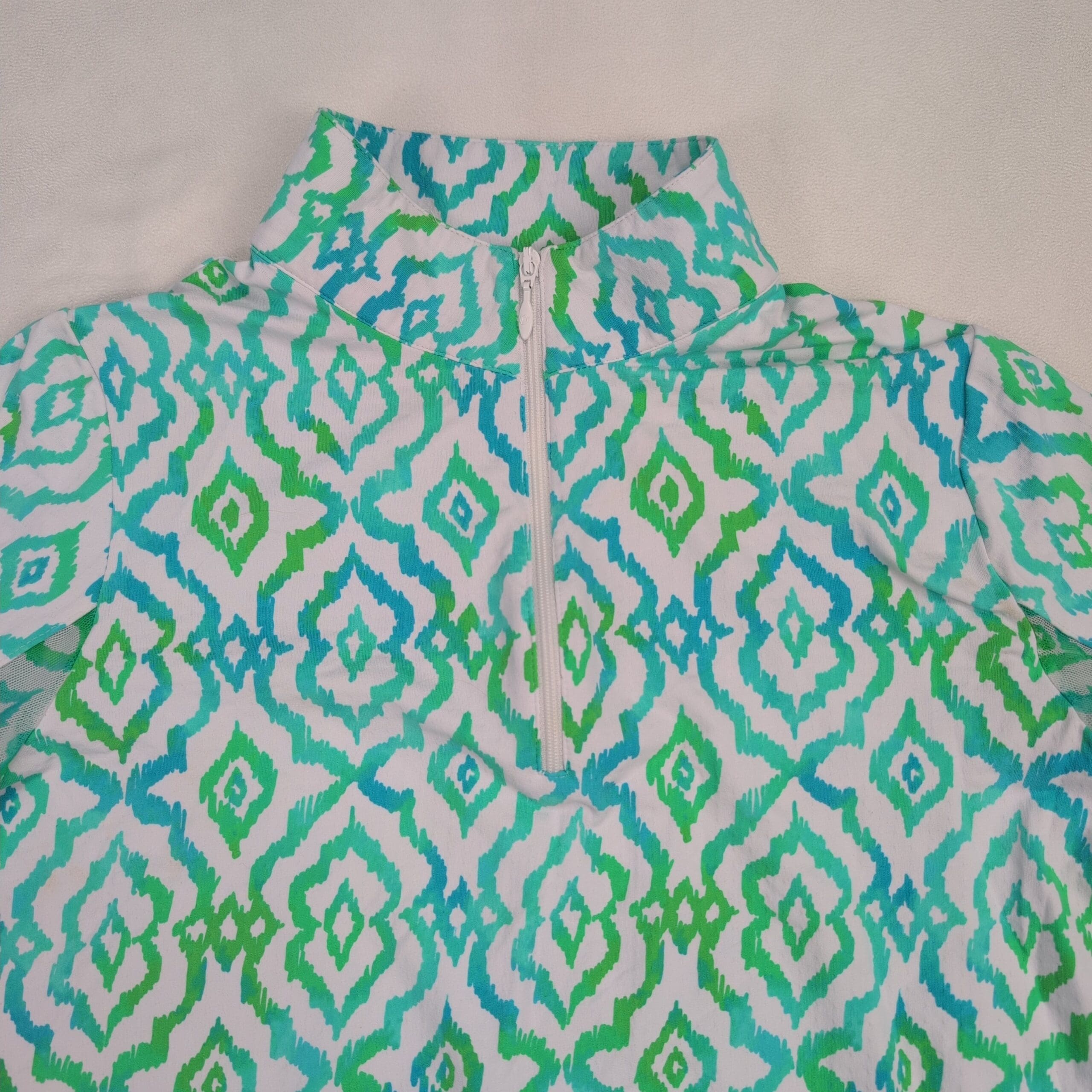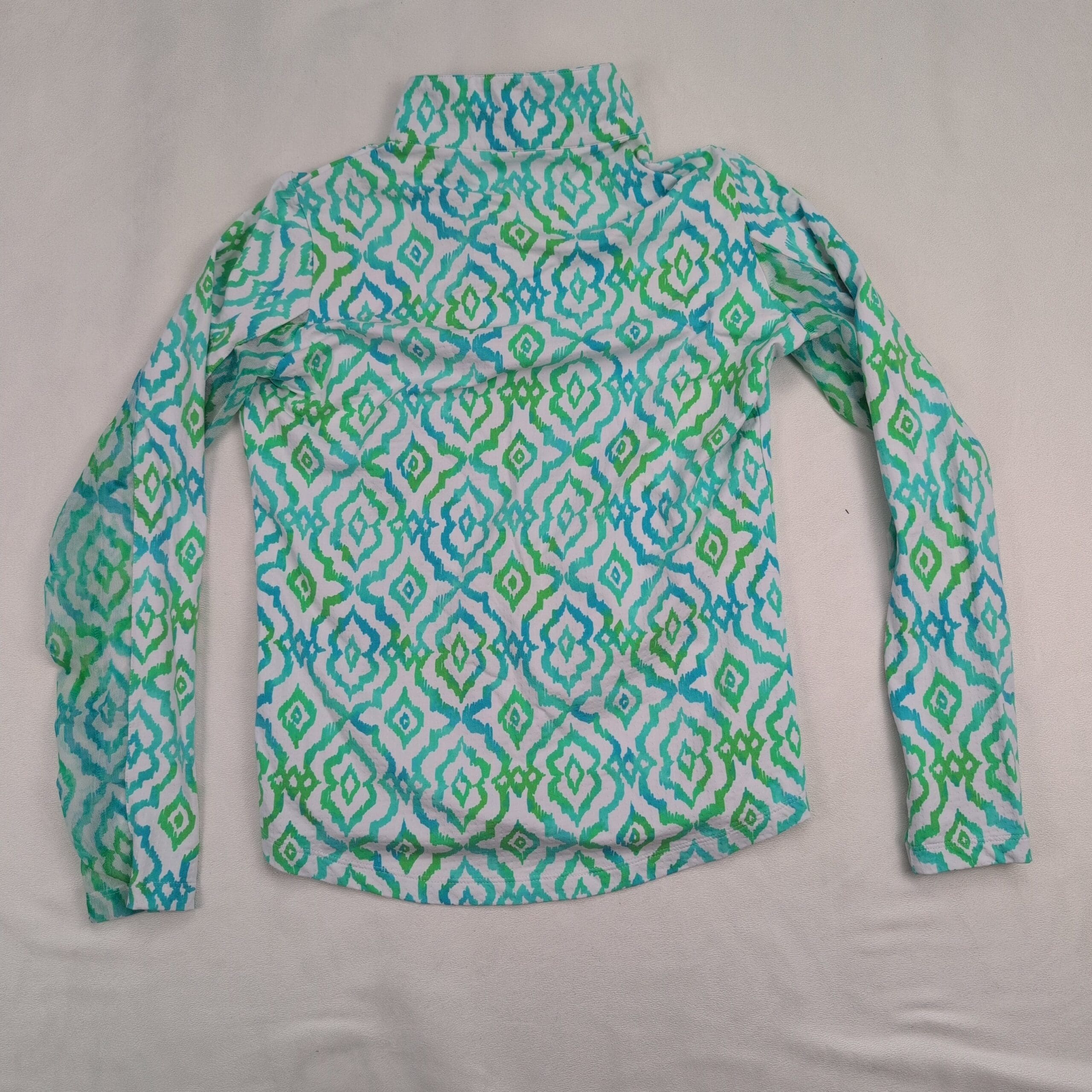 Ibkul long-sleeve athletic quarter-zip top in size XS. Bright aqua, teal and lime ikat-style print on a white background. Lightweight, stretchy performance fabric with a mock neck and functional quarter zipper for easy layering. Slim, athletic cut designed for active pursuits — great for golf, tennis, or everyday workouts. Excellent used condition; free of major rips, tears, stains, or flaws. Typical light wear consistent with gentle use may be present.