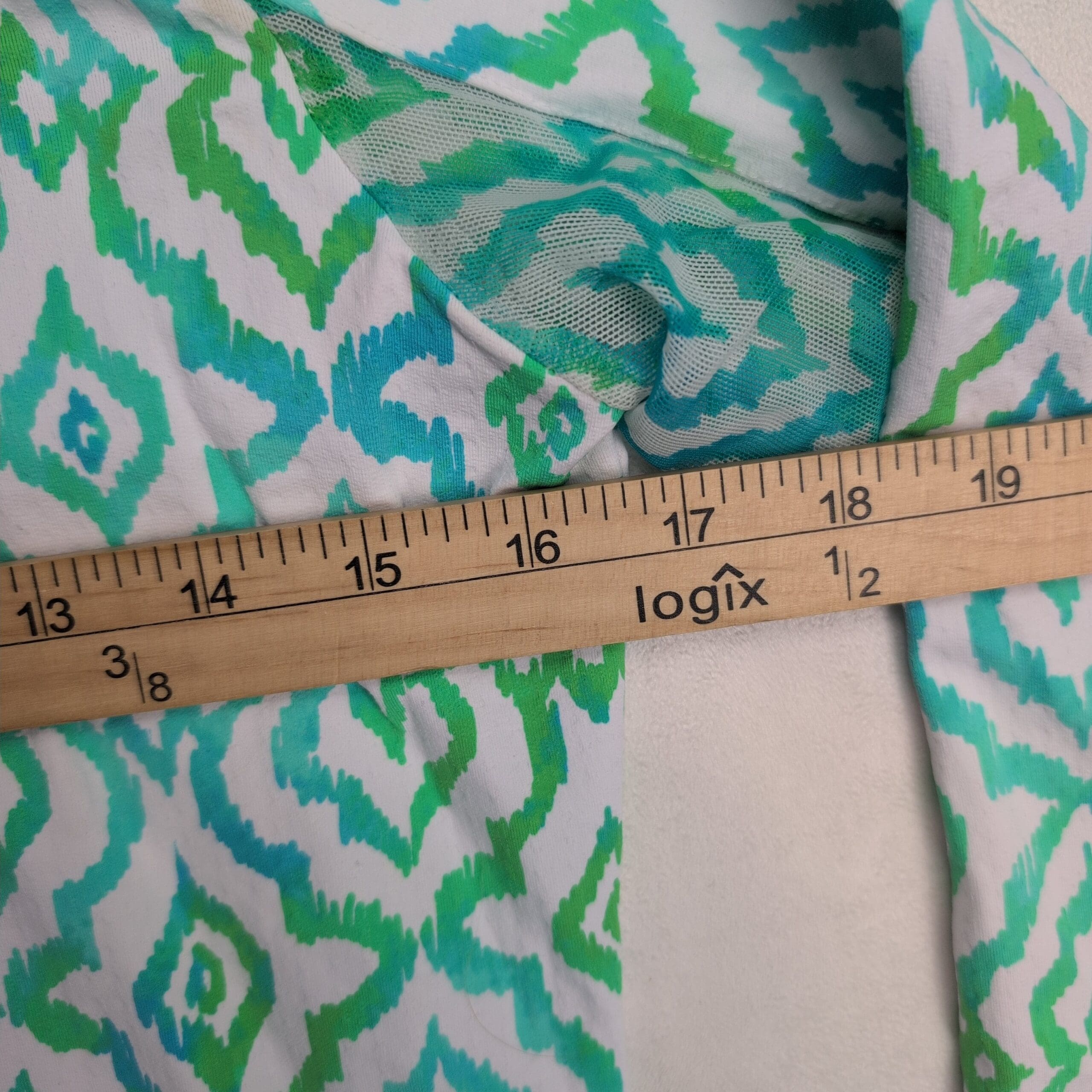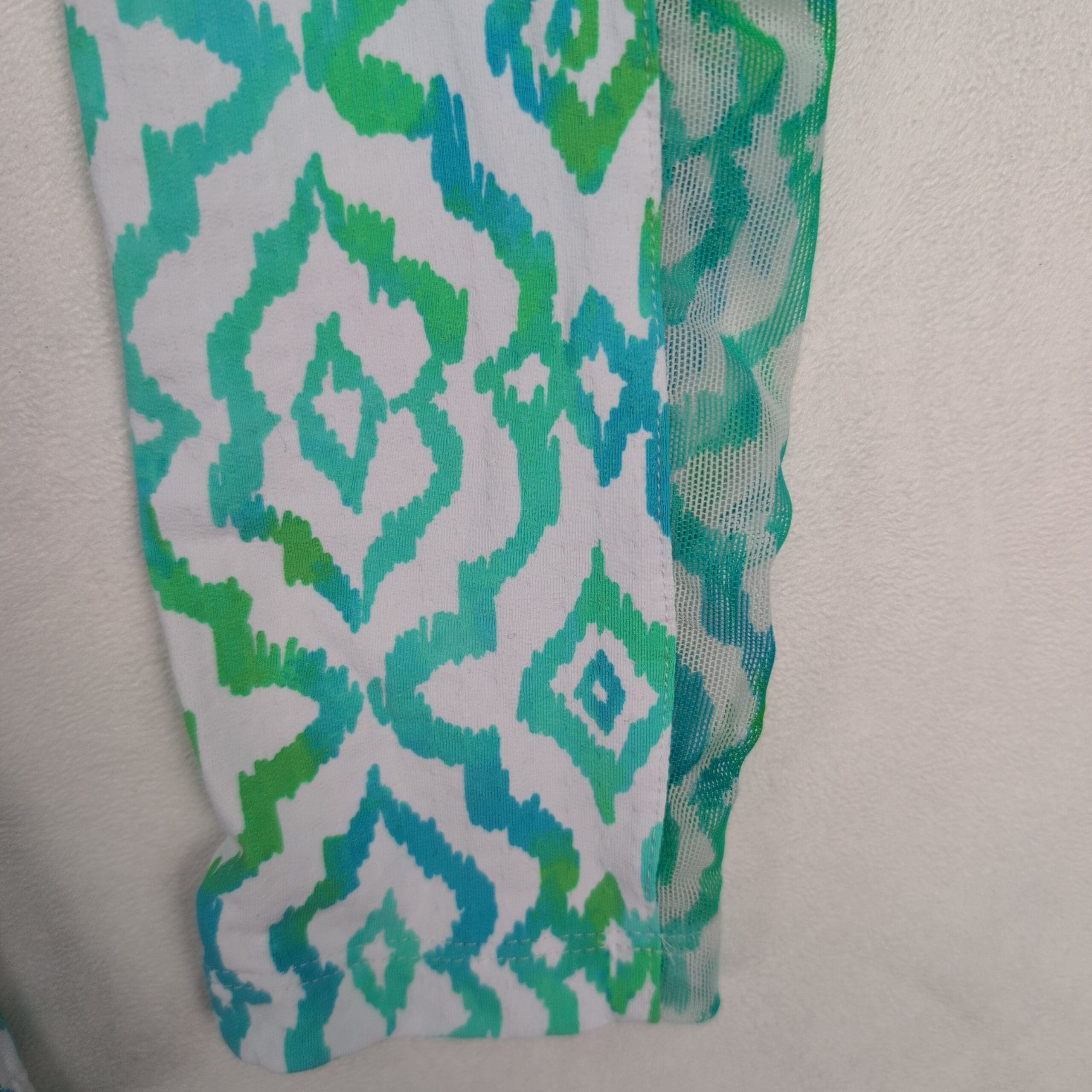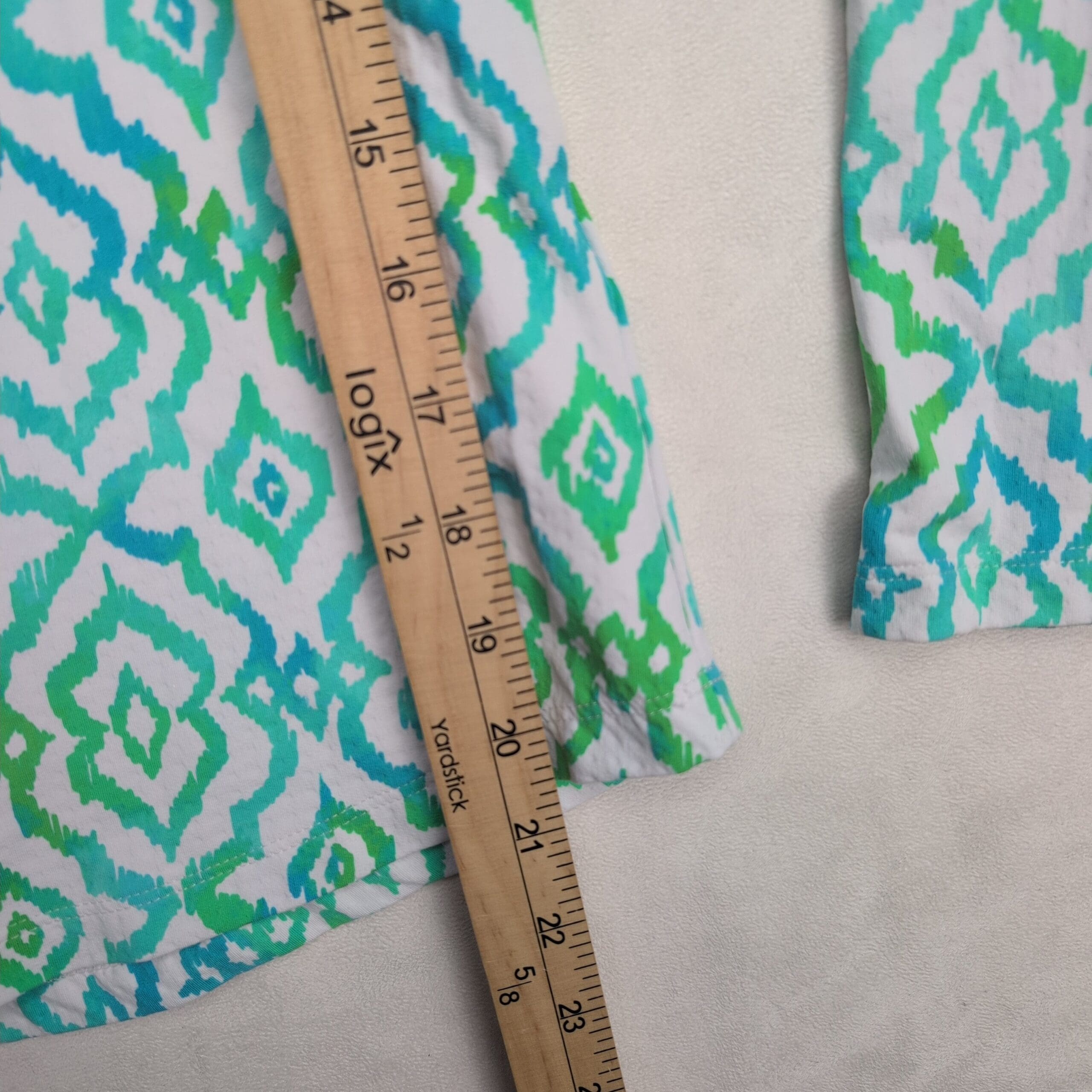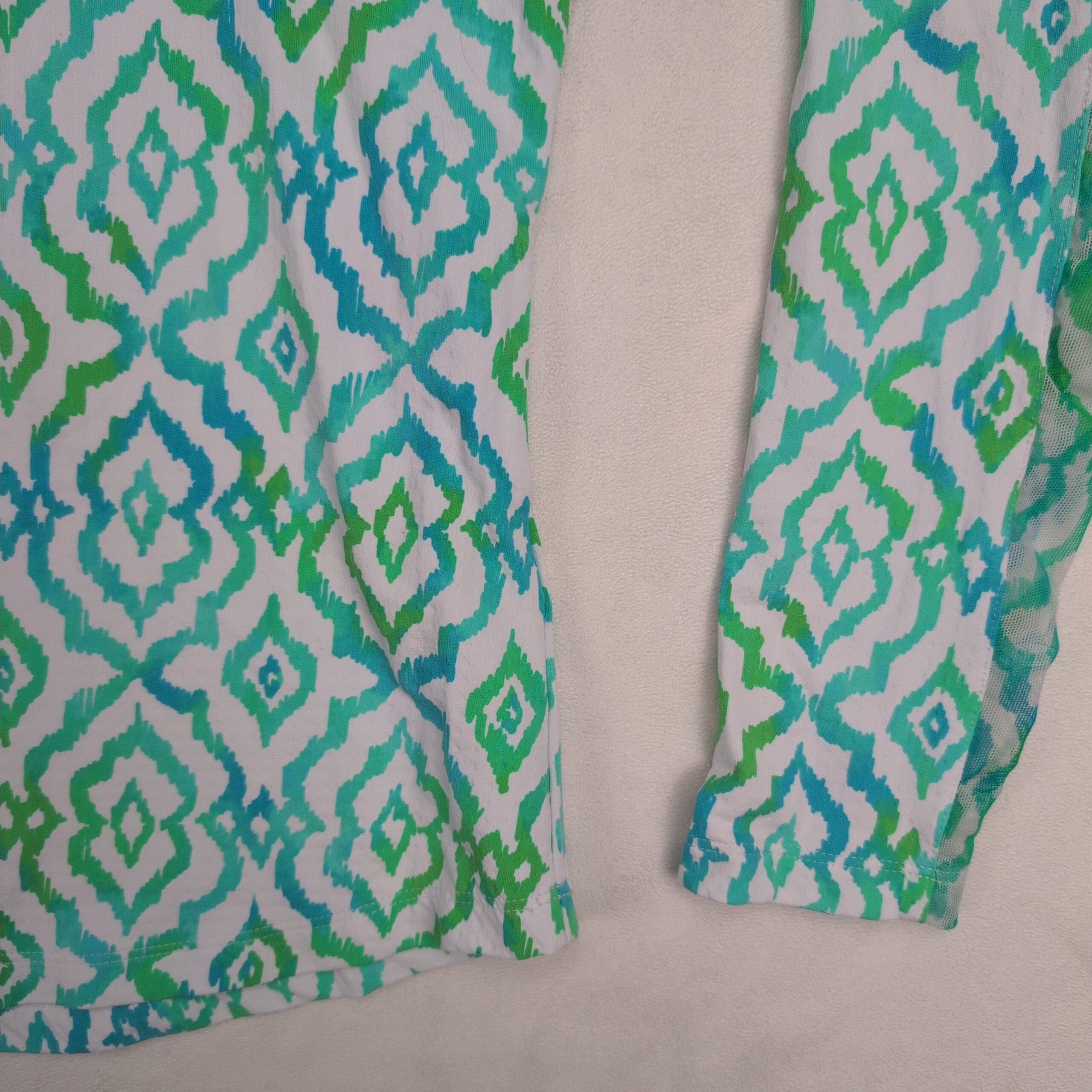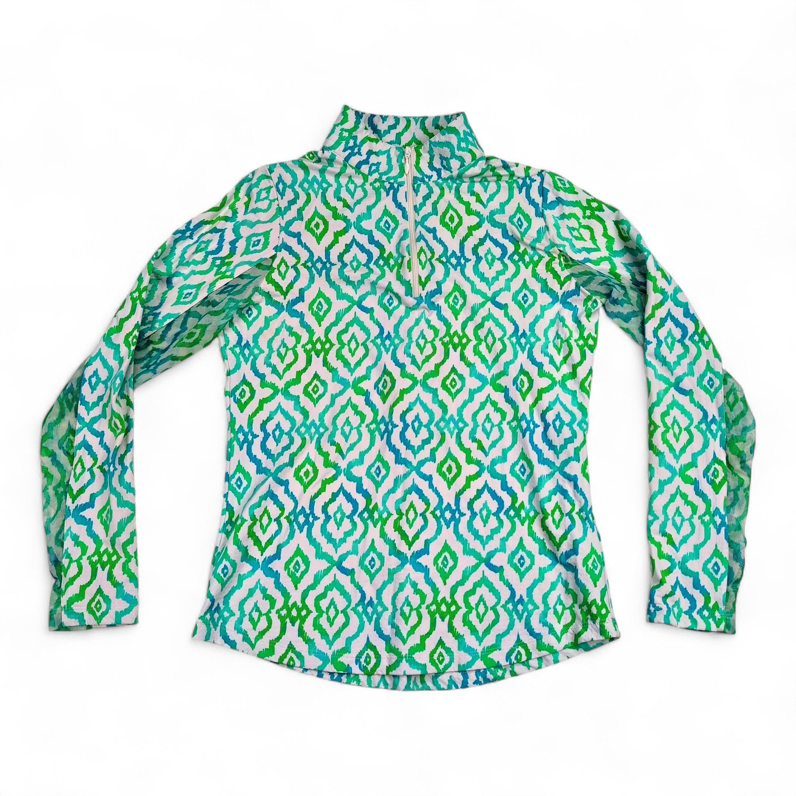 Ibkul long-sleeve athletic quarter-zip top in size XS. Bright aqua, teal and lime ikat-style print on a white background. Lightweight, stretchy performance fabric with a mock neck and functional quarter zipper for easy layering. Slim, athletic cut designed for active pursuits — great for golf, tennis, or everyday workouts. Excellent used condition; free of major rips, tears, stains, or flaws. Typical light wear consistent with gentle use may be present.