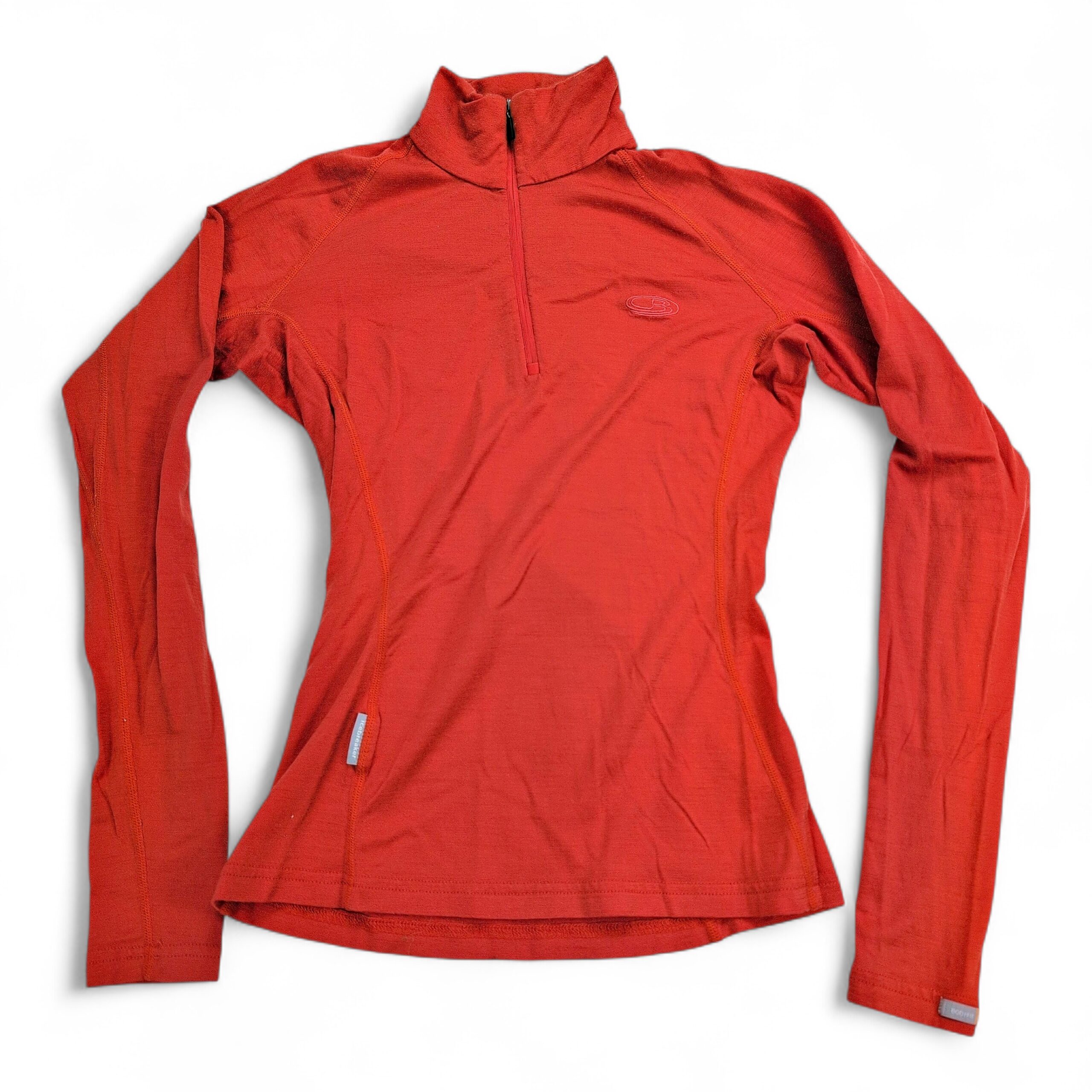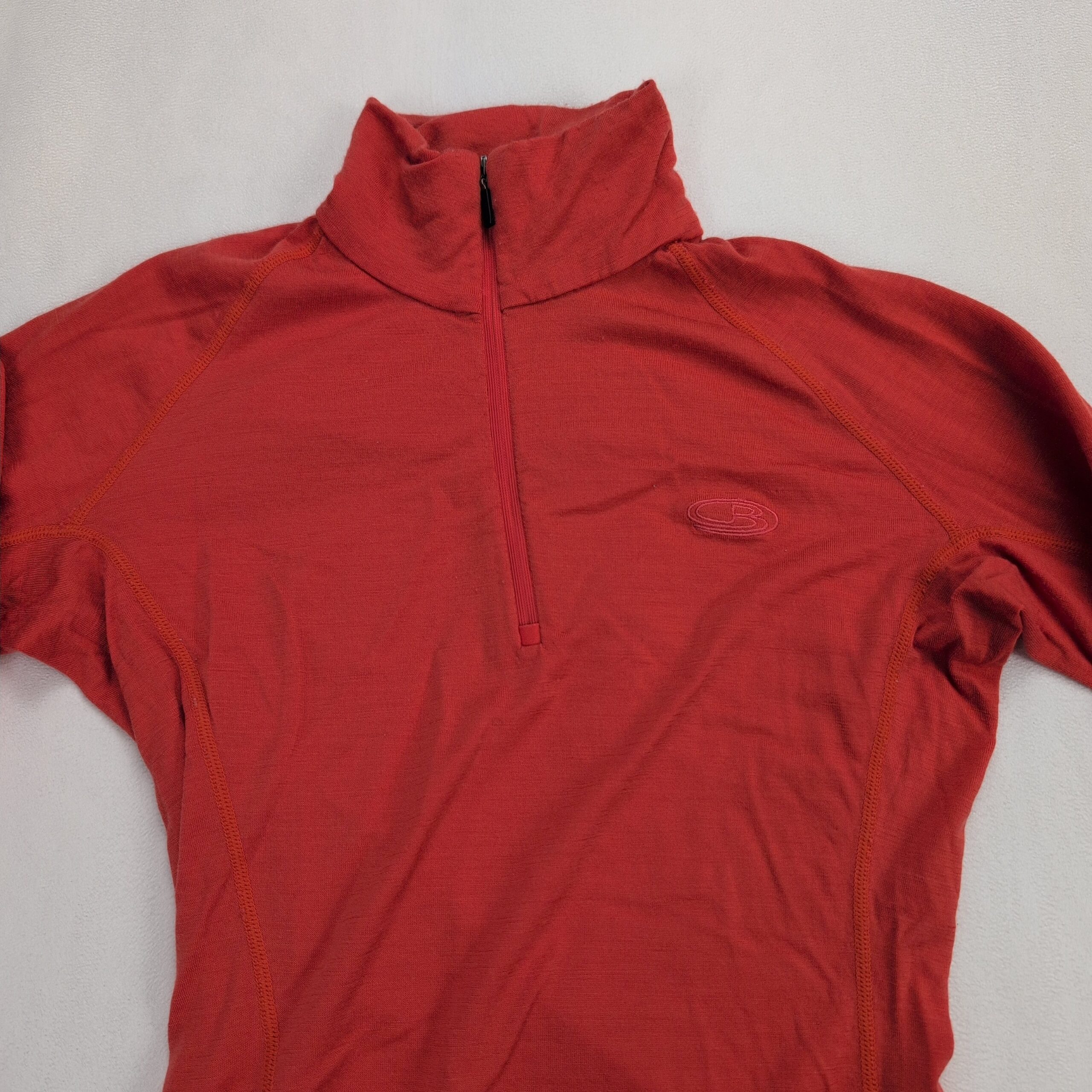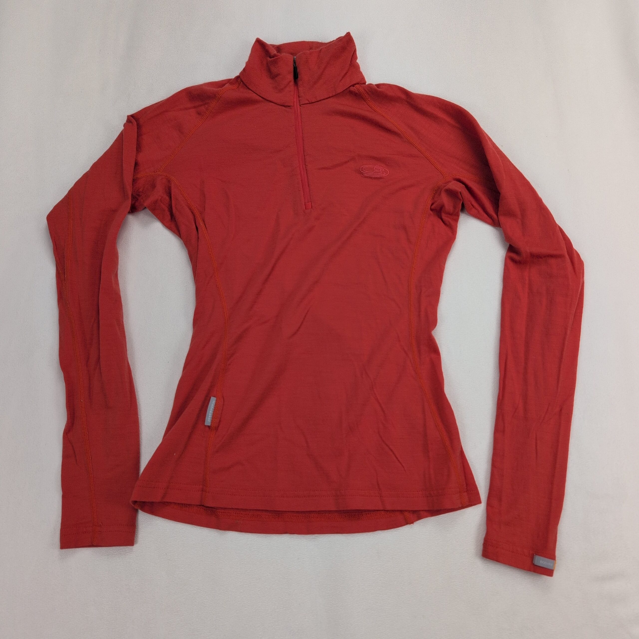 Icebreaker Bodyfit 200 women’s 100% merino wool 1/2-zip top in size XS. Slim, body-hugging fit with a high collar and quarter zip for adjustable ventilation. Seam detailing provides an athletic silhouette — ideal as a base layer for hiking, skiing, or everyday wear. Color appears coral/red (see photos).
