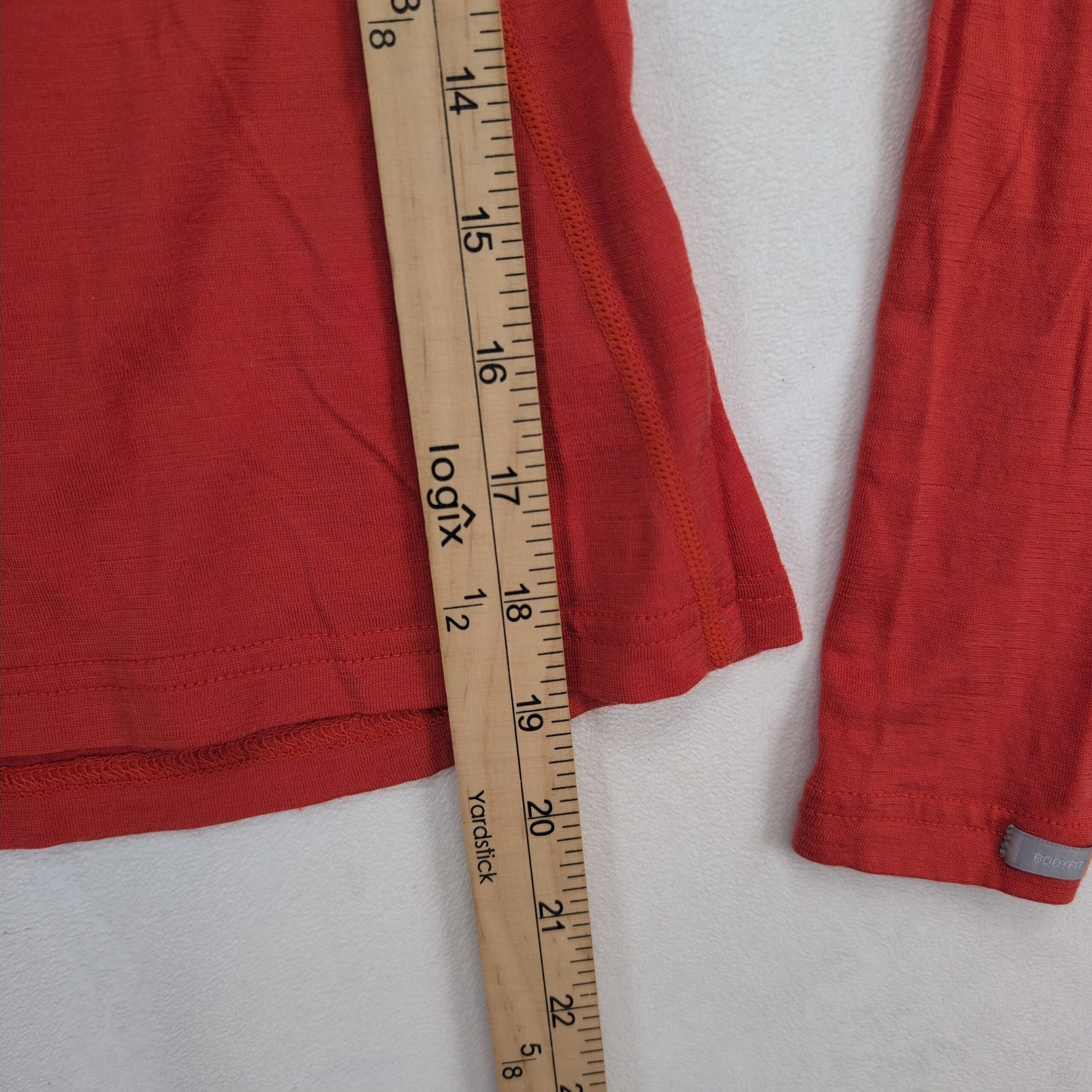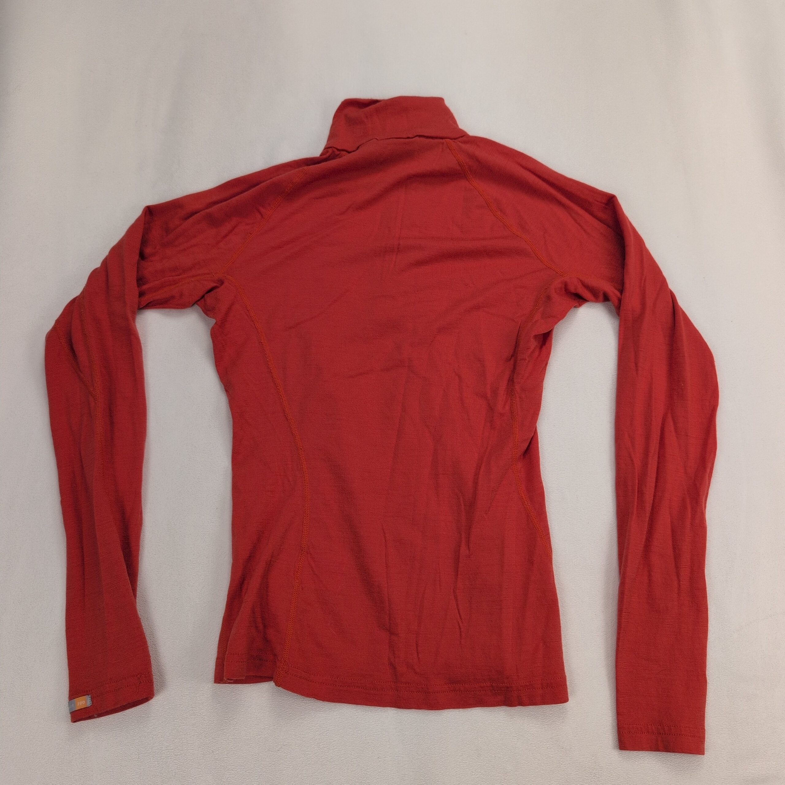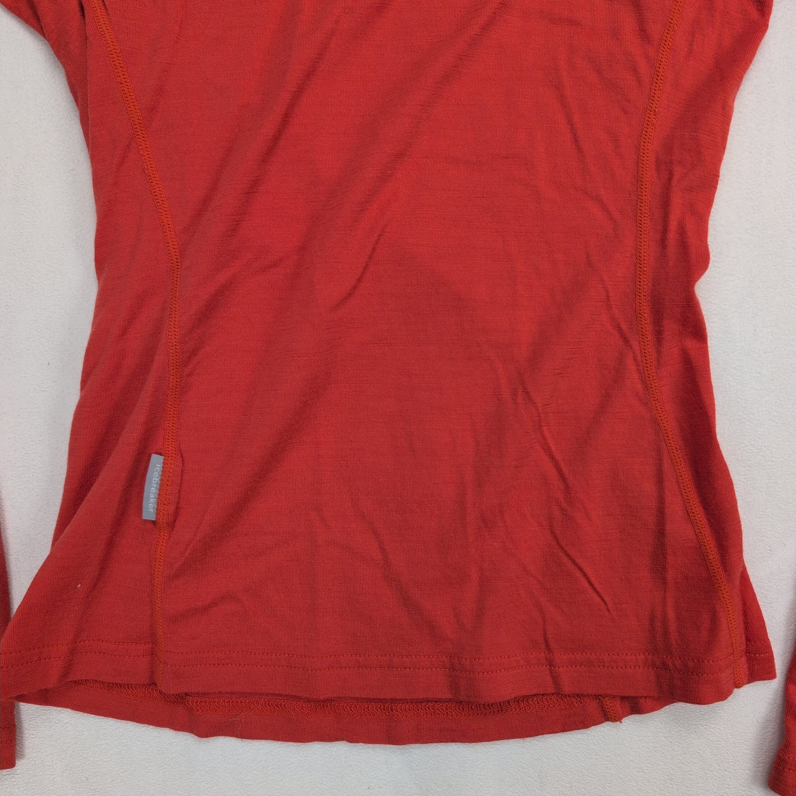 Icebreaker Bodyfit 200 women’s 100% merino wool 1/2-zip top in size XS. Slim, body-hugging fit with a high collar and quarter zip for adjustable ventilation. Seam detailing provides an athletic silhouette — ideal as a base layer for hiking, skiing, or everyday wear. Color appears coral/red (see photos).