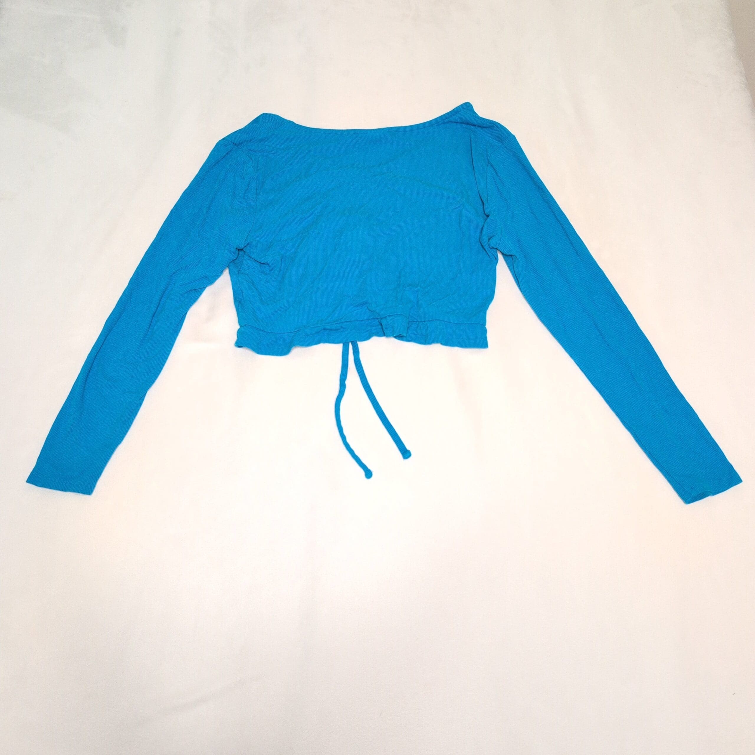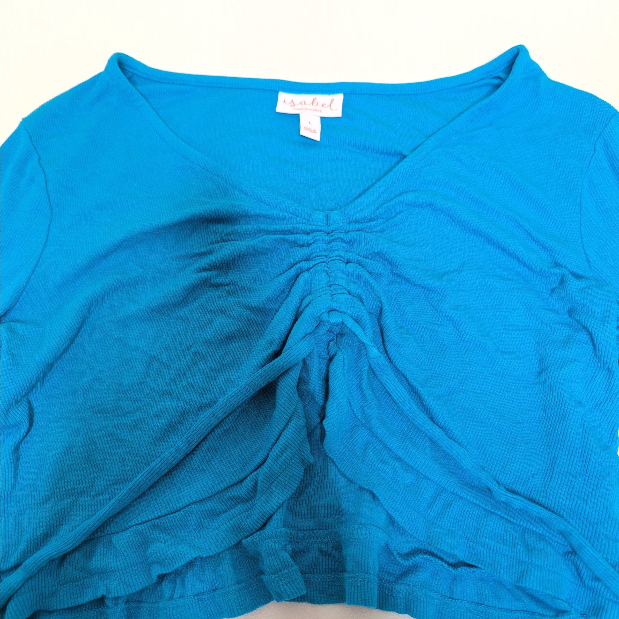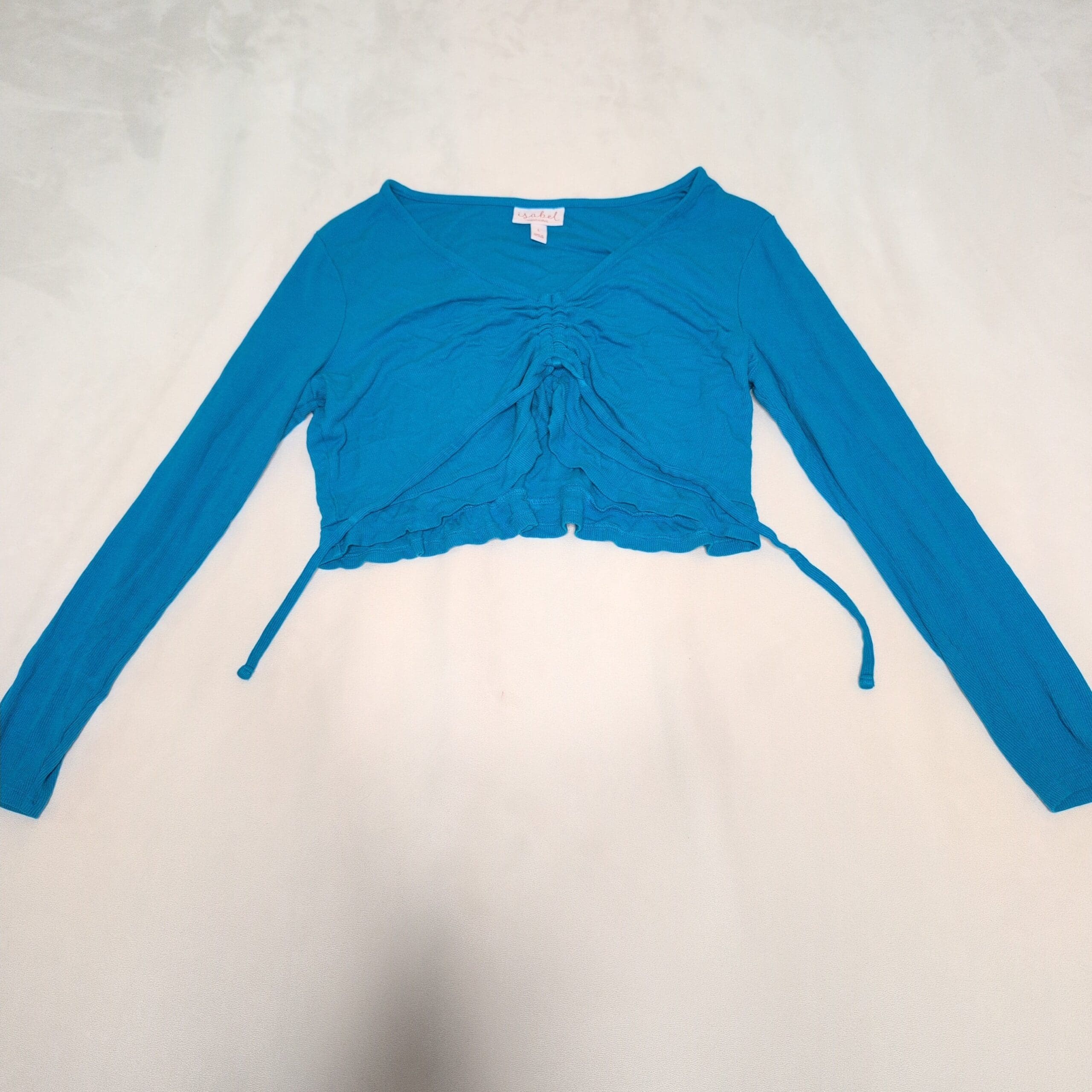 Ingrid + Isabel blue two-piece skirt set in size L. Features a long-sleeve cropped top with front ruched drawstring and a matching straight skirt with an elastic waistband. Lightweight knit silhouette that’s easy to dress up or down. Sold as a set. Please review photos for details and condition.