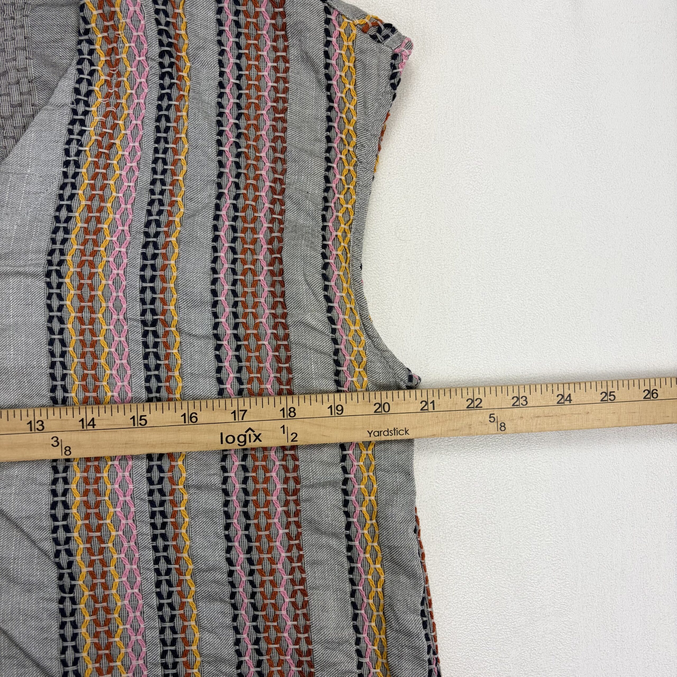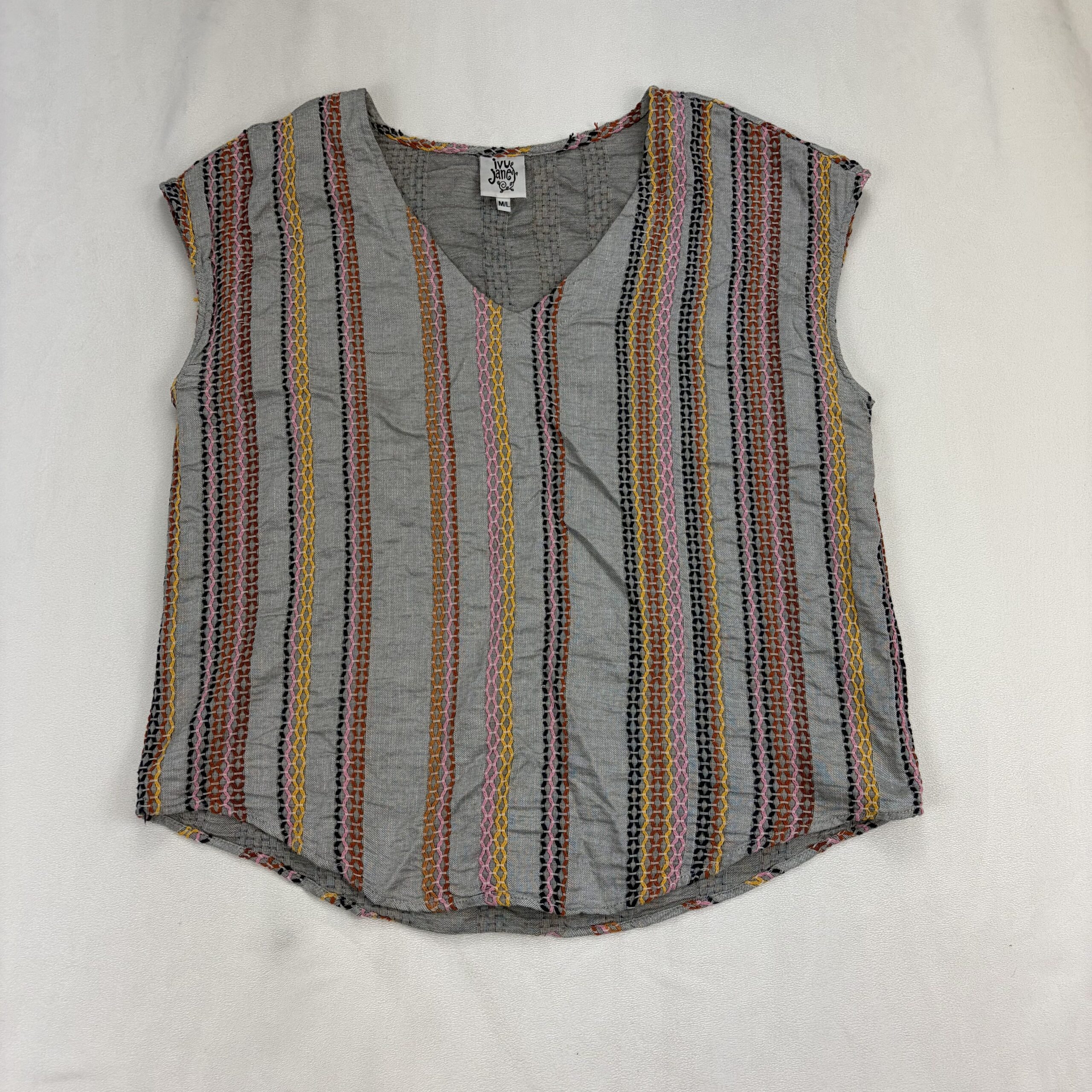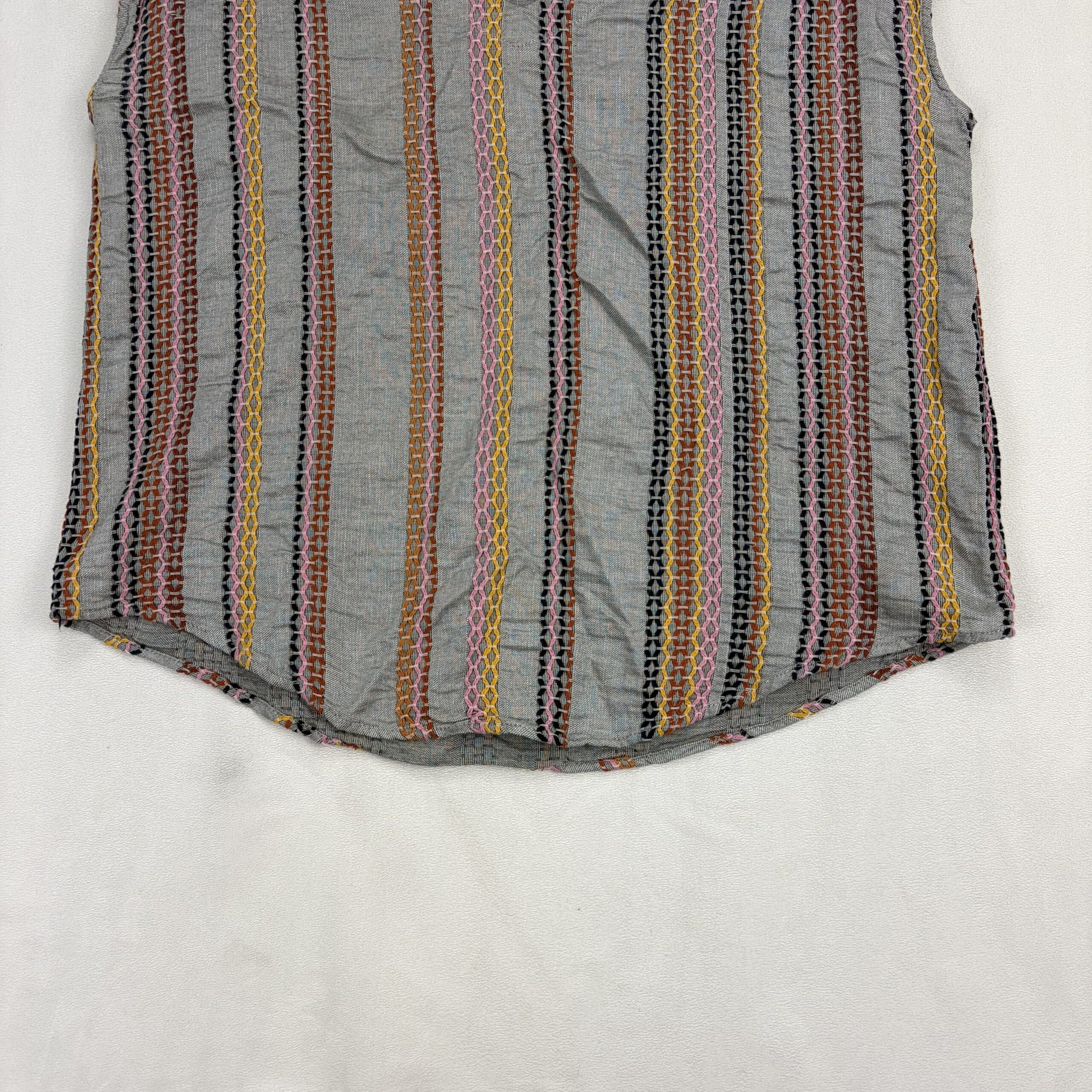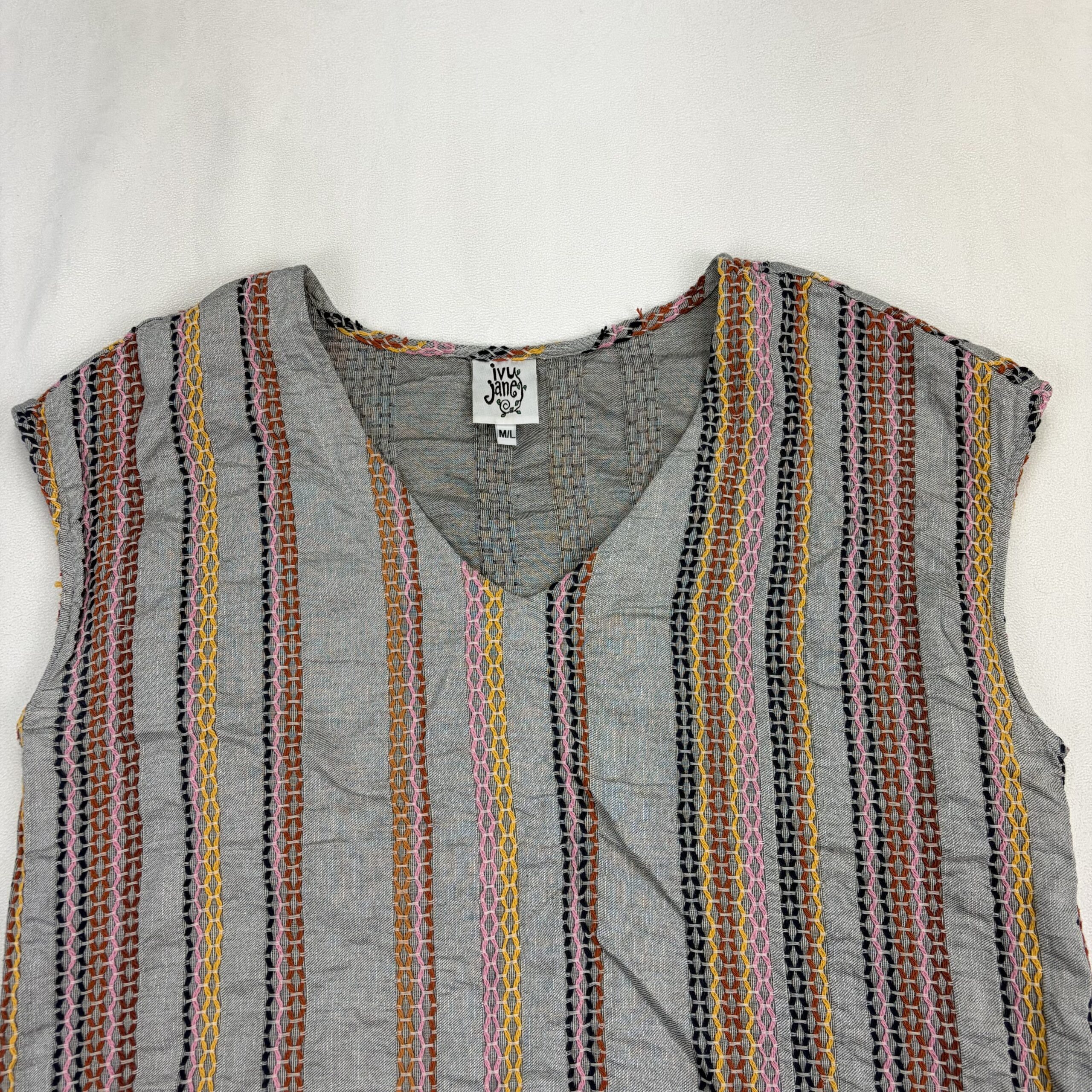 Ivy Jane women’s sleeveless tank top in size L. Lightweight grey woven fabric with vertical multicolor embroidered-style stripes in mustard, pink, rust and black for a relaxed boho look. Features a V-neck, relaxed silhouette and curved hem with a slightly longer back — great for layering or warm-weather wear. Condition: Excellent used condition — free of major rips, tears, stains, or flaws; shows typical gentle wear from prior use.