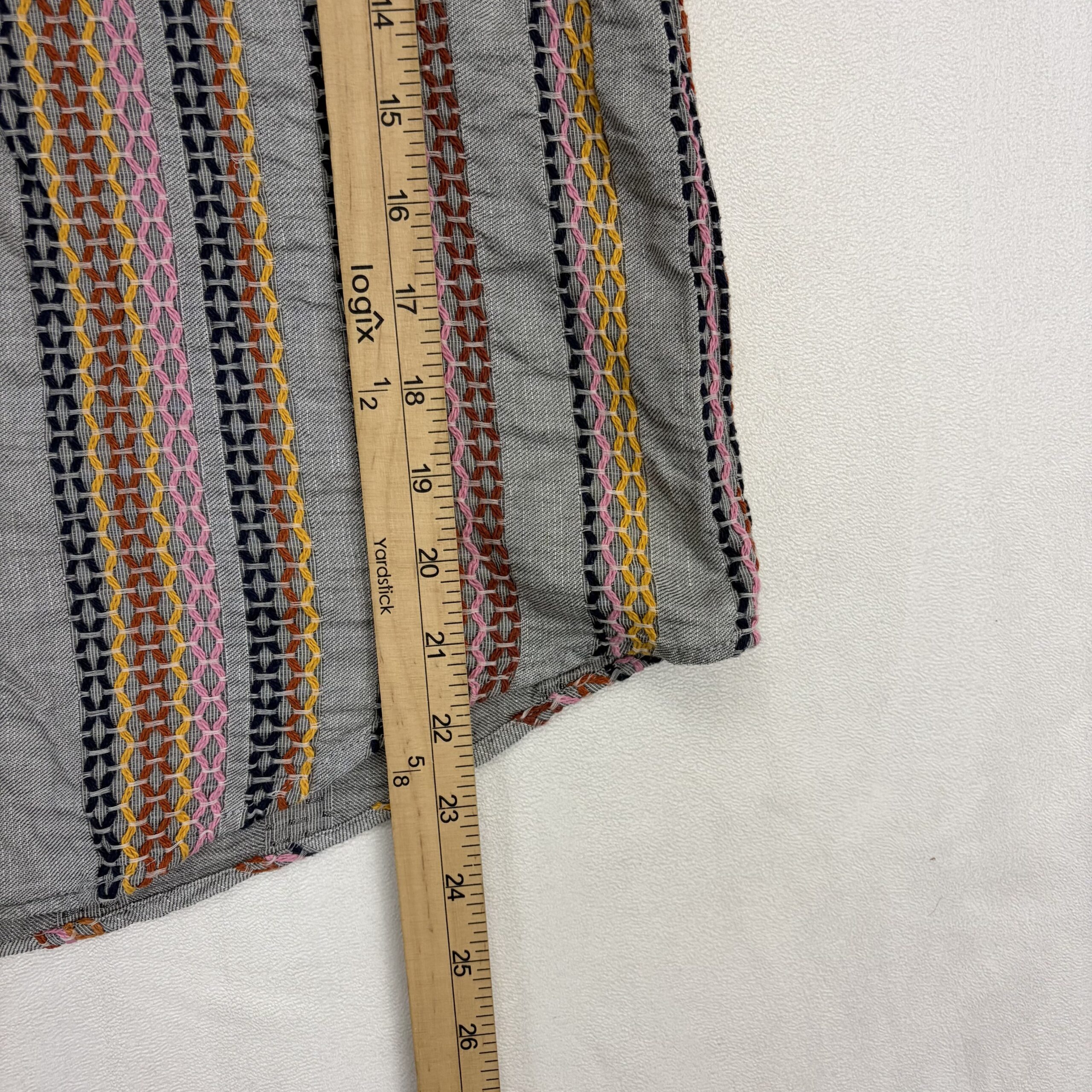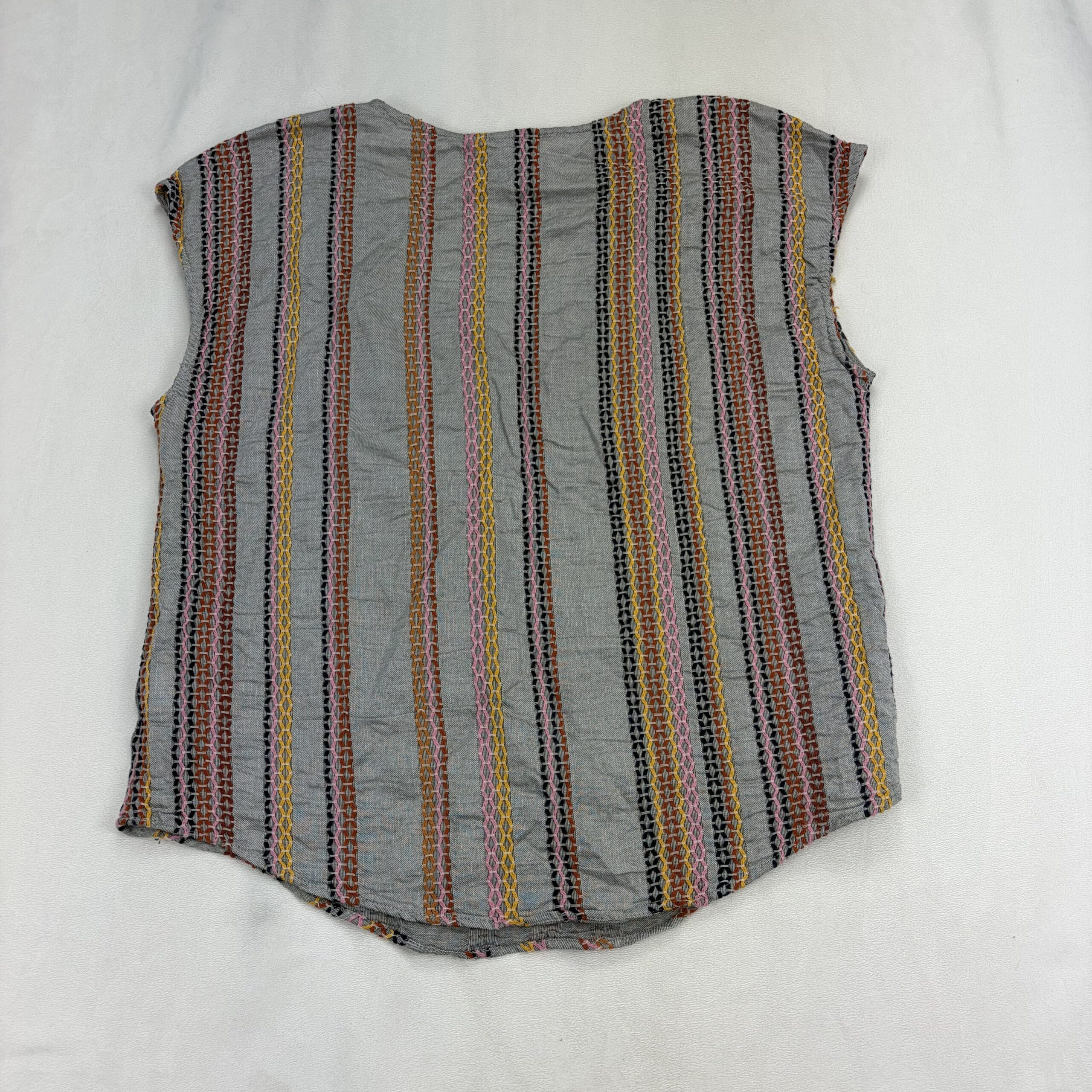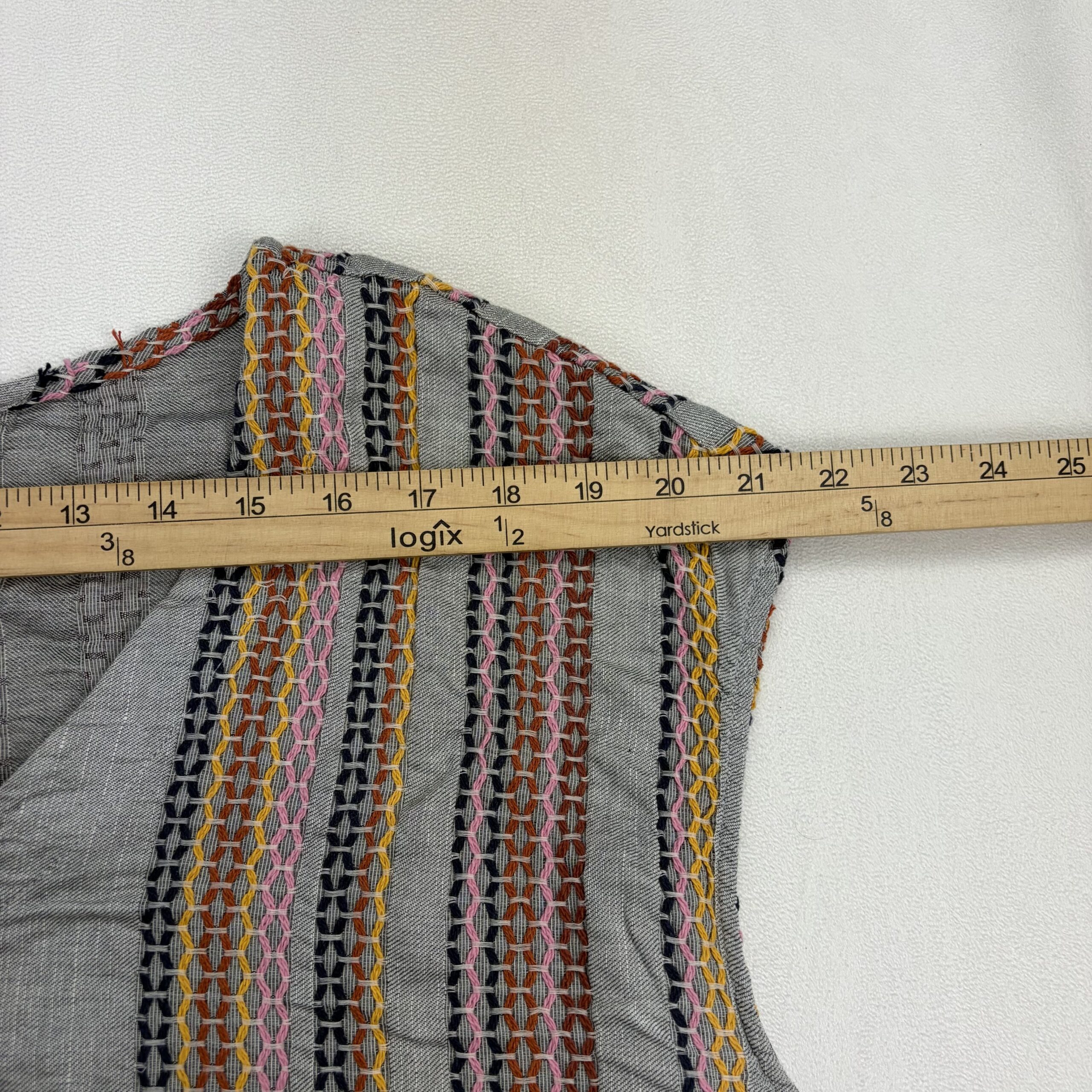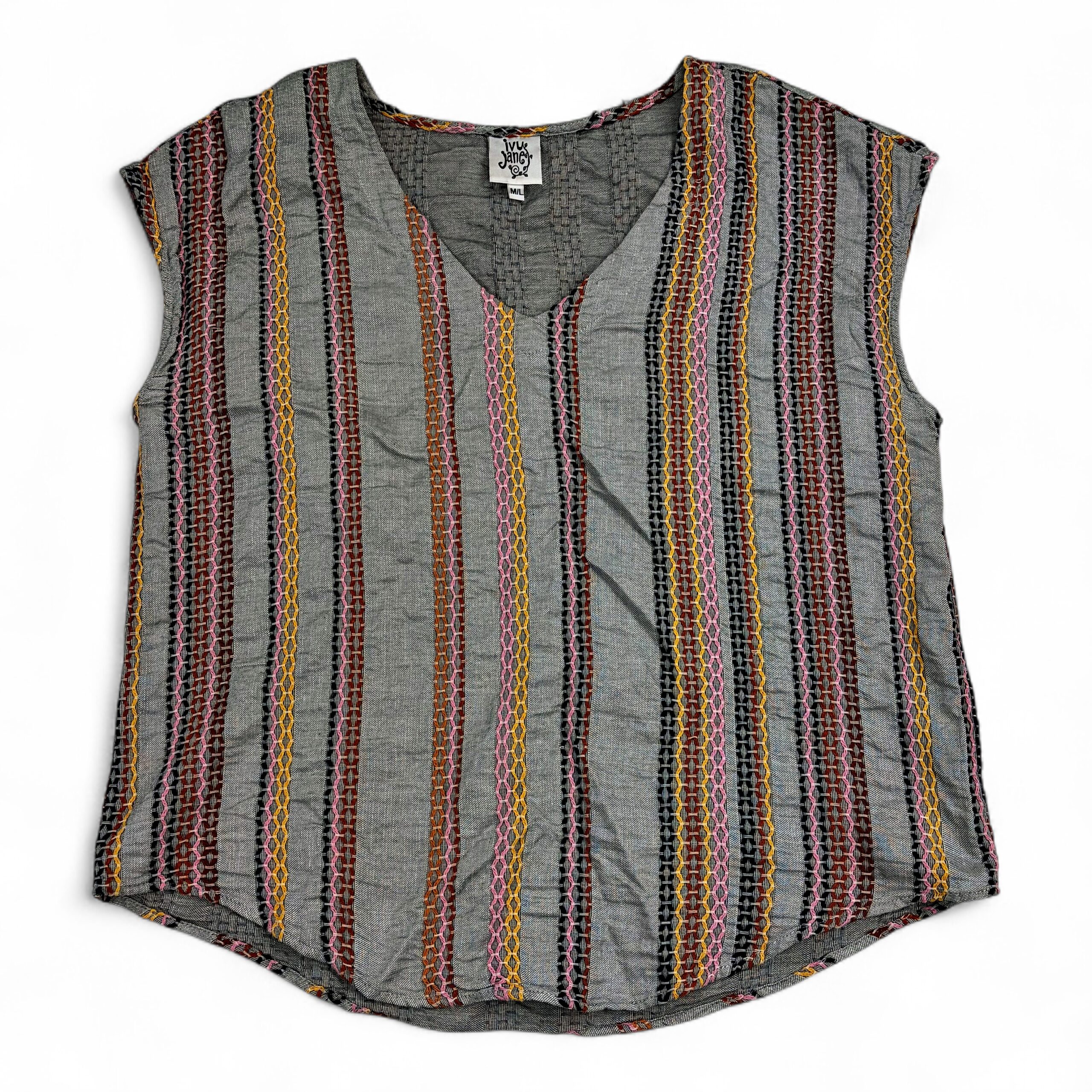 Ivy Jane women’s sleeveless tank top in size L. Lightweight grey woven fabric with vertical multicolor embroidered-style stripes in mustard, pink, rust and black for a relaxed boho look. Features a V-neck, relaxed silhouette and curved hem with a slightly longer back — great for layering or warm-weather wear. Condition: Excellent used condition — free of major rips, tears, stains, or flaws; shows typical gentle wear from prior use.