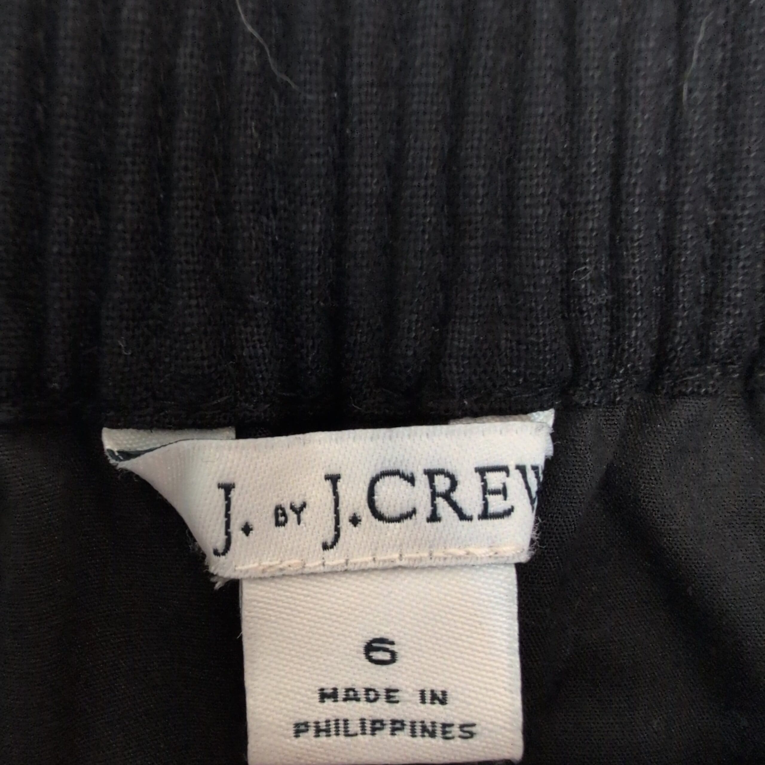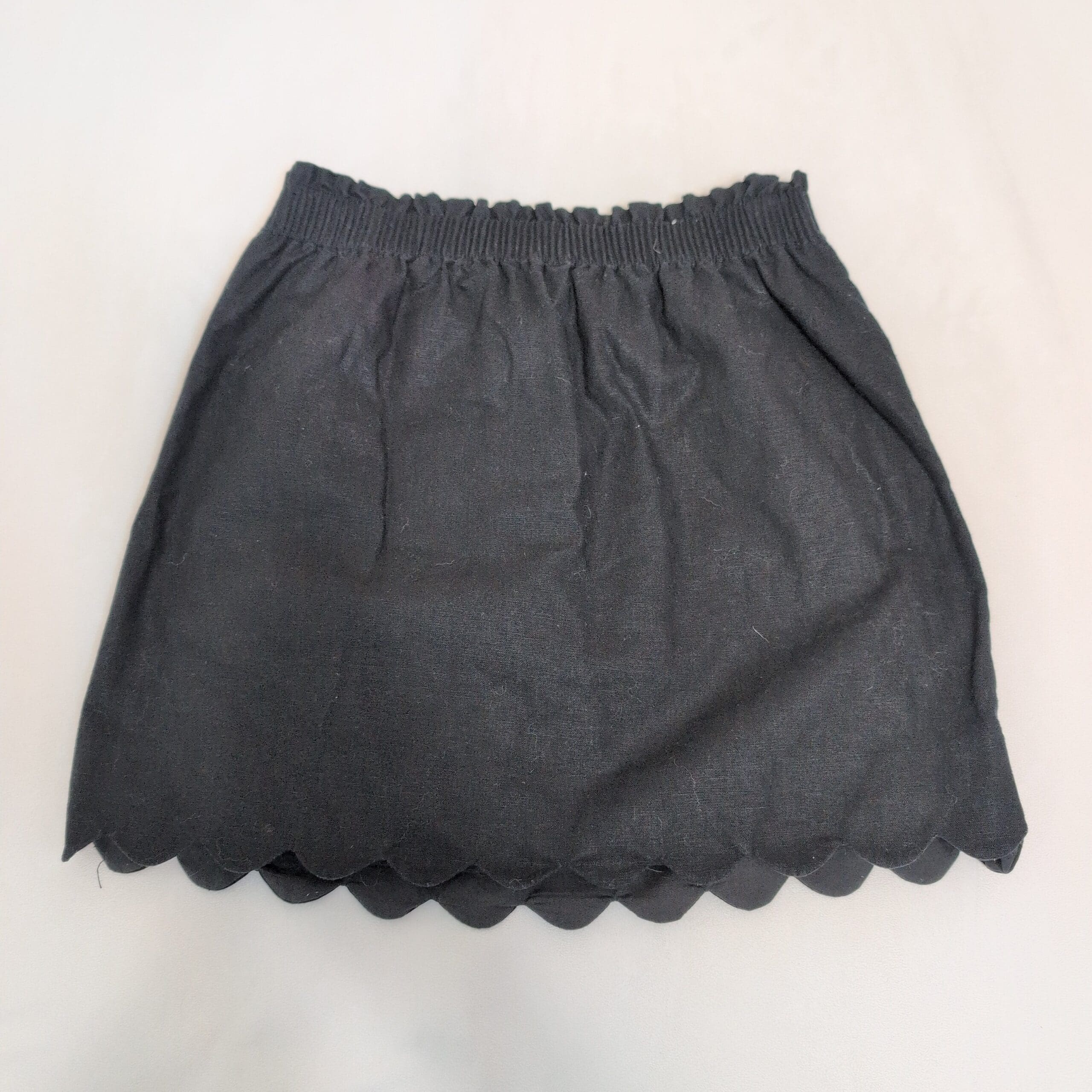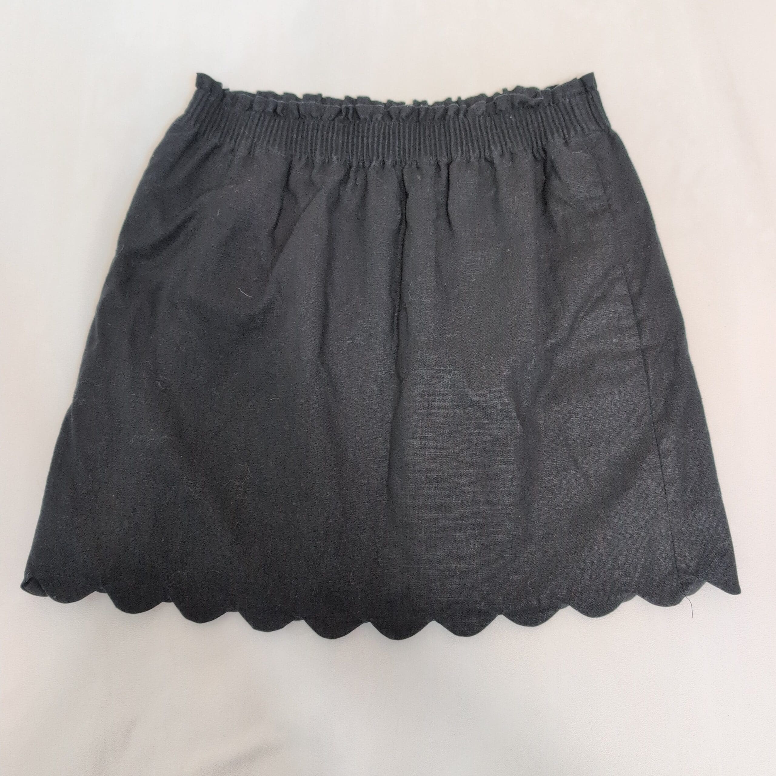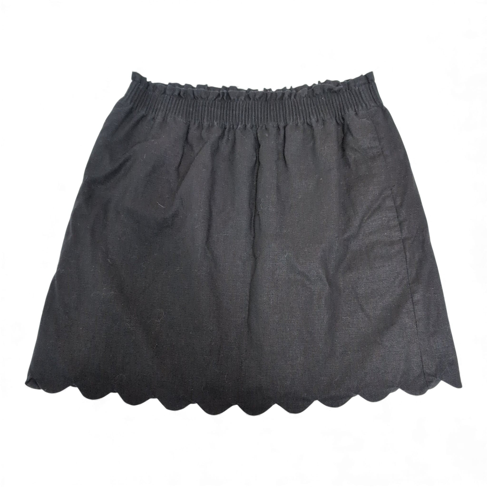 J.Crew black pencil skirt in size 6. Features an elastic smocked waistband for easy pull-on wear and a scalloped hem for a feminine finish. Clean, classic silhouette that pairs well with blouses or sweaters for work or casual outings. Pre-owned with light surface lint and minor signs of wear visible in photos; no stains or holes. Please review photos for condition.
