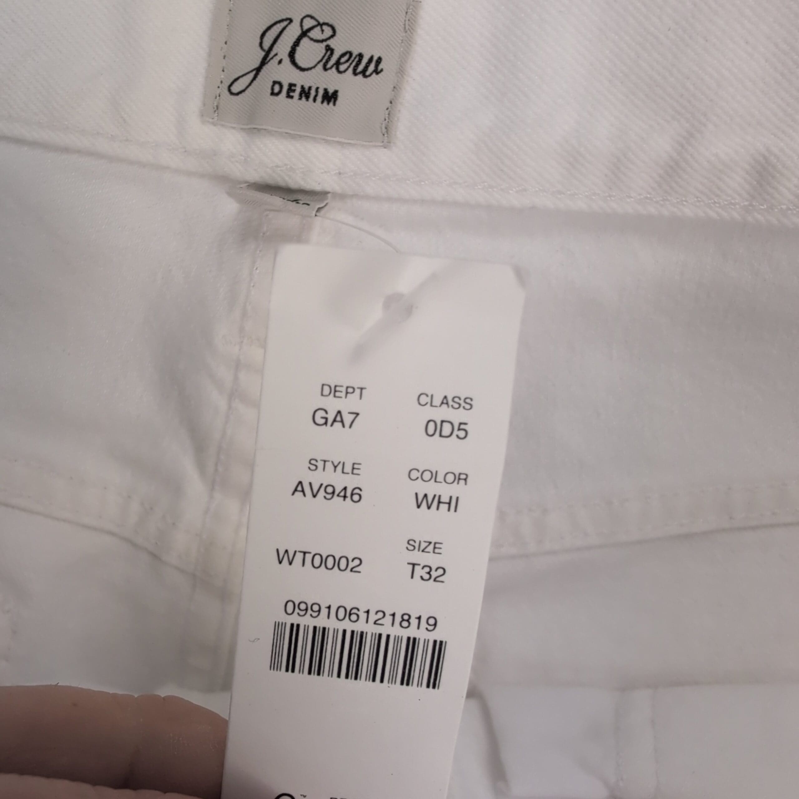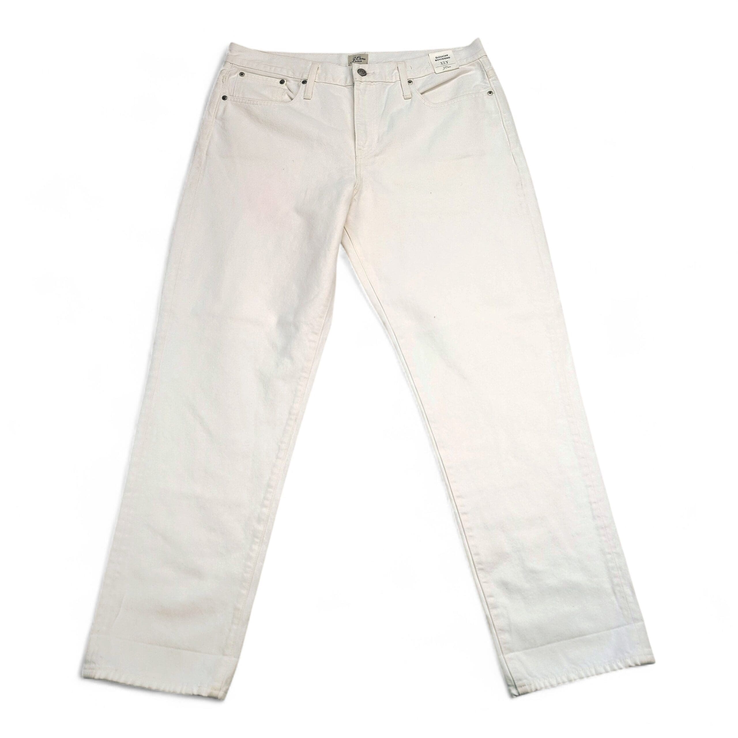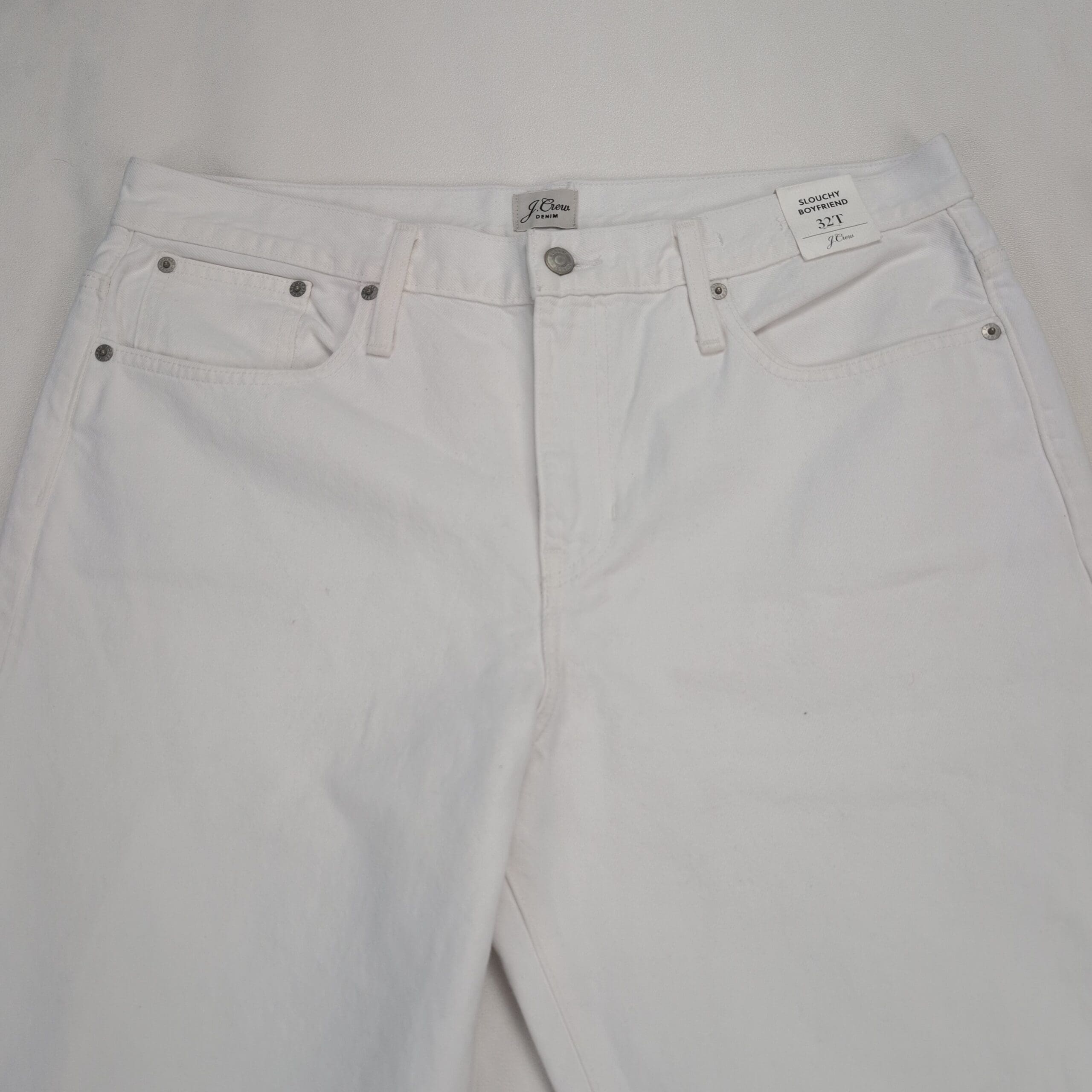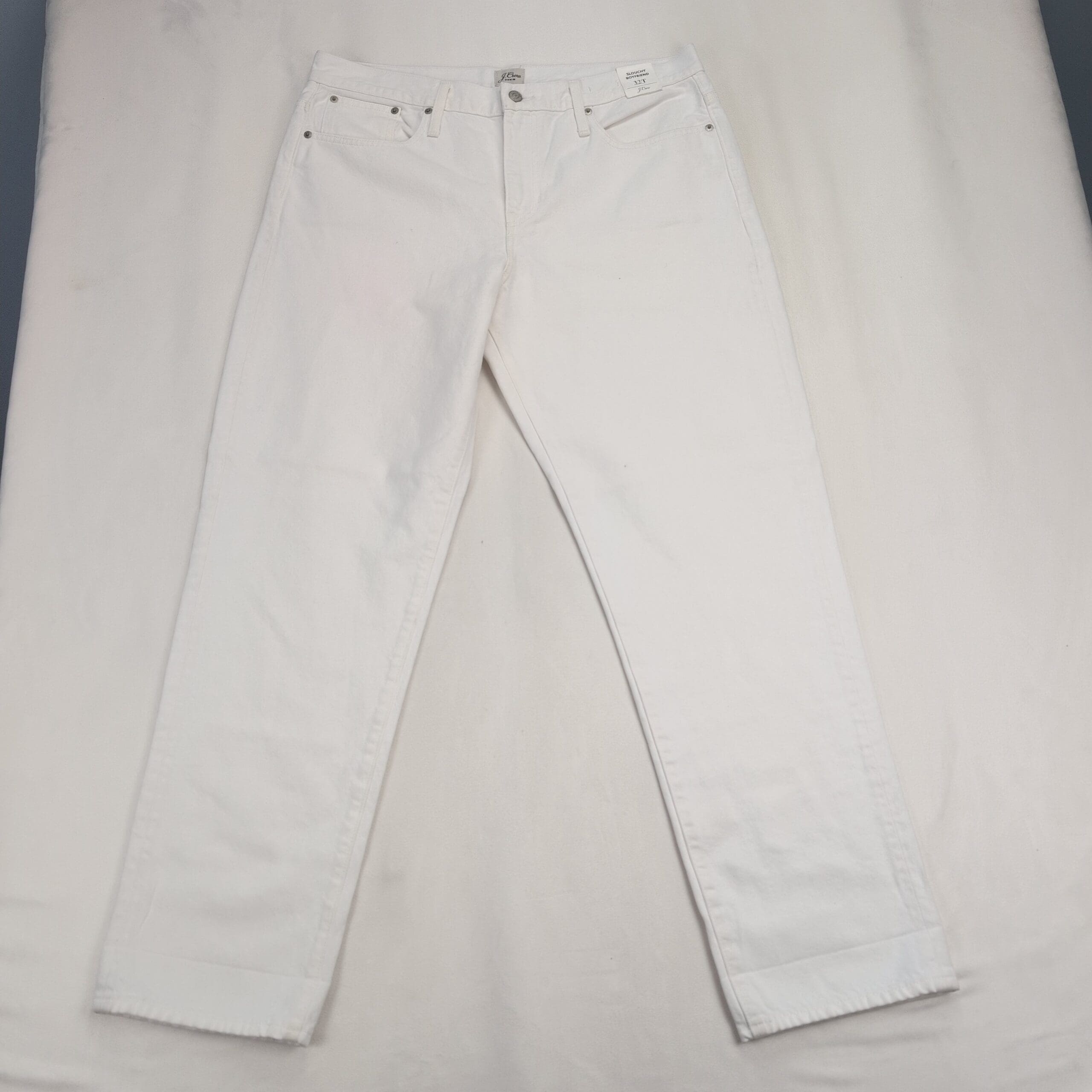 J.Crew women’s Boyfriend jeans in white denim, size 32 (plus). Relaxed, easy fit through the hip and thigh with a slightly tapered leg for a casual, on-trend look. Classic five-pocket styling with button/zip fly and belt loops. Excellent used condition — free of major rips, tears, or heavy stains; please note there is one small spot on the front leg (pictured). Typical light wear consistent with gentle use.