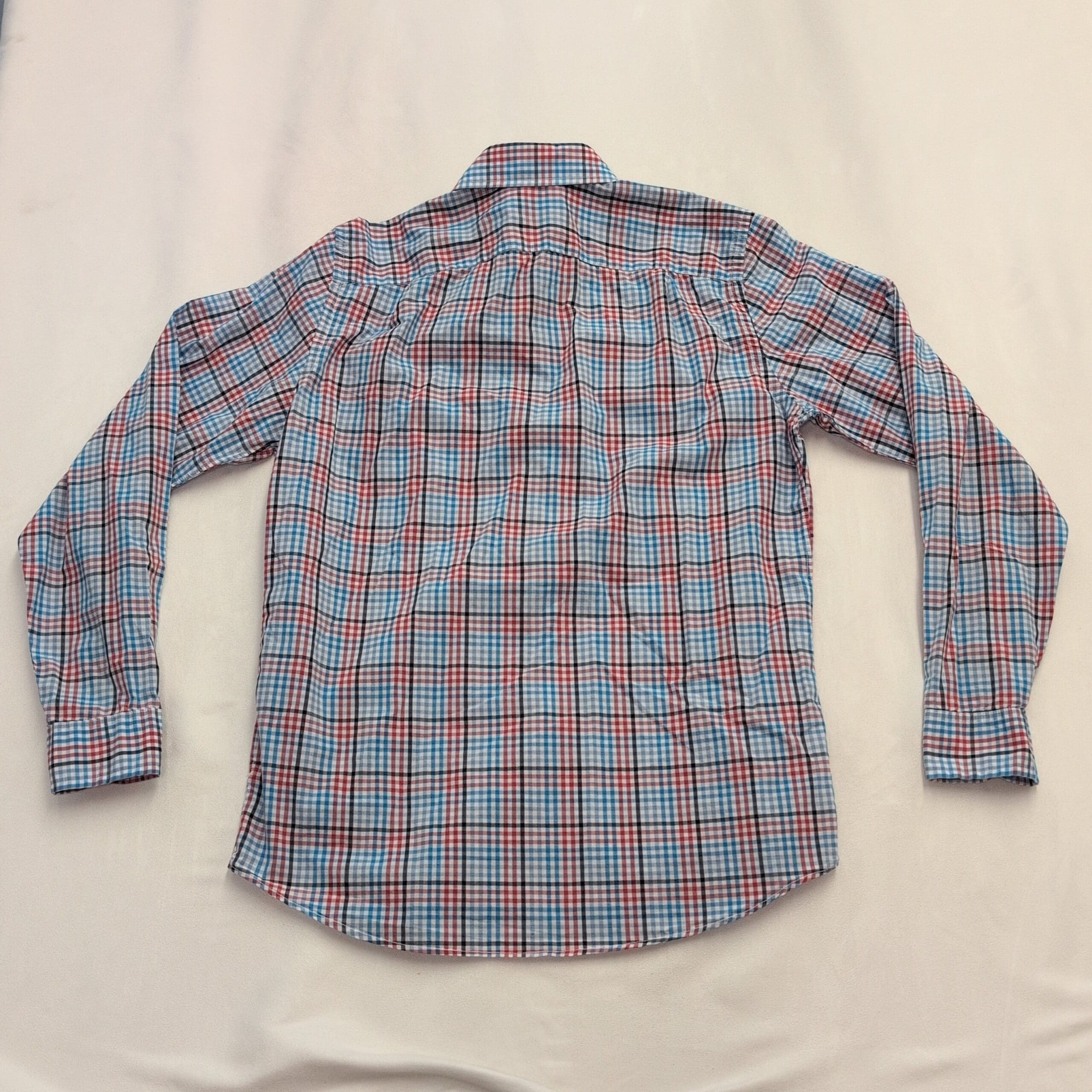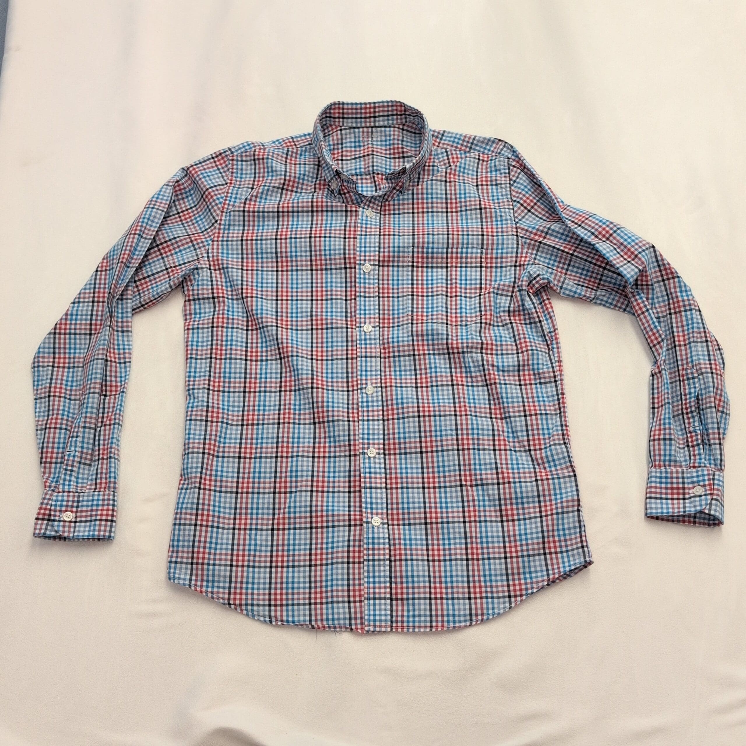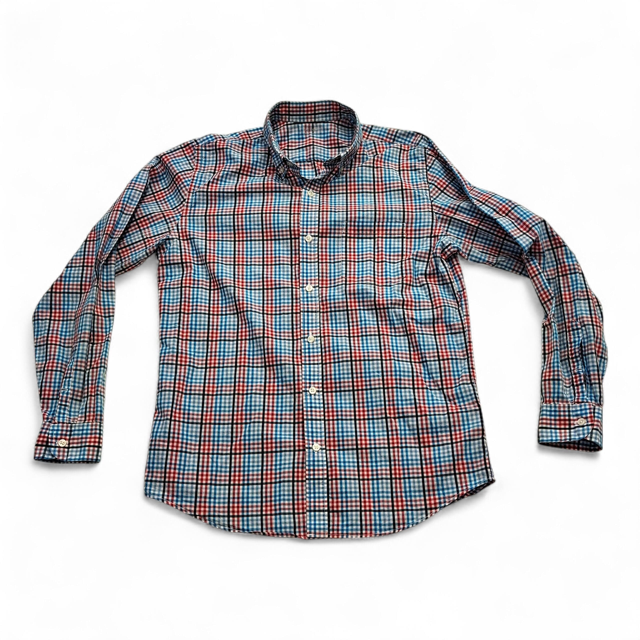 J.Crew men’s long-sleeve plaid button-down shirt in size S. Red, light blue and navy plaid on a white ground. Classic button-down collar with full-length button front and button cuffs — versatile for casual or office wear. Excellent used condition; free of major rips, tears, stains, or flaws. Typical light wear may be present.