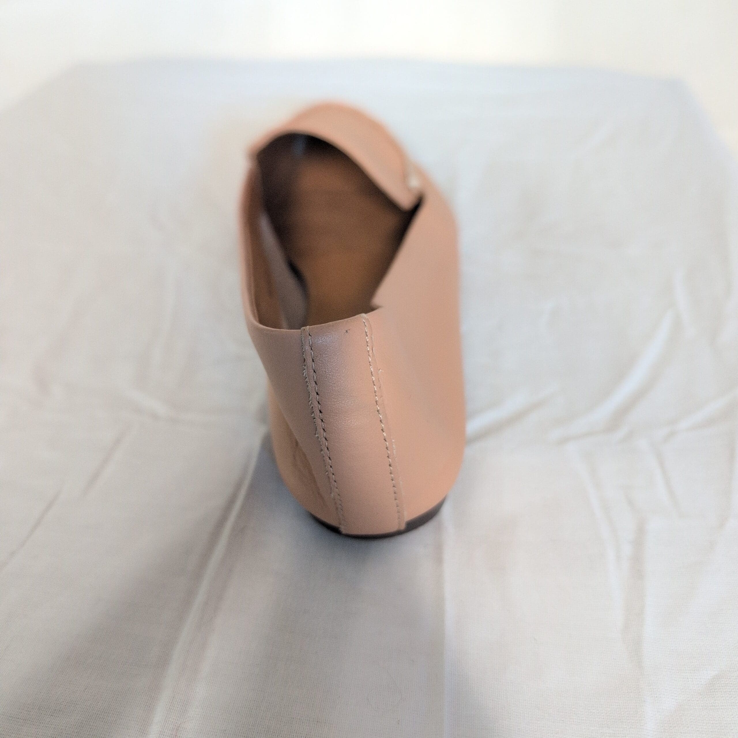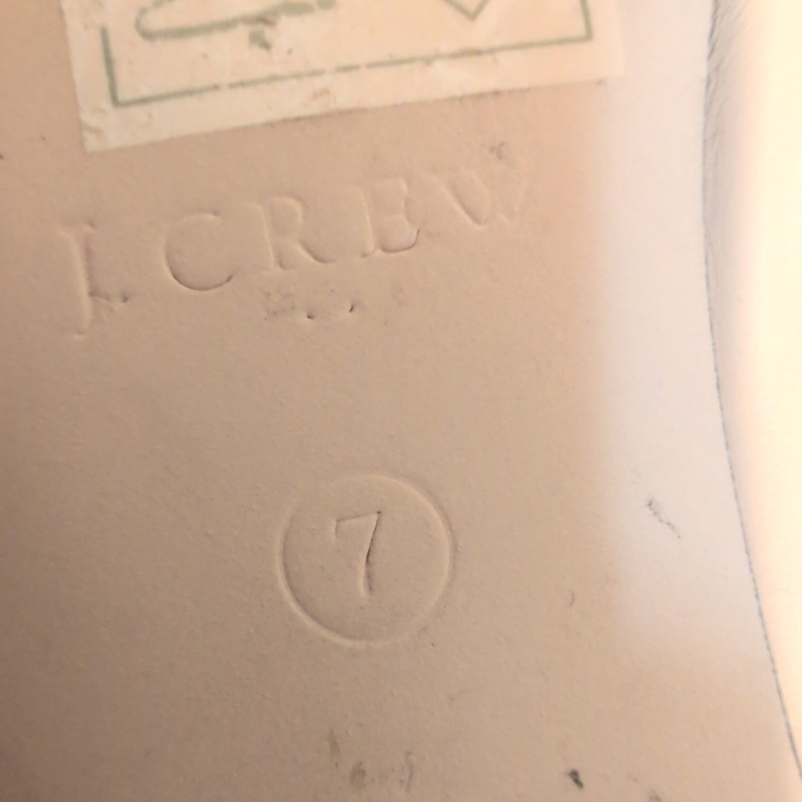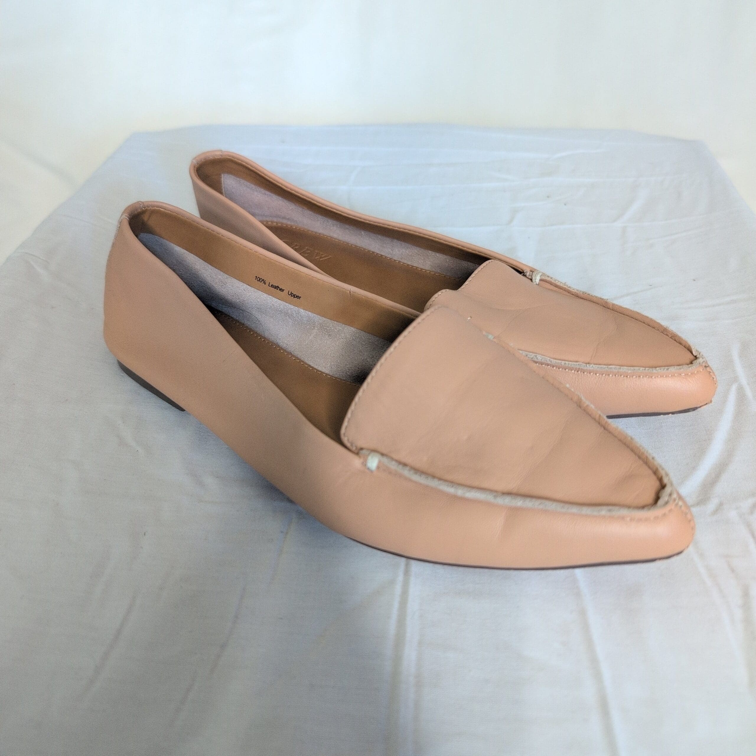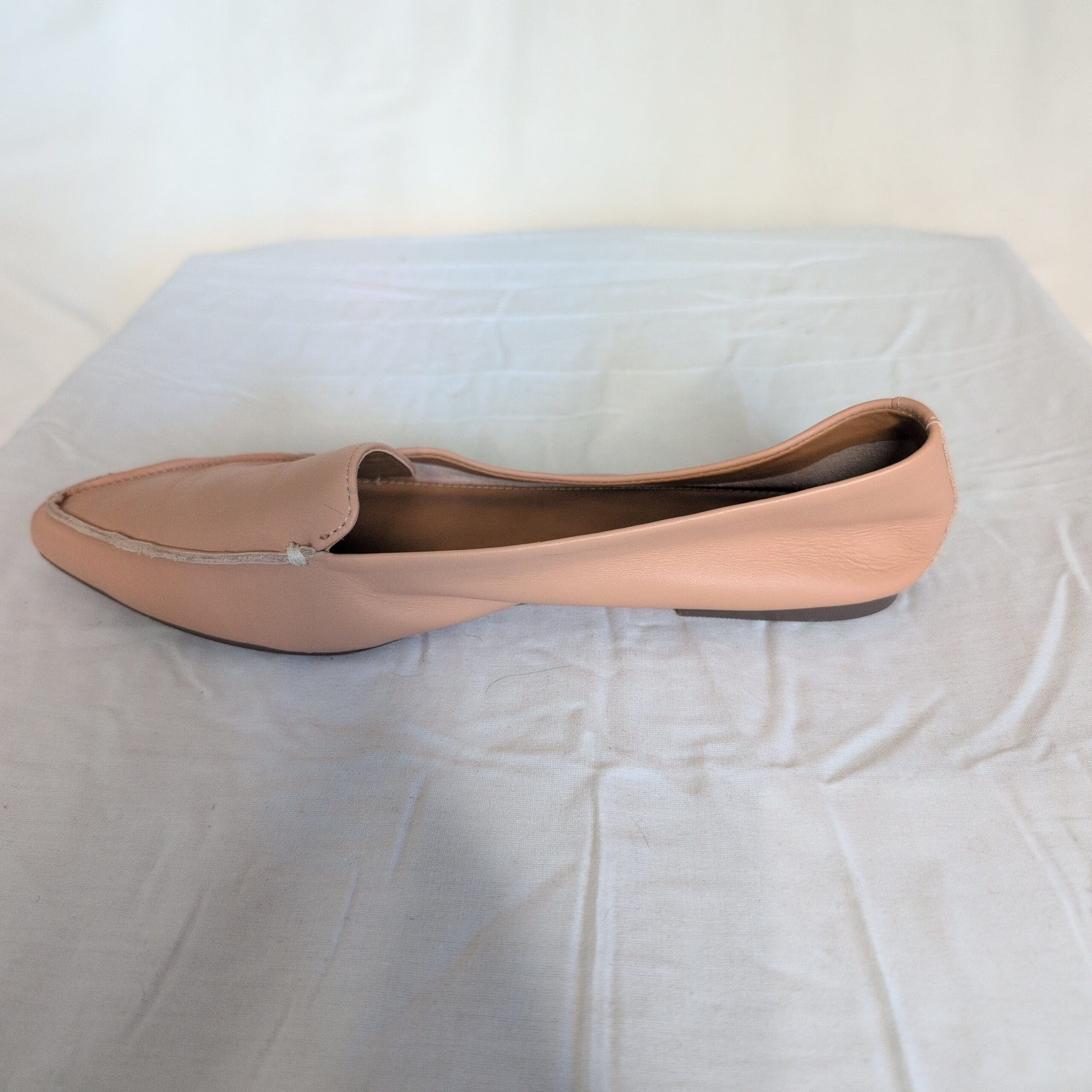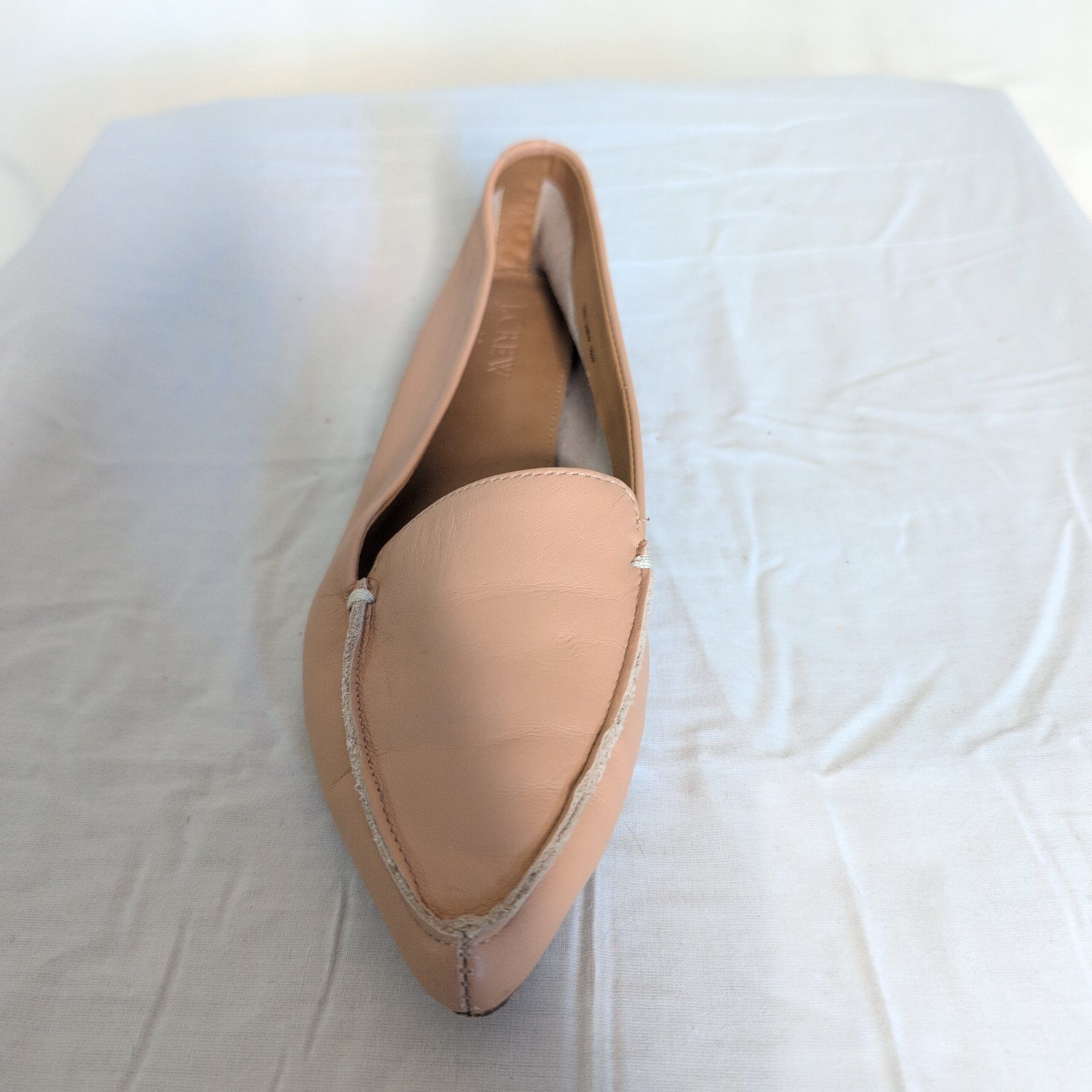 J.Crew women’s leather loafers in a soft pink shade, size 7. Pointed-toe, slip-on silhouette with a smooth 100% leather upper for a polished, versatile look. Good used condition with minor creasing on the toe and vamp as shown in photos; comfortable for work or weekend wear.