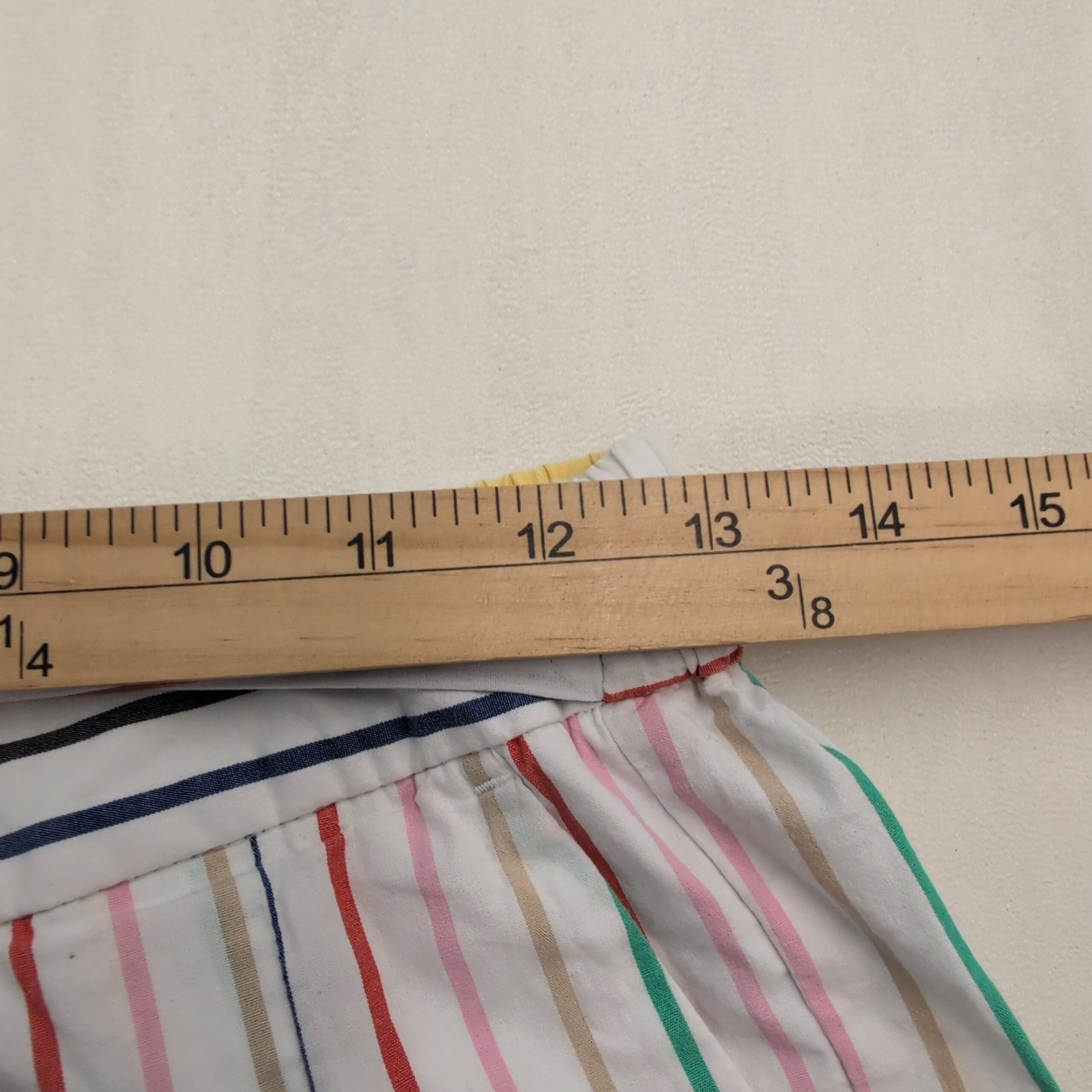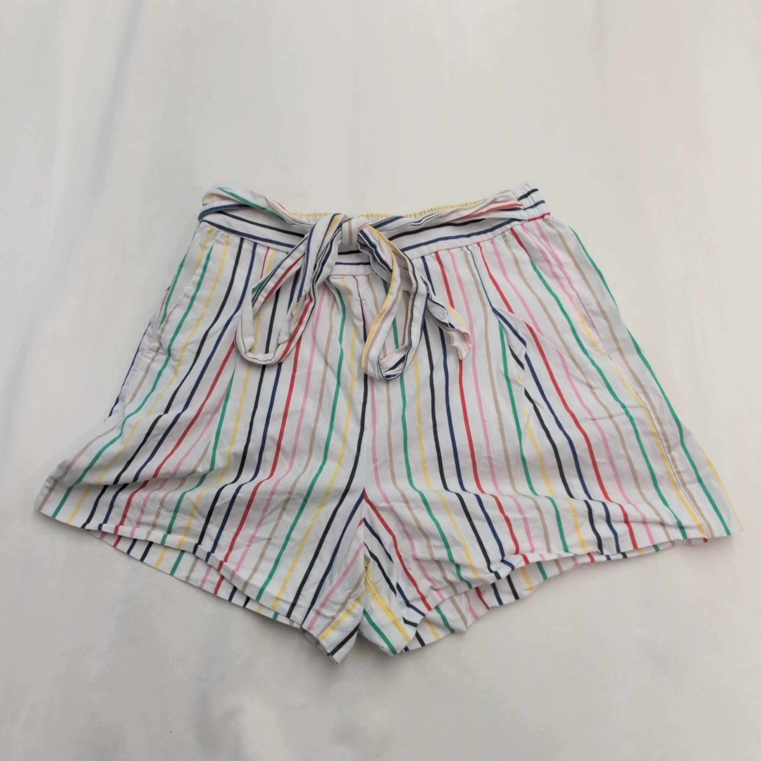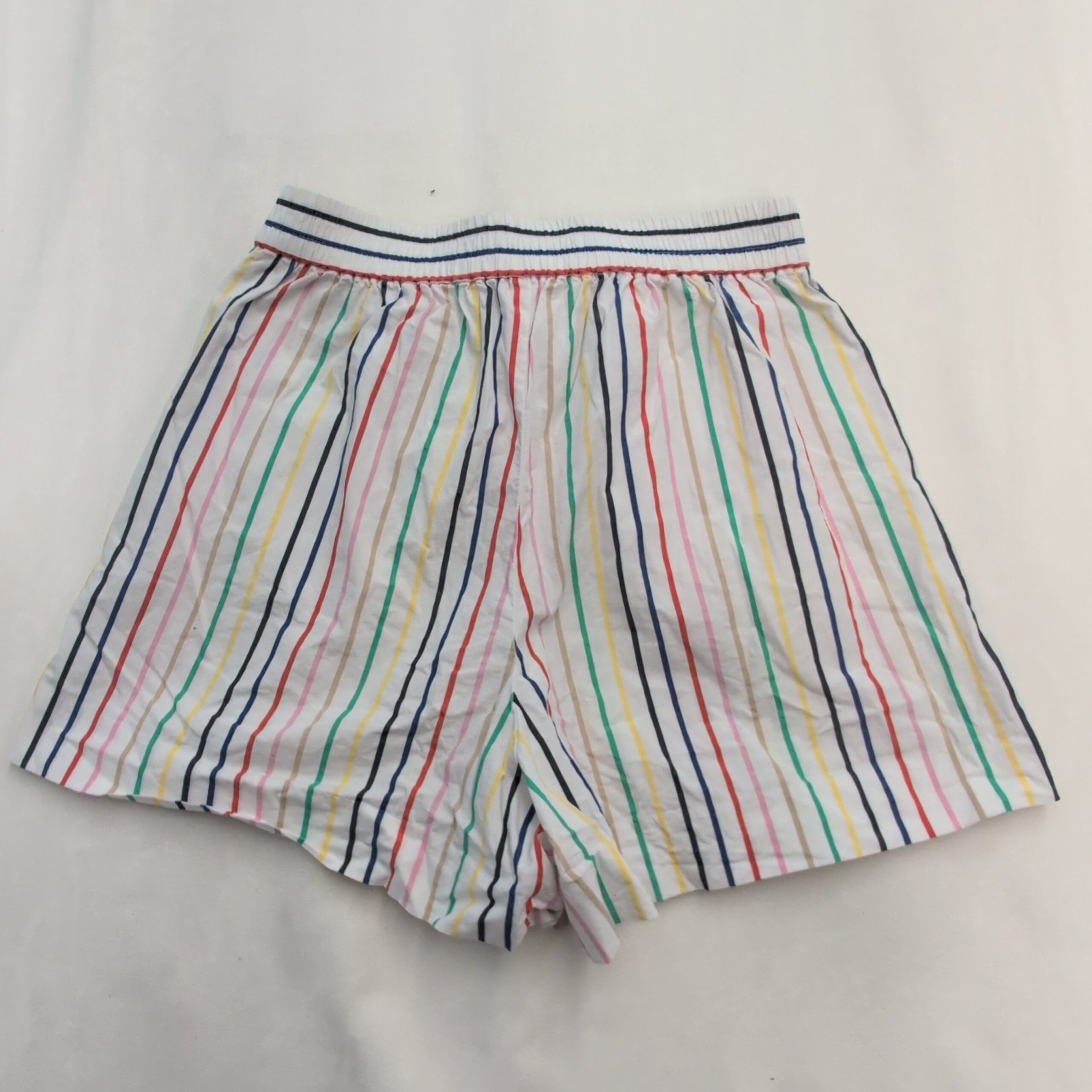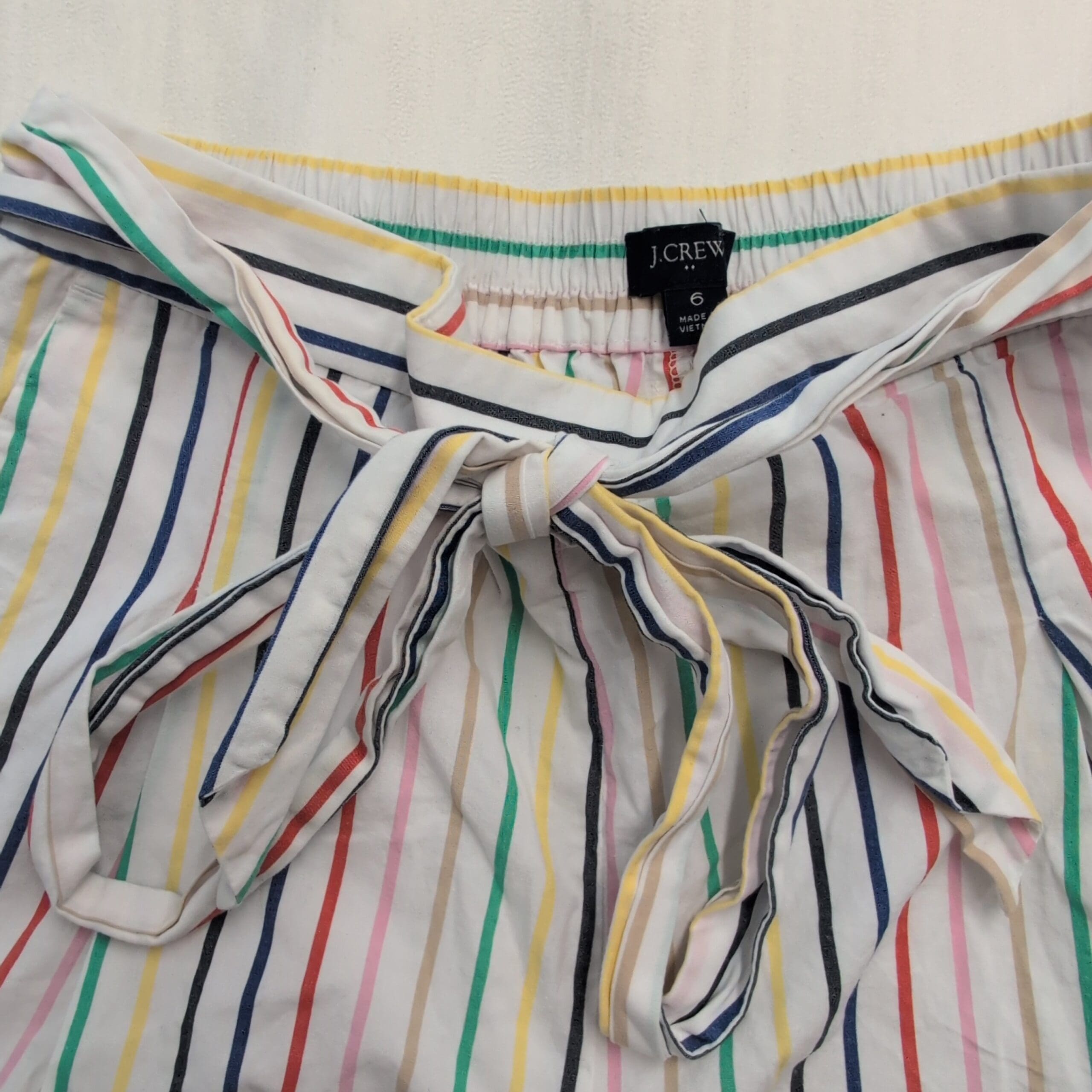 J.Crew women’s white shorts with vertical multi-color stripes and a self-tie waist. Lightweight woven fabric with elasticized waistband, relaxed silhouette, and side pockets — an easy, breezy option for warm-weather outfits. Marked size 6 (standard).